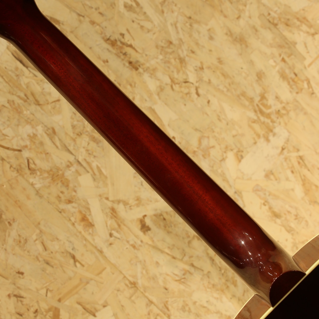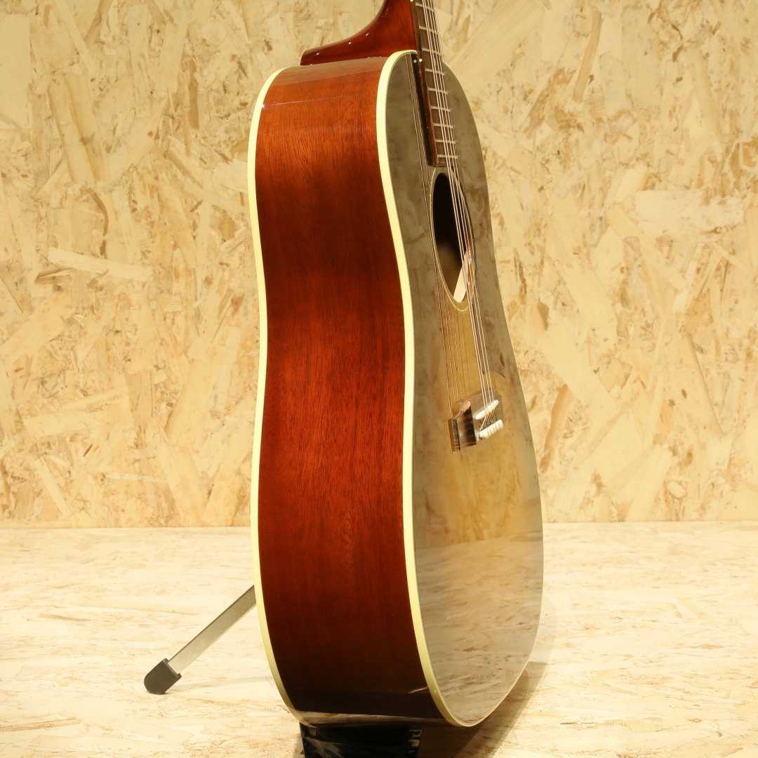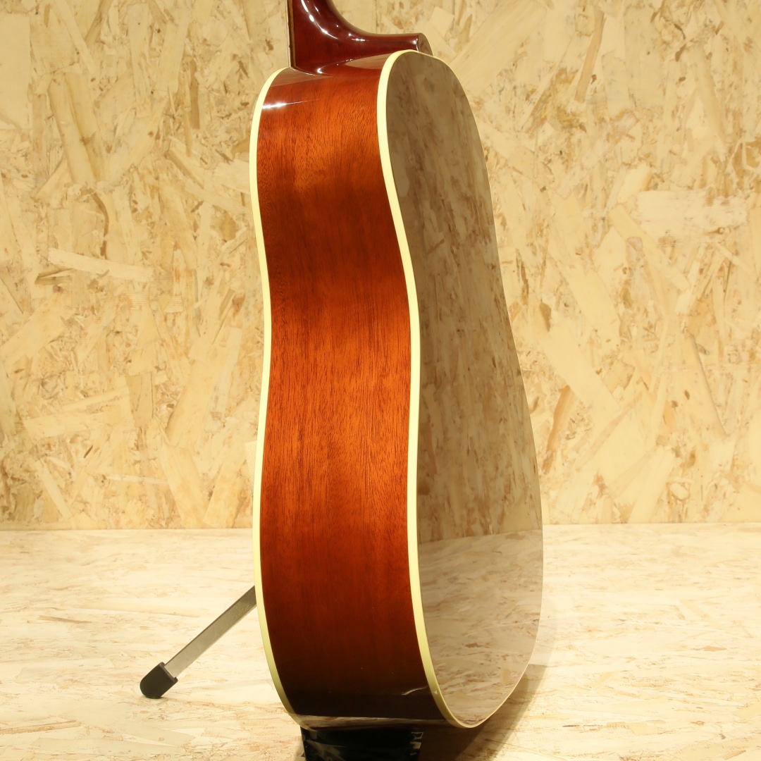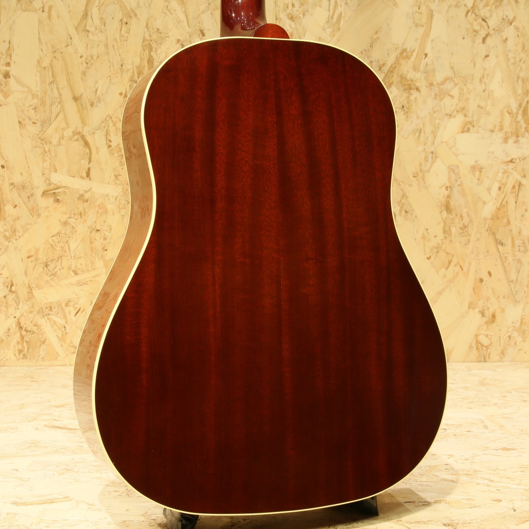 1942年にギブソンが発売を開始したJ-45。通称ワーキング・ホース、ライバルであるマーチン社のドレッドノートモデルに対抗すべく製造開始されたラウンドショルダー型ジャンボシリーズのひとつで、ギブソン製のアコースティックギターのなかではもっとも有名で広く使われるモデルです。本器は50年代のデザインを復刻したオールドファッションなモデル"50's J-45 Original VS"。スプルーストップ、マホガニーサイド&バック、マホガニーネック、ローズウッド指板&ブリッジ、ストレートノーマルスロットサドル、シングルリングロゼッタ、MOP指板ドット、ラージピックガード、トラディショナルハンドスキャロップド・Xブレイシング、ギブソンらしいヴィンテージサンバーストカラー。べっ甲柄ラージピックガード、やや厚みを持たせた太めのラウンドネック、意図的に黄ばみをつけたバインディング、クルーソン白ボタン3連ペグ等々、通常モデルのStandardとは一線を画した仕様。当時のテイストを織り込んだルックスに仕上がっています。やや厚みのある太めのネックらしくファットで太いサウンドを得られるのも魅力の一つ。Standardモデルと比較してもよりラウドなサウンドを響かせてくれます。聞き馴染みのあるハードなストロークから繊細なアルペジオまで、ザラついた個性的な音でありながら幅広くカバーできる1本です。L.R.Baggs社製element VTCピックアップ搭載であらゆるシチュエーションへの対応力も充分。生音でもラインサウンドでも、オールラウンドな1本と言えるでしょう。ワークホース(働き馬)の名の通り様々なタイミングで働かせたくなるようなギターです。ラージガードに憧れのある方、J-45と言えばサンバーストという方には是非オススメの1本。オリジナルハードケースが付属します。