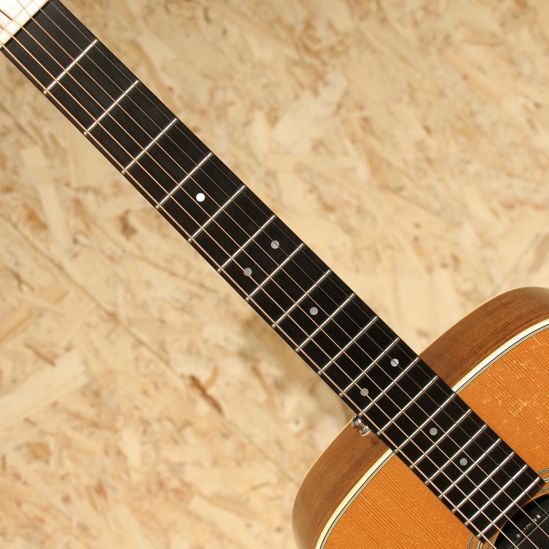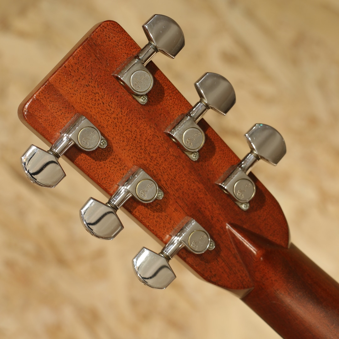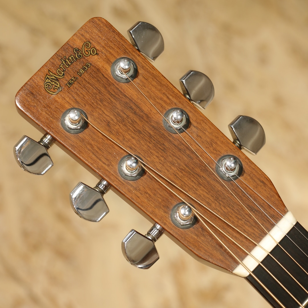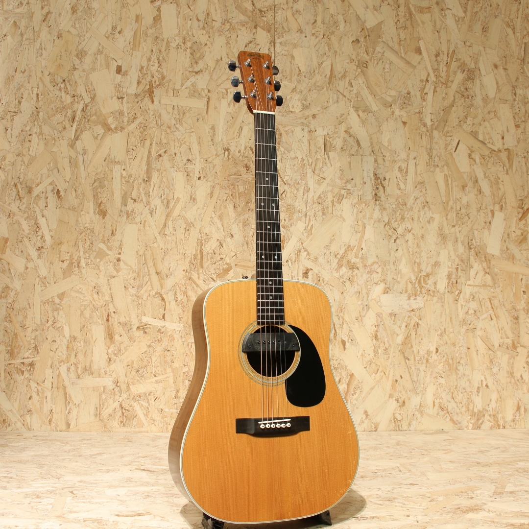1980年に生まれたサイズ”7”。ドレッドノートサイズを7/8インチにダウンサイズ、それ故にボディラインが他の数字サイズと比べてぱっと見で小型であることが分かりづらいですが、抱えてみるとかなりコンパクトであることが分かります。現在では廃番となっているモデルです。本器はスタイル28の”7-28”。製作開始の次の年に製造された1981年製のUSED品です。スプルーストップ、ローズウッドサイドバック、マホガニーネック、スクエアロッド、エボニー指板&ブリッジ、パールドット指板インレイ、シャーラーロトマチックペグ、ブラックピックガード、ノンスキャロップドXブレイシング、後付けにてアンフィニカスタムワークス製コンタクトピエゾ+サンライズのシステム搭載。当時のD-28をダウンサイズ、小型にした”7-28”。1981年の製造本数は記録上81本ほどと貴重な1本です。現在の”D Jr”が近いサイズ感、ですがクオリティは全く異なっています。内部の構造も専用に設計されるなど片手間で製作されていたわけではなく、本腰を入れて製作されていることが窺えるモデルです。抱えてみるとかなりの小型であることが分かりますが、弾きにくさはなく収まりの良いサイズ感。取り回しやすく、座って弾くにも丁度良い大きさです。ネックは現在と比べるとやや厚めで丸みの強いグリップ。ナット幅自体は42.9mmの為さほど握りにくさを感じづらく、親指での握り込んだグリップにも対応しやすくなっています。小型なギターとは思えない厚みのあるサウンド、ダイナミックな響き。流石にドレッドノートほどのレンジ感やロー感は出ませんが、その分中域の解像度が高まった音色。立ち上がりも早くなり、フィンガースタイルにも対応しやすいサウンドへと変化しています。スクエアロッド特有の太いサウンドも相まって、コシのあるサウンドを堪能できる1本です。後付けにてアンフィニカスタムワークス製コンタクト+サンライズのシステムを搭載。マグネットによるウォームなサウンドと芯を捉えた響き、コンタクトによるドライで空気感を捉えたサウンドを出力することができます。ステレオアウトのジャックから専用プリアンプ(Dual HA epas&EQ epas+)に接続することで各ピックアップのゲイン調整、EQにて音色調整が可能。ウォームなサウンドからドライなサウンドまで可変幅のあるシステムです。各ピックアップを個別に出力するステレオ出力、ミックスした状態で出力するモノラル出力どちらにも対応しており、好みに応じて選択することが出来ます。切り替えはステレオ出力用のジャックに接続するかしないかと非常に分かりやすい仕様。細やかな音作りまで拘れるステレオ、手軽に出力できるモノラル。EQの部分は好みのプリアンプに置き換えることもでき、用途に応じたチョイスが可能なシステムです。ボディサイド6弦側、ネックヒール横にストラップピンが装着されています。ピックガードに沿った形でブリッジにかけてピックガードクラック、裏からパッチを当てられ使用上問題の無い状態となっています。ボディバック面センターからやや6弦側の箇所に7-8cm程のクラック痕が見られ、こちらは接着剤を使い補修がされています。その他には塗装が反応したのかボディサイドやボディバック面のくびれ付近に塗装負け、ネック裏1F付近の皮脂に反応したであろう跡、表面的な当てキズや擦れキズ等見られますが、致命的なものは無く比較的良好な状態をキープされた個体。ネックはSQロッドの為チューニング時若干順反りとなりますが、弦高は現代の標準セッティング。非常に演奏しやすい状態をキープされており、サドルでの下げ幅も若干残した1本です。アンフィニカスタムワークスはプロのフィンガースタイルプレイヤーの使用でも有名なブランド、同梱されているプリアンプは数年のみ製造されていたシステムです。拘り派の方にも追従できる可能性を持ったシステムが搭載されたギター。この年代のマーチンは生産本数が少なく、年代を狙った購入も難しい時期です。なかなか見かけることも少ない時期の実践的で即戦力の1本、是非一度ご体感下さいませ。