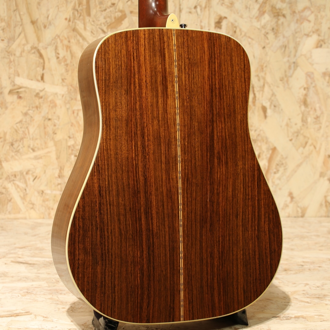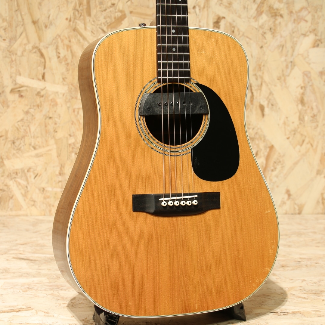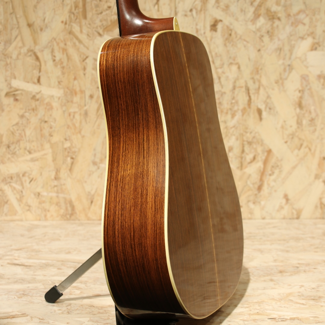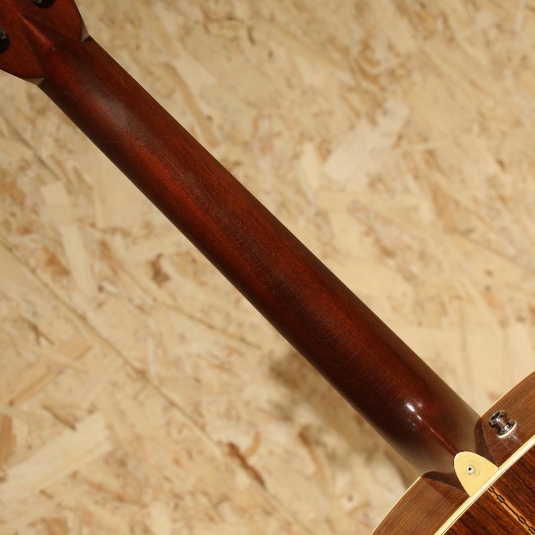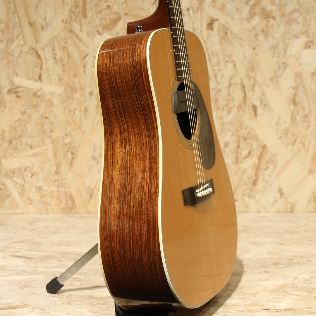 1980年に生まれたサイズ”7”。ドレッドノートサイズを7/8インチにダウンサイズ、それ故にボディラインが他の数字サイズと比べてぱっと見で小型であることが分かりづらいですが、抱えてみるとかなりコンパクトであることが分かります。現在では廃番となっているモデルです。本器はスタイル28の”7-28”。製作開始の次の年に製造された1981年製のUSED品です。スプルーストップ、ローズウッドサイドバック、マホガニーネック、スクエアロッド、エボニー指板&ブリッジ、パールドット指板インレイ、シャーラーロトマチックペグ、ブラックピックガード、ノンスキャロップドXブレイシング、後付けにてアンフィニカスタムワークス製コンタクトピエゾ+サンライズのシステム搭載。当時のD-28をダウンサイズ、小型にした”7-28”。1981年の製造本数は記録上81本ほどと貴重な1本です。現在の”D Jr”が近いサイズ感、ですがクオリティは全く異なっています。内部の構造も専用に設計されるなど片手間で製作されていたわけではなく、本腰を入れて製作されていることが窺えるモデルです。抱えてみるとかなりの小型であることが分かりますが、弾きにくさはなく収まりの良いサイズ感。取り回しやすく、座って弾くにも丁度良い大きさです。ネックは現在と比べるとやや厚めで丸みの強いグリップ。ナット幅自体は42.9mmの為さほど握りにくさを感じづらく、親指での握り込んだグリップにも対応しやすくなっています。小型なギターとは思えない厚みのあるサウンド、ダイナミックな響き。流石にドレッドノートほどのレンジ感やロー感は出ませんが、その分中域の解像度が高まった音色。立ち上がりも早くなり、フィンガースタイルにも対応しやすいサウンドへと変化しています。スクエアロッド特有の太いサウンドも相まって、コシのあるサウンドを堪能できる1本です。後付けにてアンフィニカスタムワークス製コンタクト+サンライズのシステムを搭載。マグネットによるウォームなサウンドと芯を捉えた響き、コンタクトによるドライで空気感を捉えたサウンドを出力することができます。ステレオアウトのジャックから専用プリアンプ(Dual HA epas&EQ epas+)に接続することで各ピックアップのゲイン調整、EQにて音色調整が可能。ウォームなサウンドからドライなサウンドまで可変幅のあるシステムです。各ピックアップを個別に出力するステレオ出力、ミックスした状態で出力するモノラル出力どちらにも対応しており、好みに応じて選択することが出来ます。切り替えはステレオ出力用のジャックに接続するかしないかと非常に分かりやすい仕様。細やかな音作りまで拘れるステレオ、手軽に出力できるモノラル。EQの部分は好みのプリアンプに置き換えることもでき、用途に応じたチョイスが可能なシステムです。ボディサイド6弦側、ネックヒール横にストラップピンが装着されています。ピックガードに沿った形でブリッジにかけてピックガードクラック、裏からパッチを当てられ使用上問題の無い状態となっています。ボディバック面センターからやや6弦側の箇所に7-8cm程のクラック痕が見られ、こちらは接着剤を使い補修がされています。その他には塗装が反応したのかボディサイドやボディバック面のくびれ付近に塗装負け、ネック裏1F付近の皮脂に反応したであろう跡、表面的な当てキズや擦れキズ等見られますが、致命的なものは無く比較的良好な状態をキープされた個体。ネックはSQロッドの為チューニング時若干順反りとなりますが、弦高は現代の標準セッティング。非常に演奏しやすい状態をキープされており、サドルでの下げ幅も若干残した1本です。アンフィニカスタムワークスはプロのフィンガースタイルプレイヤーの使用でも有名なブランド、同梱されているプリアンプは数年のみ製造されていたシステムです。拘り派の方にも追従できる可能性を持ったシステムが搭載されたギター。この年代のマーチンは生産本数が少なく、年代を狙った購入も難しい時期です。なかなか見かけることも少ない時期の実践的で即戦力の1本、是非一度ご体感下さいませ。