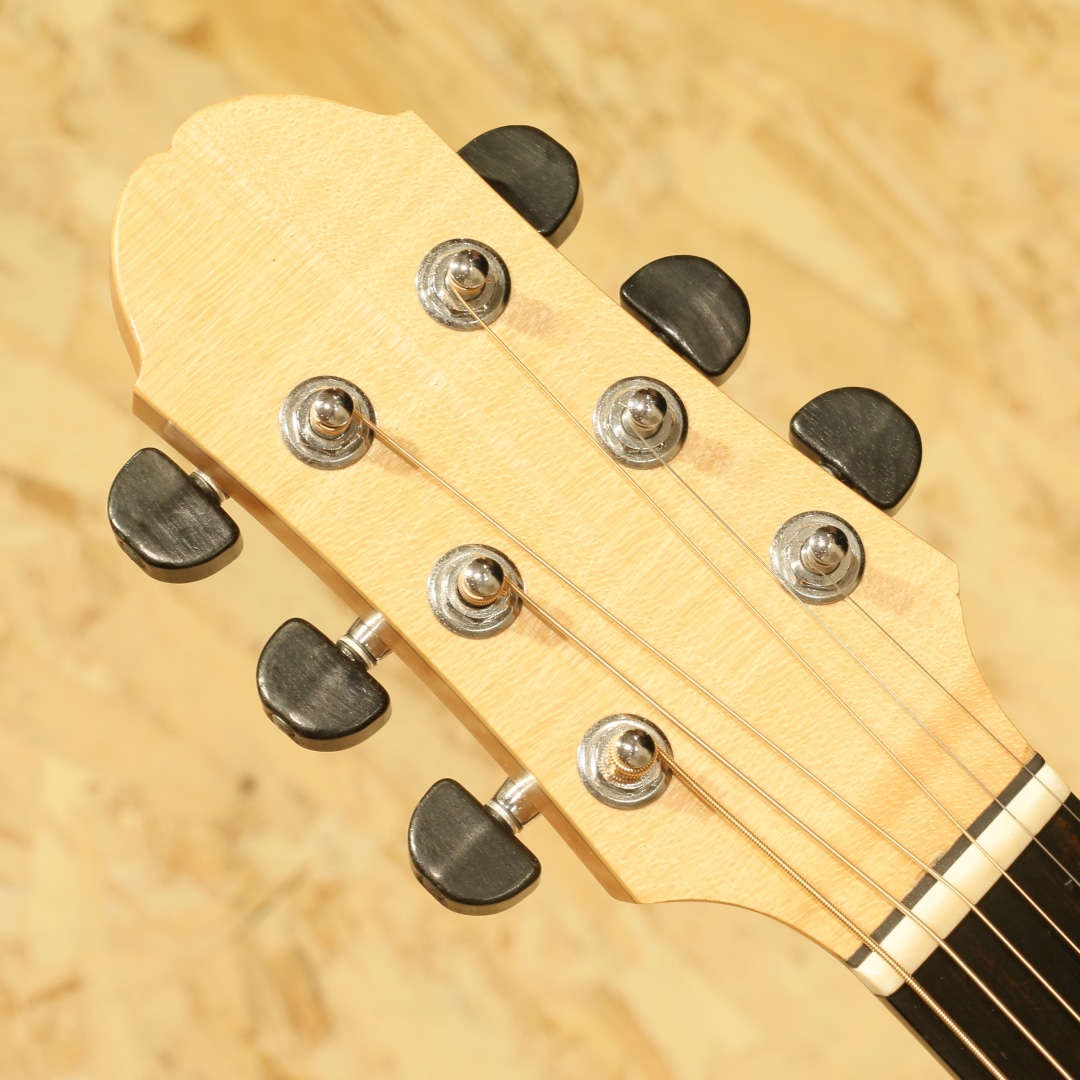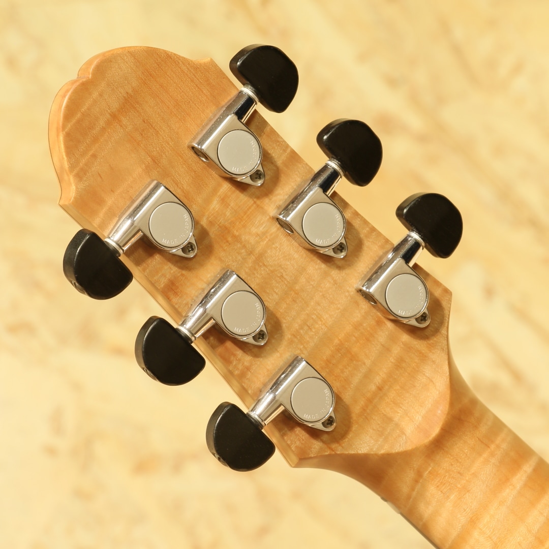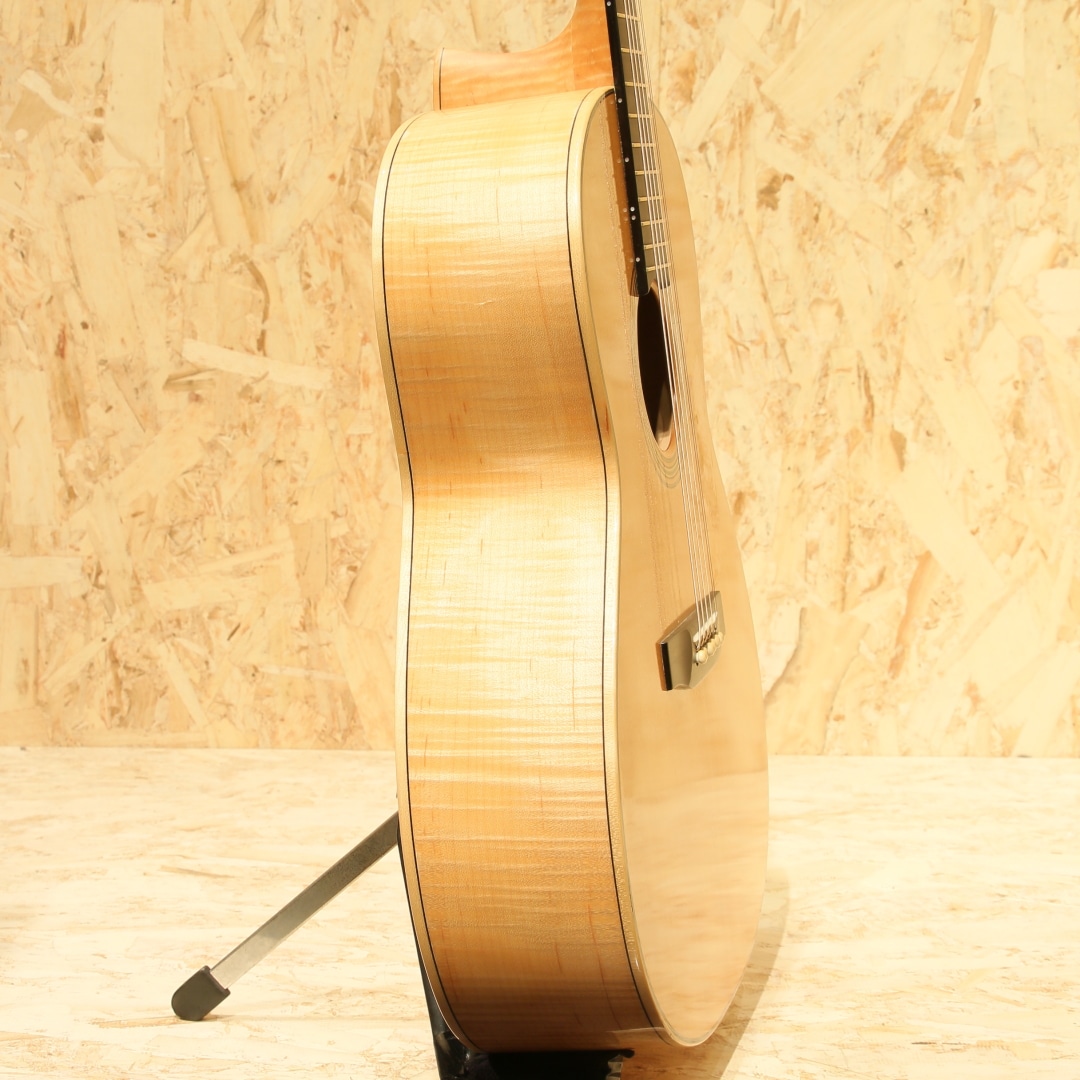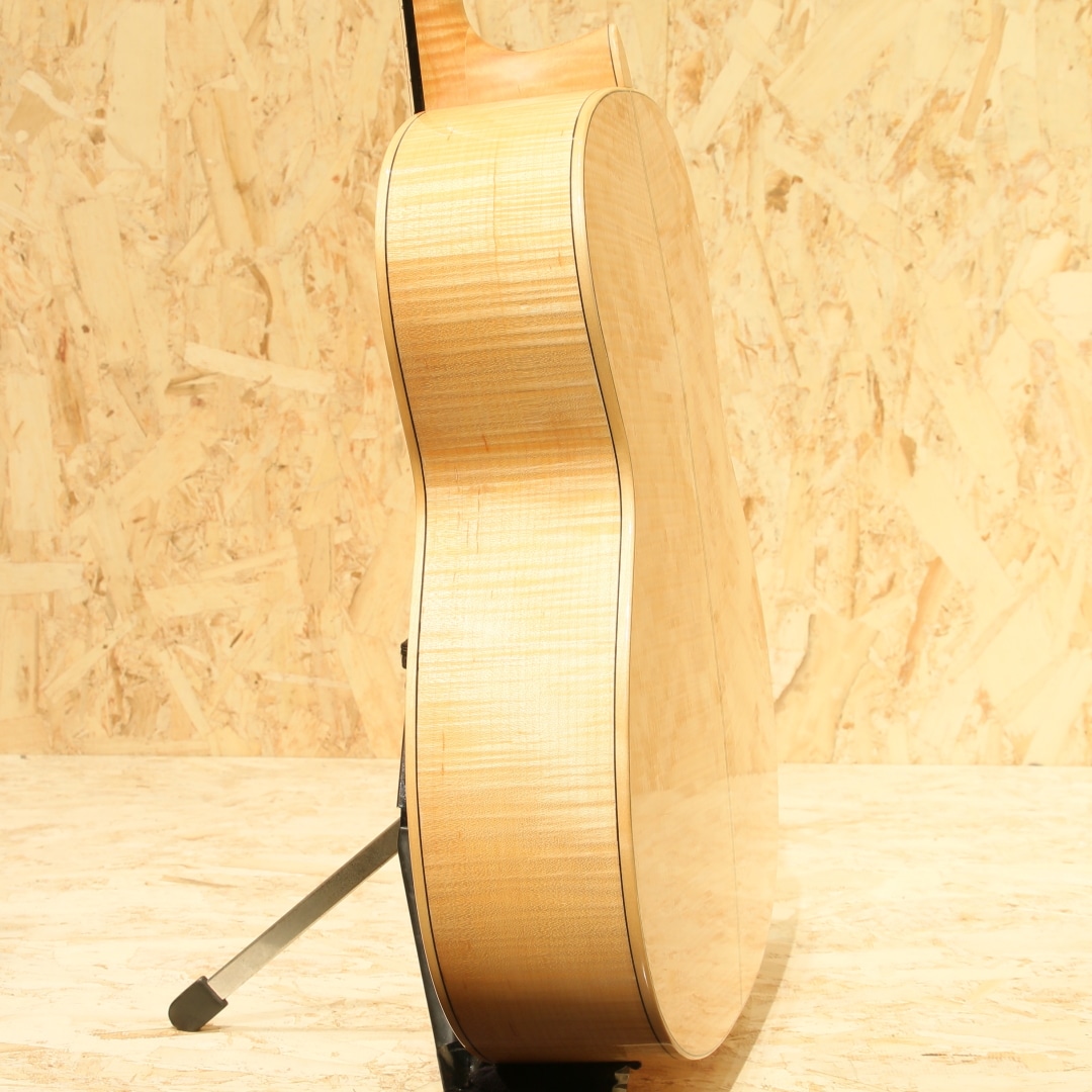 カナダの名門ラリビーに在籍した過去を持ち、オリジナリティのある発想や伝統的な手法をミックスした作風を持つ巨匠”サーゲー・デ・ヤング”。門下生の内何名かは日本で製作を行っており、それぞれサーゲーの下で学んだ技術を糧に製作を行っています。本器はクラシックギターのようなシェイプ、15.5”ボディ幅に少し深めの胴圧を持つスタンダード・スチール・ストリングモデル"SSS”。美しいフレイムメイプルを用いた1996年製USED品です。スプルーストップ、フィドルバックの様な美しい杢のフレイムメイプルサイド&バック、フレイムメイプルネック、エボニー指板&ブリッジ、ゴトー製ロトマチックペグ、ウッドパーフリングロゼッタ、メイプルバインディング、クリアピックガード。クラシックギター製作のキャリアを持つサーゲ氏ならではの美しいフォルムの本器。滑らかな曲線、カナダ名産のメイプルの中でもフレイム杢が入った良材を使用した1本です。カナダ製ギターで感じられるキラキラとした明るく響く空気感は元より、より情報量の高いサウンドへと仕上げられています。クイックに反応するレスポンスと奥深く響く倍音。しっかりとサスティンが得られ、ぼやけず美しい響きが奏でられます。柔らかいタッチには繊細なトーンで響き、強めのタッチではダイナミックに、甘いトーンや明朗としたトーンへとニュアンスによって切り替えが出来る弾きごたえ十分な音色。表情の変化を付けて演奏したくなるギターです。ソロスタイルはもちろん、優美に奏でるアルペジオも存分にこなしてくれます。ラッカーフィニッシュがなされており、いくらかの小傷は見られますがキレイなコンディションを保っています。ネック周りも良好で、とても弾きやすいアクションを保っています。アメリカ製の堅牢なテイストとは異なる繊細さを持つ1本。是非、お手元でお確かめください。その他詳細などはお気軽にお問い合わせ下さい。ハードケース付属