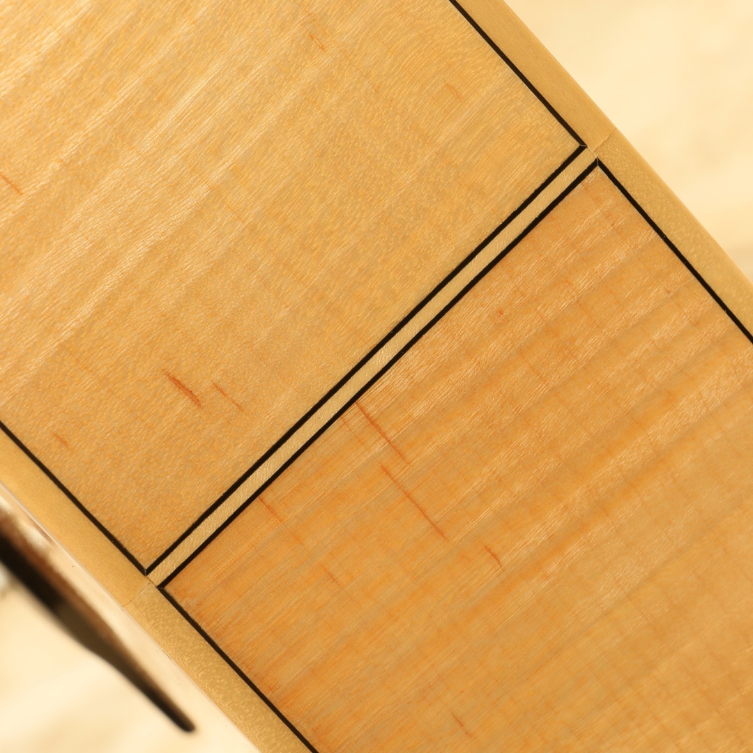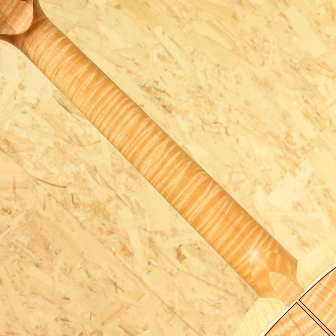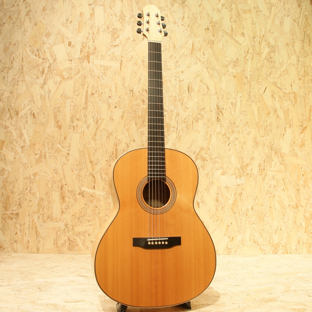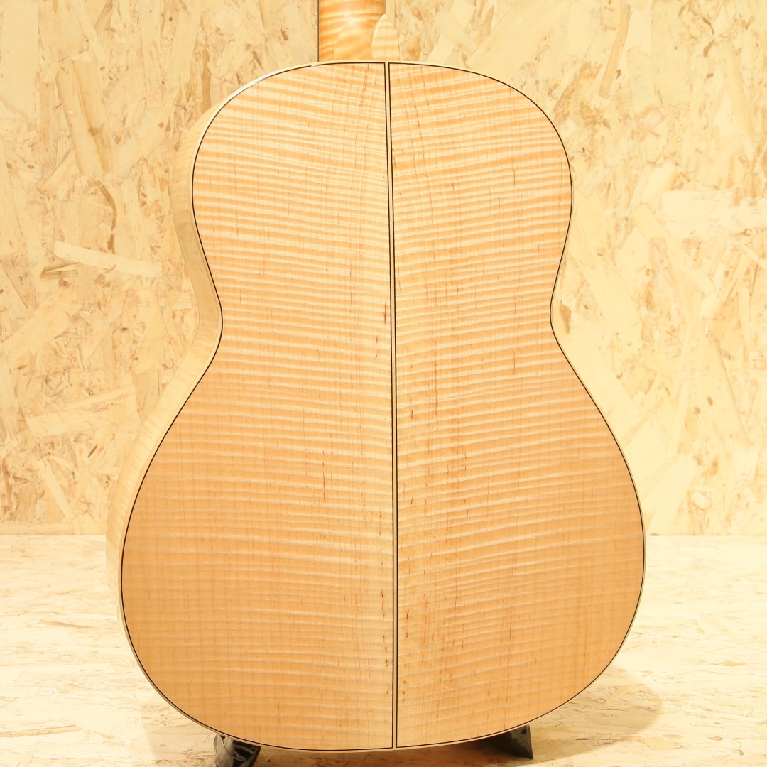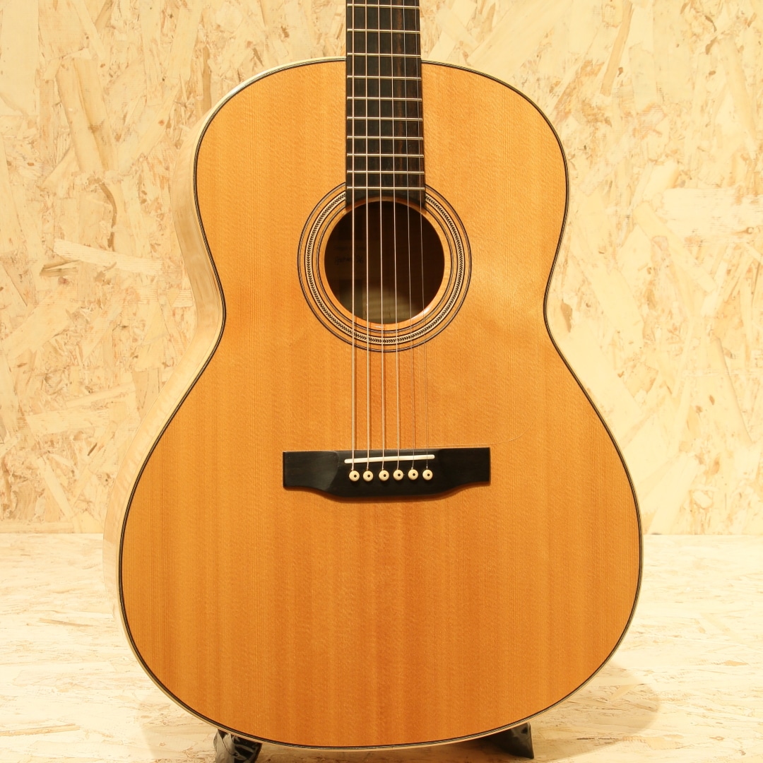 カナダの名門ラリビーに在籍した過去を持ち、オリジナリティのある発想や伝統的な手法をミックスした作風を持つ巨匠”サーゲー・デ・ヤング”。門下生の内何名かは日本で製作を行っており、それぞれサーゲーの下で学んだ技術を糧に製作を行っています。本器はクラシックギターのようなシェイプ、15.5”ボディ幅に少し深めの胴圧を持つスタンダード・スチール・ストリングモデル"SSS”。美しいフレイムメイプルを用いた1996年製USED品です。スプルーストップ、フィドルバックの様な美しい杢のフレイムメイプルサイド&バック、フレイムメイプルネック、エボニー指板&ブリッジ、ゴトー製ロトマチックペグ、ウッドパーフリングロゼッタ、メイプルバインディング、クリアピックガード。クラシックギター製作のキャリアを持つサーゲ氏ならではの美しいフォルムの本器。滑らかな曲線、カナダ名産のメイプルの中でもフレイム杢が入った良材を使用した1本です。カナダ製ギターで感じられるキラキラとした明るく響く空気感は元より、より情報量の高いサウンドへと仕上げられています。クイックに反応するレスポンスと奥深く響く倍音。しっかりとサスティンが得られ、ぼやけず美しい響きが奏でられます。柔らかいタッチには繊細なトーンで響き、強めのタッチではダイナミックに、甘いトーンや明朗としたトーンへとニュアンスによって切り替えが出来る弾きごたえ十分な音色。表情の変化を付けて演奏したくなるギターです。ソロスタイルはもちろん、優美に奏でるアルペジオも存分にこなしてくれます。ラッカーフィニッシュがなされており、いくらかの小傷は見られますがキレイなコンディションを保っています。ネック周りも良好で、とても弾きやすいアクションを保っています。アメリカ製の堅牢なテイストとは異なる繊細さを持つ1本。是非、お手元でお確かめください。その他詳細などはお気軽にお問い合わせ下さい。ハードケース付属