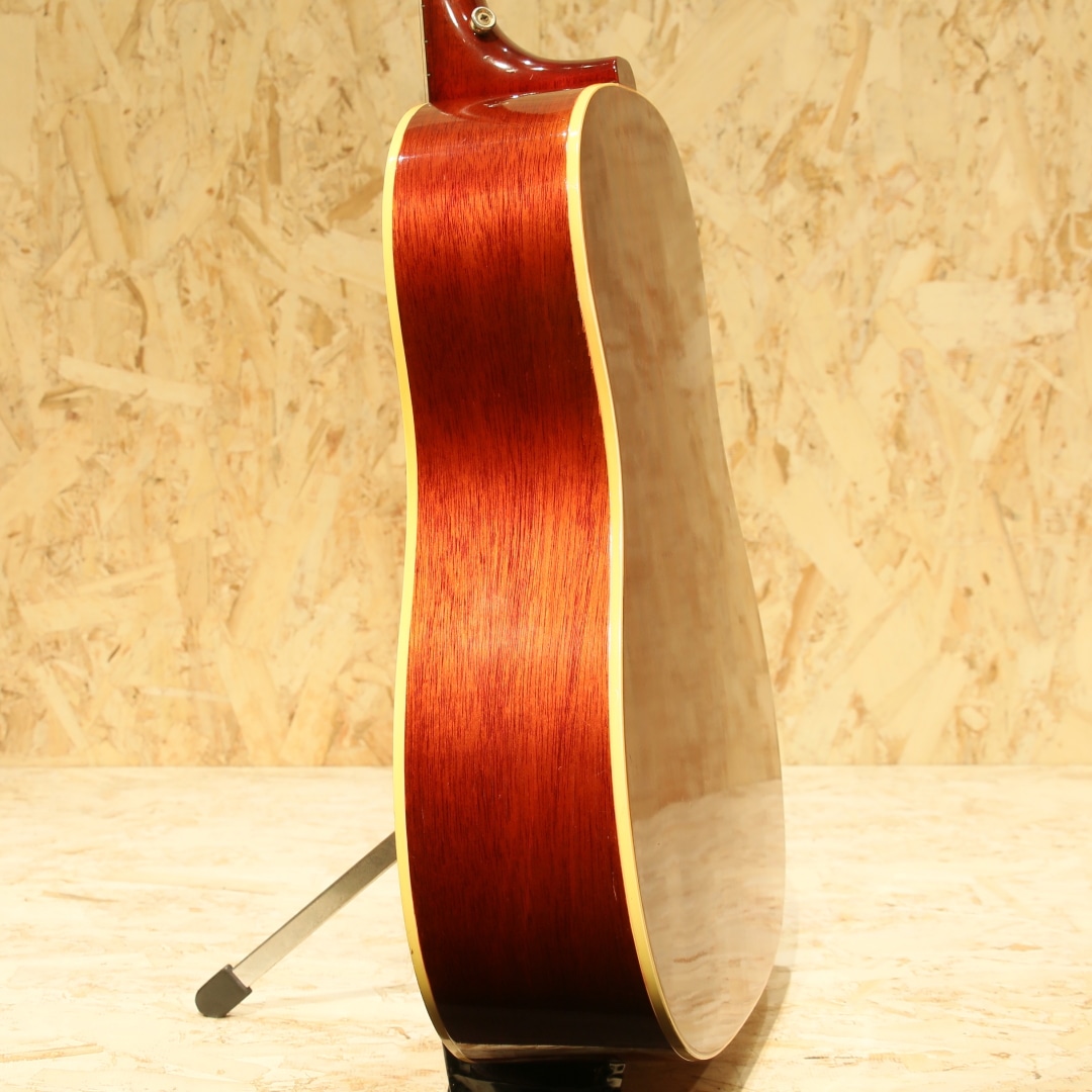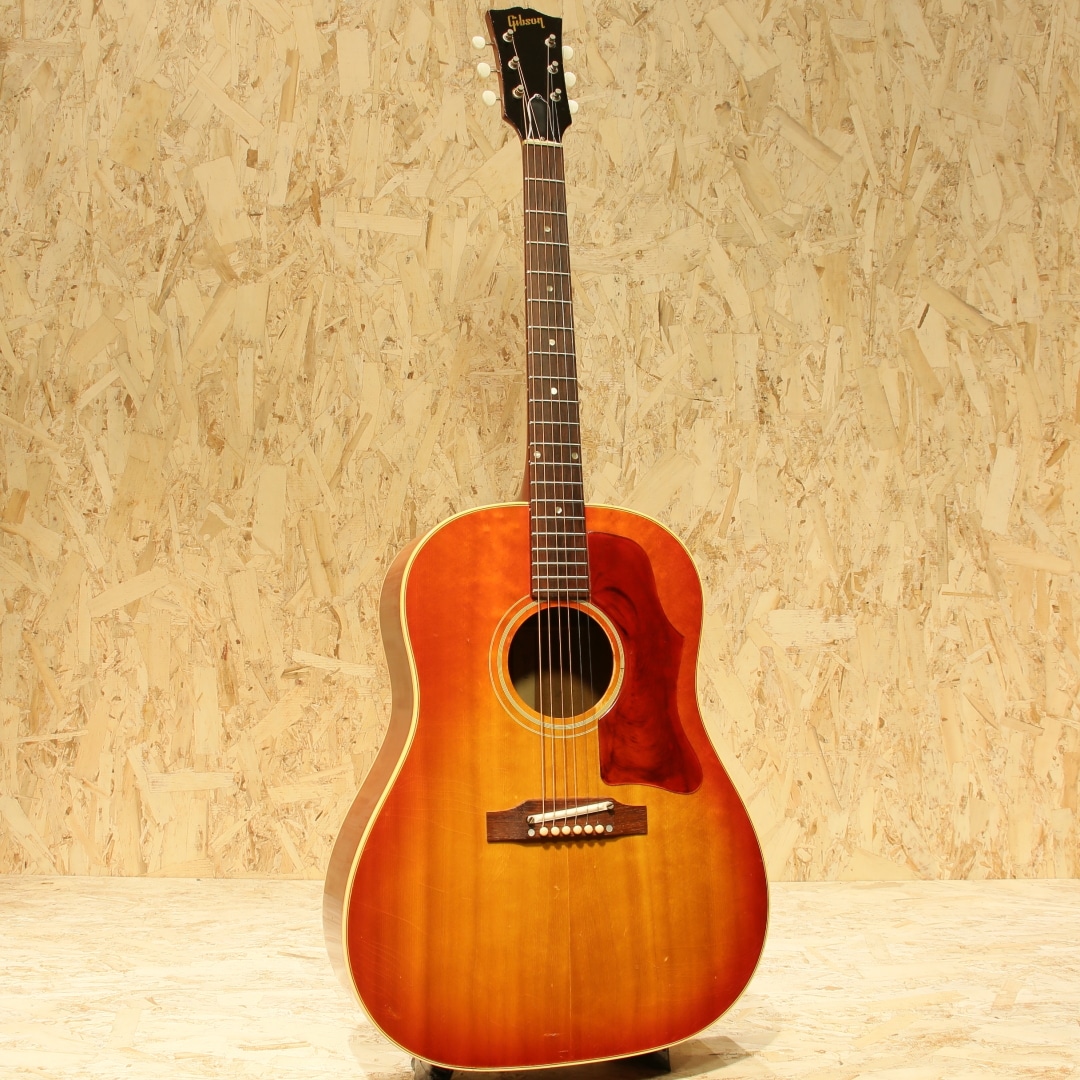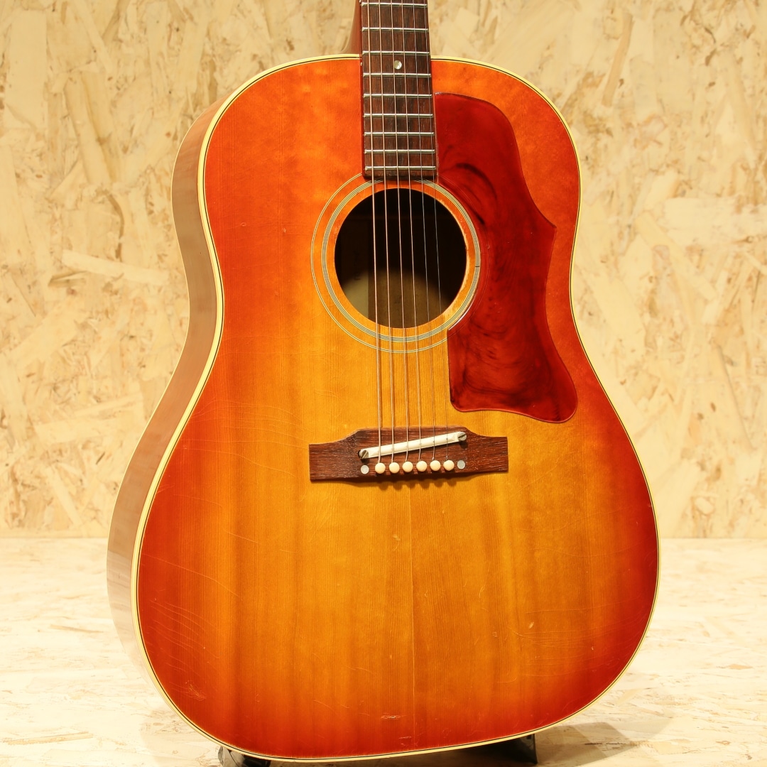 1942年にギブソンが発売を開始した機種J-45、通称ワーキング・ホース。説明不要のギブソンベストセラーモデルです。1966年後半から1967年初めにかけて製造されたもので徐々に赤みが増しだすチェリーサンバースト期の過渡期の品です。スプルーストップ、マホガニーサイド&バック、マホガニーネック、ハカランダ指板&ブリッジ、3Per Plateクルーソンペグは実用性重視で現行のものにリプレイス、指板ドットインレイ、オリジナルの厚手のベッコウ柄ラージセルロイドラージピックガード、ダブルリングロゼッタ、ノンスキャロップド・エックスブレイシング、ナット幅約39.5ミリナローネック、14度ヘッド角。和音のまとまりが良く、比較的ワイドな音像の個体。エアリーで広がりのあるサウンドですがコンプ感が強く、ストロークをした瞬間に手元や腹への振動がよく伝わります。マグネットタイプのピックアップをマウントするためエンドピンはジャックサイズに拡張。現在は取り外され、同サイズのウッドピンがマウントされています。ネックヒールサイドにストラップピンマウント、打痕やひっかき傷など点々と小傷はみられ、全体的にも塗装のチェックは見られますがむしろギブソンヴィンテージとしては欲しいレベルの風合いでよい顔、塗装はすべてオリジナルフィニッシュをキープしています。ウッドのクラックなどはなく大変良い状態をキープしています。オリジナルのミカルタナット、オリジナルフレット、ADJパーツのスクリューや艶消しのセラミックサドルもキープ。ネックも美しいストレートで大変良好なプレイコンディション。顔良し、サウンド良しで実用性も兼ね備えたファインビンテージ。取っ手部分などやや使用感はありますが、NAZCA製高級GIGケース付属します。ぜひお早めに。