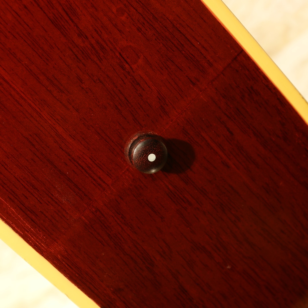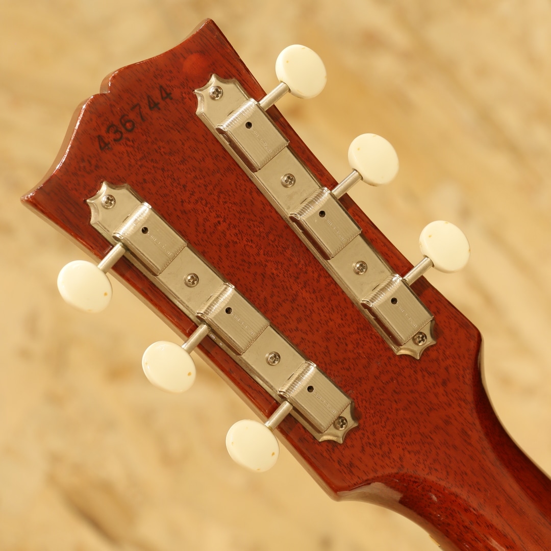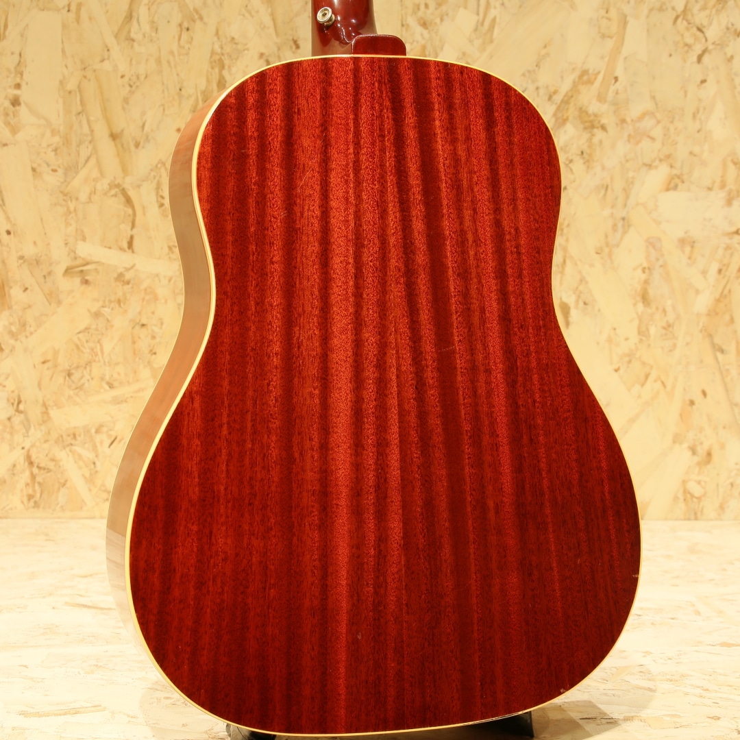 1942年にギブソンが発売を開始した機種J-45、通称ワーキング・ホース。説明不要のギブソンベストセラーモデルです。1966年後半から1967年初めにかけて製造されたもので徐々に赤みが増しだすチェリーサンバースト期の過渡期の品です。スプルーストップ、マホガニーサイド&バック、マホガニーネック、ハカランダ指板&ブリッジ、3Per Plateクルーソンペグは実用性重視で現行のものにリプレイス、指板ドットインレイ、オリジナルの厚手のベッコウ柄ラージセルロイドラージピックガード、ダブルリングロゼッタ、ノンスキャロップド・エックスブレイシング、ナット幅約39.5ミリナローネック、14度ヘッド角。和音のまとまりが良く、比較的ワイドな音像の個体。エアリーで広がりのあるサウンドですがコンプ感が強く、ストロークをした瞬間に手元や腹への振動がよく伝わります。マグネットタイプのピックアップをマウントするためエンドピンはジャックサイズに拡張。現在は取り外され、同サイズのウッドピンがマウントされています。ネックヒールサイドにストラップピンマウント、打痕やひっかき傷など点々と小傷はみられ、全体的にも塗装のチェックは見られますがむしろギブソンヴィンテージとしては欲しいレベルの風合いでよい顔、塗装はすべてオリジナルフィニッシュをキープしています。ウッドのクラックなどはなく大変良い状態をキープしています。オリジナルのミカルタナット、オリジナルフレット、ADJパーツのスクリューや艶消しのセラミックサドルもキープ。ネックも美しいストレートで大変良好なプレイコンディション。顔良し、サウンド良しで実用性も兼ね備えたファインビンテージ。取っ手部分などやや使用感はありますが、NAZCA製高級GIGケース付属します。ぜひお早めに。