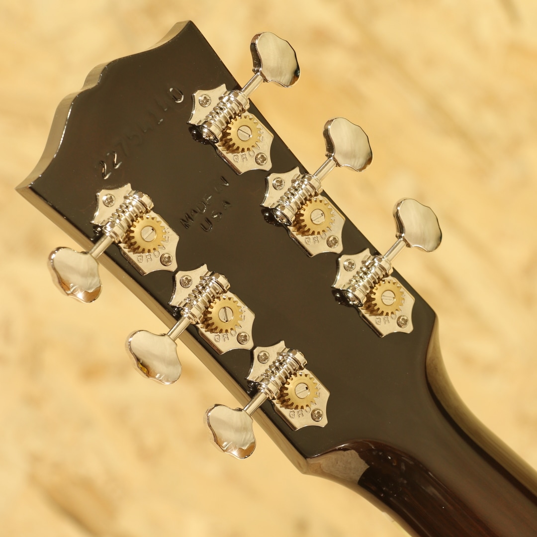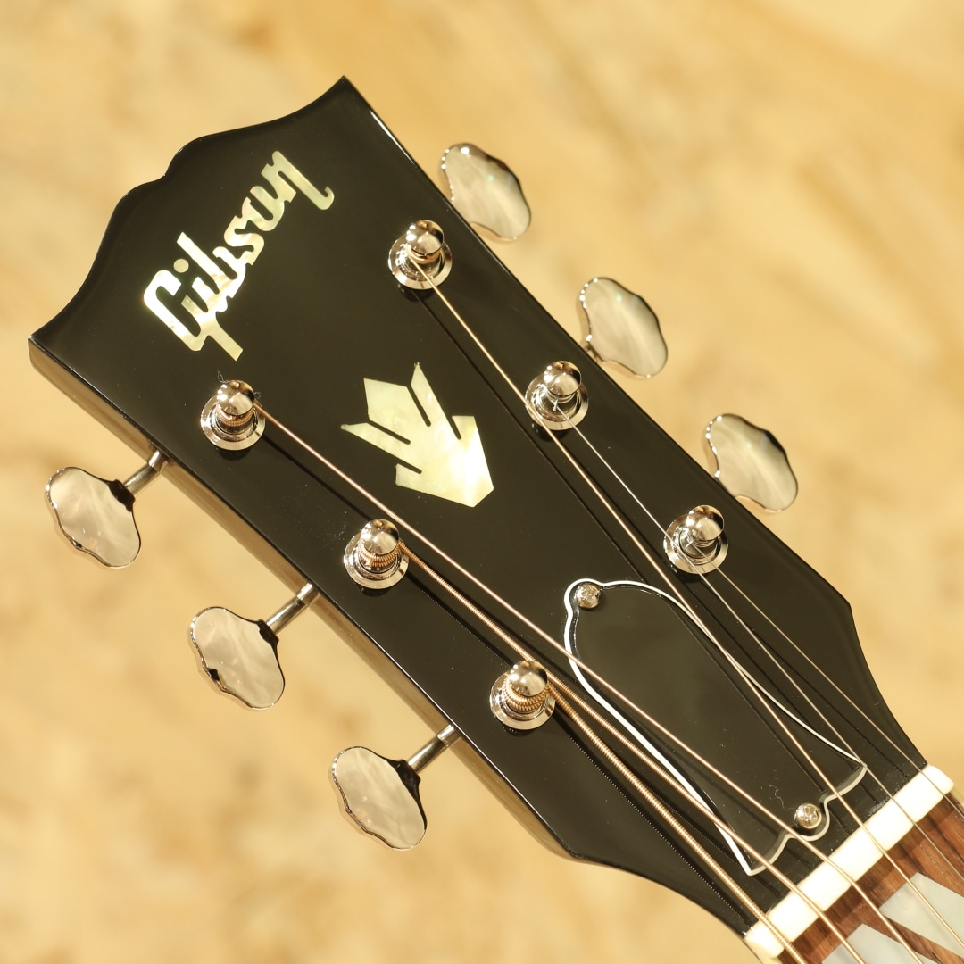 ギブソンラウンドショルダーの元祖である"Jumbo"から枝分かれしたAdvanced Jumboの後継となったモデルのうちの一つであり、現在ではもっともポピュラーなJ-45の上位機種という位置づけとなっているギター”サザンジャンボ”。本器は2020年よりリリースされたアコースティックオリジナルシリーズの”Southern Jumbo Original”。シトカスプルーストップ、マホガニーサイド&バック、マホガニーネック、ローズウッド指板&アッパーベリーブリッジ、グローバーオープンバックペグ、ヘッドクラウンインレイ、ダブルパラレログラム指板インレイ、ベッコウ柄ラージピックガード、スキャロップド・エックスブレイシング、L.R.Baggs Element VTCピックアップ標準装備。トラディショナルなスタイル、40年代中期から製造が始まりそのクラシカルな風合いを現代に蘇らせた本モデル。当初の仕様であるオープンバックペグ、サザンジャンボと言えばでよくイメージされる50年代後半からのラージピックガード、上位機種の証であるクラウンヘッドインレイやダブルパラレログラム指板インレイ。古き良きスタイルを踏襲して製造されています。ネック等の演奏面では薄く握りやすい現代的なスタイルのネックを採用。指板エッジを丸めて握り込みやすくしたグリップなどは以前から引き続き採用されており、握り込んだ演奏スタイルから細やかなフレージングでの演奏まで対応できるオールマイティさを獲得しています。ギブソンアコースティックの醍醐味といえるファットかつボリューミーなサウンド。爆発力を感じられるふくよかな響き、空気感を伴った抱擁感のあるトーン、J45とはやや異なった艶やかな響きを堪能することが出来ます。演奏スタイルを問うことはありませんが、やはり歌モノで活躍してくれることの多そうなサウンド。ステージングを支える相棒として申し分のない1本です。搭載のエレメントVTCピックアップは最新の1ボリューム/1トーン仕様。シンプルなコントローラーは操作に迷う事も少なく、ナチュラルでパワフルなサウンドを出力できます。サザンジャンボは著名アーティストの使用でも有名、ゴージャスでありながら気取っていないそのデザインからギブソンフラットトップの中でも確固たる人気を誇るモデル、是非お手元でご体感下さいませ。オリジナルハードケースが付属します。