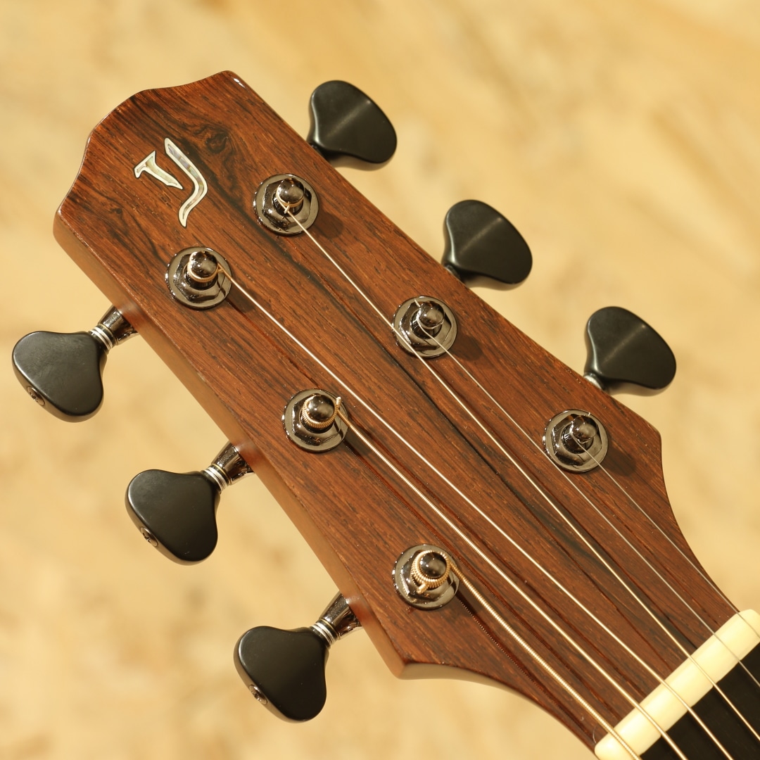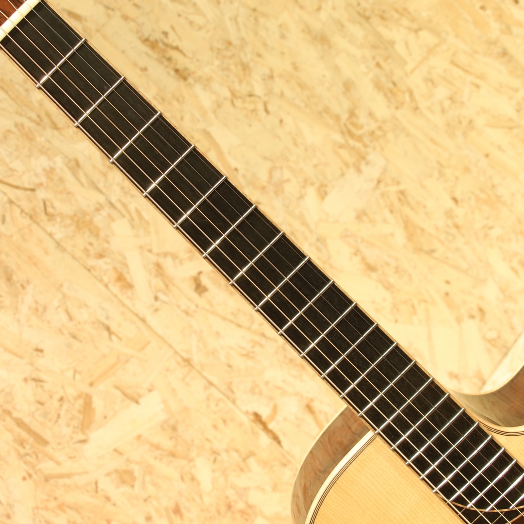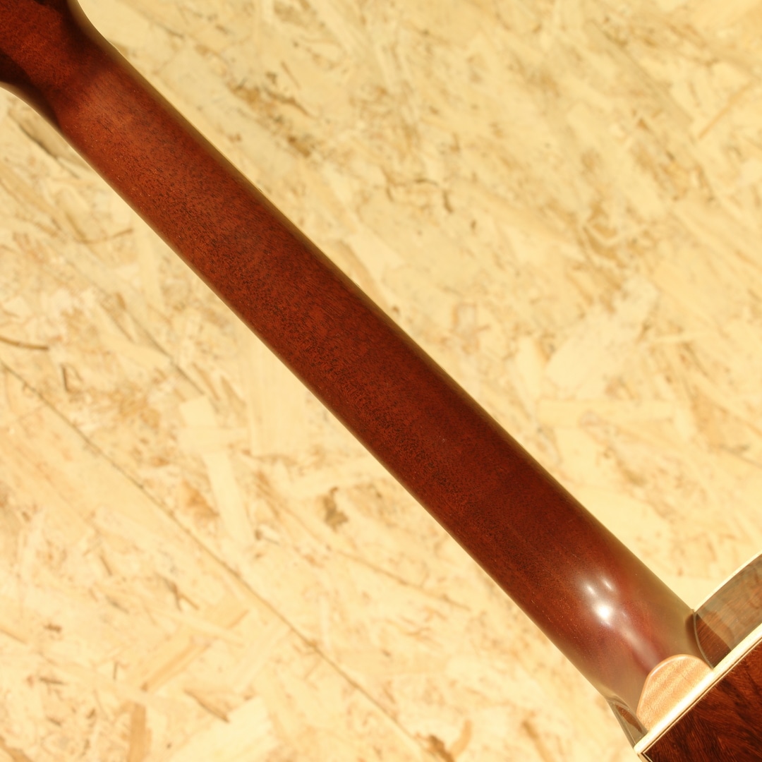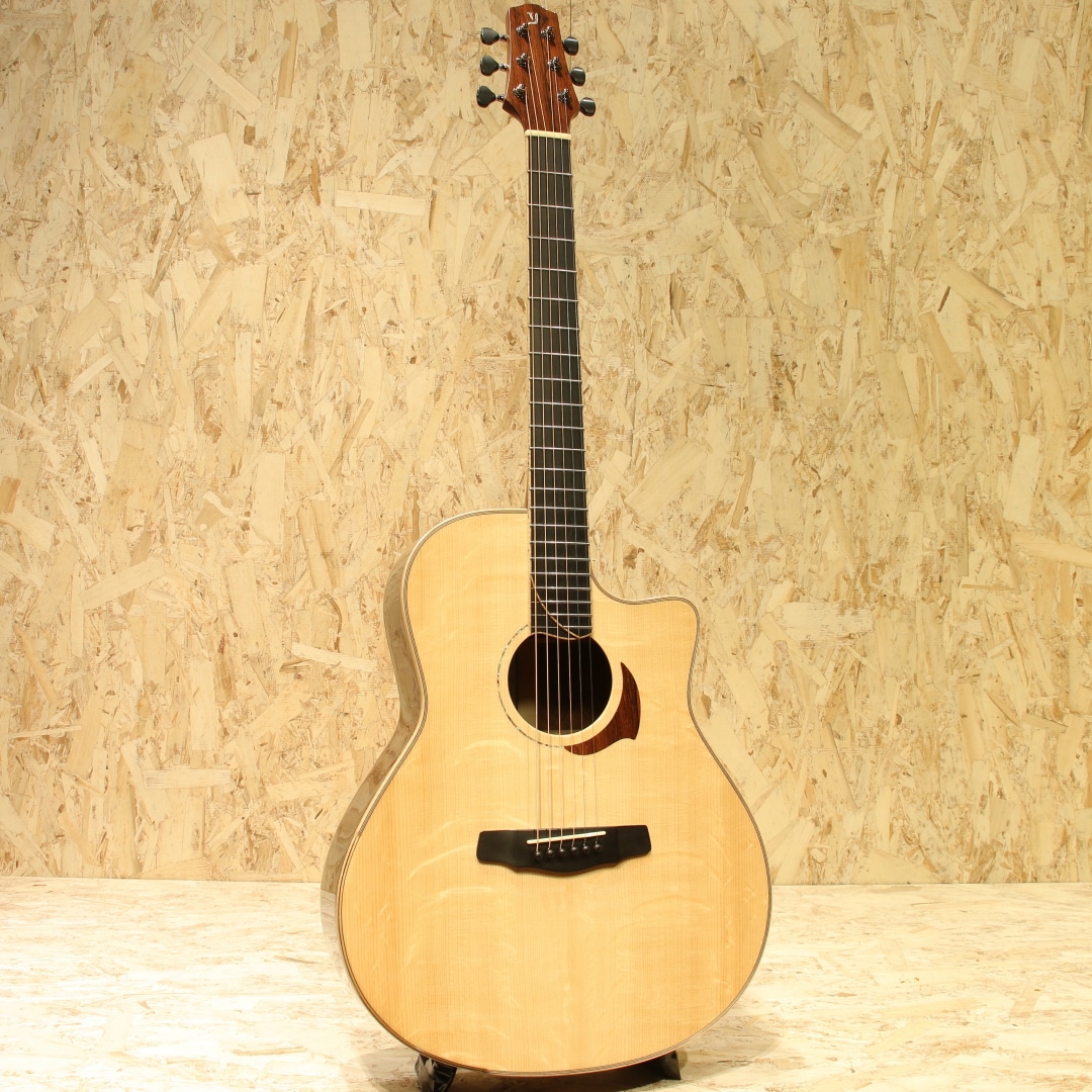某国内大手ファクトリーの手工部門を手掛けたのち、独立し長野県の工房にておよそ25年近くのキャリアを持つルシアー"横山正"氏による”Yokoyama Guitars”。本器は定番オリジナルオーディトリアムボディ、カッタウェイ仕様”AR-GMR”。2020年代製USED品です。ベアクロウ杢の入ったジャーマンスプルーストップ、マダガスカルローズウッドサイド&バック、マホガニーネック、ブラックエボニー指板&ブリッジ、ゴトー製510ブラックペグ(エボニーノブ)、ウッドトリム、アバロン&ウッドオリジナルロゼッタ、メイプルボディ&指板バインディング、オリジナルXブレイシング。フィンガースタイルで人気を博す横山ギター。木材の質感を活かしたナチュラルな外観、薄く握りやすいグリップ、抱えやすさとサウンドのバランスが取れたボディ。個性も感じられるシンプルな装飾も含め質実剛健さを感じられるギターです。ネック自体は薄平のグリップで握り込みやすく、手の自由が効きやすい仕様。ボディにはカッタウェイも搭載されているため、ポジションを問わずに上下を行き来しやすい演奏性をも確保されています。両者とも複雑な押弦や幅広いポジションを使用するフィンガースタイルには持ってこいな仕様となっております。材の選定も横山ギターらしい人気の材、フィンガースタイルや手工において多用されるジャーマンスプルースと今や貴重となったマダガスカルローズウッドの組み合わせ。ジャーマンスプルースは上品で奥ゆかしい響きを出力する材、倍音感のある音色を持ち味としています。マダガスカルローズウッドはレンジ感が広く、クリアな響きやハイの立ち方が心地よい材。メロディラインを際立たせる為には高音が抜けて欲しいため、こちらもフィンガースタイルでの演奏にはうってつけの材選定と言えるでしょう。何より音の立ち上がりが早く、音が前に出る音色作り。フィンガースタイルにおいて繊細なタッチを素早く前に出せるのは大きなメリットです。弦の輪郭もハッキリ出やすく、もたつきの無いスッキリシャープな響きや透明感を持ったクリアなサウンド。やはりフィンガースタイルプレイヤーに支持されることが多いのも頷ける仕様とサウンドを持った、個人製作家のギターです。ボディトップ面1弦側下部に塗装時に僅か塗装が垂れたような跡が見られますが、手触り上凹凸などの違和感はなく光にかざすと分かる程度で使用上問題はございません。その他ボディトップ面カッタウェイ箇所にこちらも光にかざすと分かる程度の薄い当てキズ、ボディトップ面ボトム箇所に2カ所薄い当てキズやボディバック面の薄い擦れキズ等見られますが、全体を通して使用感の薄い状態をキープされている本器。ネック周りは抜群の状態を保たれ、フィンガースタイルの拘りに応じられるポテンシャルを持った1本です。メーカー勤務経験もあるため手掛けてきた数が非常に多い横山氏。蓄積されてきた経験値は言わずもがな、モーリスはフィンガーピッキング向けのギターを製作している等ノウハウも持っている個人製作家です。完全ハンドメイドの手工系でかつ名のあるルシアーの個体としてもコスパの高い一品。造りと音の美しさをぜひお手元でお確かめ下さい。