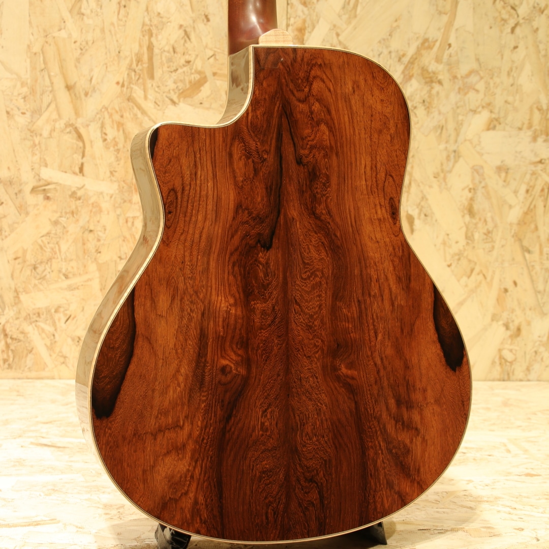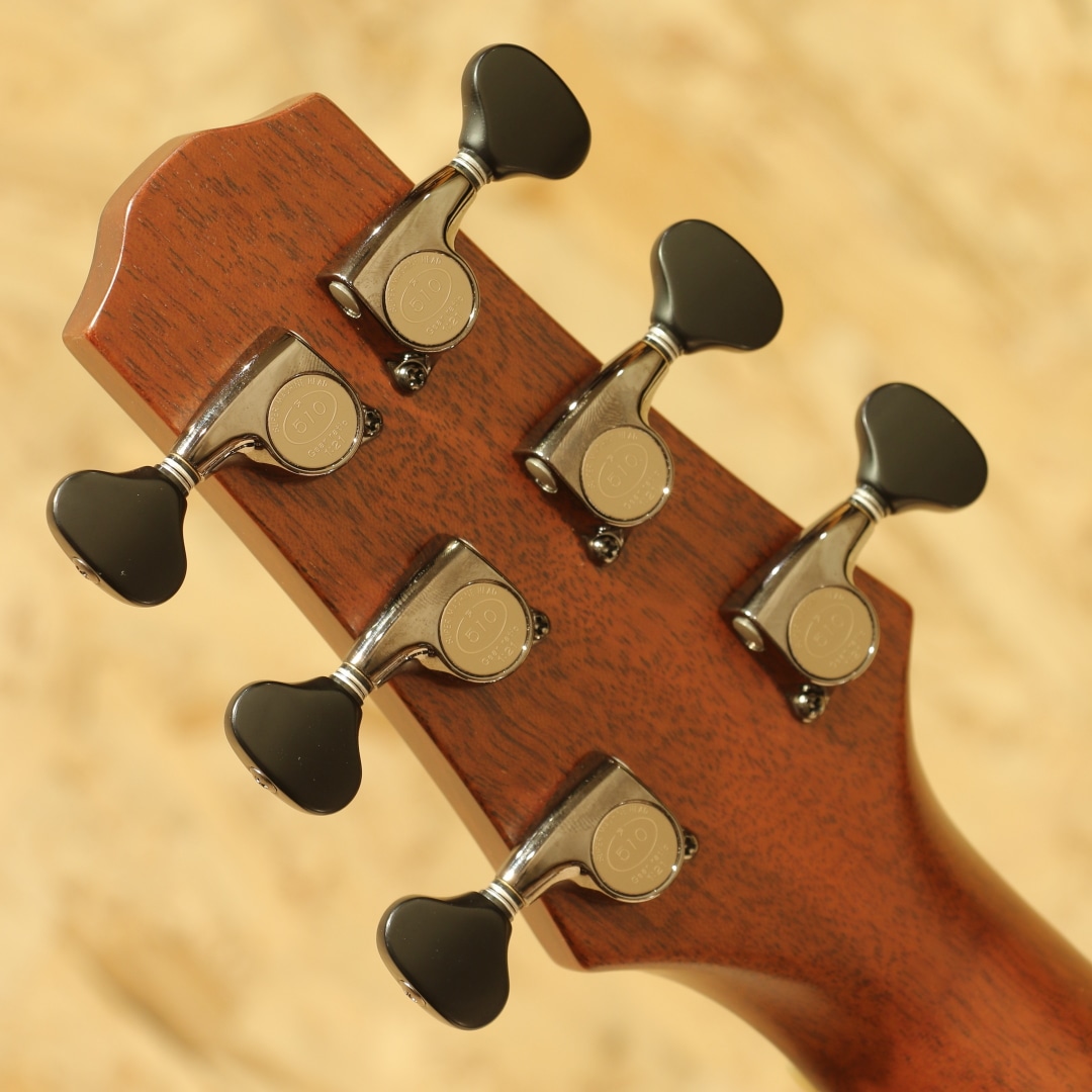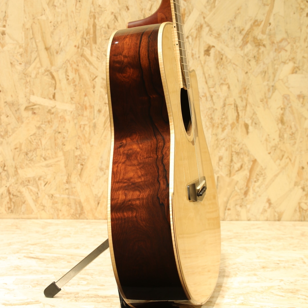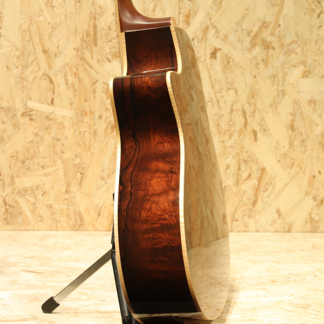 某国内大手ファクトリーの手工部門を手掛けたのち、独立し長野県の工房にておよそ25年近くのキャリアを持つルシアー"横山正"氏による”Yokoyama Guitars”。本器は定番オリジナルオーディトリアムボディ、カッタウェイ仕様”AR-GMR”。2020年代製USED品です。ベアクロウ杢の入ったジャーマンスプルーストップ、マダガスカルローズウッドサイド&バック、マホガニーネック、ブラックエボニー指板&ブリッジ、ゴトー製510ブラックペグ(エボニーノブ)、ウッドトリム、アバロン&ウッドオリジナルロゼッタ、メイプルボディ&指板バインディング、オリジナルXブレイシング。フィンガースタイルで人気を博す横山ギター。木材の質感を活かしたナチュラルな外観、薄く握りやすいグリップ、抱えやすさとサウンドのバランスが取れたボディ。個性も感じられるシンプルな装飾も含め質実剛健さを感じられるギターです。ネック自体は薄平のグリップで握り込みやすく、手の自由が効きやすい仕様。ボディにはカッタウェイも搭載されているため、ポジションを問わずに上下を行き来しやすい演奏性をも確保されています。両者とも複雑な押弦や幅広いポジションを使用するフィンガースタイルには持ってこいな仕様となっております。材の選定も横山ギターらしい人気の材、フィンガースタイルや手工において多用されるジャーマンスプルースと今や貴重となったマダガスカルローズウッドの組み合わせ。ジャーマンスプルースは上品で奥ゆかしい響きを出力する材、倍音感のある音色を持ち味としています。マダガスカルローズウッドはレンジ感が広く、クリアな響きやハイの立ち方が心地よい材。メロディラインを際立たせる為には高音が抜けて欲しいため、こちらもフィンガースタイルでの演奏にはうってつけの材選定と言えるでしょう。何より音の立ち上がりが早く、音が前に出る音色作り。フィンガースタイルにおいて繊細なタッチを素早く前に出せるのは大きなメリットです。弦の輪郭もハッキリ出やすく、もたつきの無いスッキリシャープな響きや透明感を持ったクリアなサウンド。やはりフィンガースタイルプレイヤーに支持されることが多いのも頷ける仕様とサウンドを持った、個人製作家のギターです。ボディトップ面1弦側下部に塗装時に僅か塗装が垂れたような跡が見られますが、手触り上凹凸などの違和感はなく光にかざすと分かる程度で使用上問題はございません。その他ボディトップ面カッタウェイ箇所にこちらも光にかざすと分かる程度の薄い当てキズ、ボディトップ面ボトム箇所に2カ所薄い当てキズやボディバック面の薄い擦れキズ等見られますが、全体を通して使用感の薄い状態をキープされている本器。ネック周りは抜群の状態を保たれ、フィンガースタイルの拘りに応じられるポテンシャルを持った1本です。メーカー勤務経験もあるため手掛けてきた数が非常に多い横山氏。蓄積されてきた経験値は言わずもがな、モーリスはフィンガーピッキング向けのギターを製作している等ノウハウも持っている個人製作家です。完全ハンドメイドの手工系でかつ名のあるルシアーの個体としてもコスパの高い一品。造りと音の美しさをぜひお手元でお確かめ下さい。
