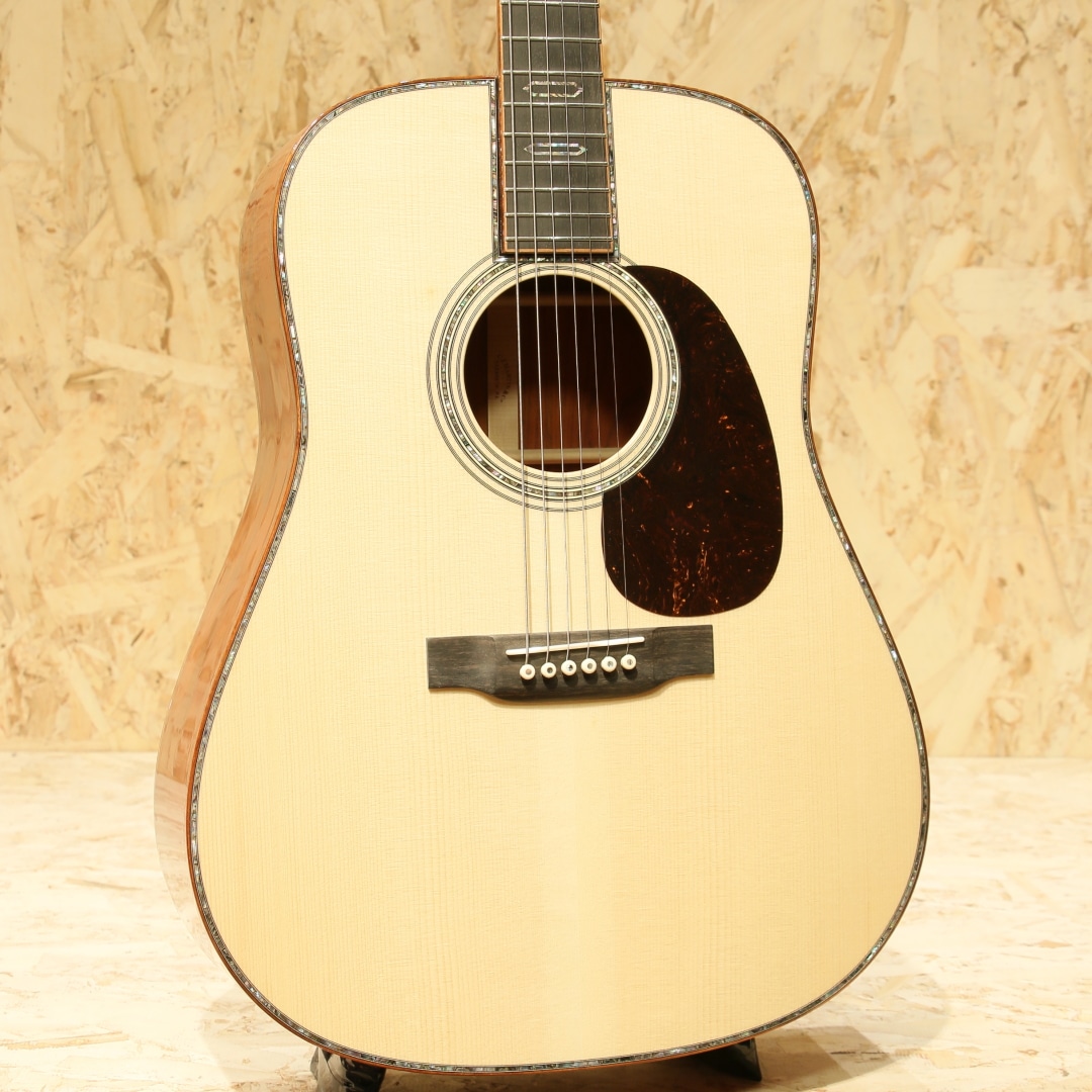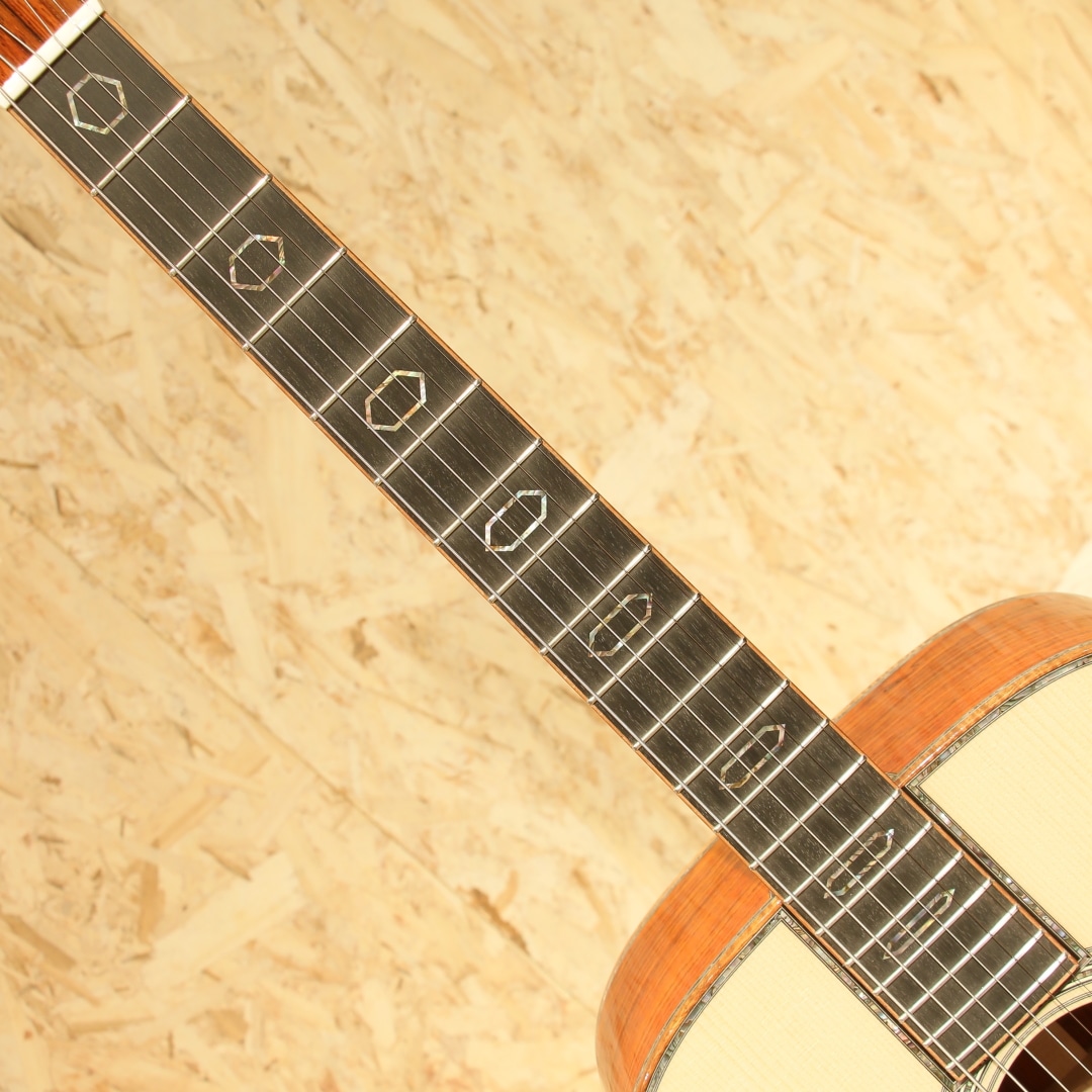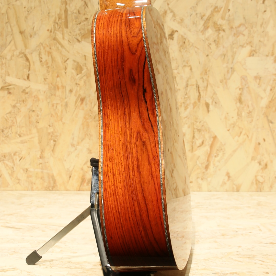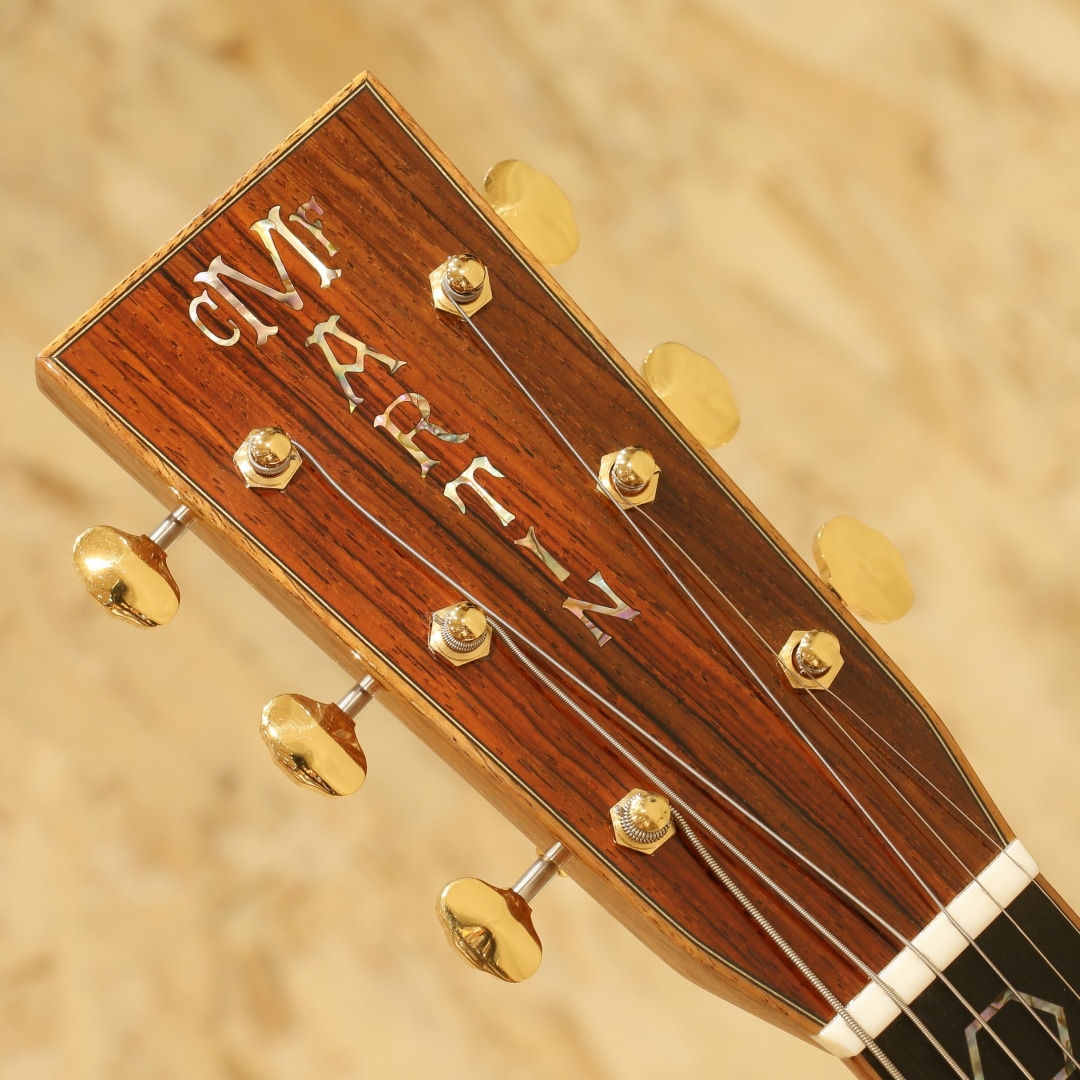 現マーチン工場の中でも、卓越した技術と豊富な経験から至極のギターを造り出す"Martin Custom Shop"。レギュラーラインの製造箇所とは全く違った、工場の一角で昔ながらの工法や製造方法で製作を行うカスタムショップ。スペックも含めレギュラーラインとは一線を画す仕上がりを誇ります。ここ数年一際話題を集めるオーセンティックシリーズの製作をはじめ、高い完成度を誇るこだわりのカスタムモデルを製造するトップクラスの部門です。本器はマーチンファクトリーツアーの際に弊社スタッフにて材選定とオーダーが行われた”CTM D-45”。プレミアムグレードアディロンダックスプルーストップ、プレミアムグレードココボロサイド&バック、ジェニュインマホガニーネック、黒々としたブラックエボニー指板&ブリッジ、42.9mmナット幅、モディファイドロウオーバルネックシェイプ、ドロップインサドル、内部をくりぬいた形状のヘキサゴンアバロン(HEX BORDER)指板ポジション、ウェバリー4060Gペグ、ベッコウ柄ピックガード、フレイム杢の入ったコア材を使用したボディ&指板&ヘッドバインディング、同じくフレイム杢の入ったコア材のエンドピース、アバロントリム、2wayアジャスタブルロッド、アディロンダックスプルースを使用したリアシフテッドスキャロップドXブレイシング。マーチンラインナップの中でも最高峰に位置するスタイル45。最高グレードの材、非常に手の込んだアバロンの装飾とアバロンもセレクトされたモノを使用、どの時代においても永遠の憧れとして君臨し続けているギターです。その歴史はカントリーシンガー、ジーンオートリーのオーダーによって作られた1933年製の1本から始まりました。1942年まで製作が行われ戦争の為に製作が中止、合計して91本のみ作られた戦前のオリジナルD-45は市場でも見ることはなく非常に珍しいことでも有名です。その後1968年にD-45は復活し時代ごとに仕様変更を行いつつ、どの時代においても共通して45独特のサウンドを響かせ続けています。本器の仕様は1938年後半から1957年まで採用されたリアシフテッドスキャロップドXブレイシングをベースにモダンな仕様をふんだんに取り入れたスペックとなっています。締まりのある粒立ちの良くバランスの整った響き、1本線の通った凛とする音色です。アディロントップとすることでファットで空気感を含んだトーンを獲得し、ココボロの重量感のあるレンジ広い響き。空気をを含んだ艶やかなトーン、そしてふくよかに広がる音色。複雑に絡み合う倍音成分による豊かな響きは45特有の音色、この響きに魅せられた人は数知れず。幻想的かつ繊細なトーン、必聴と言えるクオリティを誇るカスタムD-45。現代マーチン最高峰の部門での製作、最高峰のモデル、最高級の材を使用し作り上げた手落ち無しの1本。是非ご体感下さいませ。