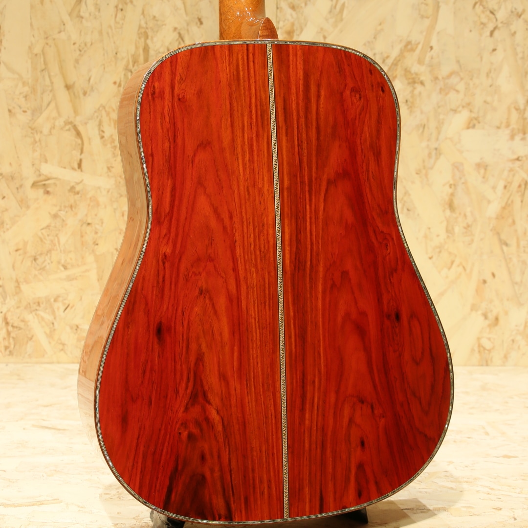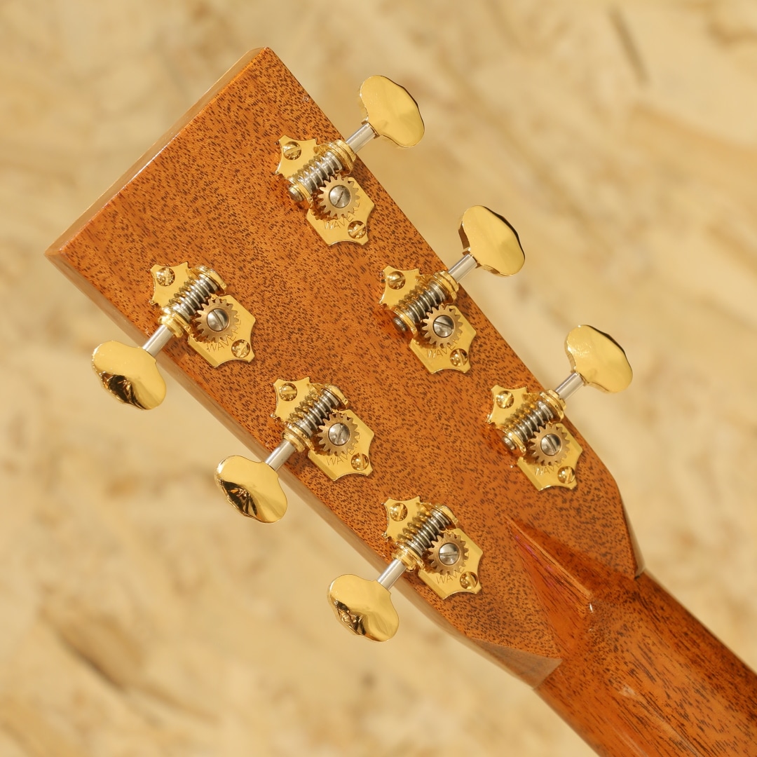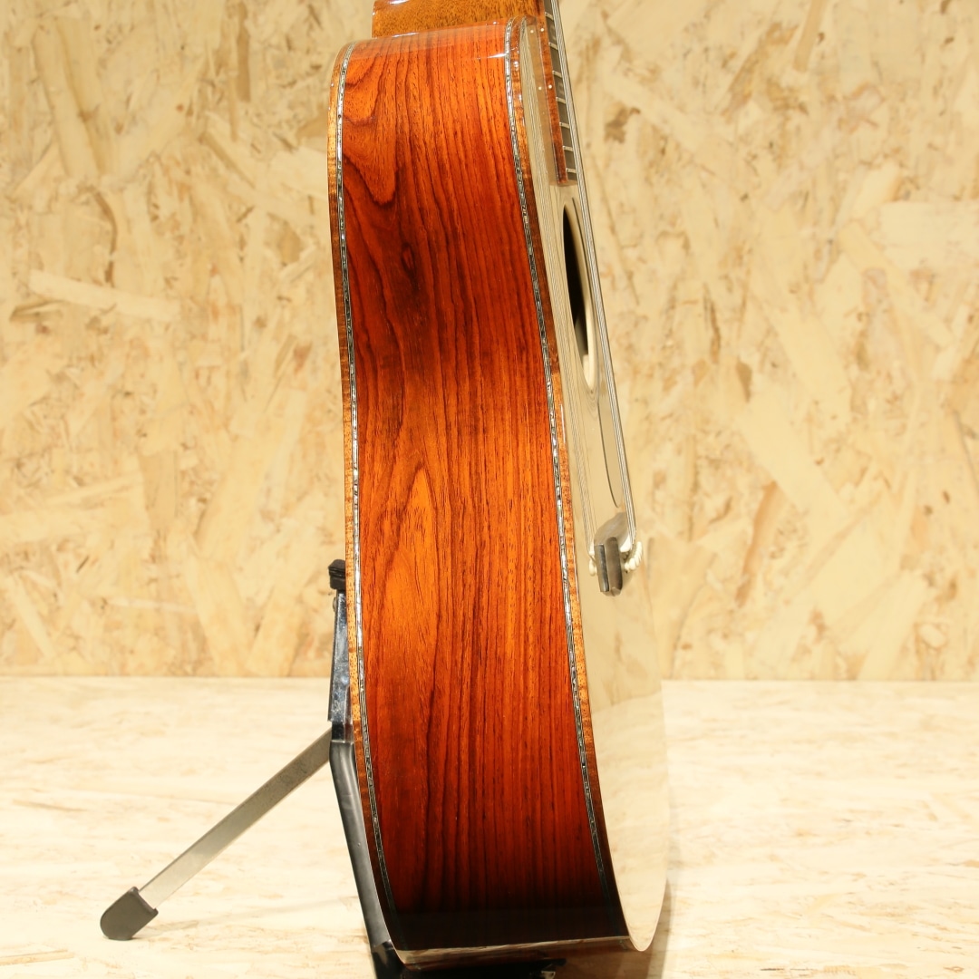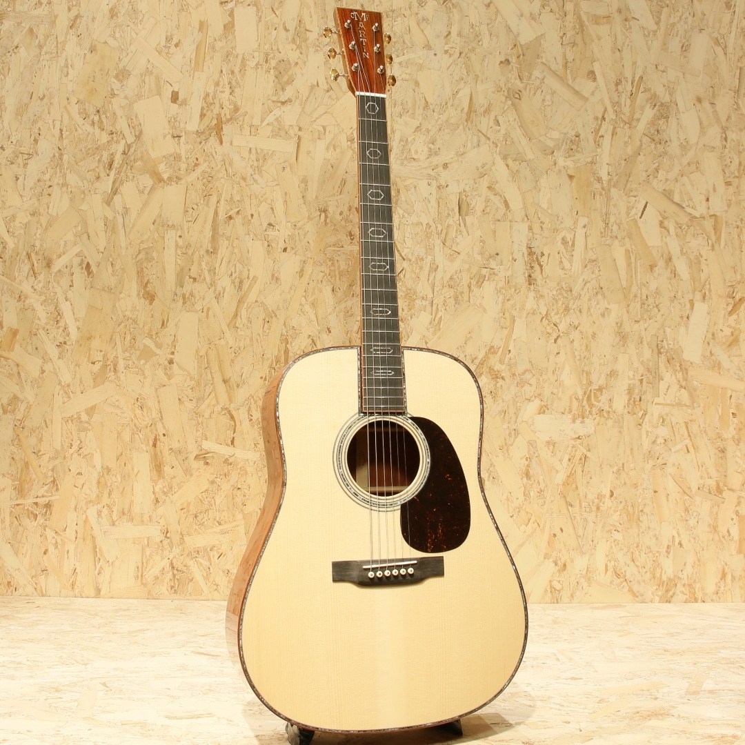 現マーチン工場の中でも、卓越した技術と豊富な経験から至極のギターを造り出す"Martin Custom Shop"。レギュラーラインの製造箇所とは全く違った、工場の一角で昔ながらの工法や製造方法で製作を行うカスタムショップ。スペックも含めレギュラーラインとは一線を画す仕上がりを誇ります。ここ数年一際話題を集めるオーセンティックシリーズの製作をはじめ、高い完成度を誇るこだわりのカスタムモデルを製造するトップクラスの部門です。本器はマーチンファクトリーツアーの際に弊社スタッフにて材選定とオーダーが行われた”CTM D-45”。プレミアムグレードアディロンダックスプルーストップ、プレミアムグレードココボロサイド&バック、ジェニュインマホガニーネック、黒々としたブラックエボニー指板&ブリッジ、42.9mmナット幅、モディファイドロウオーバルネックシェイプ、ドロップインサドル、内部をくりぬいた形状のヘキサゴンアバロン(HEX BORDER)指板ポジション、ウェバリー4060Gペグ、ベッコウ柄ピックガード、フレイム杢の入ったコア材を使用したボディ&指板&ヘッドバインディング、同じくフレイム杢の入ったコア材のエンドピース、アバロントリム、2wayアジャスタブルロッド、アディロンダックスプルースを使用したリアシフテッドスキャロップドXブレイシング。マーチンラインナップの中でも最高峰に位置するスタイル45。最高グレードの材、非常に手の込んだアバロンの装飾とアバロンもセレクトされたモノを使用、どの時代においても永遠の憧れとして君臨し続けているギターです。その歴史はカントリーシンガー、ジーンオートリーのオーダーによって作られた1933年製の1本から始まりました。1942年まで製作が行われ戦争の為に製作が中止、合計して91本のみ作られた戦前のオリジナルD-45は市場でも見ることはなく非常に珍しいことでも有名です。その後1968年にD-45は復活し時代ごとに仕様変更を行いつつ、どの時代においても共通して45独特のサウンドを響かせ続けています。本器の仕様は1938年後半から1957年まで採用されたリアシフテッドスキャロップドXブレイシングをベースにモダンな仕様をふんだんに取り入れたスペックとなっています。締まりのある粒立ちの良くバランスの整った響き、1本線の通った凛とする音色です。アディロントップとすることでファットで空気感を含んだトーンを獲得し、ココボロの重量感のあるレンジ広い響き。空気をを含んだ艶やかなトーン、そしてふくよかに広がる音色。複雑に絡み合う倍音成分による豊かな響きは45特有の音色、この響きに魅せられた人は数知れず。幻想的かつ繊細なトーン、必聴と言えるクオリティを誇るカスタムD-45。現代マーチン最高峰の部門での製作、最高峰のモデル、最高級の材を使用し作り上げた手落ち無しの1本。是非ご体感下さいませ。