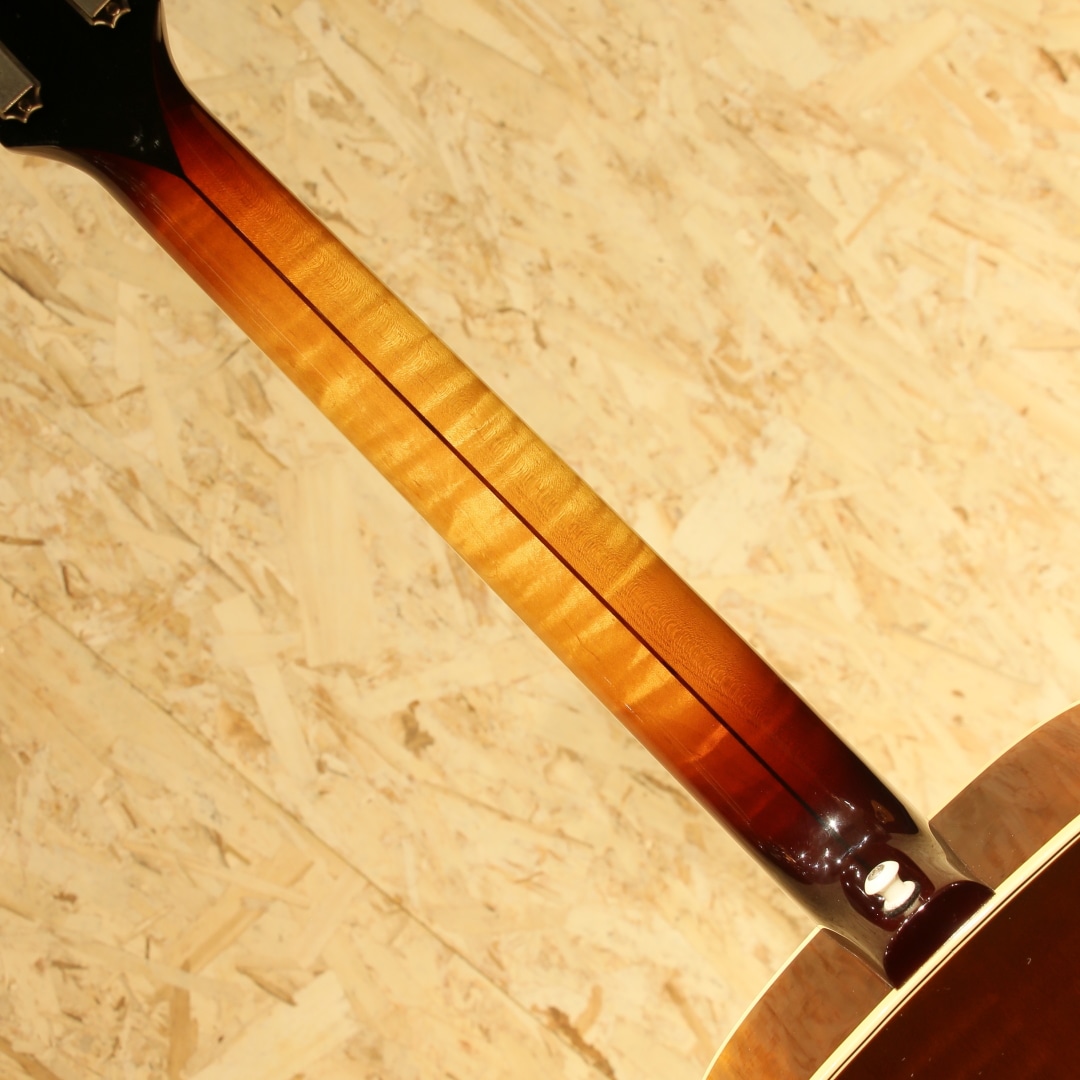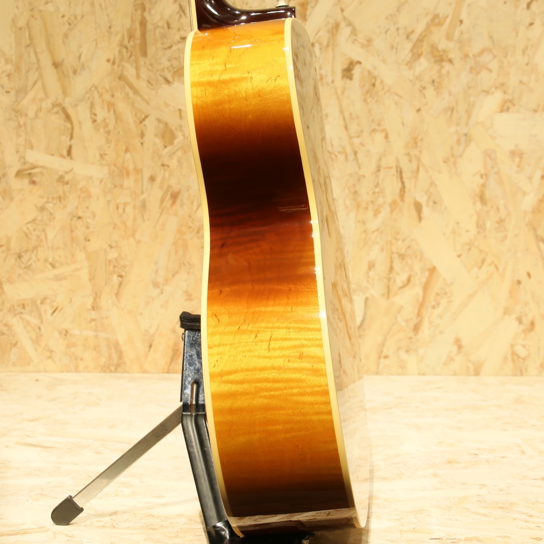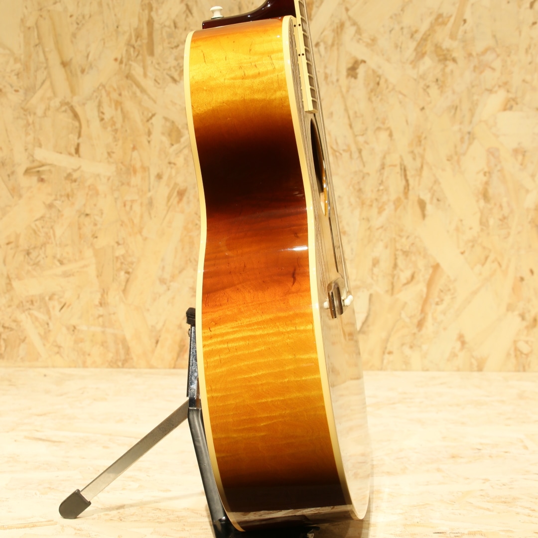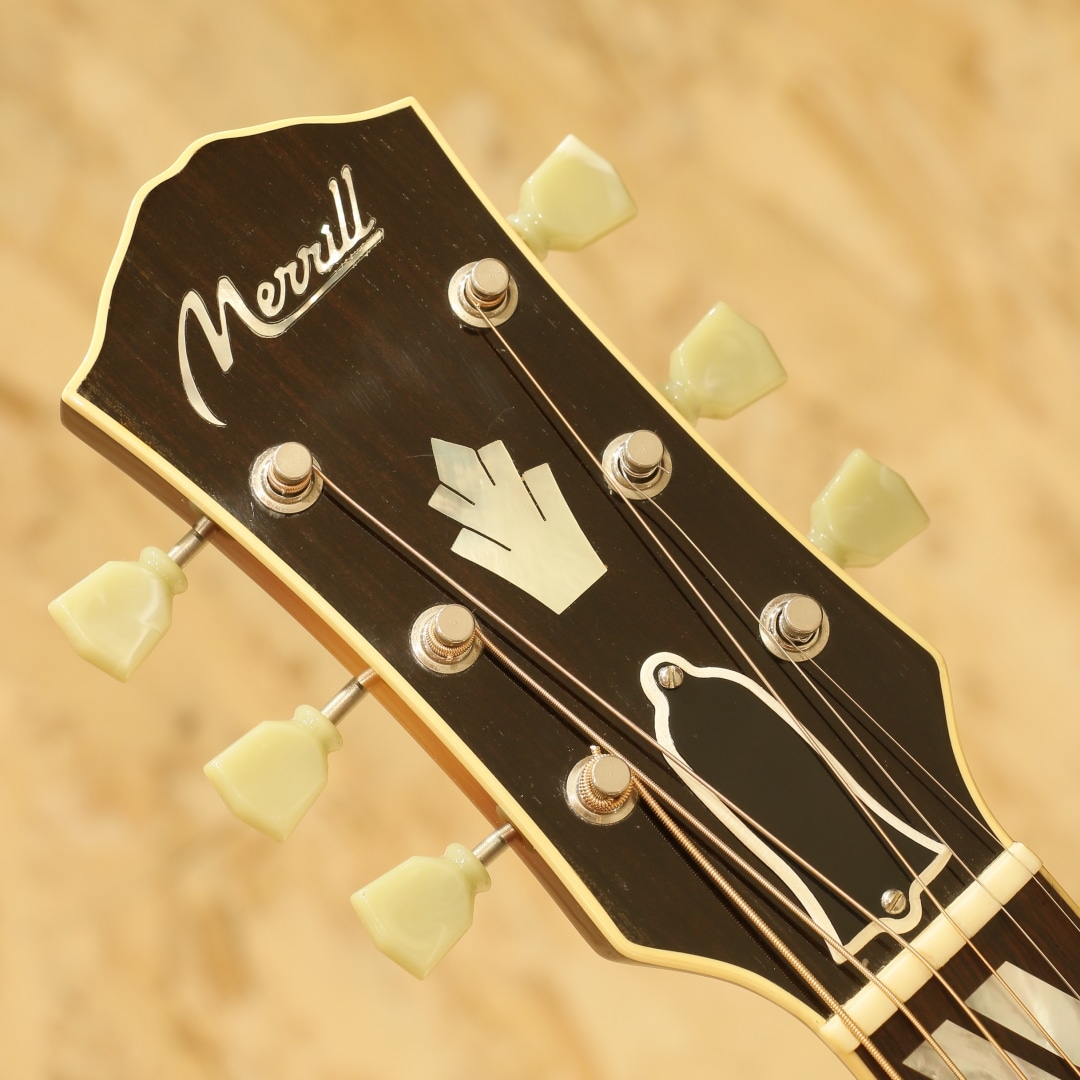 アメリカ、バージニア州にて製作される”Merrill”。ジム・メリルは1981年からリペアショップでリペア業に従事し、1983年に初めてギターを製作。それ以降も合間を縫って製作を続け2000年には自身のブランドを立ち上げ現在でも製作を行っています。そのリペアで培った知識を持ってプリウォーマーチンの再現モデルを製作、プリウォーマーチンレプリカの分野において人気を博し、ブルーグラス系ミュージシャンを筆頭に米国を中心に高い支持を得ています。近年は日本への入荷もほおぼなく、流通が少なくなってきており入手が難しくなってきました。本器は2007年製のUSED品。ほぼ見かける事のないギブソンタイプ、ヴィンテージ市場でも大変高価を極めるType J-185スタイルです。アディロンダックスプルーストップ、メイプルサイド&バック、メイプルネック、ローズウッド指板&ブリッジ、ロングサドル、ダブルパラレルグラム指板インレイ、白黒白セルトリム&バインディング、べっ甲柄ラージピックガード、ヘッドプレートにはクラウンシェルインレイ、クロスモチーフのブリッジシェルインレイ、スキャロップドXブレイシング。プリウォースタイルの再現度高く作られることで評価の高いジム・メリル。J-185の製造は本器以外にほぼ確認されておらず大変希少な一本と言えます。メリル特有の繊細さも併せ持った中低域にアクセントのあるコンプ感のある立ち上がり、メイプルスペックならではの粘り感のある音像はマーティンスペックのメリルとは全く違うアプローチのもので楽しめます。高域は曇りがなく、しっかりとした押し出し感もあり、メリルが作るJ-185、なるほどと納得感があります。ネックヒールにはWAVERLY製のストラップピンマウント、2007年の作品ですが、使用感はかなり薄い素晴らしいコンディションの個体でラッカーが故の塗装の引けや細かい擦り傷が見られる程度、極上のフィニッシュコンディションです。ネックの状態も良好でセットアップも大変弾きやすく調整されています。アメリカ国内でも人気が高く、本器のようなコレクタブルな一品は国内のメリルファンのみならず、海外のメイルファンからも放っておかれない一品でしょう。買い逃せばまたと手に入れるチャンスはないのでしょうか。ぜひお早めに。ハードケース付属。