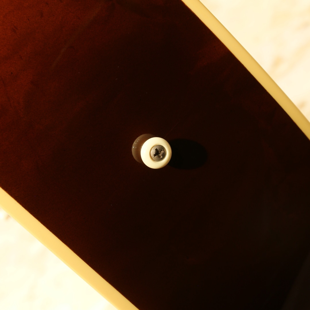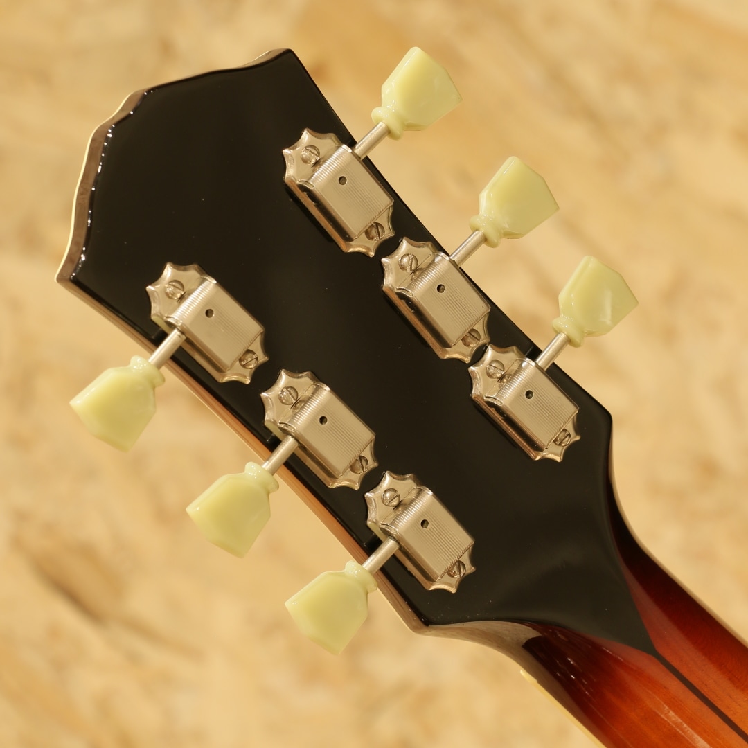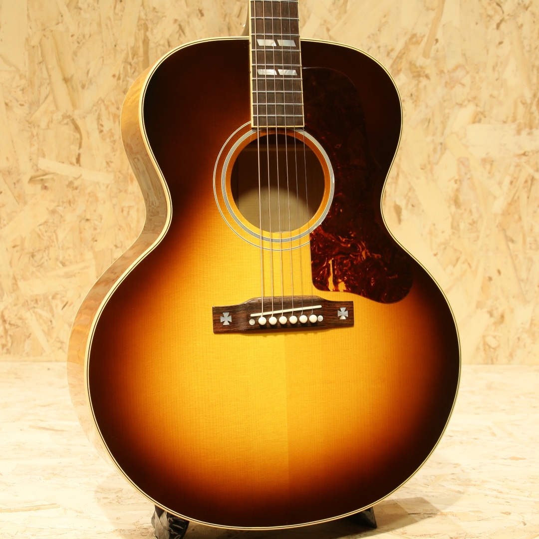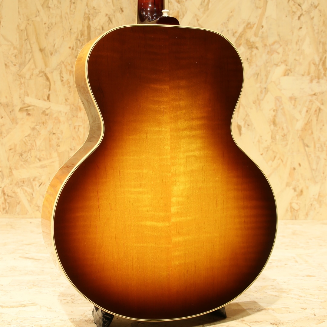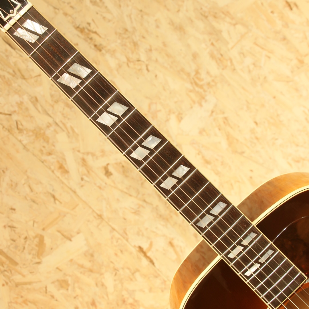 アメリカ、バージニア州にて製作される”Merrill”。ジム・メリルは1981年からリペアショップでリペア業に従事し、1983年に初めてギターを製作。それ以降も合間を縫って製作を続け2000年には自身のブランドを立ち上げ現在でも製作を行っています。そのリペアで培った知識を持ってプリウォーマーチンの再現モデルを製作、プリウォーマーチンレプリカの分野において人気を博し、ブルーグラス系ミュージシャンを筆頭に米国を中心に高い支持を得ています。近年は日本への入荷もほおぼなく、流通が少なくなってきており入手が難しくなってきました。本器は2007年製のUSED品。ほぼ見かける事のないギブソンタイプ、ヴィンテージ市場でも大変高価を極めるType J-185スタイルです。アディロンダックスプルーストップ、メイプルサイド&バック、メイプルネック、ローズウッド指板&ブリッジ、ロングサドル、ダブルパラレルグラム指板インレイ、白黒白セルトリム&バインディング、べっ甲柄ラージピックガード、ヘッドプレートにはクラウンシェルインレイ、クロスモチーフのブリッジシェルインレイ、スキャロップドXブレイシング。プリウォースタイルの再現度高く作られることで評価の高いジム・メリル。J-185の製造は本器以外にほぼ確認されておらず大変希少な一本と言えます。メリル特有の繊細さも併せ持った中低域にアクセントのあるコンプ感のある立ち上がり、メイプルスペックならではの粘り感のある音像はマーティンスペックのメリルとは全く違うアプローチのもので楽しめます。高域は曇りがなく、しっかりとした押し出し感もあり、メリルが作るJ-185、なるほどと納得感があります。ネックヒールにはWAVERLY製のストラップピンマウント、2007年の作品ですが、使用感はかなり薄い素晴らしいコンディションの個体でラッカーが故の塗装の引けや細かい擦り傷が見られる程度、極上のフィニッシュコンディションです。ネックの状態も良好でセットアップも大変弾きやすく調整されています。アメリカ国内でも人気が高く、本器のようなコレクタブルな一品は国内のメリルファンのみならず、海外のメイルファンからも放っておかれない一品でしょう。買い逃せばまたと手に入れるチャンスはないのでしょうか。ぜひお早めに。ハードケース付属。