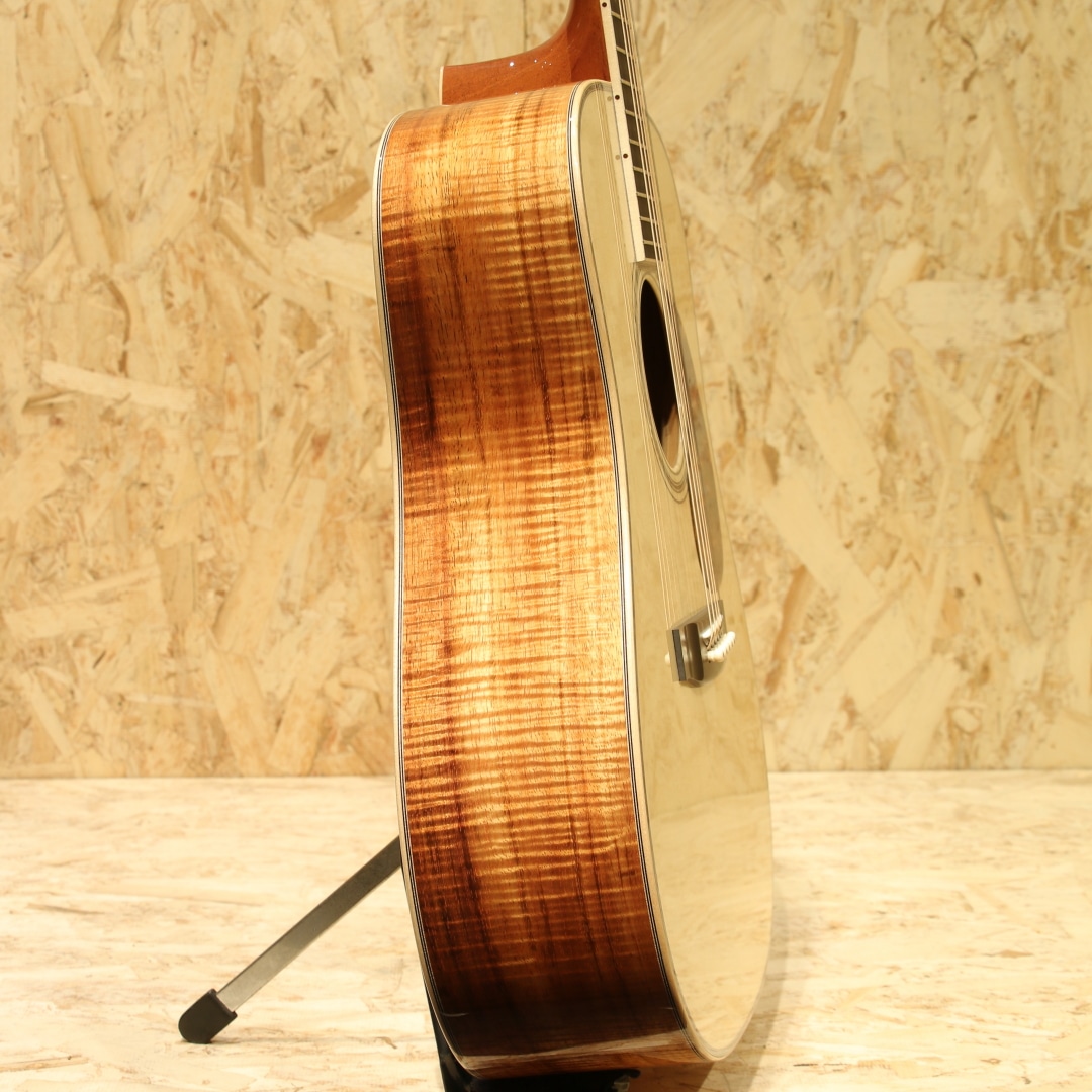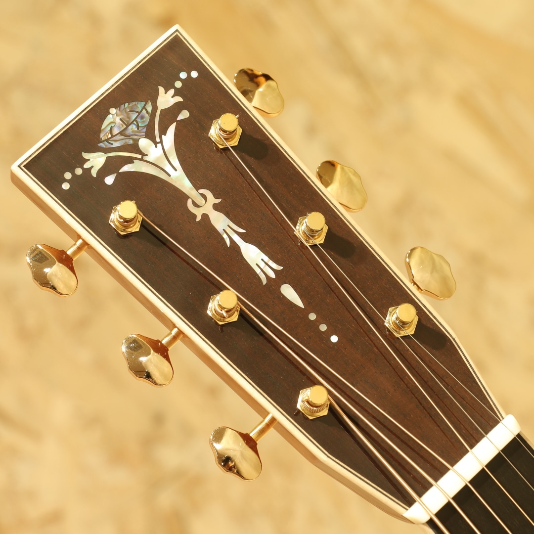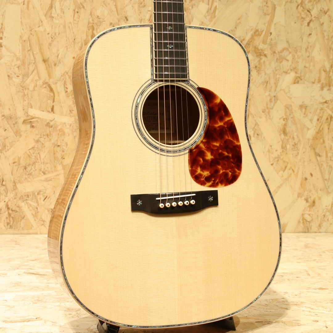 1962年より福岡久留米にてギター製造を行う老舗純国産ギターブランド、アストリアスギター。現在もベテランを中心とした約15名のスタッフで運営しています。本器は弊社スタッフが久留米の工房にて現地材選定を行ったカスタムオーダー品。同ブランドのハイエンドモデル"D.EMBLEM"をベースに材木やピックガードなどのパーツまでハンドピックし厳選された部材で作り上げられた1本です。艶肌美しいジャーマンスプルーストップ、通常ラインナップにはない極上フィギャード杢に惹かれるサップ入りコアサイド&バックに使用。マホガニーネック、エボニー指板&ブリッジ、ゴトー製オープンゴールドペグ、アバロントーチインレイ/スノーフレイク指板インレイ、アバロンパーフリング&ロゼッタ、メイプルヘッド/ネック/ボディバインディング、ダイヤモンドヴォルート、トーティスピックガード、ノンスキャロップドXブレーシング、オールラッカー仕上げ。Dサイズが持つ深みのある中低音の相性は良く、アストリアスらしい繊細で華麗なトーン、サウンドバランスに優れた本器。レギュラーには無いフィギャード杢の美しいコアS&B仕様、外観の絢爛さはもちろん、またサウンドにも唸るものがあります。ジャーマントップならではの輪郭と粒立ちの良い出音で、コアの持つ高音の倍音感や中低音のふくよかさと相まって重たすぎないローミッドの奥行きとクリアさのあるサウンドになっています。43mmナット幅、細めで丸みのあるVシェイプネックとなっており、ネック形状に悩まれている方にはオススメの握りやすい形状です。ナット幅の恩恵もあり、和音の音粒がしっかり聞こえながら、決してばらけずまとまりのあるストロークサウンドです。ハイエンドモデルから更なるグレードアップが施されたカスタムモデル。レギュラーモデルとは一線を画したそのルックス、サウンドを是非お手元でご体感ください。持ち運びや保管に適したスーパーライトケースが付属します。