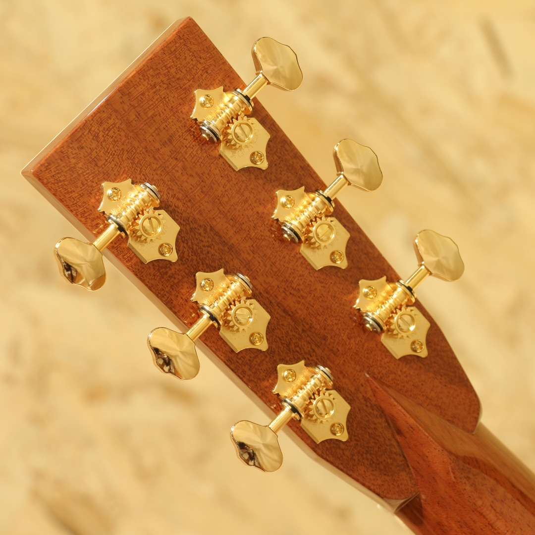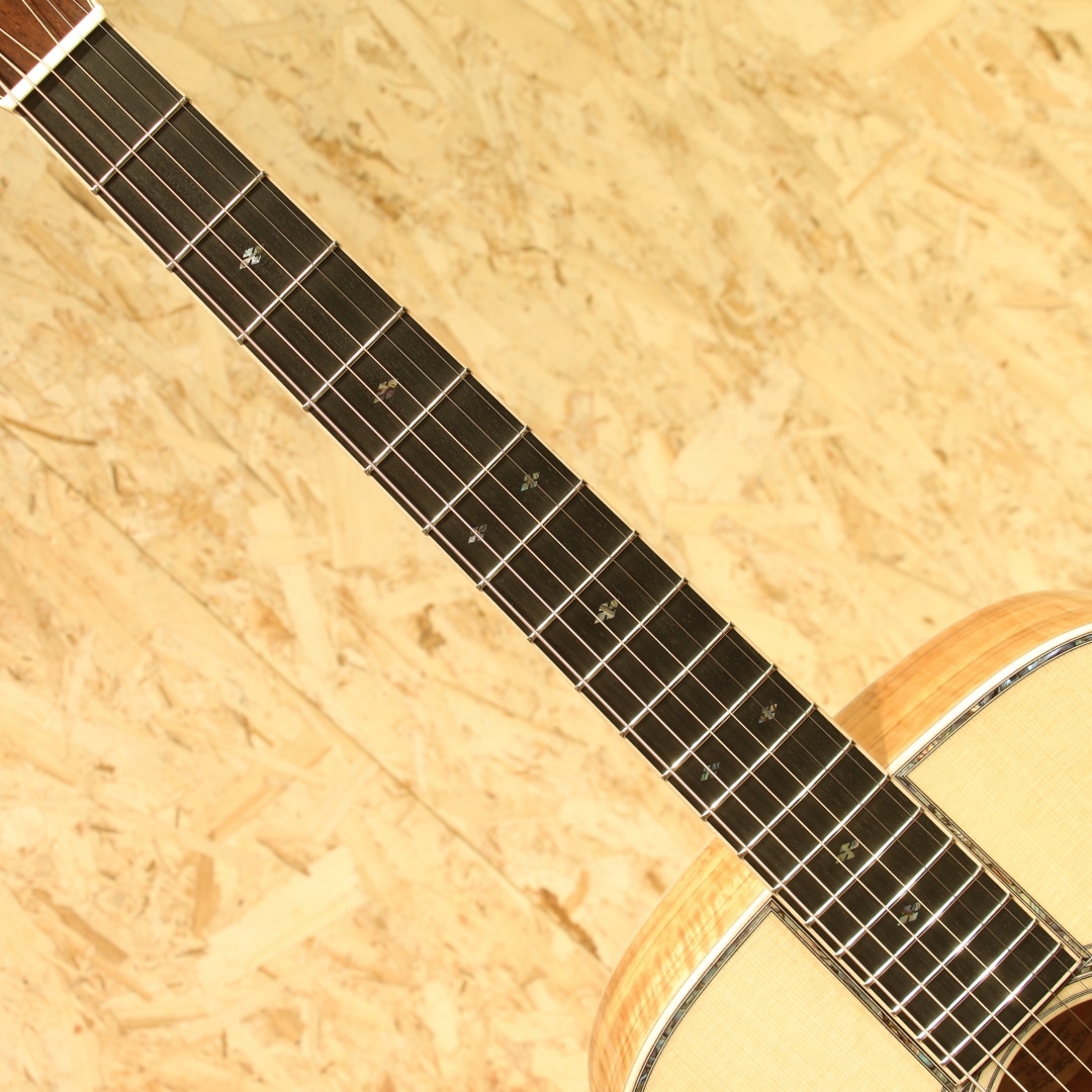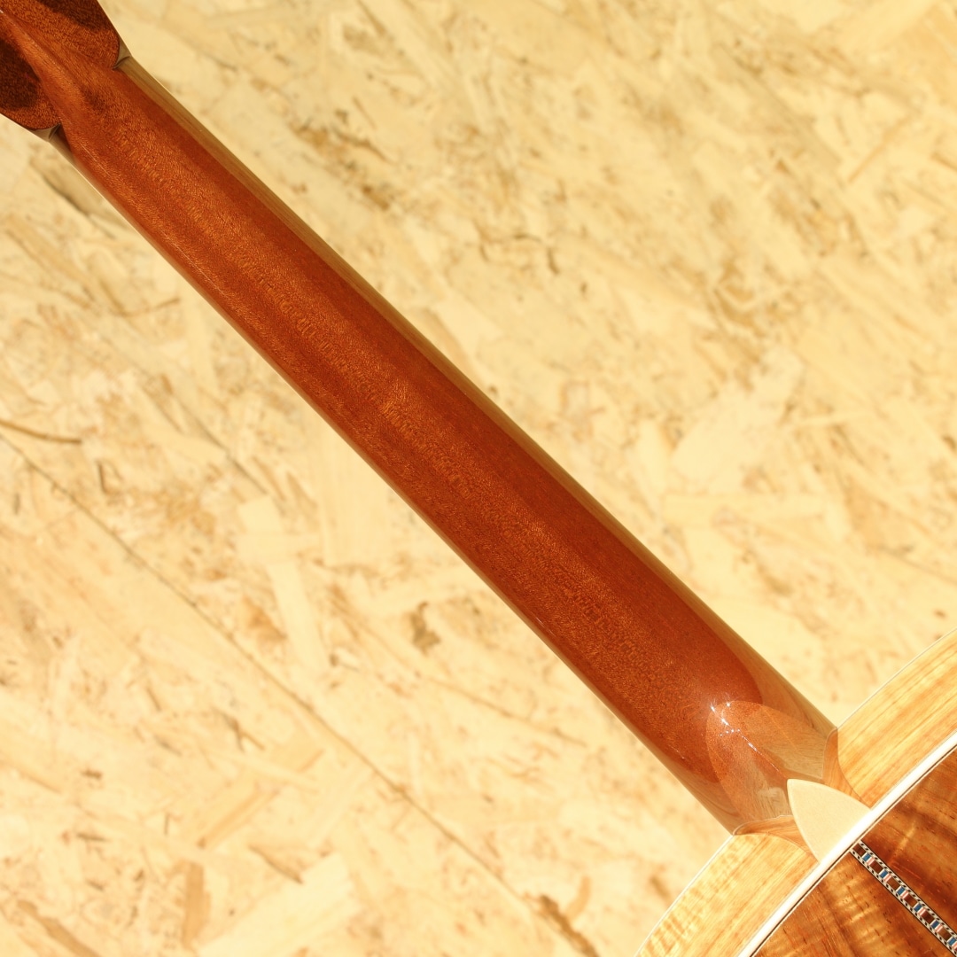 1962年より福岡久留米にてギター製造を行う老舗純国産ギターブランド、アストリアスギター。現在もベテランを中心とした約15名のスタッフで運営しています。本器は弊社スタッフが久留米の工房にて現地材選定を行ったカスタムオーダー品。同ブランドのハイエンドモデル"D.EMBLEM"をベースに材木やピックガードなどのパーツまでハンドピックし厳選された部材で作り上げられた1本です。艶肌美しいジャーマンスプルーストップ、通常ラインナップにはない極上フィギャード杢に惹かれるサップ入りコアサイド&バックに使用。マホガニーネック、エボニー指板&ブリッジ、ゴトー製オープンゴールドペグ、アバロントーチインレイ/スノーフレイク指板インレイ、アバロンパーフリング&ロゼッタ、メイプルヘッド/ネック/ボディバインディング、ダイヤモンドヴォルート、トーティスピックガード、ノンスキャロップドXブレーシング、オールラッカー仕上げ。Dサイズが持つ深みのある中低音の相性は良く、アストリアスらしい繊細で華麗なトーン、サウンドバランスに優れた本器。レギュラーには無いフィギャード杢の美しいコアS&B仕様、外観の絢爛さはもちろん、またサウンドにも唸るものがあります。ジャーマントップならではの輪郭と粒立ちの良い出音で、コアの持つ高音の倍音感や中低音のふくよかさと相まって重たすぎないローミッドの奥行きとクリアさのあるサウンドになっています。43mmナット幅、細めで丸みのあるVシェイプネックとなっており、ネック形状に悩まれている方にはオススメの握りやすい形状です。ナット幅の恩恵もあり、和音の音粒がしっかり聞こえながら、決してばらけずまとまりのあるストロークサウンドです。ハイエンドモデルから更なるグレードアップが施されたカスタムモデル。レギュラーモデルとは一線を画したそのルックス、サウンドを是非お手元でご体感ください。持ち運びや保管に適したスーパーライトケースが付属します。