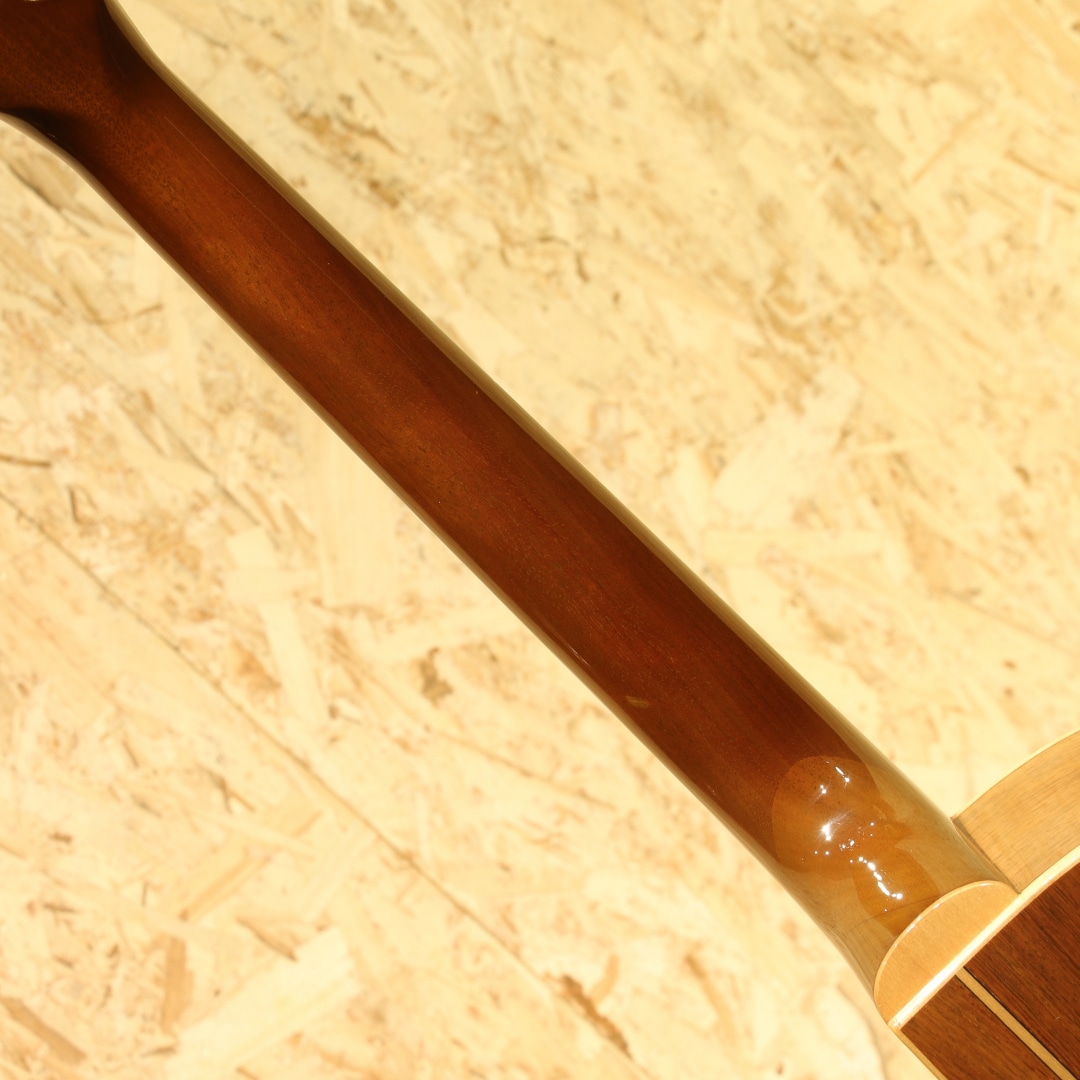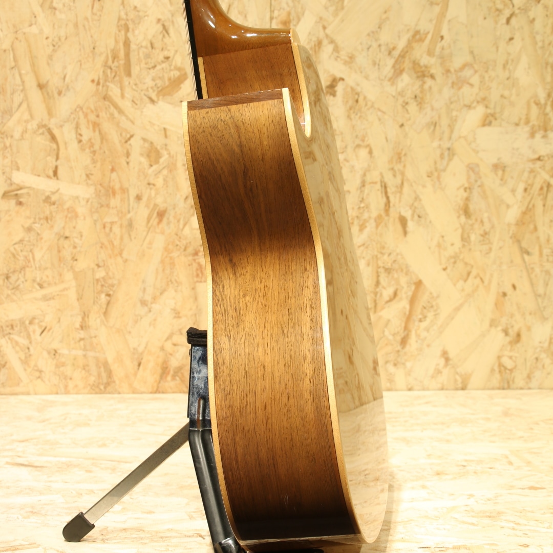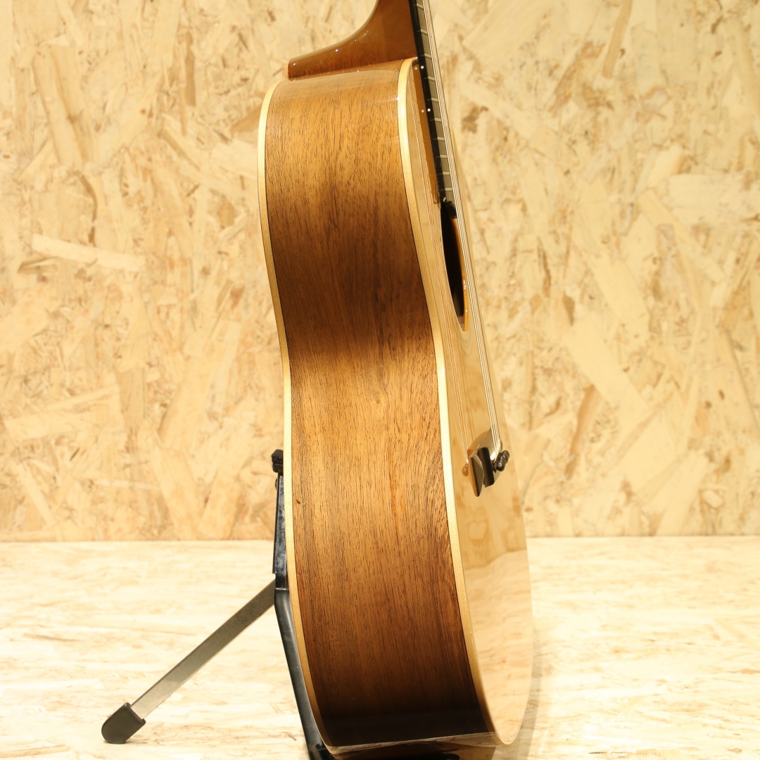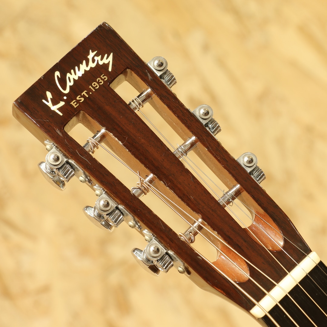 数々の著名ギタリスト、アーティストが愛用している事で知られるK.Country。その昔、海外メーカーのOEMも受け持っていた春日楽器が製造していましたが、フォークブームの停滞とともに一時は生産終了となりました。2000年頃に当時同ブランドの企画や販売に携わっていた今西氏により"K.Country"の名を復興、春日のKから神戸のKへと名を引き継ぎ、その完成度、弾き易さとオリジナリティ溢れるスペックは様々なプレイヤーからの絶大な支持を得ております。本器は神戸発アコースティックギターユニットDEPAPEPEの徳岡氏の使用でも知られるLekシリーズをベースに製作された2011年製のUSED品。スプルーストップ、ホンジュラスローズウッドサイド&バック、マホガニーネック、エボニー指板&ピラミッドブリッジ、ゴトーペグ、スキャロップドXブレイシング、メイプルボディバインディング、深めに作られたフローレンタインカッタウェイ、スロテッドヘッド、22フレットエンド、L.R.Baggs Anthemが搭載。645mmのロングスケール、スロテッドヘッドが持つ独特の弦のテンション感によって主張の強い音を放ち、弱いタッチでも遠くに飛んでいくような優れたレスポンスが特徴。ホンジュラスローズウッドが生み出す重心の低い重厚なトーンと煌びやかな音色。粒立ちも良く、心地よいふくよかな倍音と伸びやかなサスティーンを持ち合わせます。ソロプレイにも対応し易いよう、弦高も低めのセッティングです。44mmナット幅ですがやや細身のCシェイプネックとなっており、幅広さを感じない仕上がりです。ピラミッドブリッジの作り込みやロゼッタデザインなど、精巧な作業がうかがえる芸術品のような美しさも魅力の1つです。L.R Baggs Anthemピックアップシステムが搭載。クッキリとした音像を拾えるピエゾ、そこにボディの空気感を拾えるマイクをブレンド出力できるシステム。任意でマイクのミックス具合を調整でき、ソリッドなピエゾサウンドから空気感のある自然なサウンドまでその場に応じて可変出来るプロユースの優秀なシステムです。ボディサイド&バックの全体的に薄く塗装の白濁が見られます。その他、全体的に擦り傷や打痕など使用感は見られますが割れなどの致命的なものはございません。ネックの状態含め、プレイコンディションも良好。小ぶりでおさまりの良いOMスタイル、ソロギター用のメインとして、軽く爪弾けるサブギターとしてもしっかりと存在感を放ち活躍してくれる1本です。汎用ハードケースが付属します。