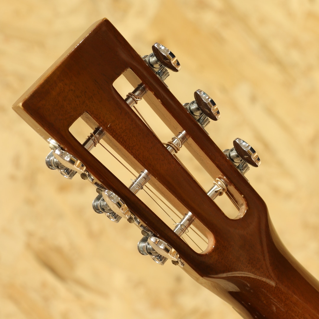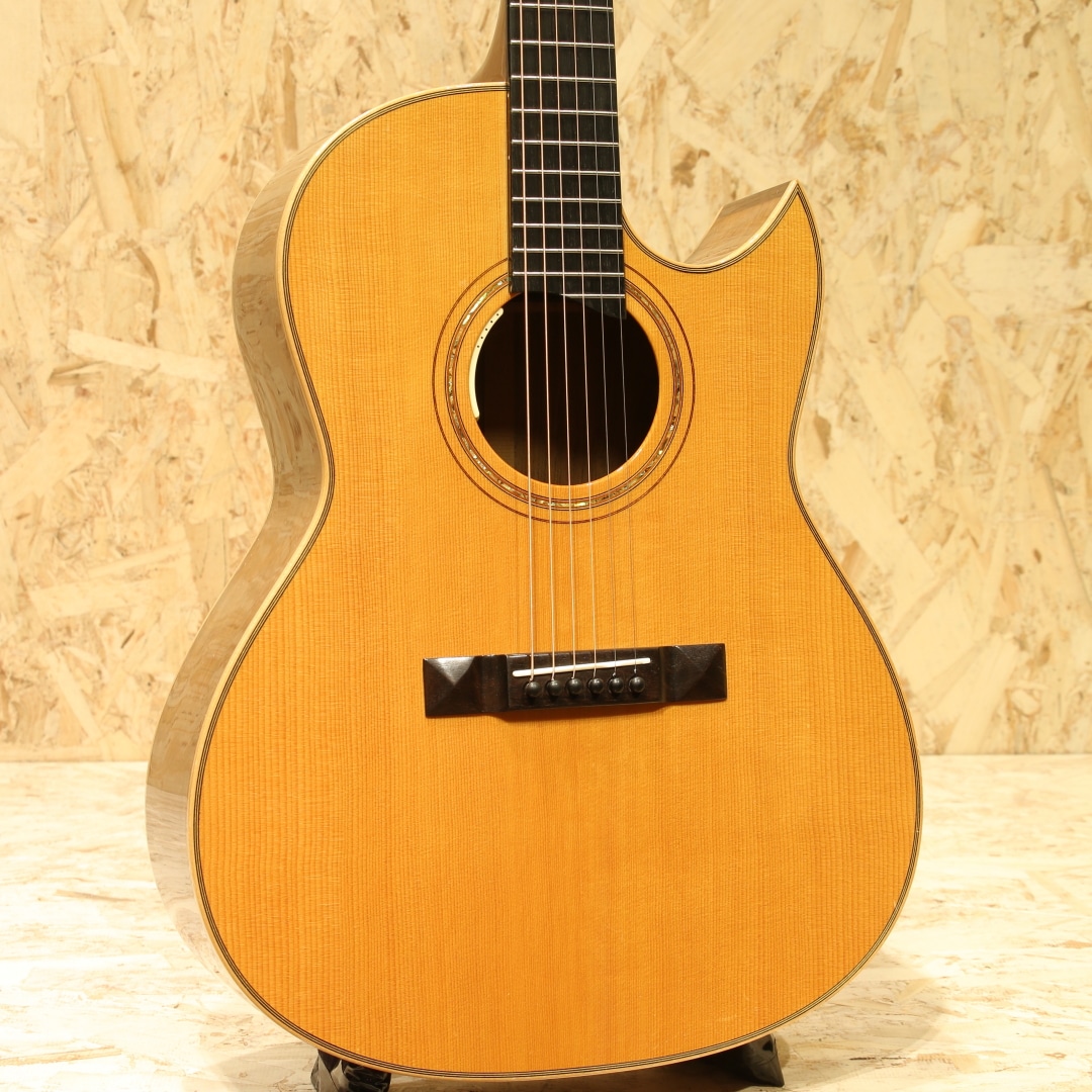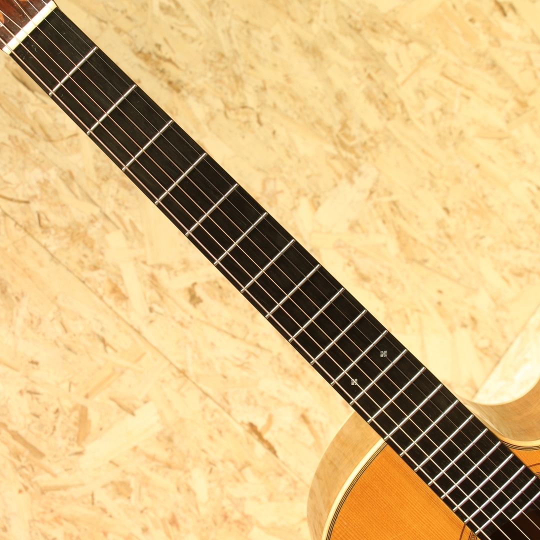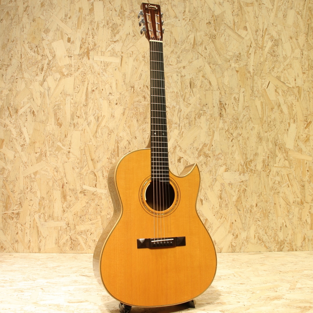 数々の著名ギタリスト、アーティストが愛用している事で知られるK.Country。その昔、海外メーカーのOEMも受け持っていた春日楽器が製造していましたが、フォークブームの停滞とともに一時は生産終了となりました。2000年頃に当時同ブランドの企画や販売に携わっていた今西氏により"K.Country"の名を復興、春日のKから神戸のKへと名を引き継ぎ、その完成度、弾き易さとオリジナリティ溢れるスペックは様々なプレイヤーからの絶大な支持を得ております。本器は神戸発アコースティックギターユニットDEPAPEPEの徳岡氏の使用でも知られるLekシリーズをベースに製作された2011年製のUSED品。スプルーストップ、ホンジュラスローズウッドサイド&バック、マホガニーネック、エボニー指板&ピラミッドブリッジ、ゴトーペグ、スキャロップドXブレイシング、メイプルボディバインディング、深めに作られたフローレンタインカッタウェイ、スロテッドヘッド、22フレットエンド、L.R.Baggs Anthemが搭載。645mmのロングスケール、スロテッドヘッドが持つ独特の弦のテンション感によって主張の強い音を放ち、弱いタッチでも遠くに飛んでいくような優れたレスポンスが特徴。ホンジュラスローズウッドが生み出す重心の低い重厚なトーンと煌びやかな音色。粒立ちも良く、心地よいふくよかな倍音と伸びやかなサスティーンを持ち合わせます。ソロプレイにも対応し易いよう、弦高も低めのセッティングです。44mmナット幅ですがやや細身のCシェイプネックとなっており、幅広さを感じない仕上がりです。ピラミッドブリッジの作り込みやロゼッタデザインなど、精巧な作業がうかがえる芸術品のような美しさも魅力の1つです。L.R Baggs Anthemピックアップシステムが搭載。クッキリとした音像を拾えるピエゾ、そこにボディの空気感を拾えるマイクをブレンド出力できるシステム。任意でマイクのミックス具合を調整でき、ソリッドなピエゾサウンドから空気感のある自然なサウンドまでその場に応じて可変出来るプロユースの優秀なシステムです。ボディサイド&バックの全体的に薄く塗装の白濁が見られます。その他、全体的に擦り傷や打痕など使用感は見られますが割れなどの致命的なものはございません。ネックの状態含め、プレイコンディションも良好。小ぶりでおさまりの良いOMスタイル、ソロギター用のメインとして、軽く爪弾けるサブギターとしてもしっかりと存在感を放ち活躍してくれる1本です。汎用ハードケースが付属します。