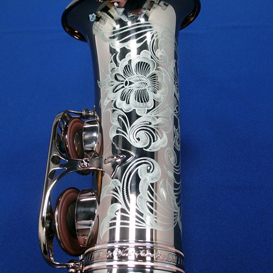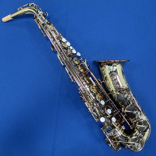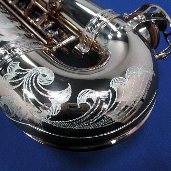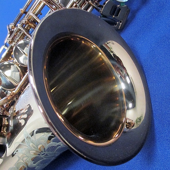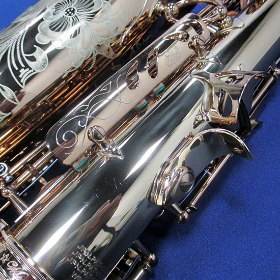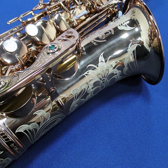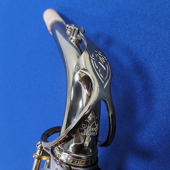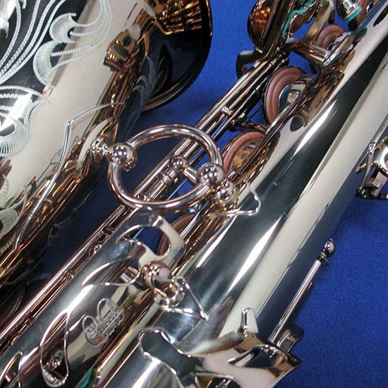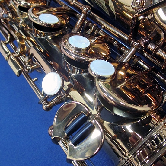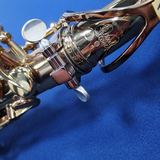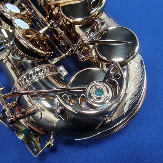 ・現在のサックスは生産性向上や修理時の分解をする為に、通常、接着剤で接合されていますが、ハンダ溶接で接合。ネックから吹き込んだ息をダイレクトにベルまで振動させると共に、振動効率が良くなり、音量も向上させています。
