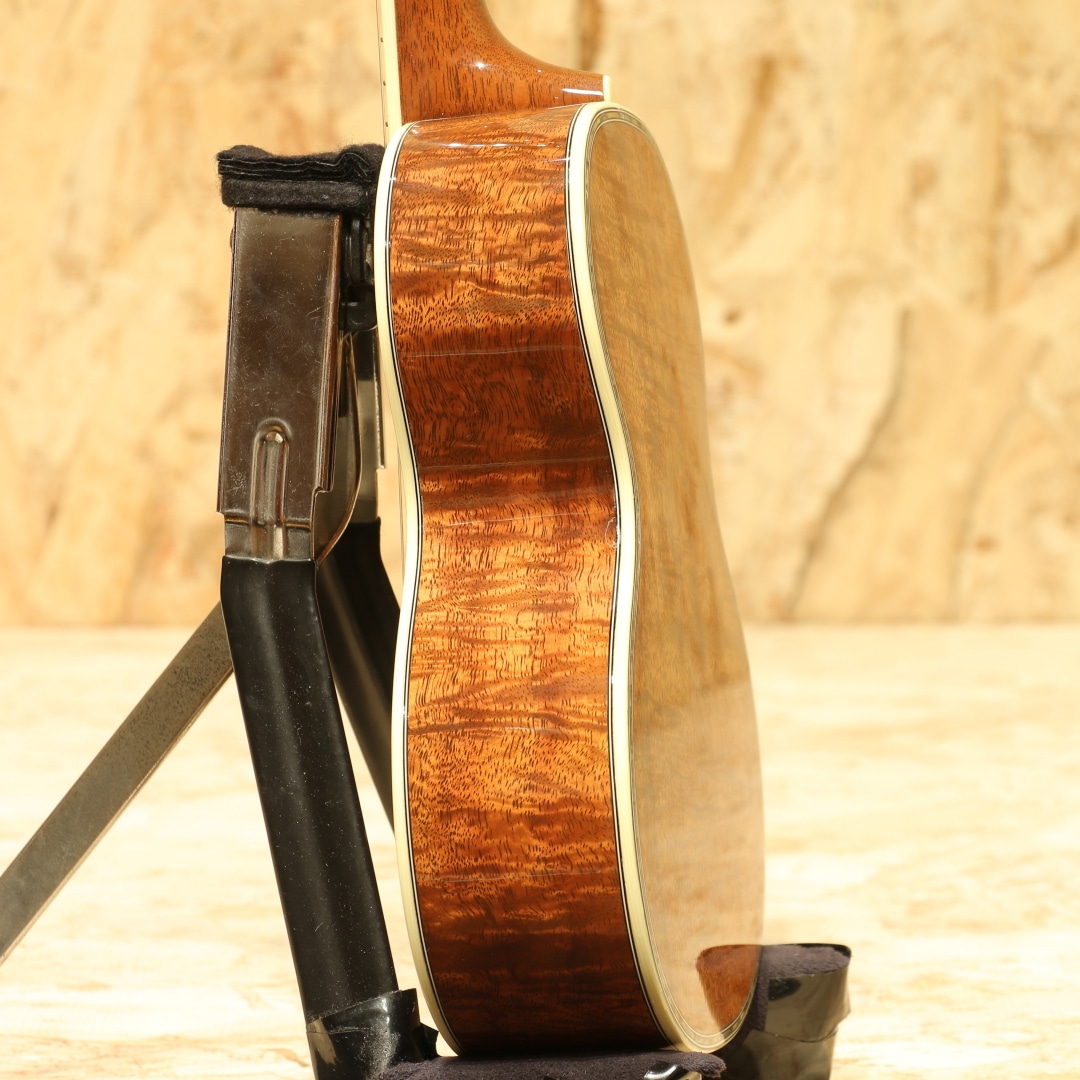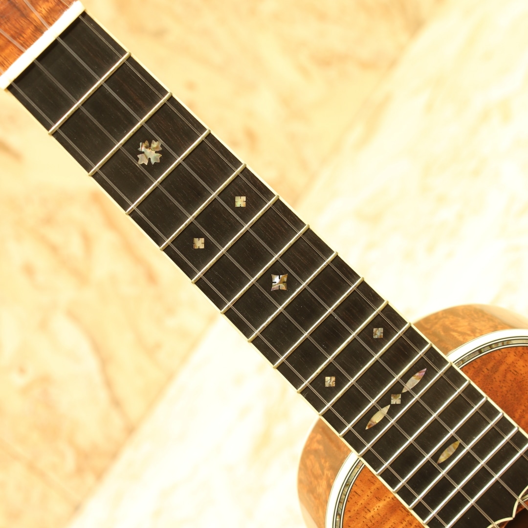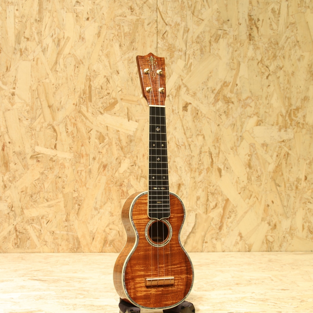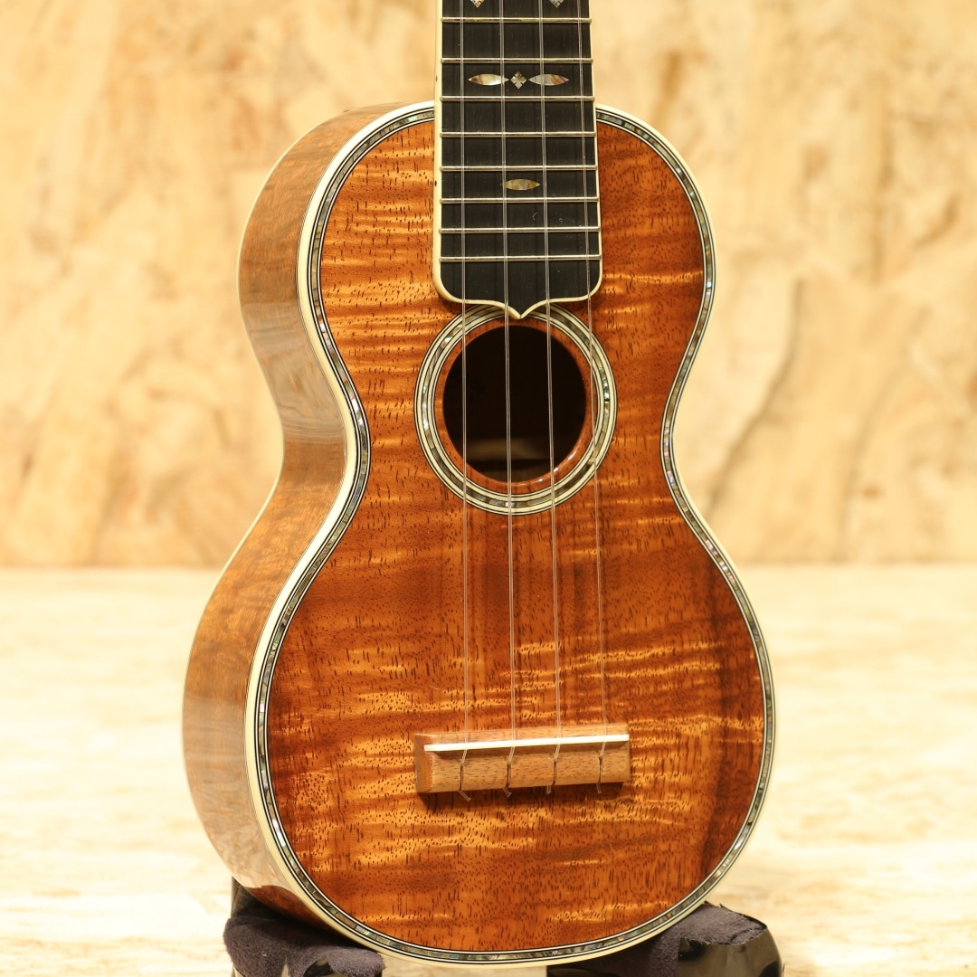 アメリカのギターブランドとして1800年代から製造を開始し、1910年代前半からはウクレレの開発を始め、1918年頃からはウクレレの製造を開始。1916年創業のカマカと肩を並べ、ウクレレにおいても最古参と言えるブランドです。1920年代のハワイアンブームには一世を風靡し、ヴィンテージ市場でも人気を博します。同社ラインナップの中でフラッグシップモデルとして製造されている"5K"モデル。本器はソプラノボディ、2016年製USED品です。カーリー杢が揺らめくコアボディ、エボニー指板、コアブリッジ、アバロントリム&ロゼッタ、トーチヘッドインレイ、アイボロイドバインディング、スノーフレイク&キャッツアイ指板インレイ、オリジナルゴトー製ギアペグアイボロイドつまみ(交換)、ヘッド裏""C.F.Martin&Co.,Nazareth,PA."刻印入り。ネックヒール横ボディバック上部とボディエンドにはゴールドのストラップピンが装着されています。5Kの歴史を遡るとその始まりは1922年。何度か細かい仕様変更を繰り返しましたが、大きな変更はなく1942年には製造中止。それからしばらくの間は製造されることはありませんでしたが、2005年に復刻、現在でもラインナップにフラッグシップとして君臨しているモデルです。音色はマーティンの良さが存分に味わえるもので、はじけるようなソプラノ特有のまとまりの中、溶けるような甘いトーンで各弦がしっかりと分離され素晴らしい音量とバランスで耳元を包んでくれる感覚です。5グレードならではのアバロン装飾、指板のスノーフレイク&キャッツアイインレイはファンシーさを演出。高級さと可愛らしさを同時に持ち、このモデルが最高峰である事を実感させてくれます。ボディバインディングのトップ&バックに剥がれ修正が施されていますが丁寧にリペアされており、若干跡はあるものの使用にも影響はありません。ゴトー製UPTペグへ交換されており、より実用性を高めた1本となっています。製作数が少なく、新品でもなかなか市場には現れない5Kモデル。是非ご検討ください。オリジナルハードケースが付属します。