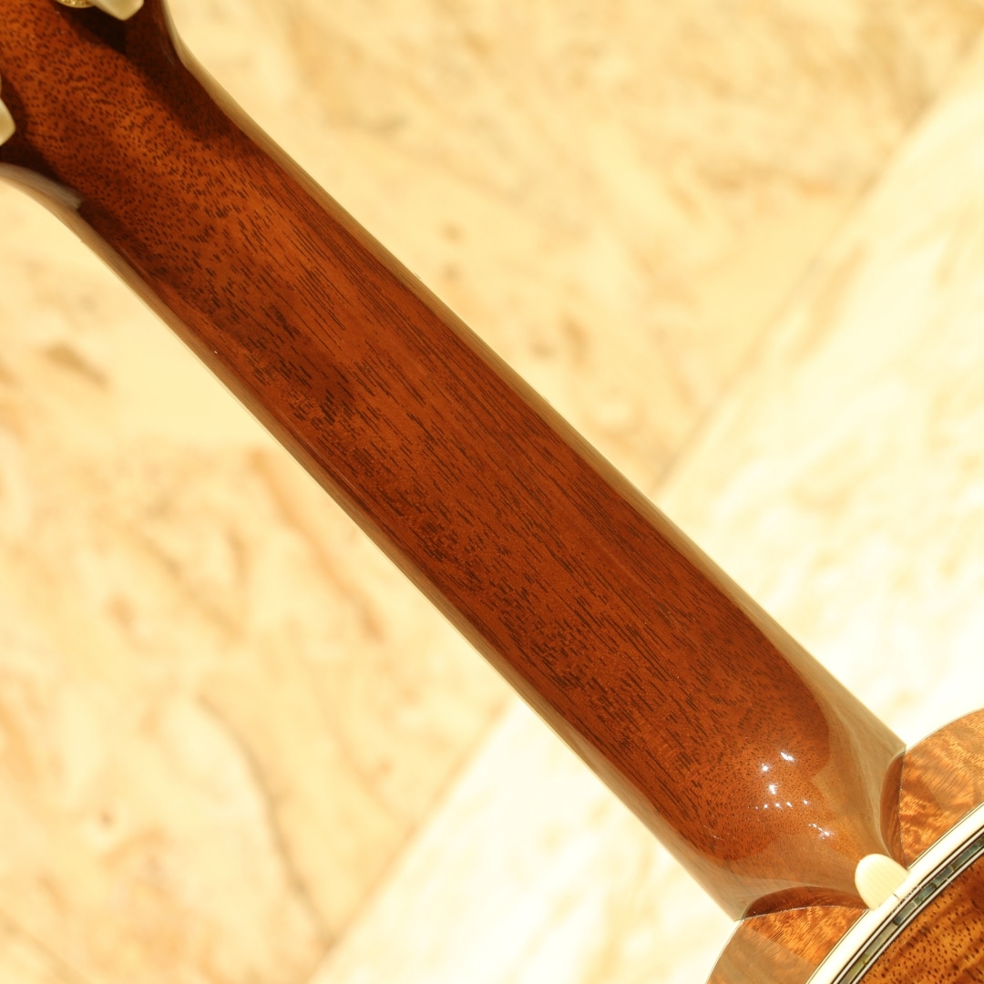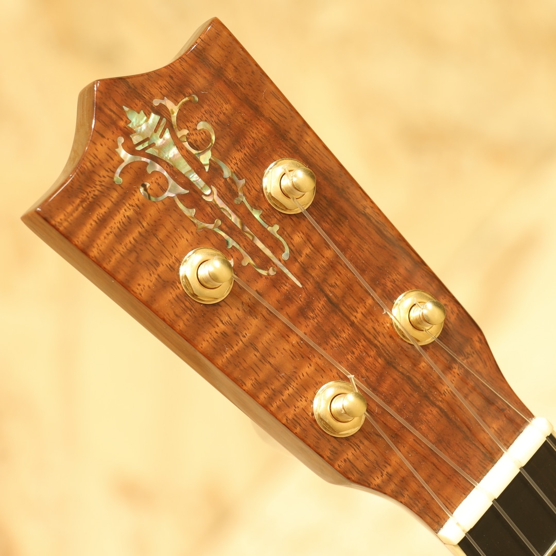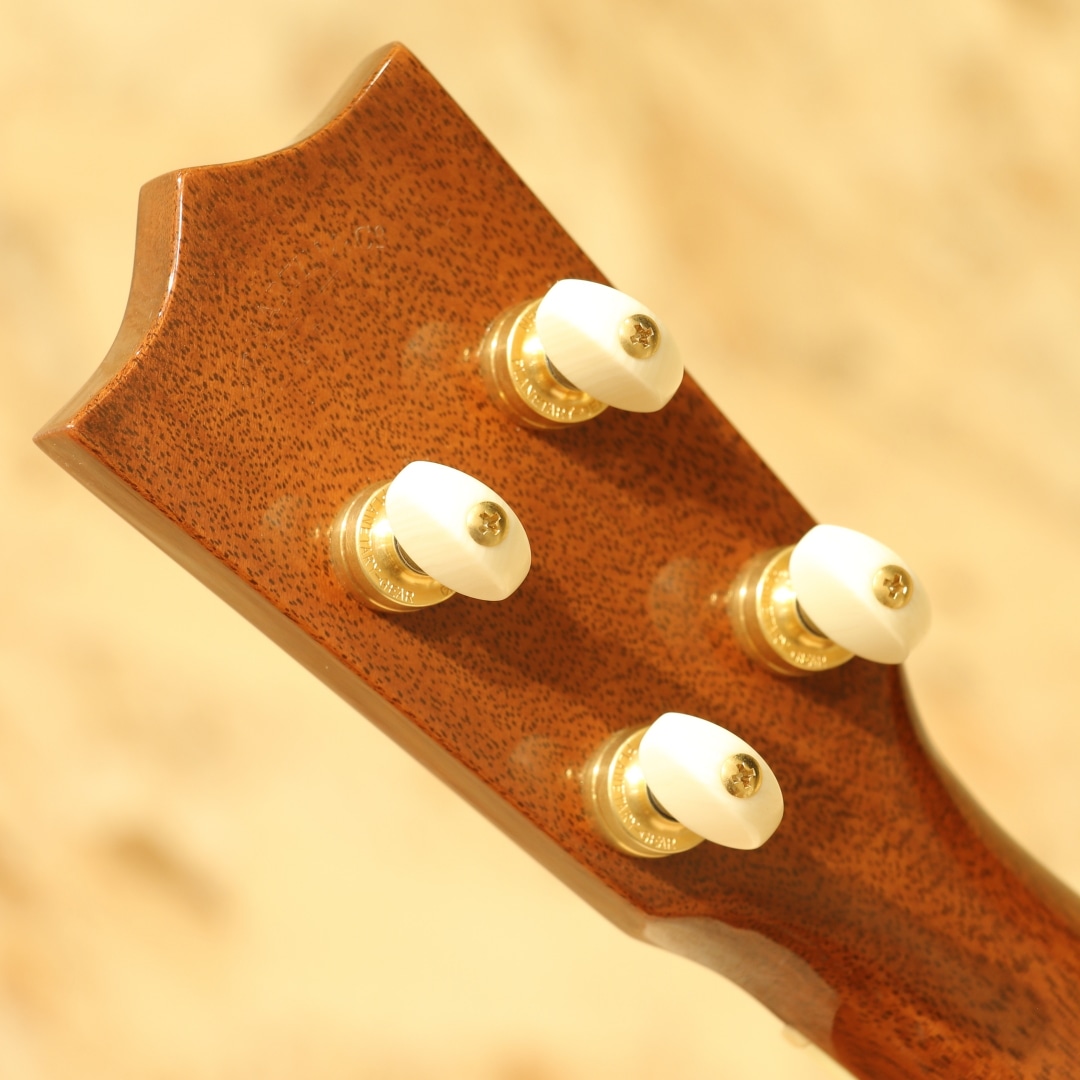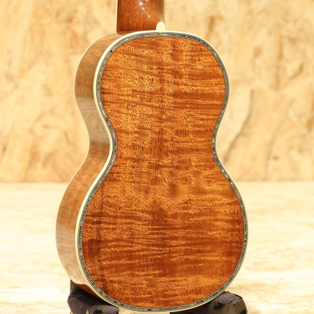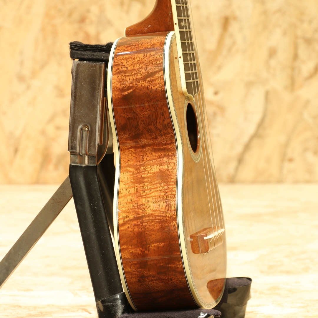 アメリカのギターブランドとして1800年代から製造を開始し、1910年代前半からはウクレレの開発を始め、1918年頃からはウクレレの製造を開始。1916年創業のカマカと肩を並べ、ウクレレにおいても最古参と言えるブランドです。1920年代のハワイアンブームには一世を風靡し、ヴィンテージ市場でも人気を博します。同社ラインナップの中でフラッグシップモデルとして製造されている"5K"モデル。本器はソプラノボディ、2016年製USED品です。カーリー杢が揺らめくコアボディ、エボニー指板、コアブリッジ、アバロントリム&ロゼッタ、トーチヘッドインレイ、アイボロイドバインディング、スノーフレイク&キャッツアイ指板インレイ、オリジナルゴトー製ギアペグアイボロイドつまみ(交換)、ヘッド裏""C.F.Martin&Co.,Nazareth,PA."刻印入り。ネックヒール横ボディバック上部とボディエンドにはゴールドのストラップピンが装着されています。5Kの歴史を遡るとその始まりは1922年。何度か細かい仕様変更を繰り返しましたが、大きな変更はなく1942年には製造中止。それからしばらくの間は製造されることはありませんでしたが、2005年に復刻、現在でもラインナップにフラッグシップとして君臨しているモデルです。音色はマーティンの良さが存分に味わえるもので、はじけるようなソプラノ特有のまとまりの中、溶けるような甘いトーンで各弦がしっかりと分離され素晴らしい音量とバランスで耳元を包んでくれる感覚です。5グレードならではのアバロン装飾、指板のスノーフレイク&キャッツアイインレイはファンシーさを演出。高級さと可愛らしさを同時に持ち、このモデルが最高峰である事を実感させてくれます。ボディバインディングのトップ&バックに剥がれ修正が施されていますが丁寧にリペアされており、若干跡はあるものの使用にも影響はありません。ゴトー製UPTペグへ交換されており、より実用性を高めた1本となっています。製作数が少なく、新品でもなかなか市場には現れない5Kモデル。是非ご検討ください。オリジナルハードケースが付属します。