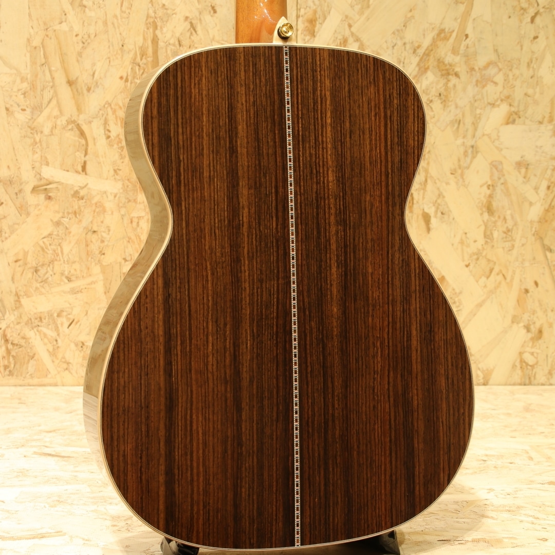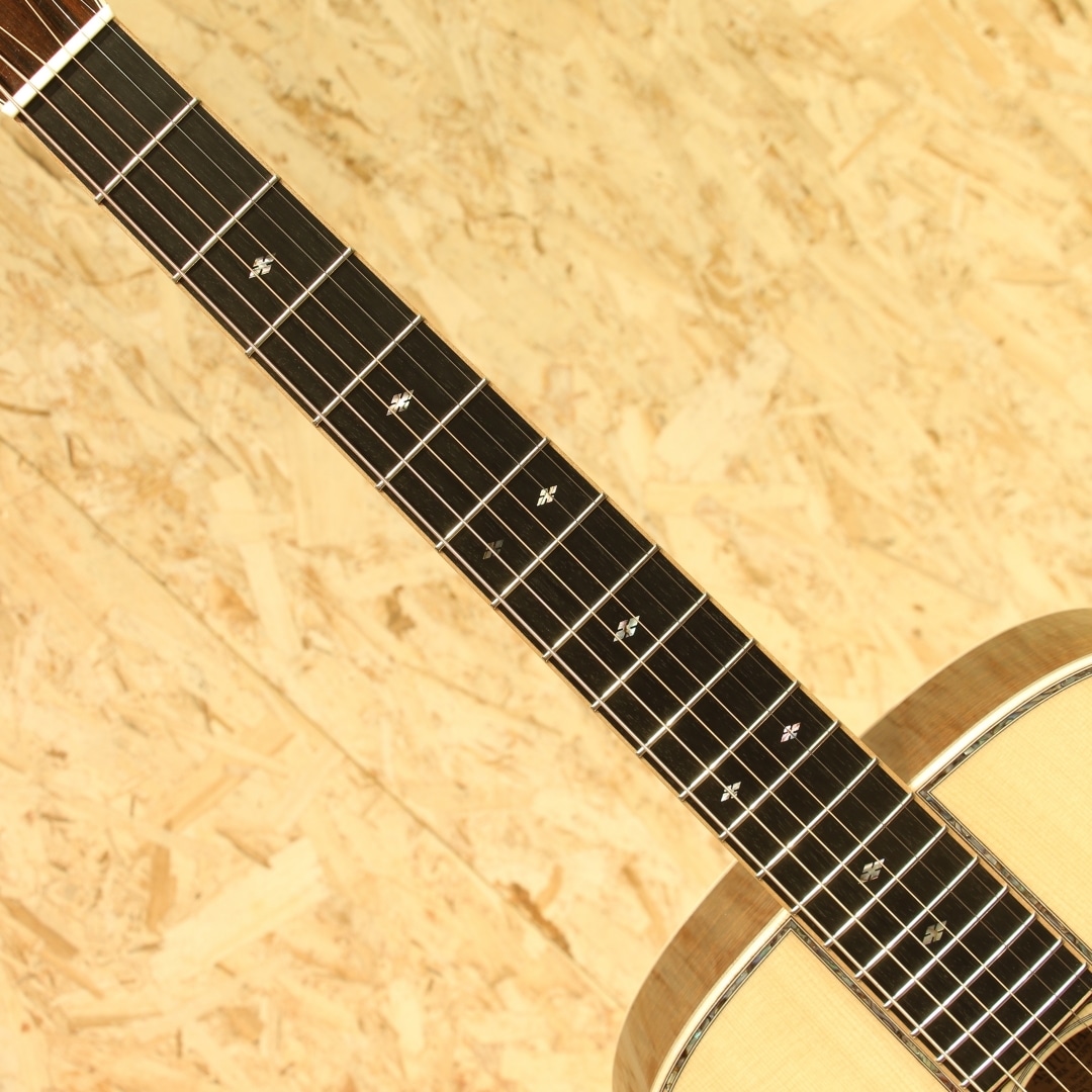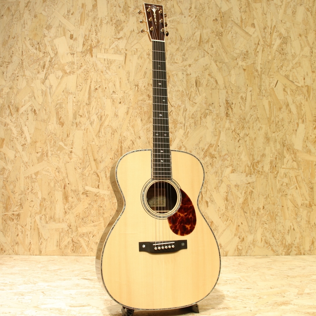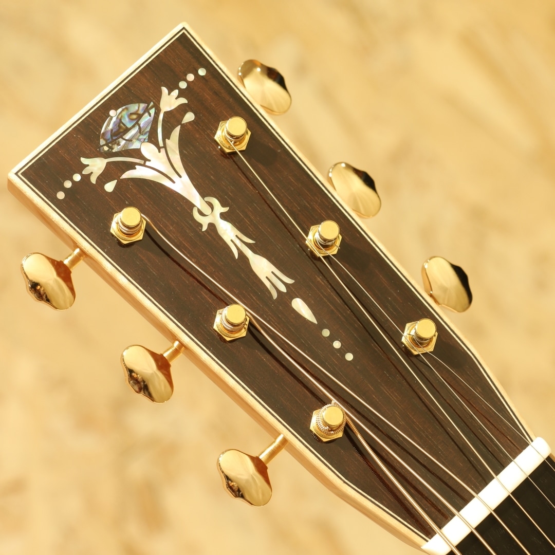 1962年より福岡久留米にてギター製造を行う老舗純国産ギターブランド、アストリアスギター。現在もベテランを中心とした約15名のスタッフで運営しています。本器は楽器店のカスタムオーダーによって製作された"OM EMBLEM"、2016年製USED品。同ブランドのハイエンドモデル"E.C.EMBLEM"をベースに材木やピックガードなどのパーツまでハンドピックし厳選された部材で作り上げられた1本。きめ細やかで美しいジャーマンスプルーストップ、通常ラインナップにはないマダガスカルローズウッドをサイド&バックに使用。マホガニーネック、エボニー指板&ブリッジ、ゴトー製オープンゴールドペグ、ハカランダ天神板、アバロントーチインレイ・スノーフレイク指板インレイ、アバロンパーフリング&ロゼッタ、ロングサドル、トーティスピックガード、ノンスキャロップドXブレーシング、オールラッカー仕上げ、ネックヒールキャップにストラップピン装着。ヘッド/ネック/ボディバインディングにはフィギャード杢の浮き出たコア材を贅沢に使用、アバロンにて施された華やかなルックスとの相性は抜群で本モデルならではの仕上がりです。ジャーマン×マダガスカルローズウッドが生み出す硬すぎずも存在感のある輪郭に凛としたクリアなトーンでしっかりとコシと伸びのある響き。暴れすぎずにパンチの効いたサウンドから心地よく余韻を堪能できるメロウなサウンドなど、幅広く活躍してくれる高いポテンシャルを備えています。小ぶりがゆえに、音の立ち上がりが早くタッチレスポンスに優れた音色。45mmナット幅、645mmのロングスケール仕様で音の分離も明瞭、心地よい倍音もふくみフィンガースタイルに最適なギターです。力強いストロークにもしっかりと対応、明瞭な音像でぼやけることもなくノンスキャロップXブレイシングらしい芯の太さを出しながら安定したストロークサウンドを奏でます。1弦側トップ面ロウワバウト箇所に塗膜のみの打痕、その他表面的薄いな擦れ傷が見られる程度、ゴールドパーツも僅かなくすみはあるものの輝きを保っています。プレーン弦の1-3フレットにかけて僅かな摩耗が見られますがプレイに影響はございません。ネックコンディションも大変良好。ハイエンドモデルから更なるグレードアップが施されたカスタムモデル。レギュラーモデルとは一線を画したそのルックス、サウンドを是非お手元でご体感ください。オリジナルハードケースが付属します。