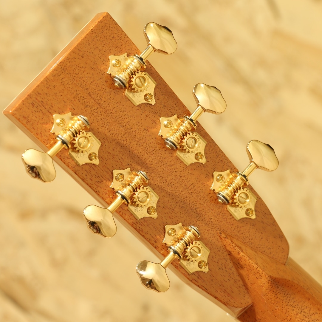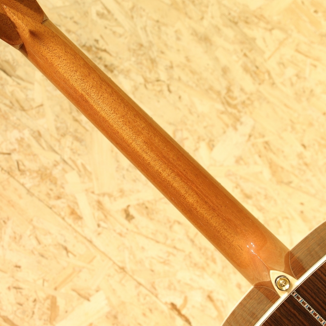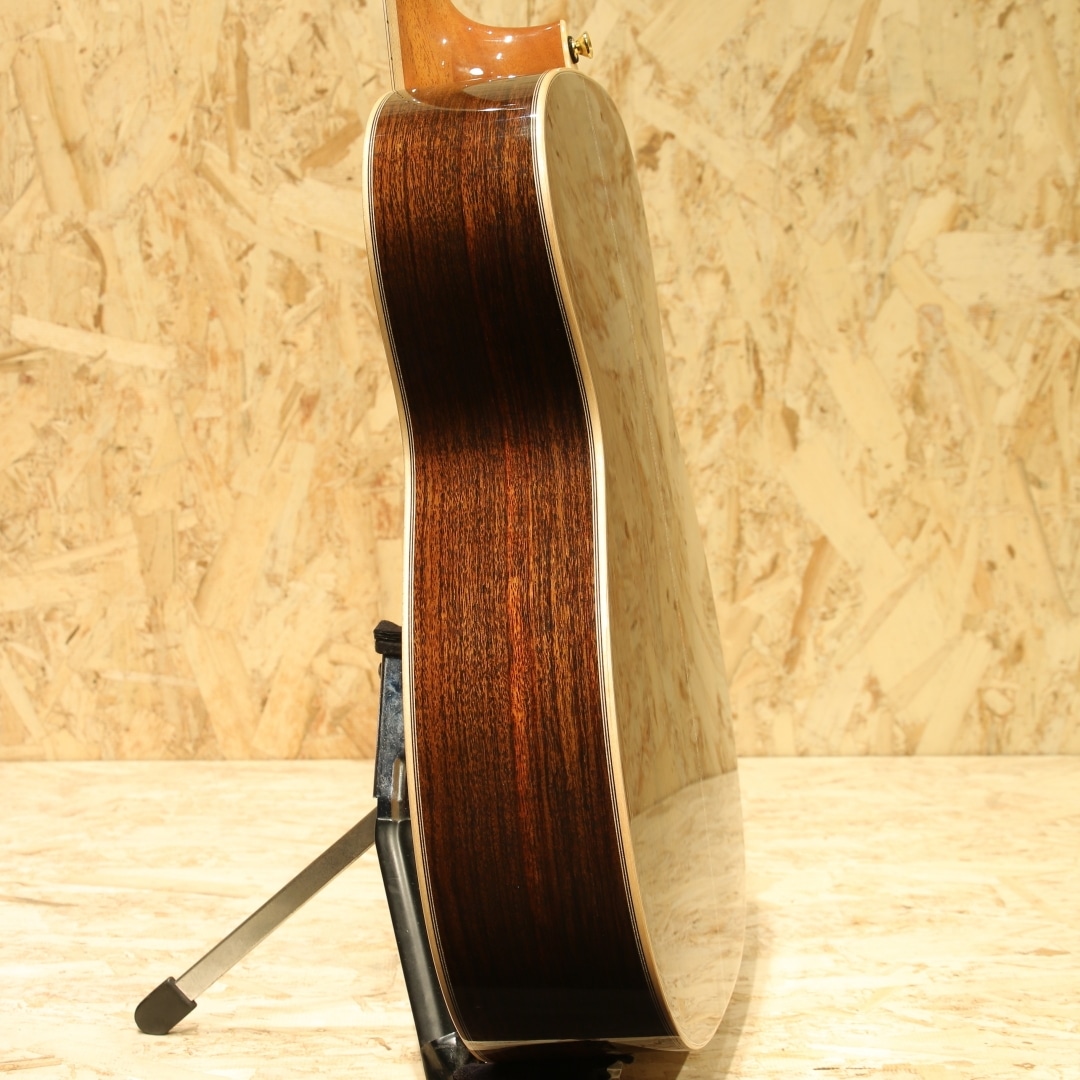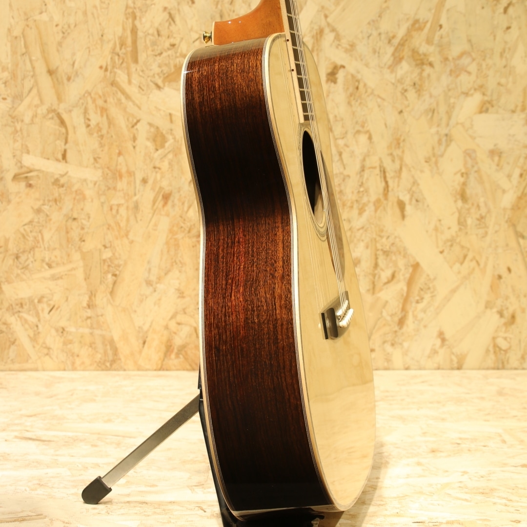 1962年より福岡久留米にてギター製造を行う老舗純国産ギターブランド、アストリアスギター。現在もベテランを中心とした約15名のスタッフで運営しています。本器は楽器店のカスタムオーダーによって製作された"OM EMBLEM"、2016年製USED品。同ブランドのハイエンドモデル"E.C.EMBLEM"をベースに材木やピックガードなどのパーツまでハンドピックし厳選された部材で作り上げられた1本。きめ細やかで美しいジャーマンスプルーストップ、通常ラインナップにはないマダガスカルローズウッドをサイド&バックに使用。マホガニーネック、エボニー指板&ブリッジ、ゴトー製オープンゴールドペグ、ハカランダ天神板、アバロントーチインレイ・スノーフレイク指板インレイ、アバロンパーフリング&ロゼッタ、ロングサドル、トーティスピックガード、ノンスキャロップドXブレーシング、オールラッカー仕上げ、ネックヒールキャップにストラップピン装着。ヘッド/ネック/ボディバインディングにはフィギャード杢の浮き出たコア材を贅沢に使用、アバロンにて施された華やかなルックスとの相性は抜群で本モデルならではの仕上がりです。ジャーマン×マダガスカルローズウッドが生み出す硬すぎずも存在感のある輪郭に凛としたクリアなトーンでしっかりとコシと伸びのある響き。暴れすぎずにパンチの効いたサウンドから心地よく余韻を堪能できるメロウなサウンドなど、幅広く活躍してくれる高いポテンシャルを備えています。小ぶりがゆえに、音の立ち上がりが早くタッチレスポンスに優れた音色。45mmナット幅、645mmのロングスケール仕様で音の分離も明瞭、心地よい倍音もふくみフィンガースタイルに最適なギターです。力強いストロークにもしっかりと対応、明瞭な音像でぼやけることもなくノンスキャロップXブレイシングらしい芯の太さを出しながら安定したストロークサウンドを奏でます。1弦側トップ面ロウワバウト箇所に塗膜のみの打痕、その他表面的薄いな擦れ傷が見られる程度、ゴールドパーツも僅かなくすみはあるものの輝きを保っています。プレーン弦の1-3フレットにかけて僅かな摩耗が見られますがプレイに影響はございません。ネックコンディションも大変良好。ハイエンドモデルから更なるグレードアップが施されたカスタムモデル。レギュラーモデルとは一線を画したそのルックス、サウンドを是非お手元でご体感ください。オリジナルハードケースが付属します。