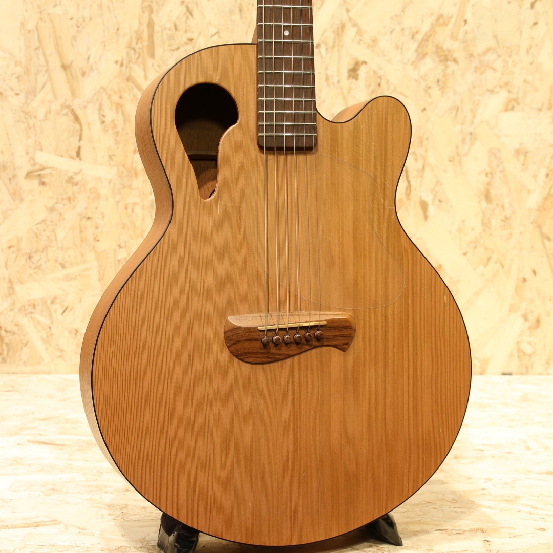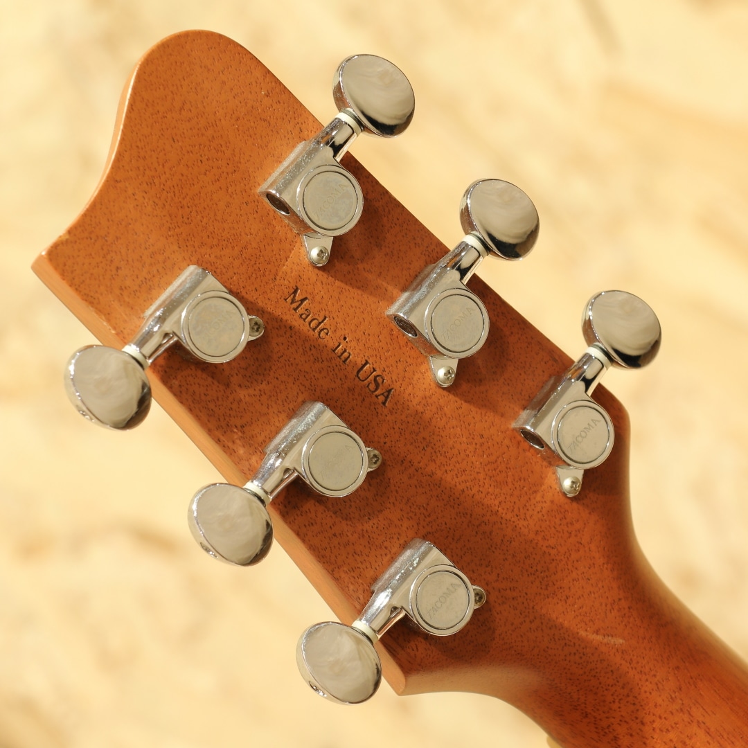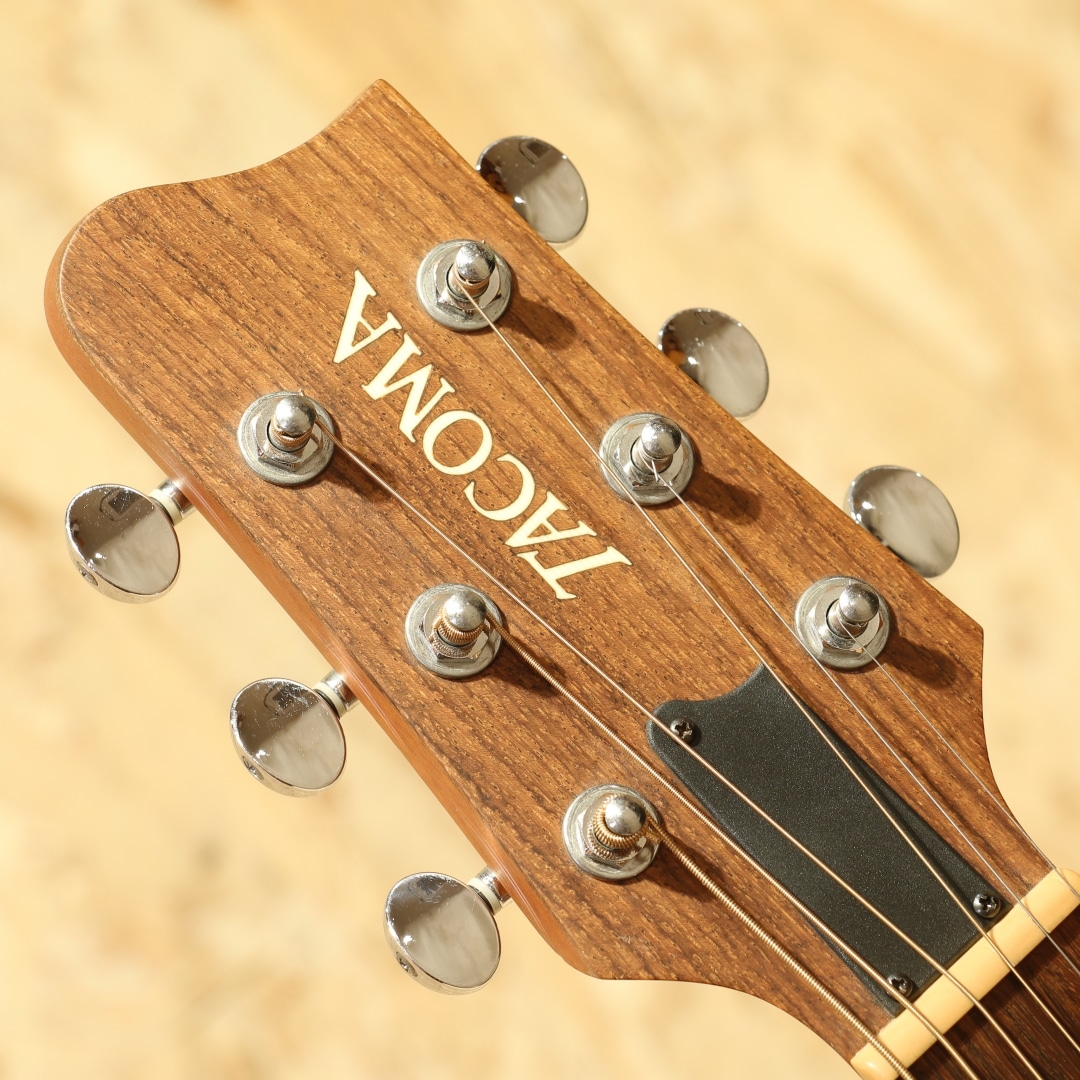 タコマギターは1996年に創立され、ワシントン州タコマの地からブランド名を取ったアメリカンブランドです。代表的なチーフモデルなどユニークなデザインと高い実用性を兼ね備えたギター達、2008年の工場閉鎖までに国内外を含め多くのプロミュージシャンに支持され人気を博しました。本器はタコマを代表する人気のチーフシリーズ”C1C”。2000年代製USED品。シダートップ、マホガニーサイド&バック、マホガニーネック、ローズウッド指板&ブリッジ、オリジナルシャーラーペグ、約15.5インチほどのくびれの深いオリジナルセミジャンボボディーシェイプ、カッタウェイ、ボルトオンネックジョイント、B-Band社製アンダーサドルピックアップシステム搭載。タコマのアイデンティティとも言える独自のボディシェイプ、そして6弦側に位置する独特な形状のサウンドホールや独自のブリッジ構造。今でこそボディのセンターにサウンドホールが無いフラットトップギターも見られるようになりましたが、当時としてはOvationに続く革新的なデザインと言えるでしょう。ネック形状も薄く成形されており、カッタウェイも搭載することで演奏性を確保したモダンな設計。シンプルな装飾と実用性、それでありながらインパクトのある個性的ルックスから人気を博しました。本器もその例に漏れず上記の特徴を持っており、シンプルな装飾、カッタウェイと薄いネックによる演奏性、そしてタコマらしいインパクトのあるルックスを与えられています。トップにはシダーを使用し、柔らかく繊細に響く音色を生み出します。指のタッチに対しての反応が良く、繊細なトーンからメロウなトーンと切り替えながら演奏が可能。木の温もりと透明感を感じる響き、肩肘張らず伸び伸びと演奏の出来そうな1本です。特段演奏スタイルに得手不得手は感じられませんが、反応の良さから指で演奏したくなるような1本。ピックアップシステムにはB-Band社製アンダーサドルピックアップシステムを搭載。太い音色を持ち、芯を捉えたサウンドを出力。素子自体が薄いため繊細な響きもピックアップしアウトプットすることが出来ます。アクティブタイプだからこそノイズにも強く、コントローラは無しとシンプルな構成。繋ぐだけで使える優秀なピックアップシステムです。サウンドホール付近にやや深めの当てキズが数か所、ピックでの弾きキズがトップ面カッタウェイ箇所からピックガード周りにかけて見られる点、トップ面くびれ付近にも当てキズが見られます。その他ピックガードやネック裏のテカリなどは見られますが、ほとんどがトップ面への使用感で全体的には比較的キレイな状態をキープ。ネック周りの演奏性、サドル残も残した良好な1本です。最近では流通も少ないタコマギター。お探しの方は必見です。