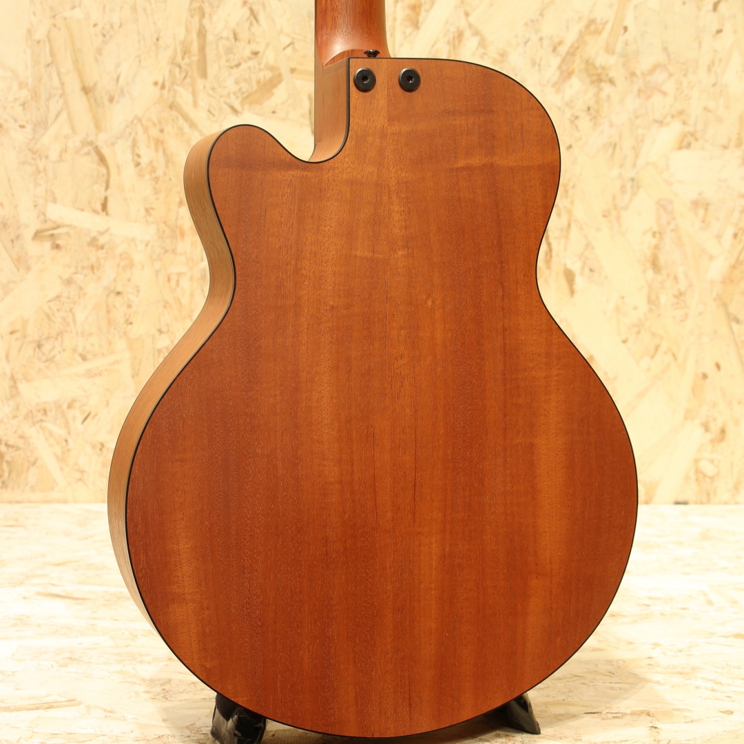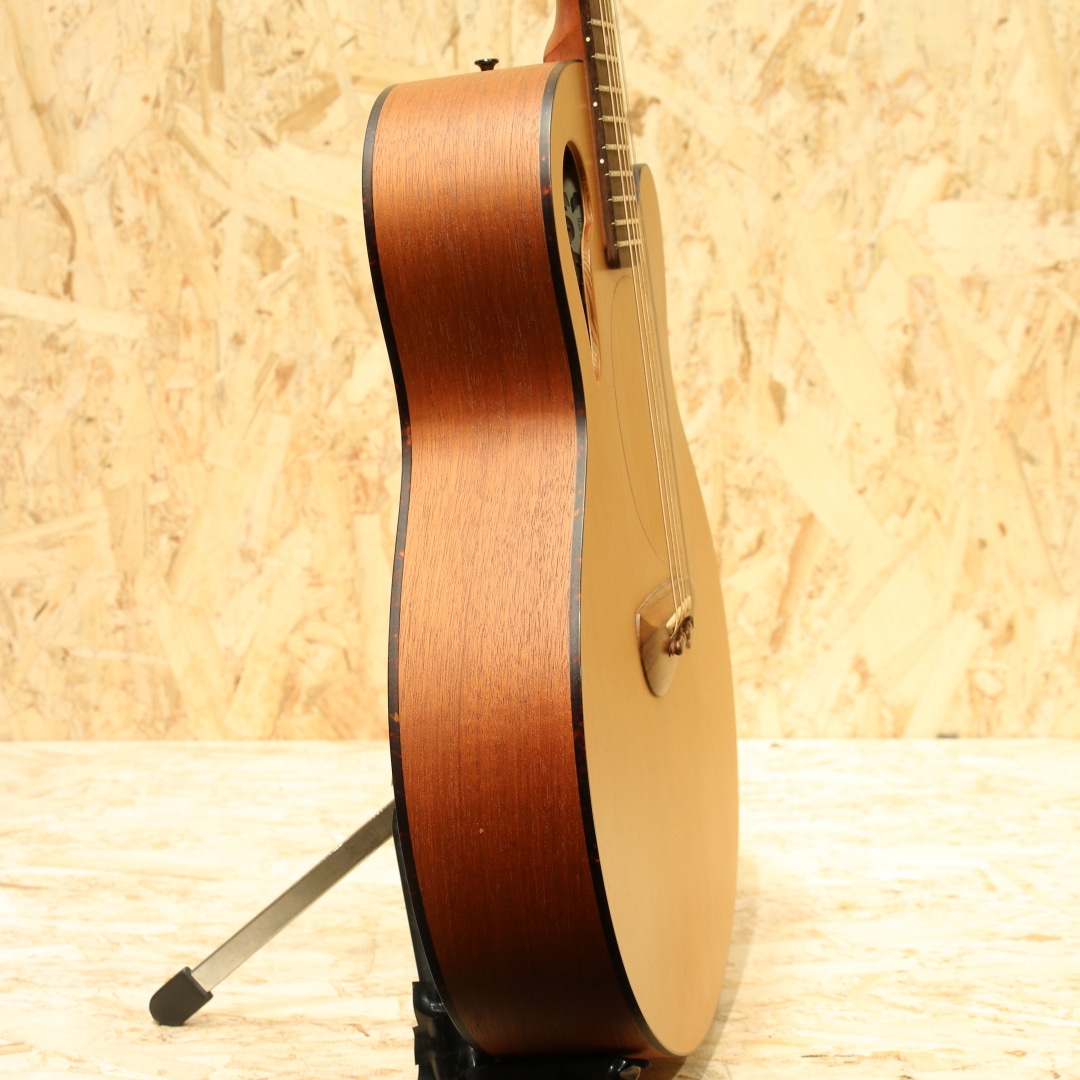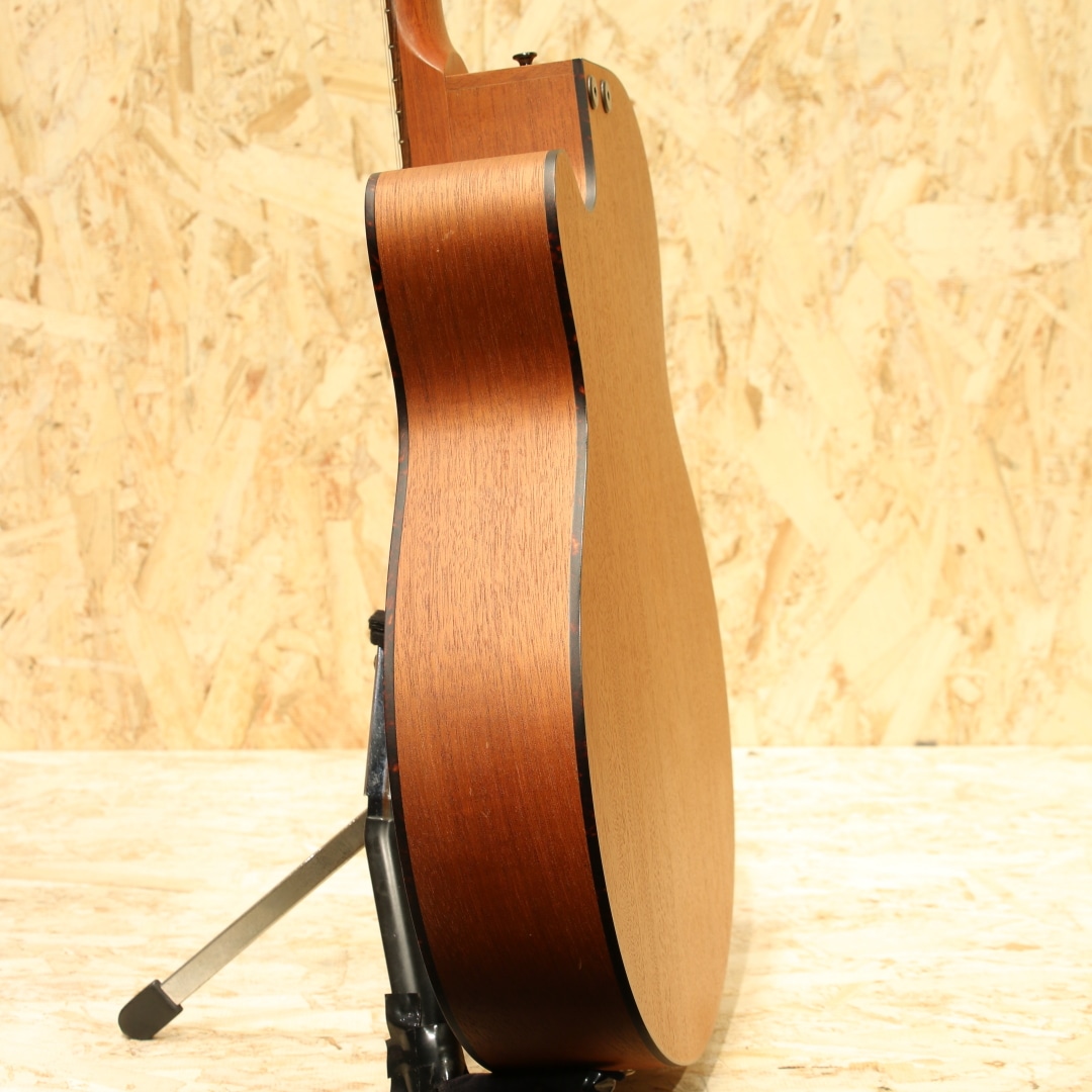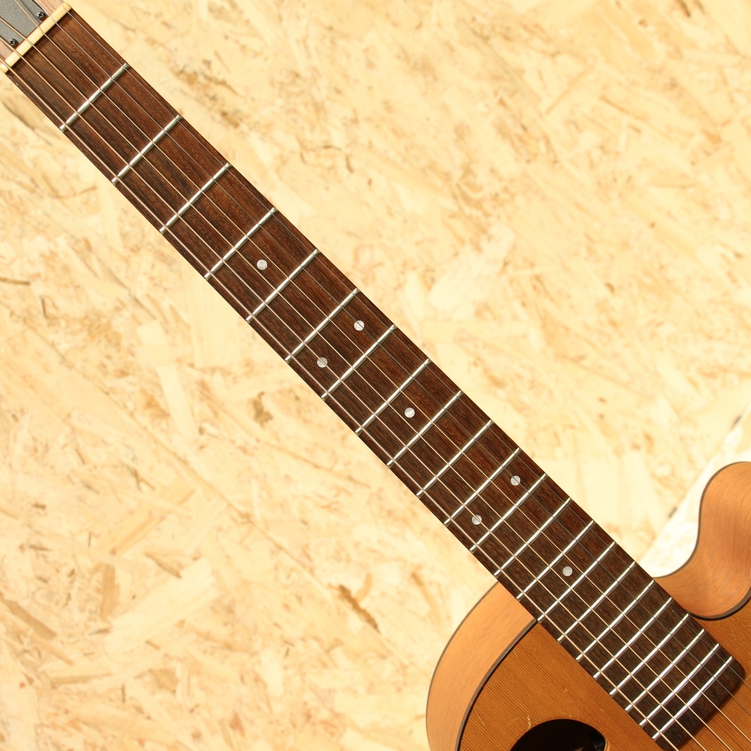 タコマギターは1996年に創立され、ワシントン州タコマの地からブランド名を取ったアメリカンブランドです。代表的なチーフモデルなどユニークなデザインと高い実用性を兼ね備えたギター達、2008年の工場閉鎖までに国内外を含め多くのプロミュージシャンに支持され人気を博しました。本器はタコマを代表する人気のチーフシリーズ”C1C”。2000年代製USED品。シダートップ、マホガニーサイド&バック、マホガニーネック、ローズウッド指板&ブリッジ、オリジナルシャーラーペグ、約15.5インチほどのくびれの深いオリジナルセミジャンボボディーシェイプ、カッタウェイ、ボルトオンネックジョイント、B-Band社製アンダーサドルピックアップシステム搭載。タコマのアイデンティティとも言える独自のボディシェイプ、そして6弦側に位置する独特な形状のサウンドホールや独自のブリッジ構造。今でこそボディのセンターにサウンドホールが無いフラットトップギターも見られるようになりましたが、当時としてはOvationに続く革新的なデザインと言えるでしょう。ネック形状も薄く成形されており、カッタウェイも搭載することで演奏性を確保したモダンな設計。シンプルな装飾と実用性、それでありながらインパクトのある個性的ルックスから人気を博しました。本器もその例に漏れず上記の特徴を持っており、シンプルな装飾、カッタウェイと薄いネックによる演奏性、そしてタコマらしいインパクトのあるルックスを与えられています。トップにはシダーを使用し、柔らかく繊細に響く音色を生み出します。指のタッチに対しての反応が良く、繊細なトーンからメロウなトーンと切り替えながら演奏が可能。木の温もりと透明感を感じる響き、肩肘張らず伸び伸びと演奏の出来そうな1本です。特段演奏スタイルに得手不得手は感じられませんが、反応の良さから指で演奏したくなるような1本。ピックアップシステムにはB-Band社製アンダーサドルピックアップシステムを搭載。太い音色を持ち、芯を捉えたサウンドを出力。素子自体が薄いため繊細な響きもピックアップしアウトプットすることが出来ます。アクティブタイプだからこそノイズにも強く、コントローラは無しとシンプルな構成。繋ぐだけで使える優秀なピックアップシステムです。サウンドホール付近にやや深めの当てキズが数か所、ピックでの弾きキズがトップ面カッタウェイ箇所からピックガード周りにかけて見られる点、トップ面くびれ付近にも当てキズが見られます。その他ピックガードやネック裏のテカリなどは見られますが、ほとんどがトップ面への使用感で全体的には比較的キレイな状態をキープ。ネック周りの演奏性、サドル残も残した良好な1本です。最近では流通も少ないタコマギター。お探しの方は必見です。