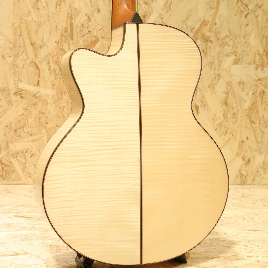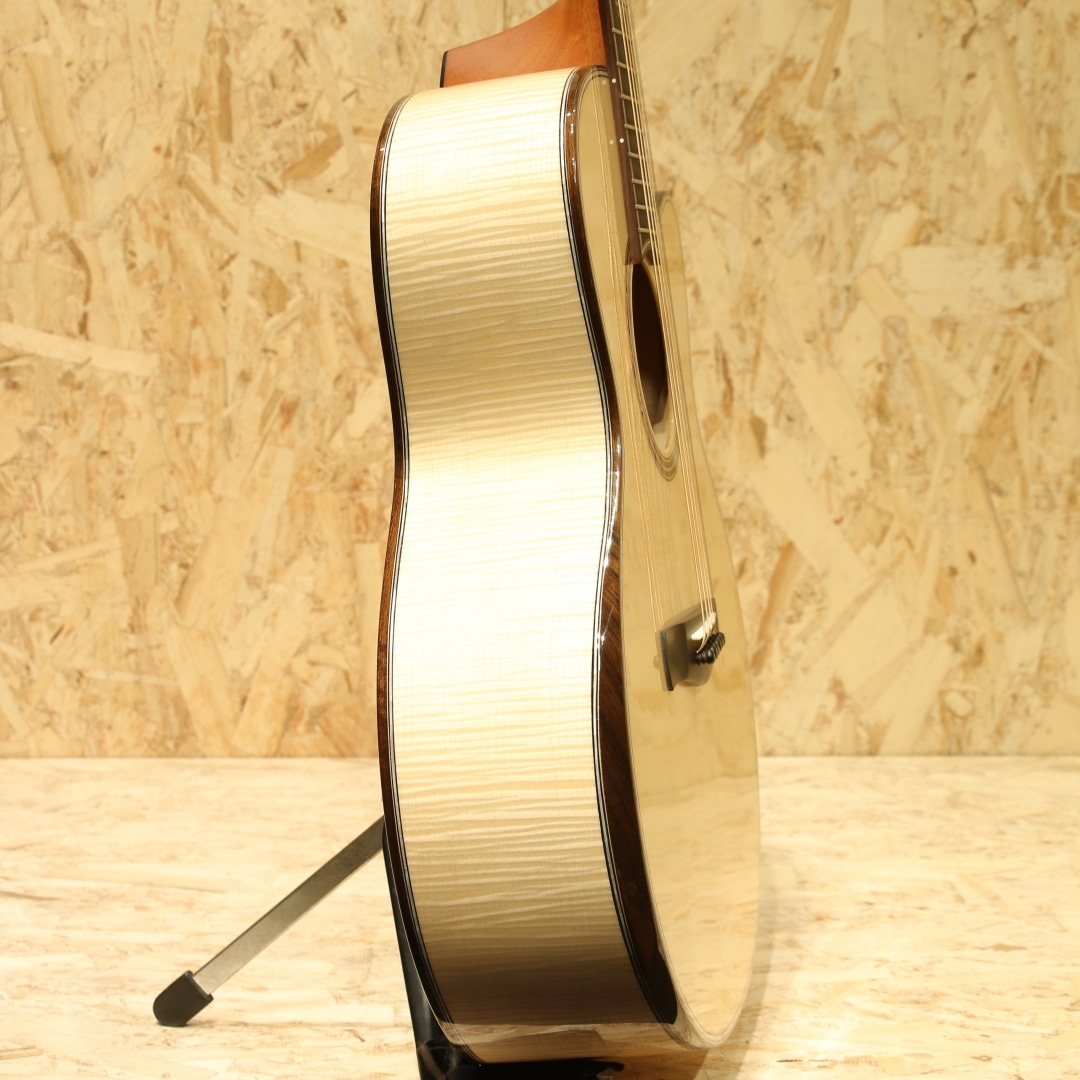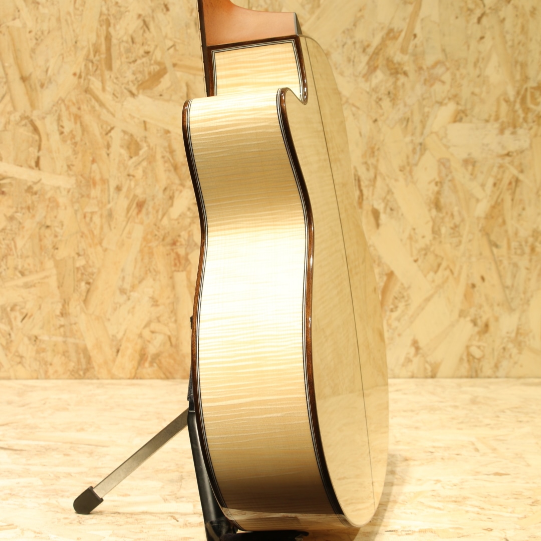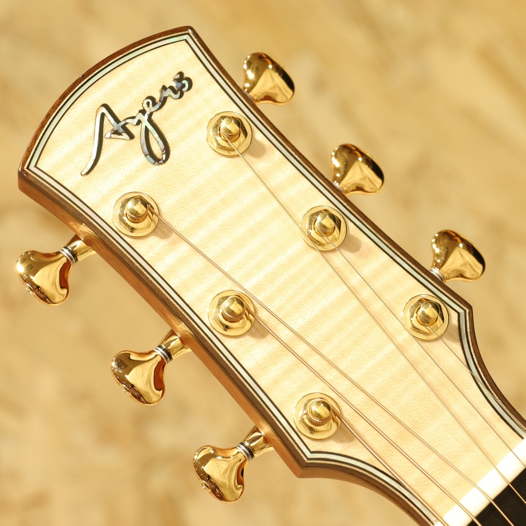 高級なオールハンドメイドギターでしか味わうことができなかった繊細なトーンをリーズナブルに。ベトナムで製造するブランド、”エアーズ”。完全手工にて生産されるハイコストパフォーマンスなブランドです。本器は某ショップオーダーにて製作されたカスタム品、オリジナルスモールジャンボシェイプモデル、”SSJ06P-C 3.0 NH-Custom”2020年代製USED品です。木肌の美しい5Aグレードアルパインスプルーストップ、細かく入った杢に魅了される5Aグレードフレイムメイプルサイド&バック、マホガニー1Pネック、エボニー指板&ブリッジ、Gotoh510ロトマチックゴールドペグ、アバロンロゼッタ、アフリカンオヴァンコールバインディング&アバロントリム、スキャロップドXブレイシング。エアーズは厳選された材料を使用し、ハンドメイドで製作されています。本器はOTS(オーバートーンシステム)が採用された1本、ver3.0に当たる仕様。構造倍音と銘打ったシステムで基音の上に乗る倍音成分を多くし、複雑で広がりのある倍音の多いサウンドを狙っています。同時に音の揺らぎをも生み出して心地よさや美しさを感じられるようなサウンドを得やすい構造。ネック自体は薄めに成形されており、演奏性高く複雑なフレーズでも対応の出来るシェイプ。カッタウェイ搭載ですので、ソロギターなどフィンガーでの細やかなフレーズの多いスタイルはもちろん、ハイポジションを多用するストロークでのフィンガリングでもスムーズな演奏が可能です。ボディ形状はSJ(Small Jumbo)。OMサイズより多くの空気感を含んだトーン、広いレンジ感で濃厚な低音成分を体感できるボディシェイプです。ボディにはアームレストも搭載されており、演奏の際のストレスも軽減し抱えやすい仕様です。スプルースの中でもしなやかで豊かな弾力性を持つアルパインスプルース、タッチレスポンスにも優れ繊細な音色が持ち味、心地よい倍音を含みながら上品なサウンドを生み出します。キメ細かく配されたフレイム杢の美しい5Aグレードのフレイムメイプルはルックスの絢爛さもちろんですが、奏でられる華やかでメロウなトーンも魅力の1つです。フィンガースタイルとの相性は抜群で、細かなタッチニュアンスなどもしっかりと表現できるギターです。特筆するような使用感は無く、ゴールドパーツも輝きを保ったままです。ネック含めたコンディションも良好、演奏性の高い状態を保った1本です。手工ギターや高級ギターのようなニュアンスを持ち、拘りの詰め込まれたアジアメイドのハンドメイドギター。そのコスパの良さを是非お手元でご体感下さい。オリジナルハードケースが付属します。