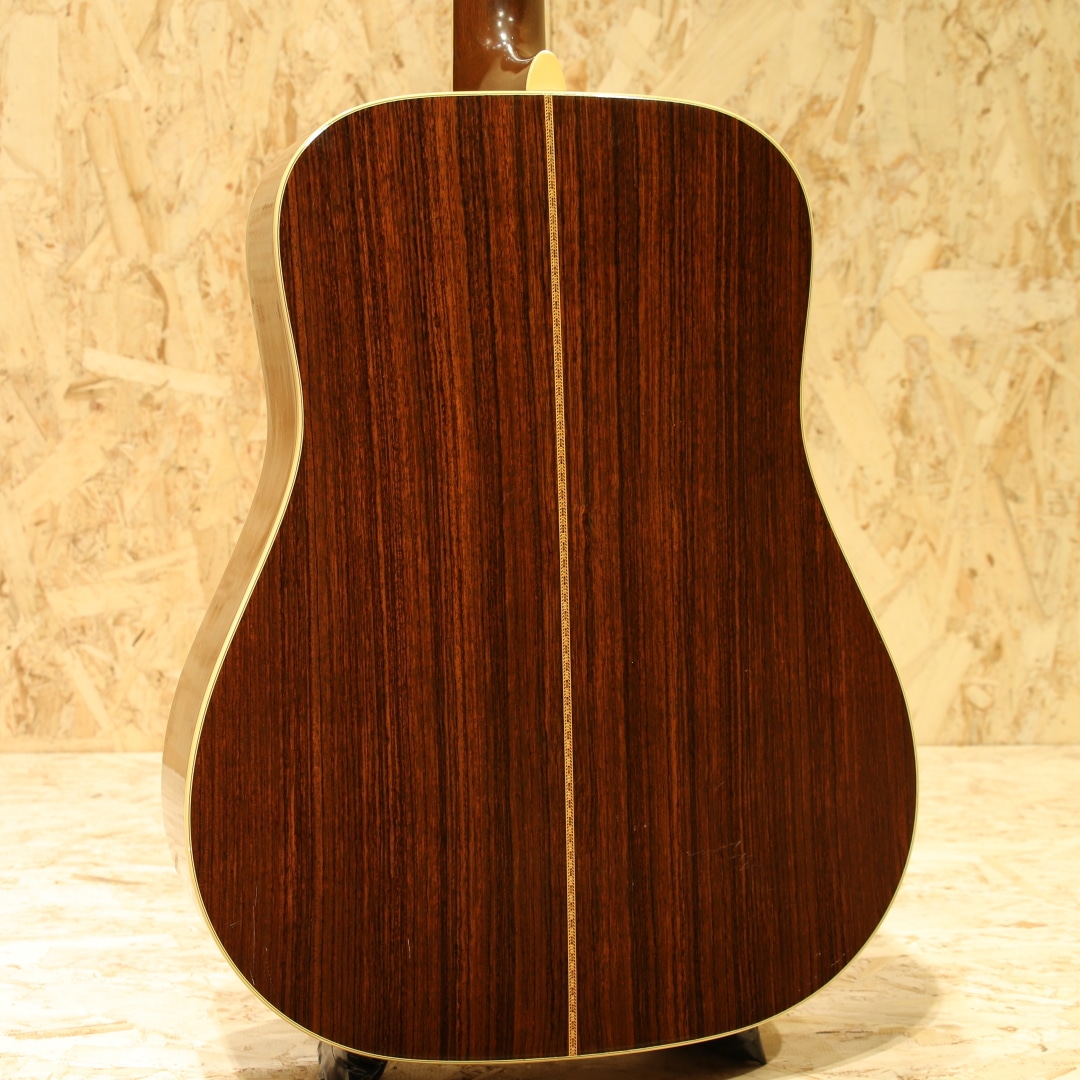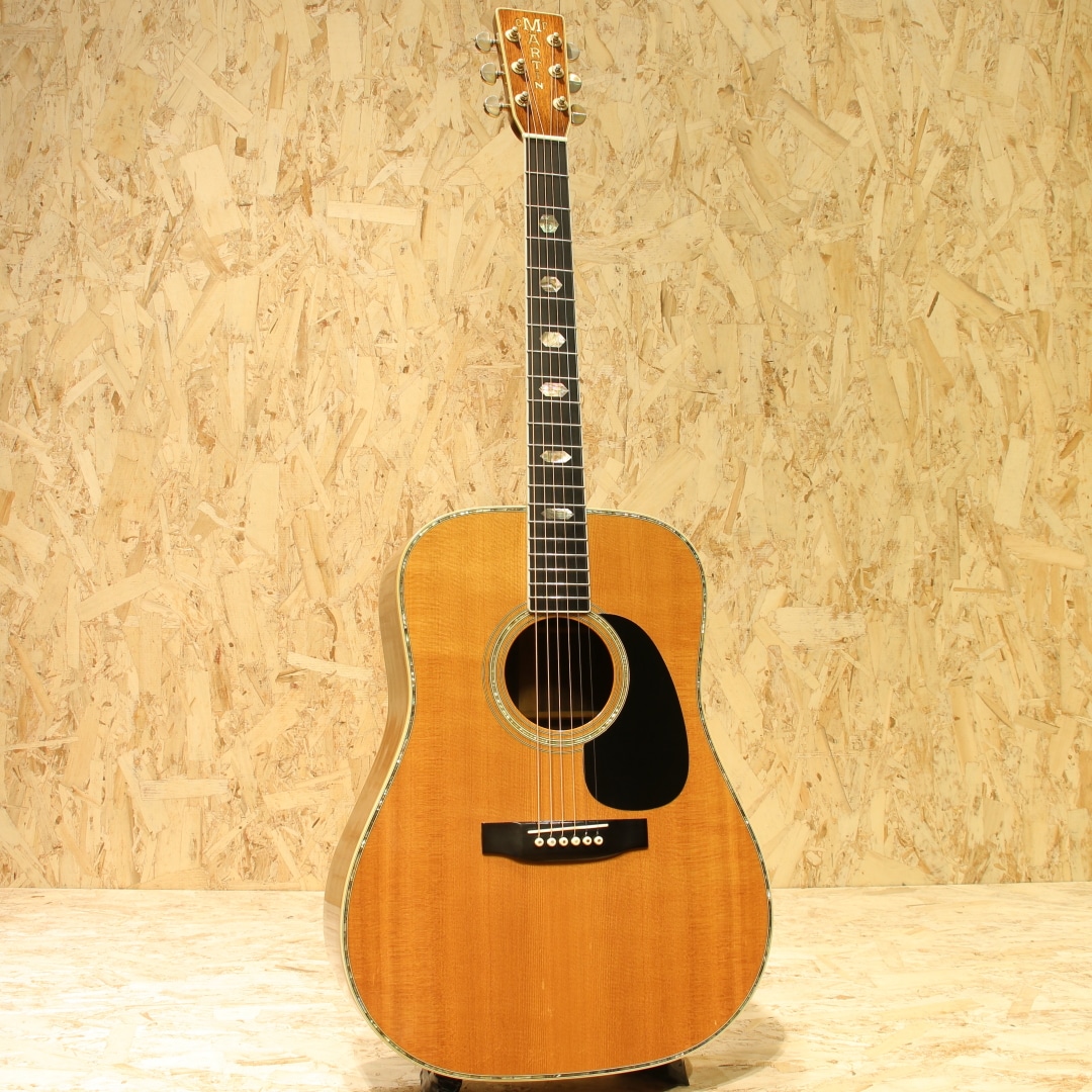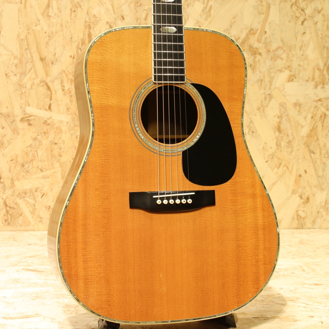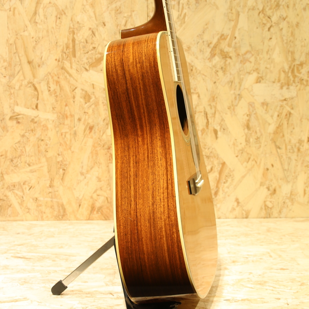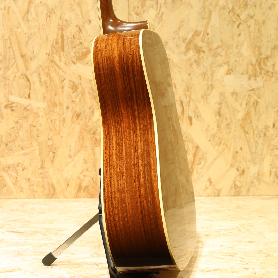 "D-41"は1969年に製作が開始されたマーチン社の広報/研究家マイク・ロングワース氏がデザインしたモデル。"D-45"は高価で手が出ないという声に応える為に開発され、28と45の中間モデルとして、ゴージャス感を兼ね備えた独自の個性を魅せます。本器は1975年製のUSED品。縦横の素晴らしい密度のシトカスプルーストップ、端正で美しいローズウッドサイド&バック、マホガニーネック、エボニー指板&ブリッジ、USAゴールドグローバーペグ、バーチカルヘッドロゴ(縦ロゴ)、ヘキサゴン指板インレイ、ソリッドアバロンロゼッタ&トリム、ラージローズウッドブリッジプレート、スクエアネックトラスロッド、ノンスキャロップドXブレイシング。ピックガードは同形の黒にリプレイスされていますが、上面より塗装も施されオリジナルと見紛う仕上がりです。芯が太く、重心がしっかりと乗った骨太なサウンド。エアーが弱めできらきらとした倍音が際立つサウンドは現行とは完全に一線を画すもので70sフォークにぴったりとハマります。この年代を弾かず、紆余曲折現行品を弾かれたフォーク世代の方は納得のいくサウンドでしょう。同年の28よりも上品な倍音を程よく含み、45では感じられないパンチ感や重厚感を兼ね備えているのも魅力。整備のためナットサドルフレットなどの消耗部分はすべて交換済み、指板の15F以降に修正済みのラインクラックがありますが良く見ればわかる程度で使用には支障ありません。全体的なラッカーチェックは全体的に見られ、ひっかき傷や打痕なども見られますが大事にかつ綺麗に使用されてきたもので、上記以外の木部のクラックなどはなくとても良い顔をしています。ネックやボディのプレイコンディションも良好でとても素晴らしい弾き心地です。当時の生産規模はD-28の1/10未満、現在でも流通の少なくなっている'70s D-41。値段も高騰を見せています。黒の汎用モールドケース付属。その他の詳細はお気軽にお問い合わせ下さい。
