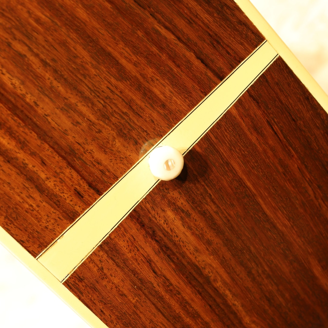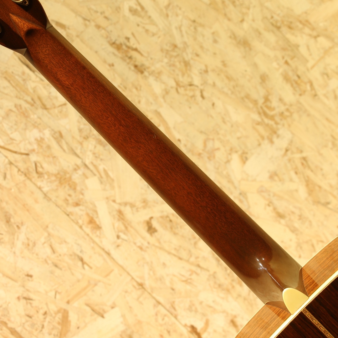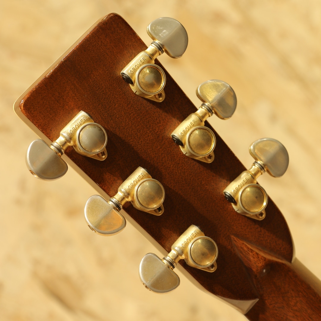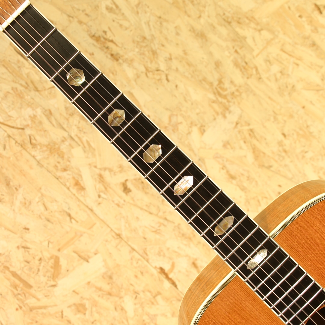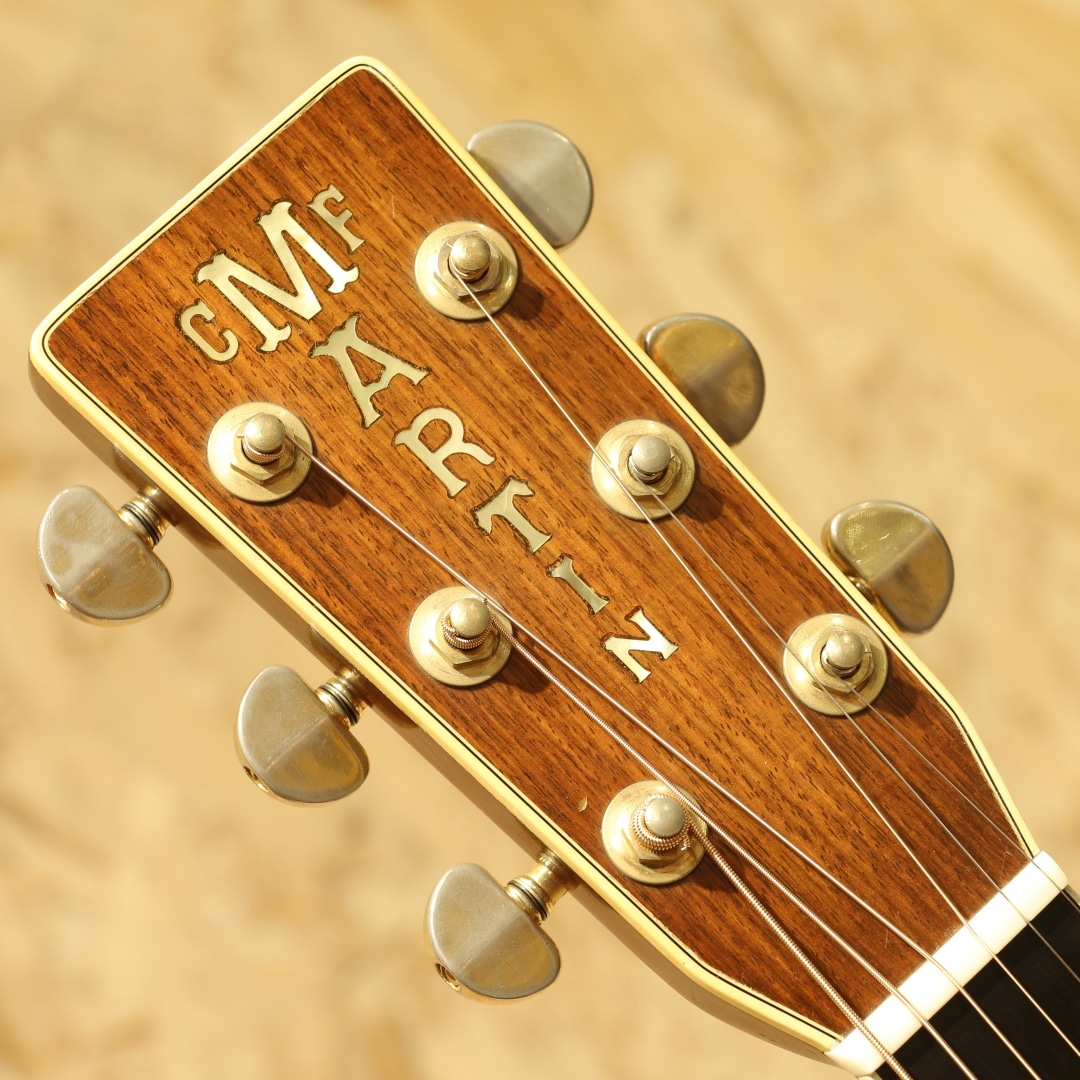 "D-41"は1969年に製作が開始されたマーチン社の広報/研究家マイク・ロングワース氏がデザインしたモデル。"D-45"は高価で手が出ないという声に応える為に開発され、28と45の中間モデルとして、ゴージャス感を兼ね備えた独自の個性を魅せます。本器は1975年製のUSED品。縦横の素晴らしい密度のシトカスプルーストップ、端正で美しいローズウッドサイド&バック、マホガニーネック、エボニー指板&ブリッジ、USAゴールドグローバーペグ、バーチカルヘッドロゴ(縦ロゴ)、ヘキサゴン指板インレイ、ソリッドアバロンロゼッタ&トリム、ラージローズウッドブリッジプレート、スクエアネックトラスロッド、ノンスキャロップドXブレイシング。ピックガードは同形の黒にリプレイスされていますが、上面より塗装も施されオリジナルと見紛う仕上がりです。芯が太く、重心がしっかりと乗った骨太なサウンド。エアーが弱めできらきらとした倍音が際立つサウンドは現行とは完全に一線を画すもので70sフォークにぴったりとハマります。この年代を弾かず、紆余曲折現行品を弾かれたフォーク世代の方は納得のいくサウンドでしょう。同年の28よりも上品な倍音を程よく含み、45では感じられないパンチ感や重厚感を兼ね備えているのも魅力。整備のためナットサドルフレットなどの消耗部分はすべて交換済み、指板の15F以降に修正済みのラインクラックがありますが良く見ればわかる程度で使用には支障ありません。全体的なラッカーチェックは全体的に見られ、ひっかき傷や打痕なども見られますが大事にかつ綺麗に使用されてきたもので、上記以外の木部のクラックなどはなくとても良い顔をしています。ネックやボディのプレイコンディションも良好でとても素晴らしい弾き心地です。当時の生産規模はD-28の1/10未満、現在でも流通の少なくなっている'70s D-41。値段も高騰を見せています。黒の汎用モールドケース付属。その他の詳細はお気軽にお問い合わせ下さい。
