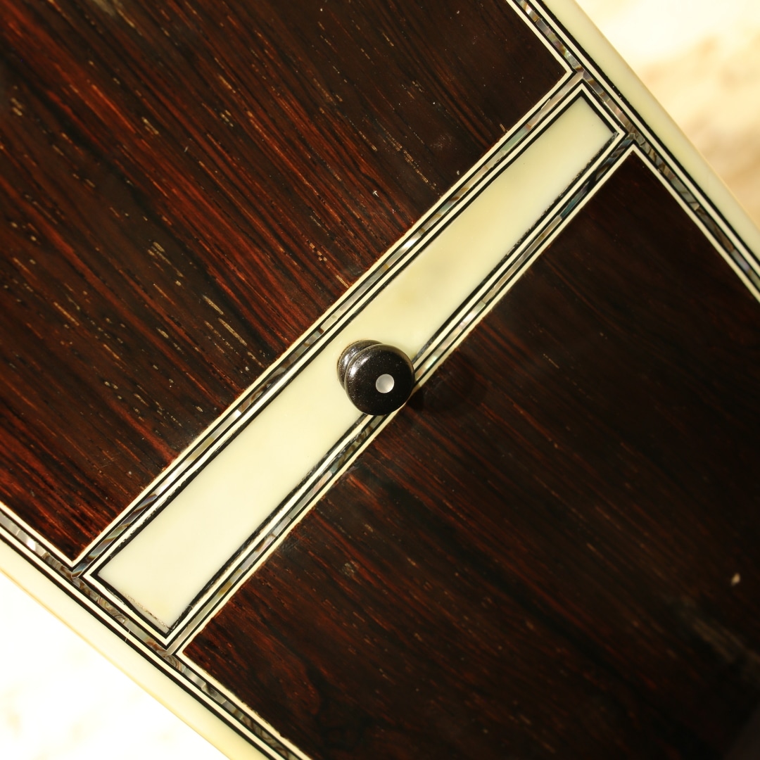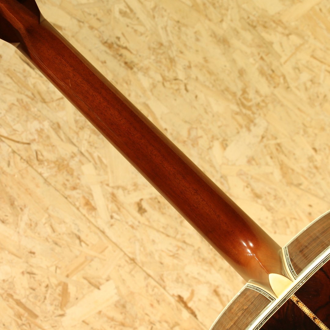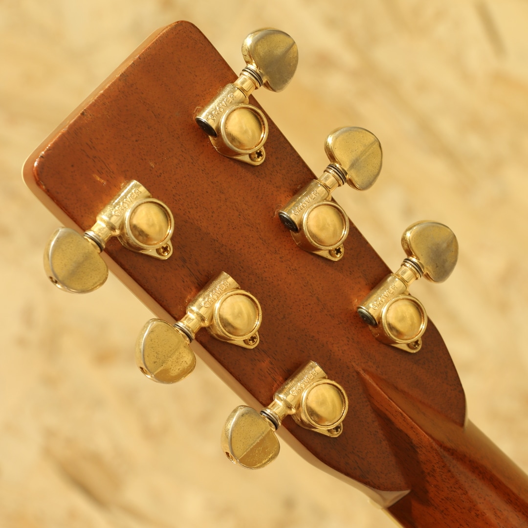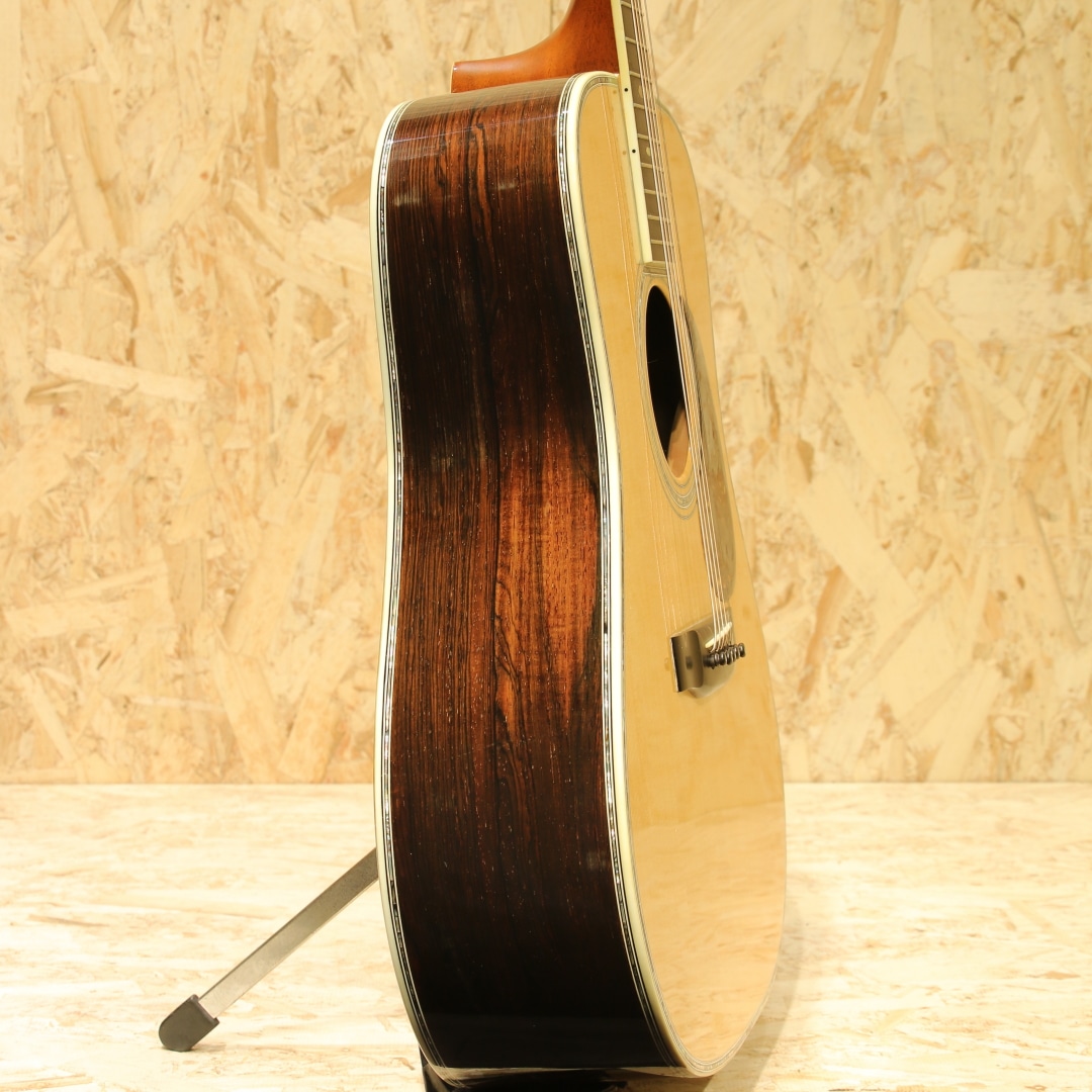 岐阜県の工房にて手作りにこだわり製造を続けるヤイリギター。世代を超えてずっと愛され続けるギター、年月を重ねても色あせないデザイン、使い込むほどに深みが増す音色をコンセプトとして現在でも約30名程の体制で1日20本程のペースで製造されています。海外の著名アーティストを始め、国内プロアーティストからも大きな支持を集めているブランドです。本器はD-45を手本としたフラッグシップモデル”DY-45”。1975年製USED品です。スプルーストップ、ハカランダサイド&バック、マホガニーネック、エボニー指板&ブリッジ、グローバーロトマチックゴールドペグ。ヘキサゴンアバロンインレイ、アバロントリム、オリジナルヘッドインレイ、べっ甲柄ピックガード、ADJトラスロッド、ノンスキャロップドXブレイシング。アコギプレーヤー永遠の憧れD-45、それを手本としヤイリギターのエッセンスを加え製作されたDY-45。本器はレギュラーモデルとは違った魅力を与えられた1本です。ヤイリギターでよく見られるネック裏サテン仕上げではなく、グロス仕上げである点。グリップ自体も丸みの強いネックシェイプで馴染みやすいネックに仕上がっています。現行品ではホンジュラスローズウッド仕様となっているDY-45ですが、この時期はハカランダを採用している点も贅沢な点。澄んだ音色や磨き抜かれたようなクリスタルな余韻を生み出し、この時期のギター特有でもあるやや太く芯の強いサウンドを持ち併せています。輪郭はハッキリとしており発音良し、明るい音色なため演奏スタイルやジャンルを選ばずに対応しやすいオールマイティな1本です。ボディエンドストリップは経年の縮小により僅かに隙間がありますが、一度再接着されており浮き等は見られません。ピックガードにも同様に経年による縮小の為、オリジナルのものを再接着しており、よくみると縮んだ分の木地が確認できますが、使用に影響はありません。その他、細かな小傷などは見られますが製造より半世紀の経過を思えば綺麗な状態が保たれた1本です。ネック周りの状態も良好に保たれ演奏性も充分。キラキラとした貝の輝きが映える非常にキレイなルックス、眺めて良し弾いて良しの良質な1本です。古き良きを感じられるフォークブームの最中に作られた1本。今や見かけることの少なくなったオール単板の国産ハカランダモデル、是非お手元にいかがでしょうか。オリジナルハードケースが付属します。