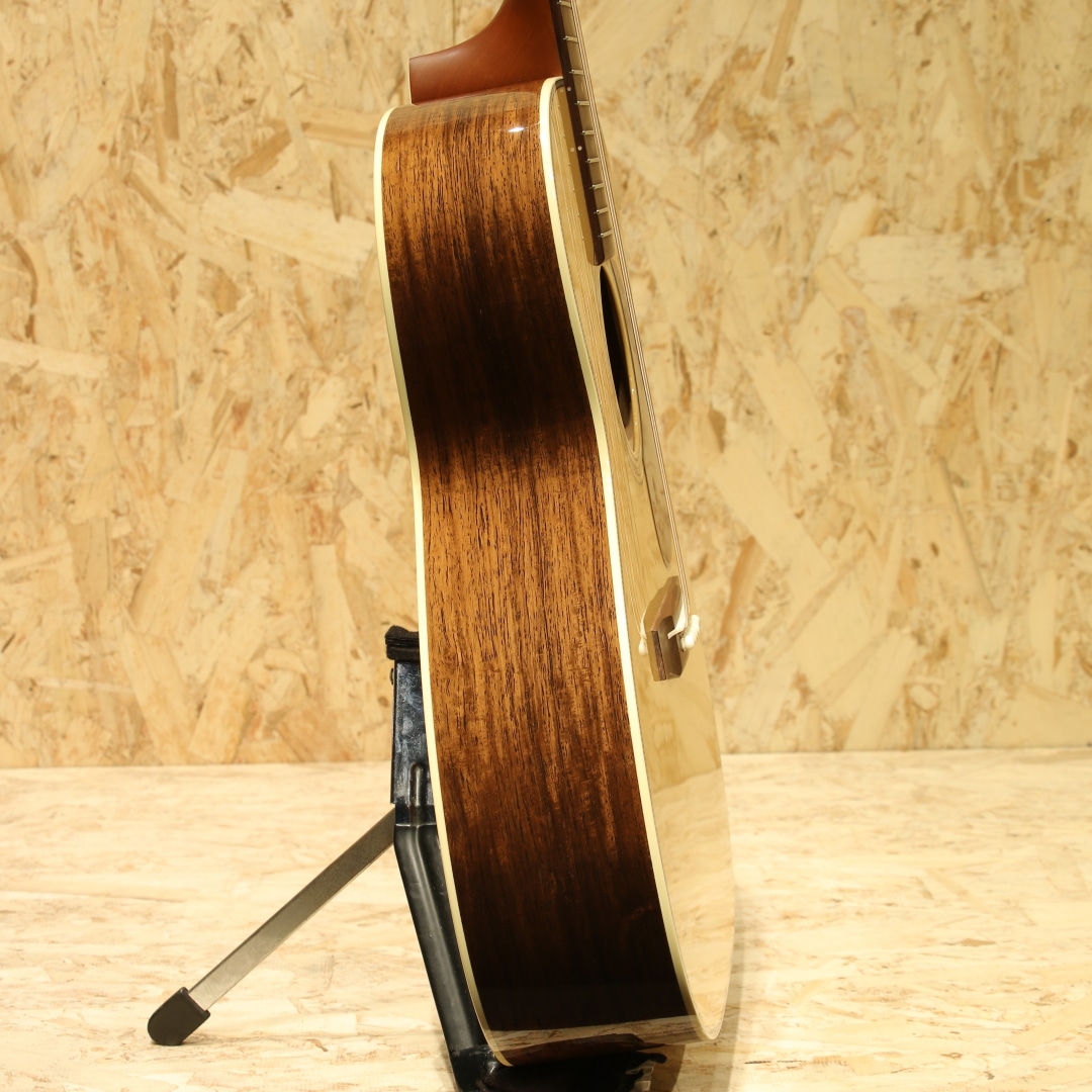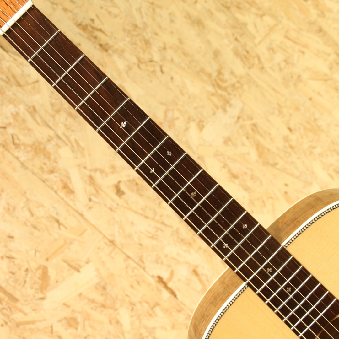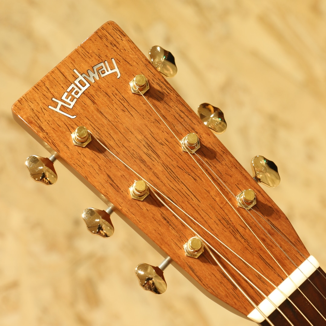 独自の工法と方法論で高品質のアコースティックギターを製作している長野県松本市の老舗ブランド"ヘッドウェイ"。多くのアコースティックギターファン、ミュージシャンたちに支持される日本製ギターを代表するブランドのひとつです。本器はOOOタイプの定番モデルHF-415を希少材でアップグレードした特別な型番、”HF-555’21 A,S-ESV/ATB”。2021年製極上USED品。アディロンダックスプルーストップ、マダガスカルローズウッドサイド&バック、キューバンマホガニーワンピースネック、ブラジリアンローズウッド指板&ブリッジ、ゴトー製510ゴールドペグ、アイボロイドバインディング、スキャロップドアドバンスドリアシフト(ARS)Xブレイシング。トラディショナルなスタイルを基本としているヘッドウェイ。現在では500番台というモダンなスタイルのシリーズもありますが、本器はHF-415を希少材にてアップグレードした特別な型番となります。HF-415はトラディショナルなOOOシェイプ、ローズウッドサイドバックのスタイル28に近しい定番モデル。使用している材を見ていくと、これでもかと希少材が使用されており木材マニアであれば涎が出そうなスペック。これだけでも気合の入りようが窺えるでしょう。ネックシェイプは薄めのエクストラスリムVネック。オーセンティックなVシェイプを薄くモダンにモディファイしたグリップ、従来のヘッドウェイナローVネックに比べ1mm厚みを減らし、よりスリムに。トラディショナルとモダンを両立させた秀逸なグリップです。近年HEADWAYが提唱しているARS(Advenced Rear Shift)の試作品は2016年頃から百瀬氏によって製作されており、2017年にはATB(Asuka Team Build)にも採用されました。長年使用するための強度とサウンドを両立させる為の工夫として、現在ではヘッドウェイの定番となりました。アディロンダックスプルース×マダガスカルローズウッドとカスタム品やヴィンテージライクなモデルに採用されることも多い組み合わせ。太く躍動感のあるサウンドを生み出すアディロンダック、硬質で抜けの良いトーンはマダガスカルローズ特有。強く弾いた際にはダイナミックに、繊細なタッチでは太くメロウに。ヘッドウェイ特有である線のハッキリとしたサウンドはそのままに、より華やかさを与えられモダン要素も併せ持つ1本です。本器は非常に使用感の少ないコンディションをキープされており、ピックガードに極々薄い弾き跡が僅かに見られる程度。製造時に付いたであろうバフ跡も残っており、手が加えられていないことが窺える極上USED品です。ネックコンディションも良好、弦高も弾きやすい高さ、サドル残も多く残されているため調整幅の多い個体です。トラディショナルを得意とするヘッドウェイ、古き良きを押さえた上でモダンを織り交ぜて造られたギター。希少な材をふんだんに使用した珠玉の1本です。是非ご検討下さいませ。