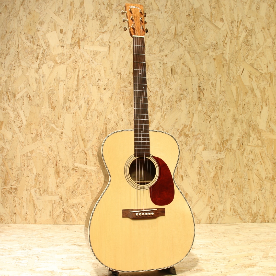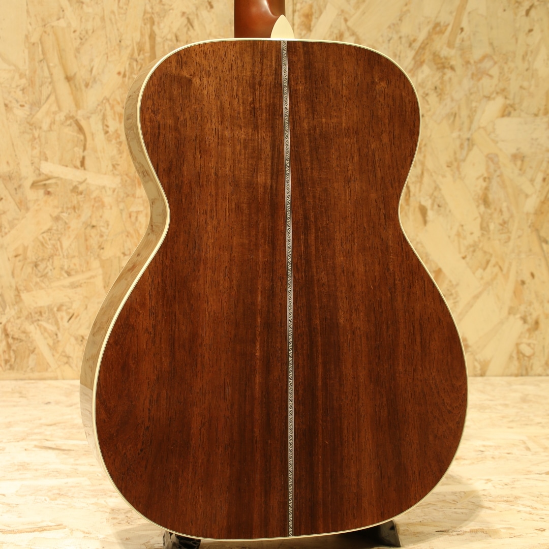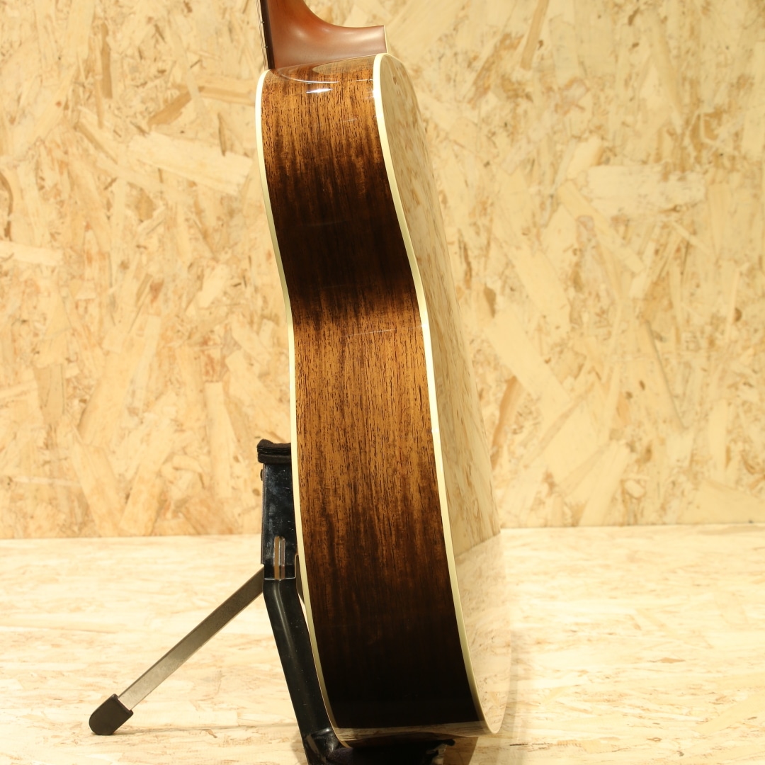 独自の工法と方法論で高品質のアコースティックギターを製作している長野県松本市の老舗ブランド"ヘッドウェイ"。多くのアコースティックギターファン、ミュージシャンたちに支持される日本製ギターを代表するブランドのひとつです。本器はOOOタイプの定番モデルHF-415を希少材でアップグレードした特別な型番、”HF-555’21 A,S-ESV/ATB”。2021年製極上USED品。アディロンダックスプルーストップ、マダガスカルローズウッドサイド&バック、キューバンマホガニーワンピースネック、ブラジリアンローズウッド指板&ブリッジ、ゴトー製510ゴールドペグ、アイボロイドバインディング、スキャロップドアドバンスドリアシフト(ARS)Xブレイシング。トラディショナルなスタイルを基本としているヘッドウェイ。現在では500番台というモダンなスタイルのシリーズもありますが、本器はHF-415を希少材にてアップグレードした特別な型番となります。HF-415はトラディショナルなOOOシェイプ、ローズウッドサイドバックのスタイル28に近しい定番モデル。使用している材を見ていくと、これでもかと希少材が使用されており木材マニアであれば涎が出そうなスペック。これだけでも気合の入りようが窺えるでしょう。ネックシェイプは薄めのエクストラスリムVネック。オーセンティックなVシェイプを薄くモダンにモディファイしたグリップ、従来のヘッドウェイナローVネックに比べ1mm厚みを減らし、よりスリムに。トラディショナルとモダンを両立させた秀逸なグリップです。近年HEADWAYが提唱しているARS(Advenced Rear Shift)の試作品は2016年頃から百瀬氏によって製作されており、2017年にはATB(Asuka Team Build)にも採用されました。長年使用するための強度とサウンドを両立させる為の工夫として、現在ではヘッドウェイの定番となりました。アディロンダックスプルース×マダガスカルローズウッドとカスタム品やヴィンテージライクなモデルに採用されることも多い組み合わせ。太く躍動感のあるサウンドを生み出すアディロンダック、硬質で抜けの良いトーンはマダガスカルローズ特有。強く弾いた際にはダイナミックに、繊細なタッチでは太くメロウに。ヘッドウェイ特有である線のハッキリとしたサウンドはそのままに、より華やかさを与えられモダン要素も併せ持つ1本です。本器は非常に使用感の少ないコンディションをキープされており、ピックガードに極々薄い弾き跡が僅かに見られる程度。製造時に付いたであろうバフ跡も残っており、手が加えられていないことが窺える極上USED品です。ネックコンディションも良好、弦高も弾きやすい高さ、サドル残も多く残されているため調整幅の多い個体です。トラディショナルを得意とするヘッドウェイ、古き良きを押さえた上でモダンを織り交ぜて造られたギター。希少な材をふんだんに使用した珠玉の1本です。是非ご検討下さいませ。
