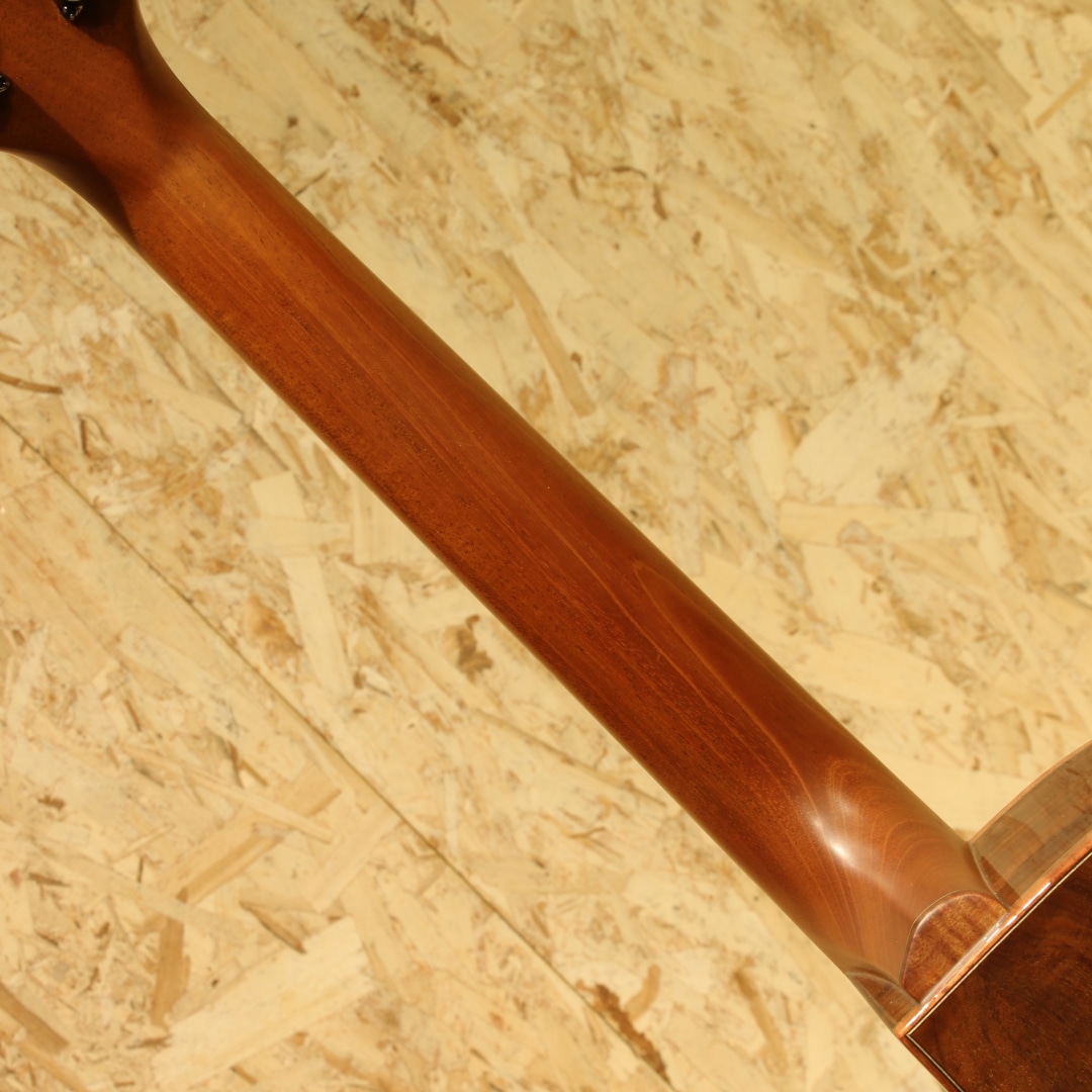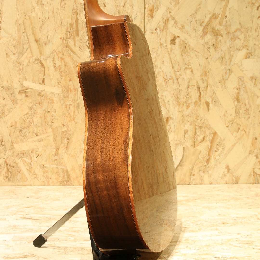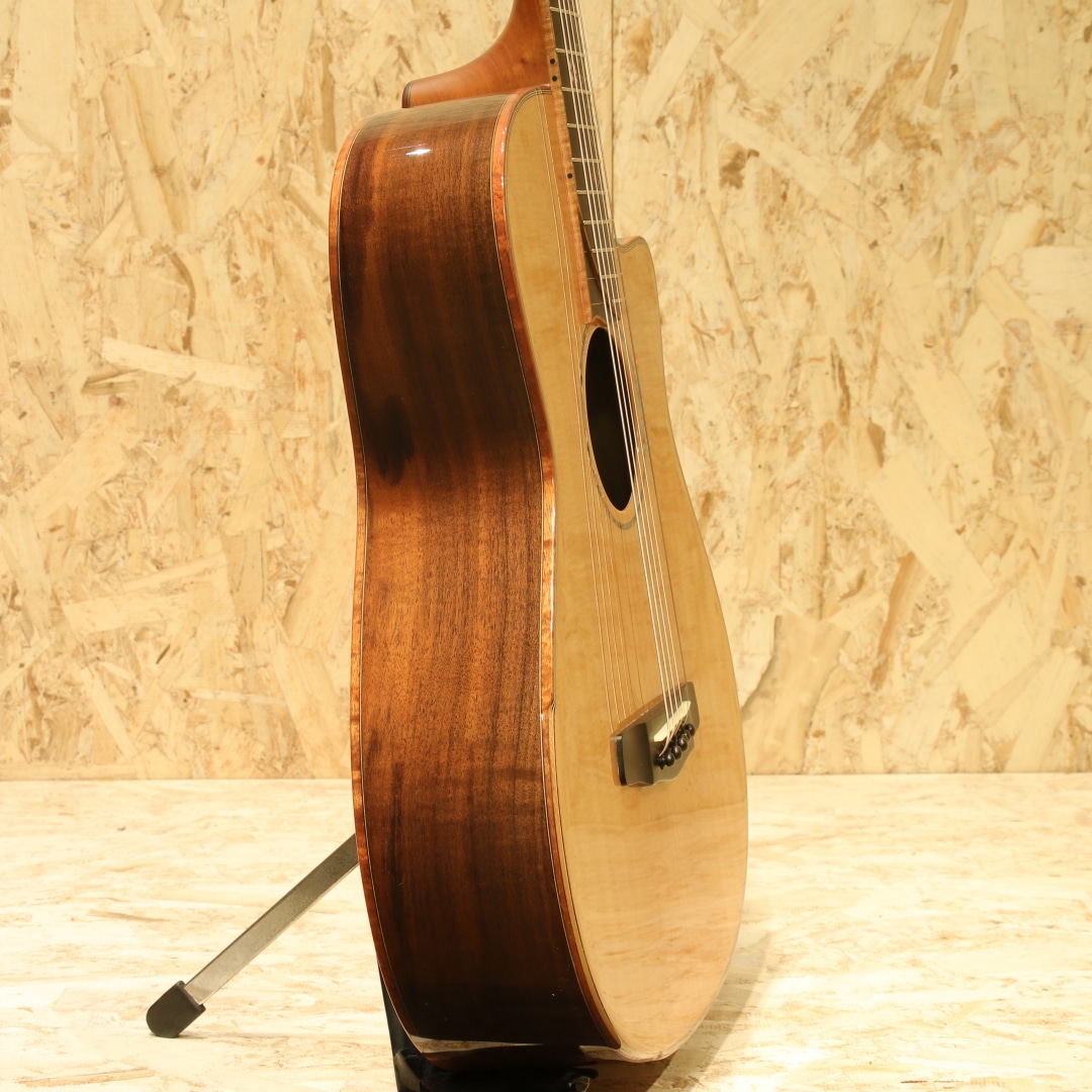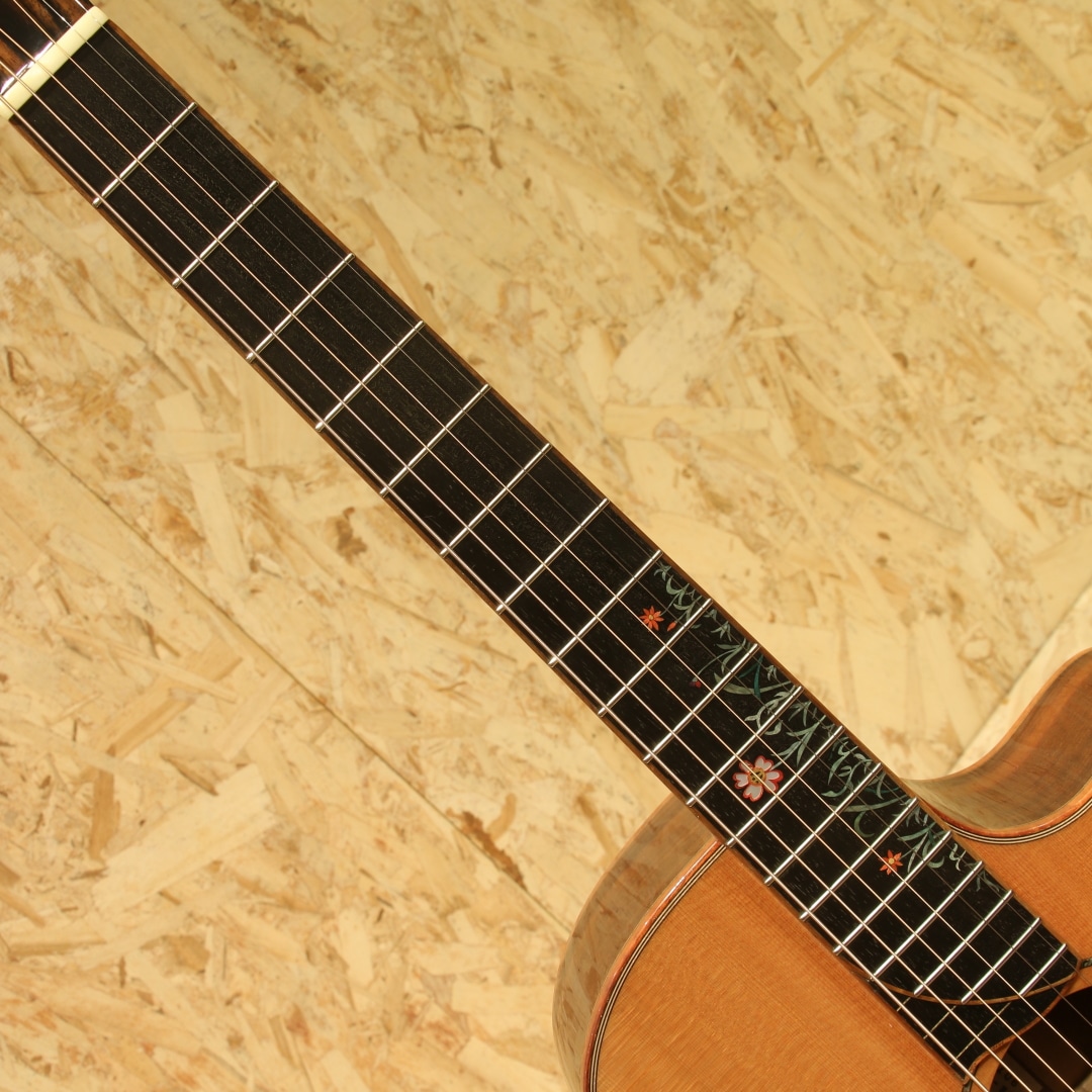 某国内大手ファクトリーの手工部門を手掛けたのち、独立し長野県の工房にておよそ25年近くのキャリアを持つルシアー"横山正"氏による”Yokoyama Guitars”。本器は創業当時から存在する定番オリジナルオーディトリアムボディにカッタウェイを搭載、更に小ぶりにした"OAR-SCW"。2020年代製USED品。シトカスプルーストップ、水が流れるような杢目のクラロウォルナットサイド&バック、マホガニーネック、エボニー指板&ブリッジ、ゴトー製510ブラックペグ(エボニーノブ)、アバロンロゼッタ、ロゼッタにはウッドを細工した花束のインレイ、コアバインディング、オリジナルXブレイシング、ベネチアンカッタウェイ。フィンガースタイルで人気を博す横山ギター。木材の質感を活かしたナチュラルな外観、薄く握りやすいグリップ、抱えやすさとサウンドのバランスが取れたボディ。本器は実用性に加えてお洒落な花束、高原に咲く花のようなインレイを加えられた1本。12Fジョイント仕様でややレンジ感に余裕を感じさせるサウンド。12Fでは届きにくいハイポジションもカッタウェイでスムーズに届きやすくなっています。ウォルナットはややハイに特徴を感じやすい材。すっきりと整った響き、高いところまで伸びやかに抜けていくトーン。特にハイが抜けやすいという点はフィンガースタイルにおいては嬉しいところでしょう。メロディを立たせやすく、それを支えつつも邪魔しないロー。透明感を持ったクリアな響き、弦の輪郭もハッキリ出やすいスッキリシャープな響き。ソロにおいて扱いやすく、やはりフィンガーで好まれることが多いことも頷けます。1弦側指板サイドに触った際気付くかどうかの僅かな凹みが1ヶ所、ボディトップ1弦側ボトム箇所に1cmほどの当てキズが1ヶ所、ボディバック面6弦側のボトム端に僅かな凹み跡が1ヶ所見られるモノの、その他には僅かなクロスでの拭きキズや擦れキズ程と使用感の少ない個体。ネックはストレートな状態、サドル残も充分残した演奏性良好な1本です。大手メーカー勤務経験もあるため手掛けてきた数が非常に多い横山氏。蓄積されてきた経験値は言わずもがな、モーリスはフィンガーピッキング向けのギターを製作している等ノウハウも持っている個人製作家です。完全ハンドメイドの手工系でかつ名のあるルシアーの個体としてもコスパの高い一品。造りと音の美しさをぜひお手元でお確かめ下さい。