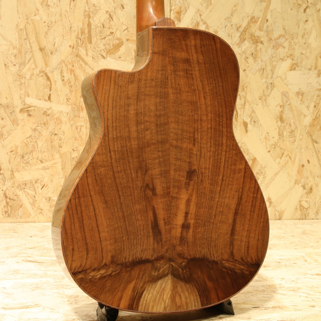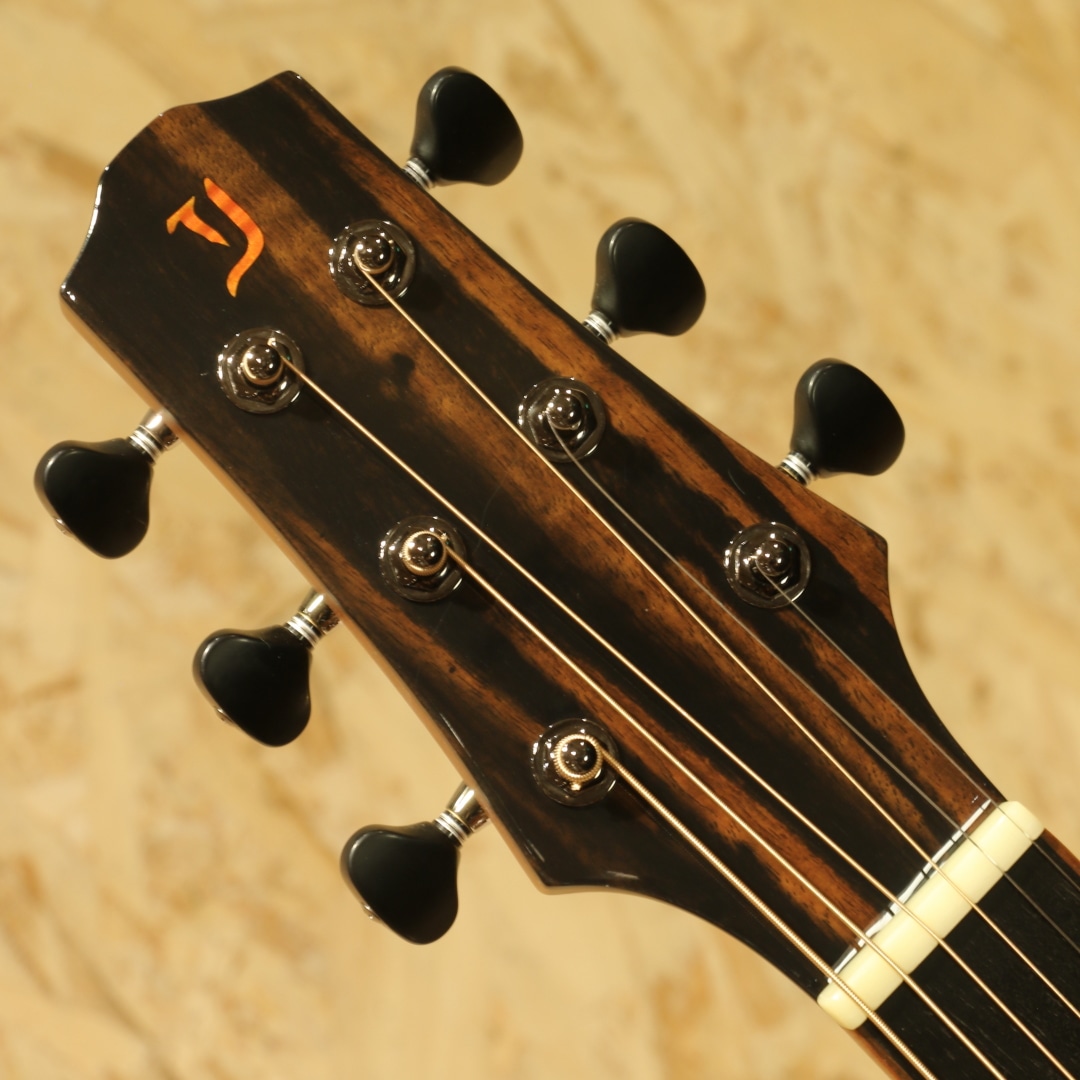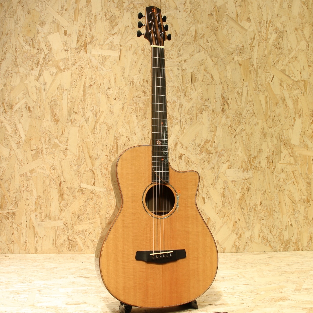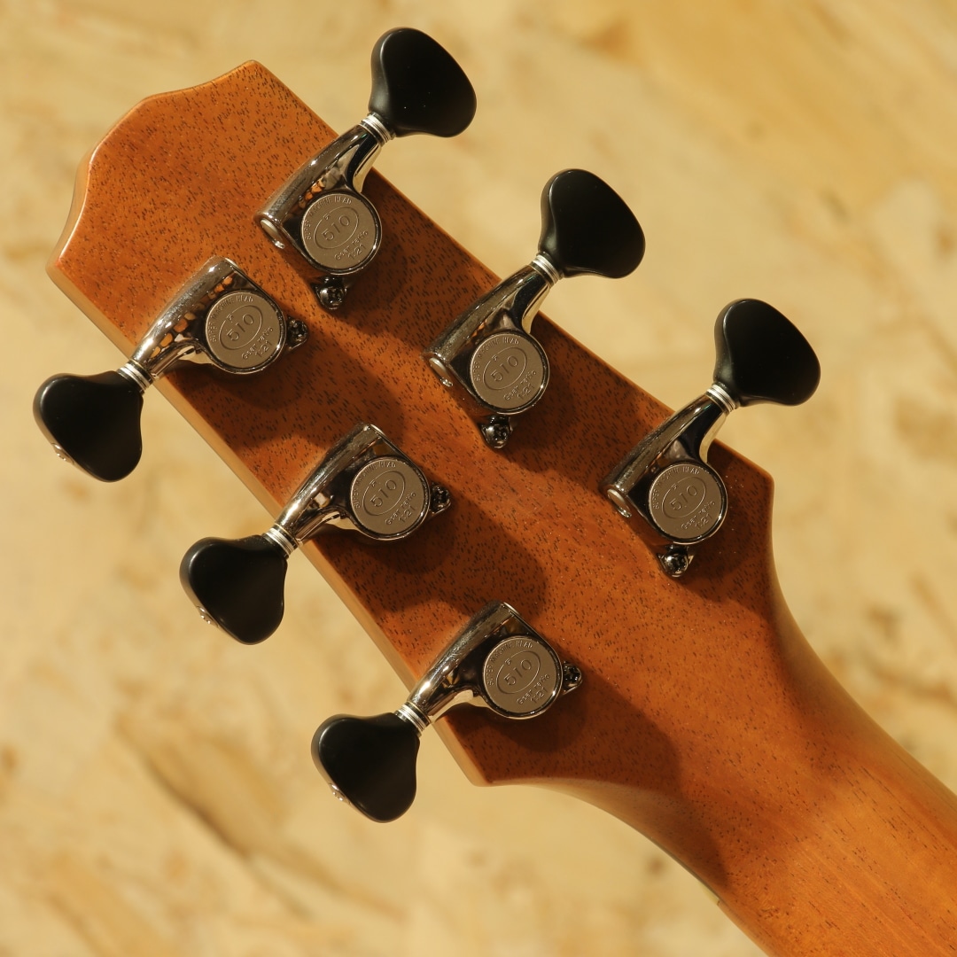 某国内大手ファクトリーの手工部門を手掛けたのち、独立し長野県の工房にておよそ25年近くのキャリアを持つルシアー"横山正"氏による”Yokoyama Guitars”。本器は創業当時から存在する定番オリジナルオーディトリアムボディにカッタウェイを搭載、更に小ぶりにした"OAR-SCW"。2020年代製USED品。シトカスプルーストップ、水が流れるような杢目のクラロウォルナットサイド&バック、マホガニーネック、エボニー指板&ブリッジ、ゴトー製510ブラックペグ(エボニーノブ)、アバロンロゼッタ、ロゼッタにはウッドを細工した花束のインレイ、コアバインディング、オリジナルXブレイシング、ベネチアンカッタウェイ。フィンガースタイルで人気を博す横山ギター。木材の質感を活かしたナチュラルな外観、薄く握りやすいグリップ、抱えやすさとサウンドのバランスが取れたボディ。本器は実用性に加えてお洒落な花束、高原に咲く花のようなインレイを加えられた1本。12Fジョイント仕様でややレンジ感に余裕を感じさせるサウンド。12Fでは届きにくいハイポジションもカッタウェイでスムーズに届きやすくなっています。ウォルナットはややハイに特徴を感じやすい材。すっきりと整った響き、高いところまで伸びやかに抜けていくトーン。特にハイが抜けやすいという点はフィンガースタイルにおいては嬉しいところでしょう。メロディを立たせやすく、それを支えつつも邪魔しないロー。透明感を持ったクリアな響き、弦の輪郭もハッキリ出やすいスッキリシャープな響き。ソロにおいて扱いやすく、やはりフィンガーで好まれることが多いことも頷けます。1弦側指板サイドに触った際気付くかどうかの僅かな凹みが1ヶ所、ボディトップ1弦側ボトム箇所に1cmほどの当てキズが1ヶ所、ボディバック面6弦側のボトム端に僅かな凹み跡が1ヶ所見られるモノの、その他には僅かなクロスでの拭きキズや擦れキズ程と使用感の少ない個体。ネックはストレートな状態、サドル残も充分残した演奏性良好な1本です。大手メーカー勤務経験もあるため手掛けてきた数が非常に多い横山氏。蓄積されてきた経験値は言わずもがな、モーリスはフィンガーピッキング向けのギターを製作している等ノウハウも持っている個人製作家です。完全ハンドメイドの手工系でかつ名のあるルシアーの個体としてもコスパの高い一品。造りと音の美しさをぜひお手元でお確かめ下さい。