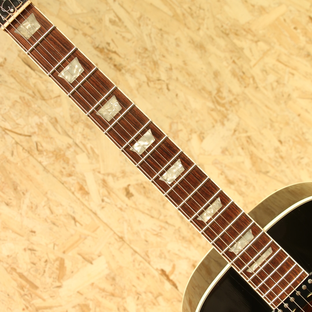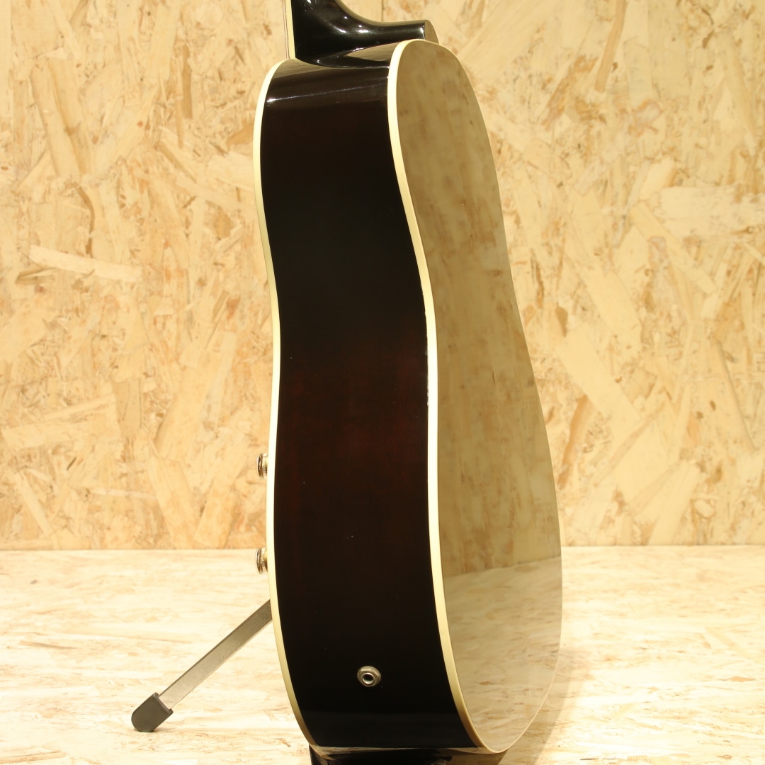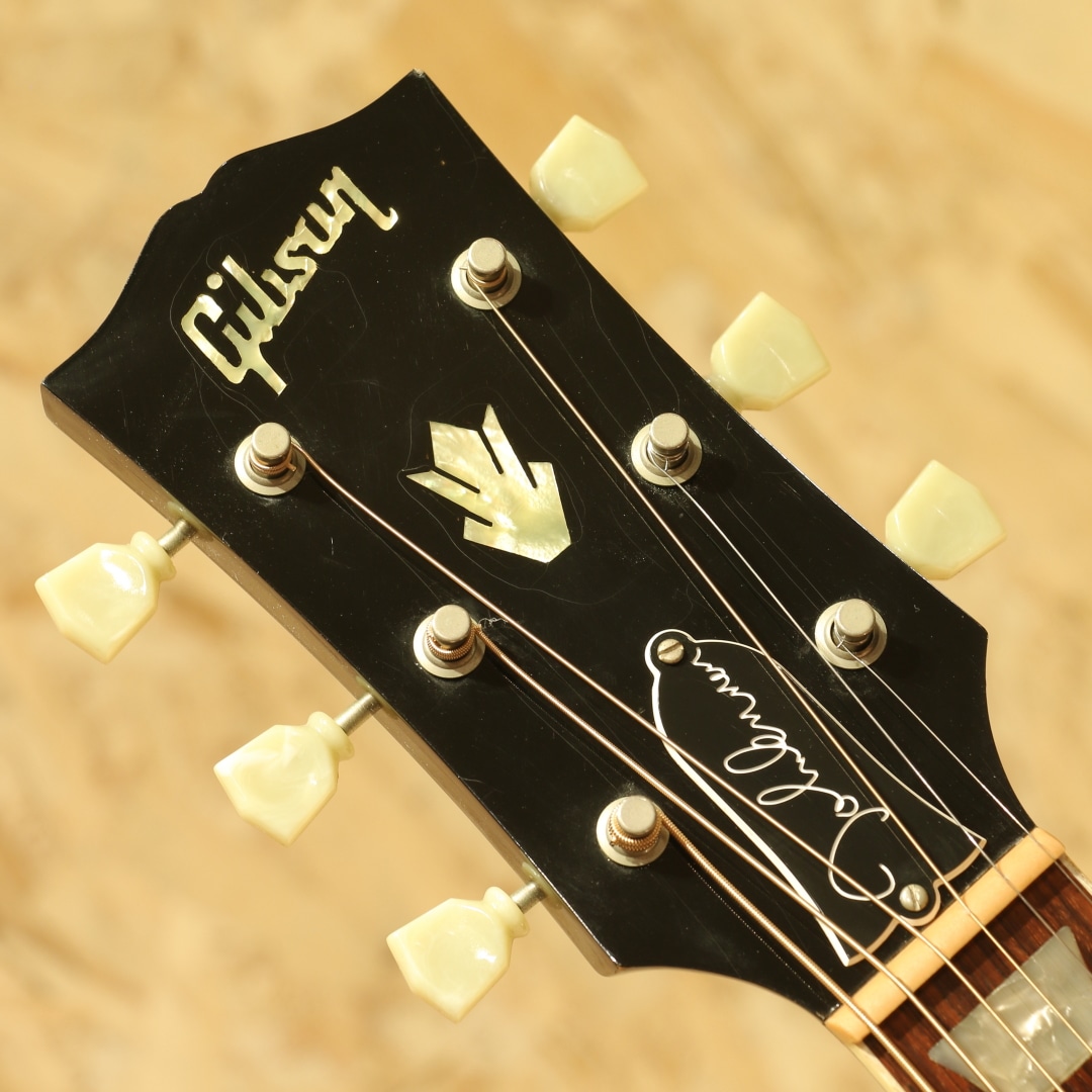 1951年にアンサンブルの中でも音量で負けない様にと発表された世界で始めてピックアップが搭載されたフラットトップ"CF-100E"。その基本コンセプトを受け継いだ"J-160E"は1954年に発表されました。ジョン・レノンとジョージ・ハリスンがお揃いで入手し愛用したギターとしても有名であり、最初に買った1962年製は盗難に遭い1964年製を買いなおして使い続けました。要所要所でロゼッタがダブルリングの1964年製は登場し、色も塗り替えられながらジョンのサウンドの代名詞ともなりディープなファンの心を掴んで止まず絶大な支持を得続けています。本器はジョンレノンの生誕60周年を記念して製作が行われた2000年製のUSED品。スプルーストップ、マホガニーサイド&バック、マホガニーネック、ローズウッド指板&ブリッジ、ダブルラインキーストーンボタンペグ、べっこう柄ピックガード、コントロールハットノブ、P-90ピックアップ搭載、ADJサドル、15フレットジョイント、ラダーブレイシング仕様。近年の復刻モデルではノーマルスロットサドル、Xブレイシング、トップ単板の仕様が見られますが、本器はジョンの名前を冠するだけに当時のスペックに近づけた1本。J-160E自体発売年の1954年のみトップは単板でしたが、ハウリング対策の為にすぐに合板のトップへ。現在では馴染みのあるADJサドルも本モデルが初めて採用した歴史を持ちます。そして特徴的とも言えるサウンドの一因としてはラダーブレイシングが挙げられるでしょう。梯子状に配置された簡易的なブレイシング、Xブレイシングと比べ強度が低いことから廉価モデルで採用されることも多い構造ですが特有のサウンドを生み出してくれます。やや暴れるような粗めのサウンド、レンジ感は狭くややローミッドに寄ったトーン、独特のガランとした響き。ADJサドルの効果で弦とボディの音がセパレートされたようなガッシャガッシャとしたパーカッシブな響き、ローファイなサウンドは唯一無二です。ピックアップにはお馴染みのマグネットピックアップP-90を搭載。シングルコイルの為若干ノイジーですが、その分高域を出しやすくアコースティック感はP-100より強い印象。マグネットの為特有のサウンドこそありますが、これでこそJ-160Eと言えるでしょう。トップ面の1vol.1toneのコントロールノブで扱いも容易、バンド編成やアコースティックバンドでもしっかりと存在感を放ちます。ピックアップバランスの事を考えるとエレキのニッケル弦がオススメ、生音のアコースティック感を優先するのであればアコギ弦をオススメ致します。ネック裏1F付近にはやや大きめの当てキズ、その横にも僅かな当てキズが見られます。その他にもラダーブレイシングの為トップの膨らみとそれに伴って若干のブリッジ傾きこそ見られますが、ADJサドルの上下幅は確保され弦高調整もしやすい状態。細やかなウェザーチェックが入っており貫禄の付いている個体です。ネック周りの演奏性は整えられ抜群の状態、トラスロッド残りもあり、まだまだ活躍の見込める1本です。近年ではあまり作られていないJ-160E、ジョンが使っていた時期のスペックに近いものは更に少なくなります。ジョンの名前を冠した160E、ファンの方は是非お手元にいかがでしょうか。