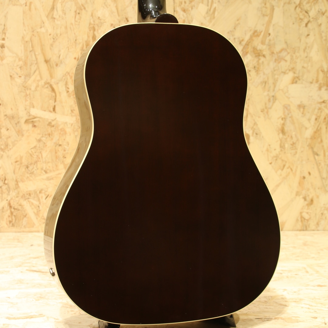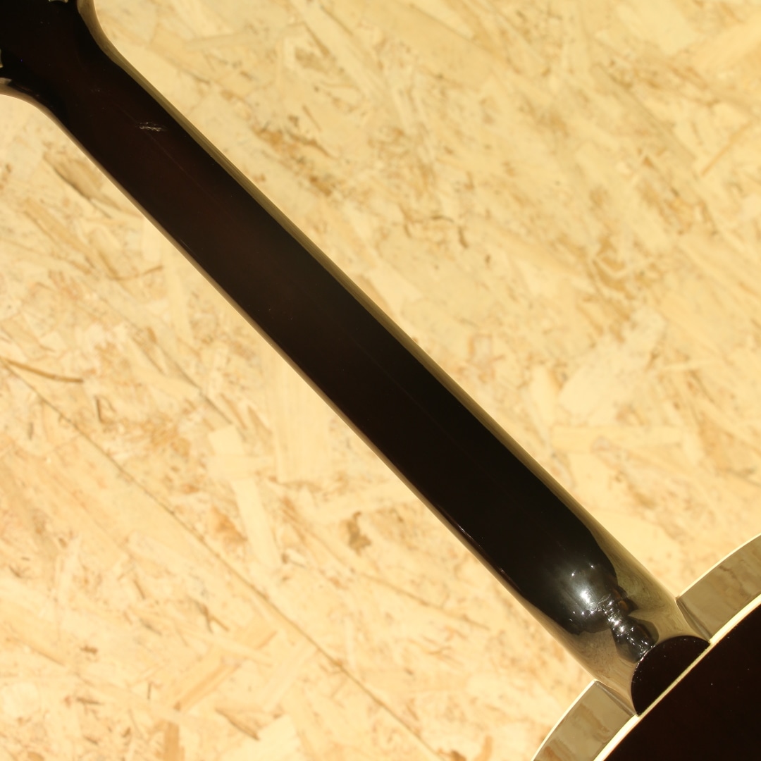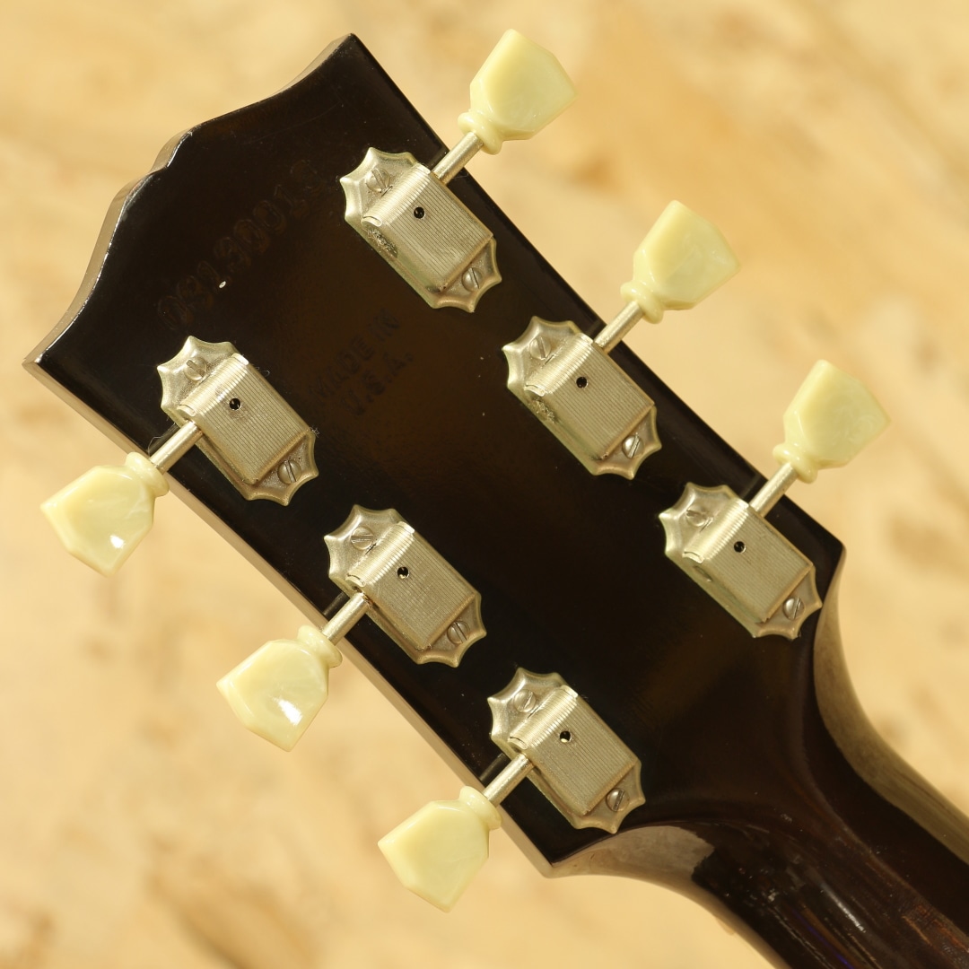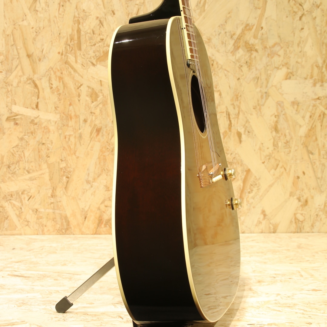 1951年にアンサンブルの中でも音量で負けない様にと発表された世界で始めてピックアップが搭載されたフラットトップ"CF-100E"。その基本コンセプトを受け継いだ"J-160E"は1954年に発表されました。ジョン・レノンとジョージ・ハリスンがお揃いで入手し愛用したギターとしても有名であり、最初に買った1962年製は盗難に遭い1964年製を買いなおして使い続けました。要所要所でロゼッタがダブルリングの1964年製は登場し、色も塗り替えられながらジョンのサウンドの代名詞ともなりディープなファンの心を掴んで止まず絶大な支持を得続けています。本器はジョンレノンの生誕60周年を記念して製作が行われた2000年製のUSED品。スプルーストップ、マホガニーサイド&バック、マホガニーネック、ローズウッド指板&ブリッジ、ダブルラインキーストーンボタンペグ、べっこう柄ピックガード、コントロールハットノブ、P-90ピックアップ搭載、ADJサドル、15フレットジョイント、ラダーブレイシング仕様。近年の復刻モデルではノーマルスロットサドル、Xブレイシング、トップ単板の仕様が見られますが、本器はジョンの名前を冠するだけに当時のスペックに近づけた1本。J-160E自体発売年の1954年のみトップは単板でしたが、ハウリング対策の為にすぐに合板のトップへ。現在では馴染みのあるADJサドルも本モデルが初めて採用した歴史を持ちます。そして特徴的とも言えるサウンドの一因としてはラダーブレイシングが挙げられるでしょう。梯子状に配置された簡易的なブレイシング、Xブレイシングと比べ強度が低いことから廉価モデルで採用されることも多い構造ですが特有のサウンドを生み出してくれます。やや暴れるような粗めのサウンド、レンジ感は狭くややローミッドに寄ったトーン、独特のガランとした響き。ADJサドルの効果で弦とボディの音がセパレートされたようなガッシャガッシャとしたパーカッシブな響き、ローファイなサウンドは唯一無二です。ピックアップにはお馴染みのマグネットピックアップP-90を搭載。シングルコイルの為若干ノイジーですが、その分高域を出しやすくアコースティック感はP-100より強い印象。マグネットの為特有のサウンドこそありますが、これでこそJ-160Eと言えるでしょう。トップ面の1vol.1toneのコントロールノブで扱いも容易、バンド編成やアコースティックバンドでもしっかりと存在感を放ちます。ピックアップバランスの事を考えるとエレキのニッケル弦がオススメ、生音のアコースティック感を優先するのであればアコギ弦をオススメ致します。ネック裏1F付近にはやや大きめの当てキズ、その横にも僅かな当てキズが見られます。その他にもラダーブレイシングの為トップの膨らみとそれに伴って若干のブリッジ傾きこそ見られますが、ADJサドルの上下幅は確保され弦高調整もしやすい状態。細やかなウェザーチェックが入っており貫禄の付いている個体です。ネック周りの演奏性は整えられ抜群の状態、トラスロッド残りもあり、まだまだ活躍の見込める1本です。近年ではあまり作られていないJ-160E、ジョンが使っていた時期のスペックに近いものは更に少なくなります。ジョンの名前を冠した160E、ファンの方は是非お手元にいかがでしょうか。