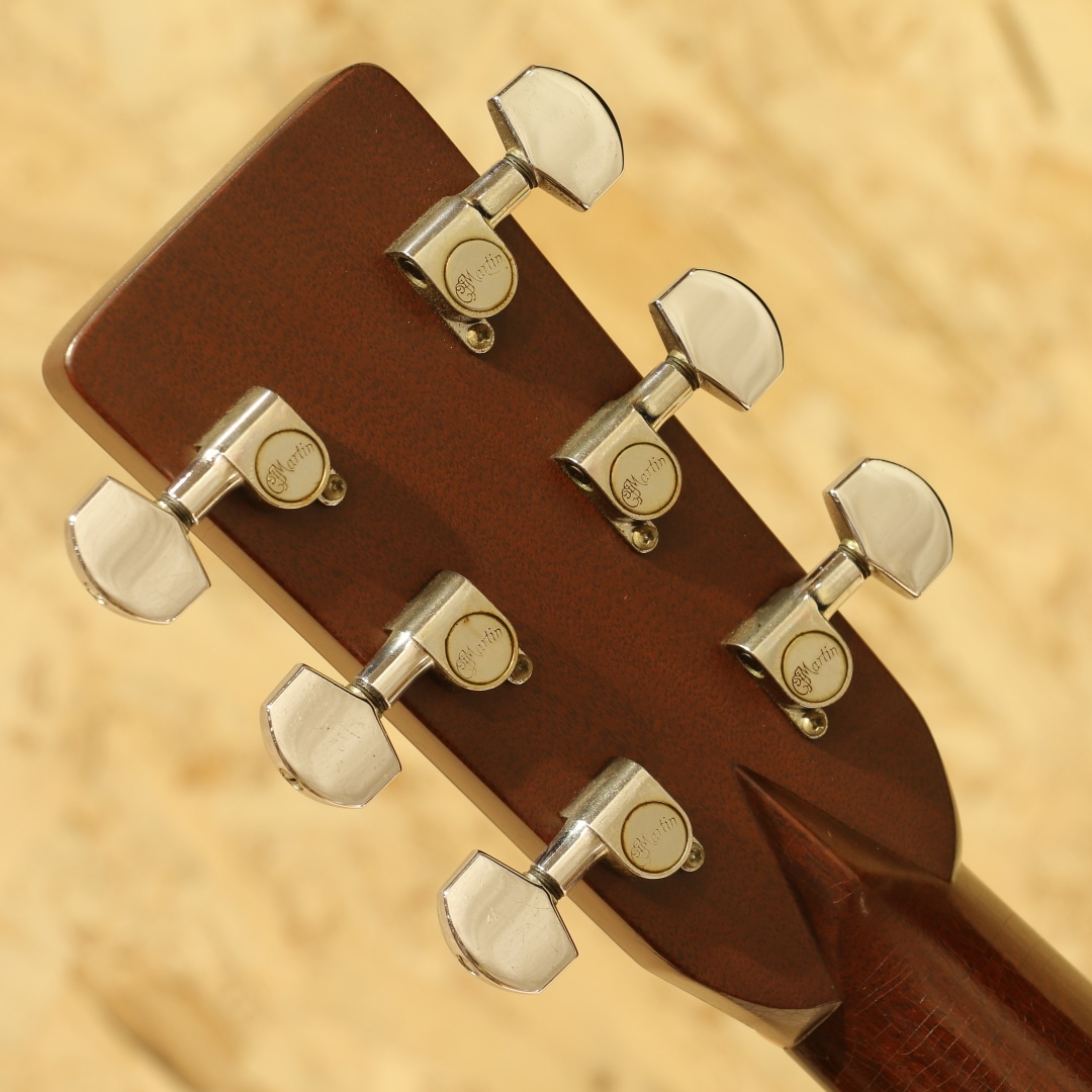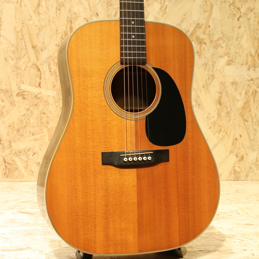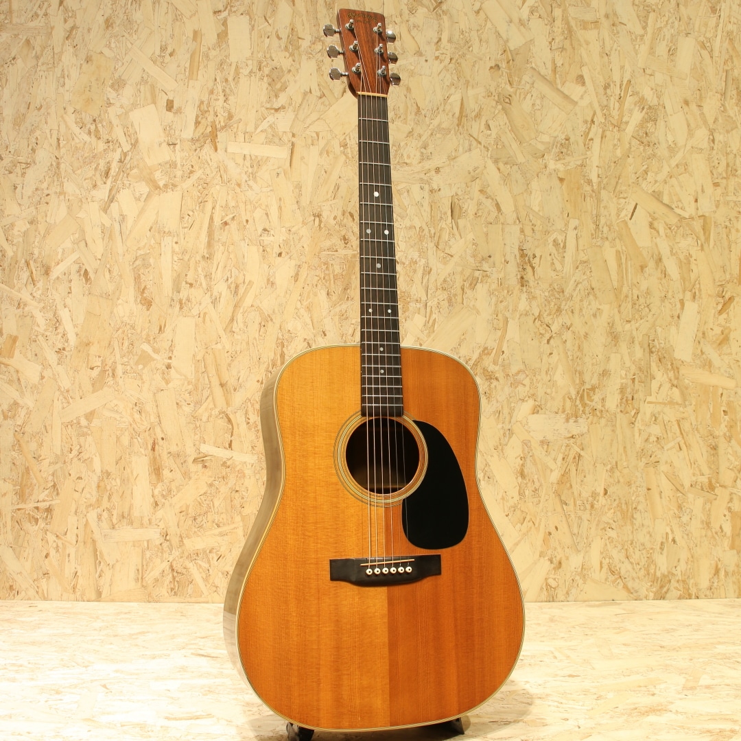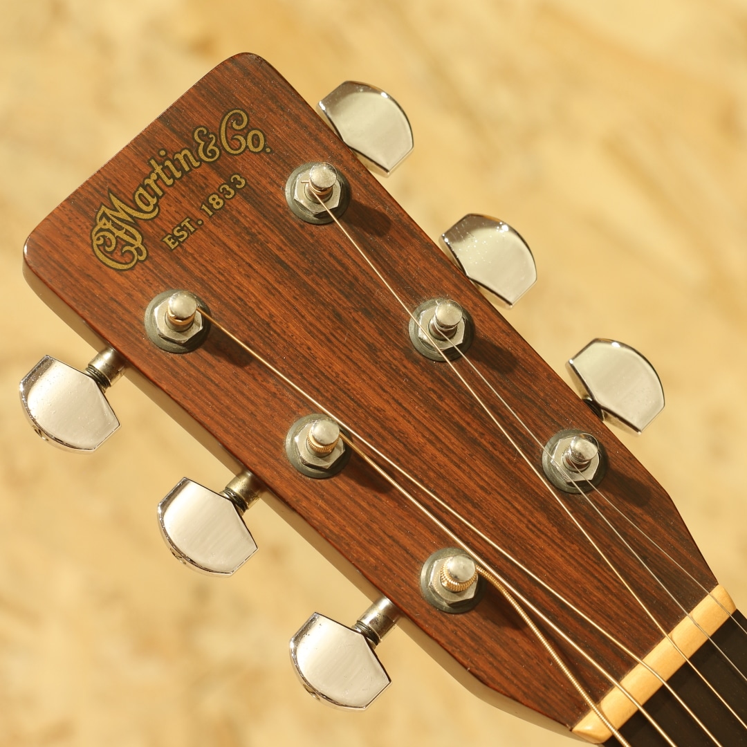 アコースティックギターのワールドスタンダード”D-28”。1960年代のアメリカフォークブームを受け70年代は生産数も多く、日本のフォークブーム時には憧れの的にもなりました。その呼び名に恥じない世界基準であり続けたモデルです。本器は70年代のテイストを色濃く残す1980年製の1本。スプルーストップ、ローズウッドサイドバック、マホガニーネック、スクエアロッド、エボニー指板&ブリッジ、オリジナルミカルタナット&サドル、パールドット指板インレイ、シャーラーロトマチックペグ、ノンスキャロップドXブレイシング。D-28は当時の流行りであったフォークソングに使用されることも多かった為、多くの音源でそのサウンドを聴くことが出来ます。その時期の音楽を聴いていた方はこのサウンドに覚えがある方も多いでしょう。スクエアロッド期特有の太さや甘さのあるサウンド。比重がありコシのある低音、やや甘く伸びやかな高音域。音色のバランスも良く、非常に扱いやすい出音です。ノンスキャロップドXブレイシングの為、強いピッキングにも耐えうる許容の広さや芯のあるサウンドを獲得しています。この太甘な音色や透明感のある煌びやかな音色はこの時期ならではの魅力。現代のネックと比べナット幅が狭い42.9mm仕様、程よく握りやすいネック、その性質上スタイルを問わずにオールマイティに使用できる1本です。ボディーのいくつかやピックガード付近のわずかな打痕、ボディー全体に風合い良く年代相応の焼けや細かいウェザーチェックが入っておりますが年代を考慮してもほとんど使用感はなく、オリジナルフィニッシュの素晴らしいコンディションをキープしています。パーツ類はすべてオリジナルをキープし、マーティンクラックも含めたボディー割れは一切ありません。ネックも美しいストレートをキープしており、弾きやすい状態にセットアップされたほぼパーフェクトなコンディションです。現行品とはまた違ったテイスト、当時のものでしか味わえないサウンド。当時は舶来品で手が届かなかった方も多かったはずです。是非この機会にお手元にいかがでしょうか。オリジナルのブラックハードケースが付属します。