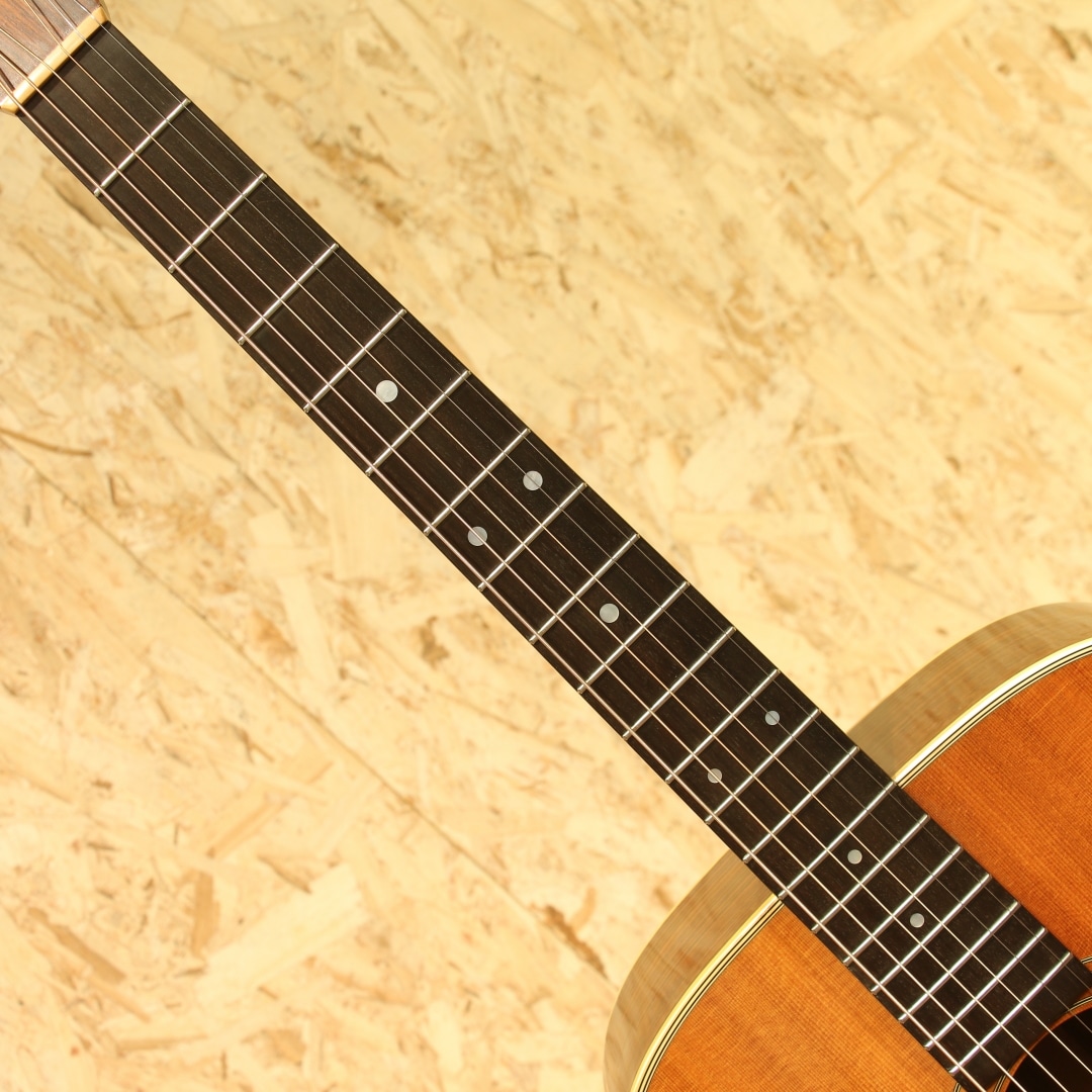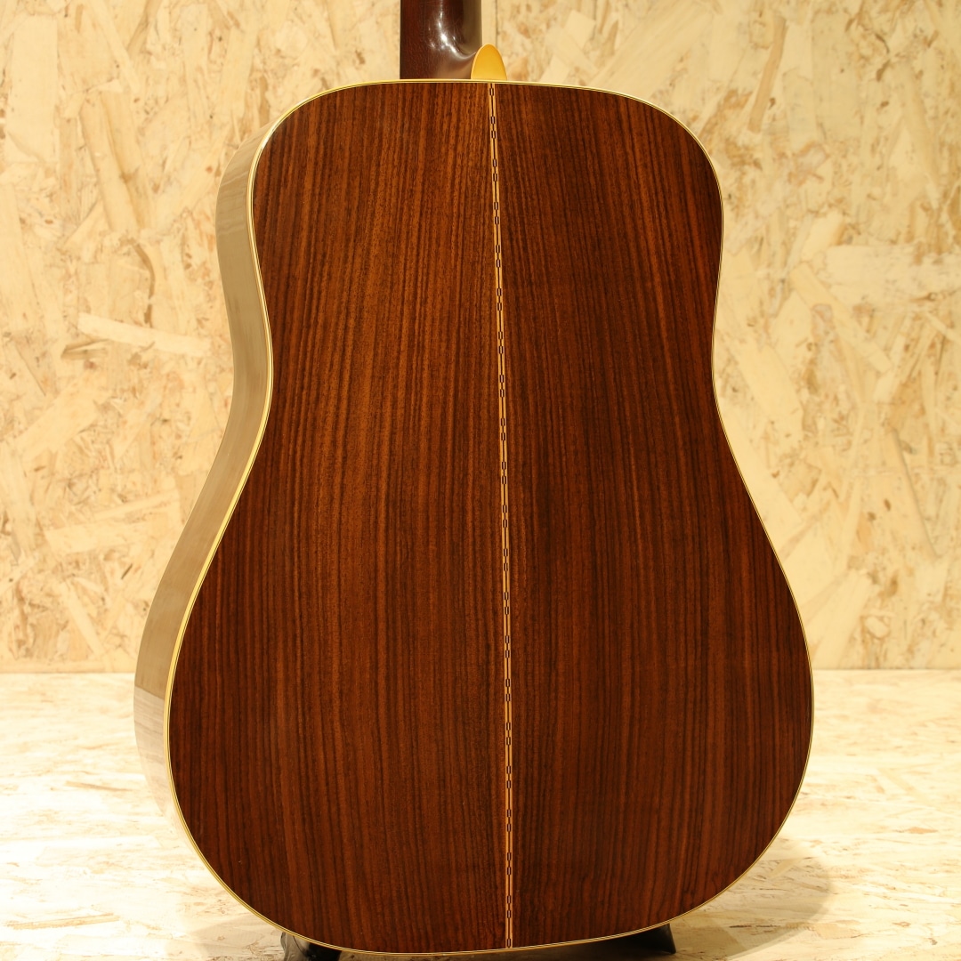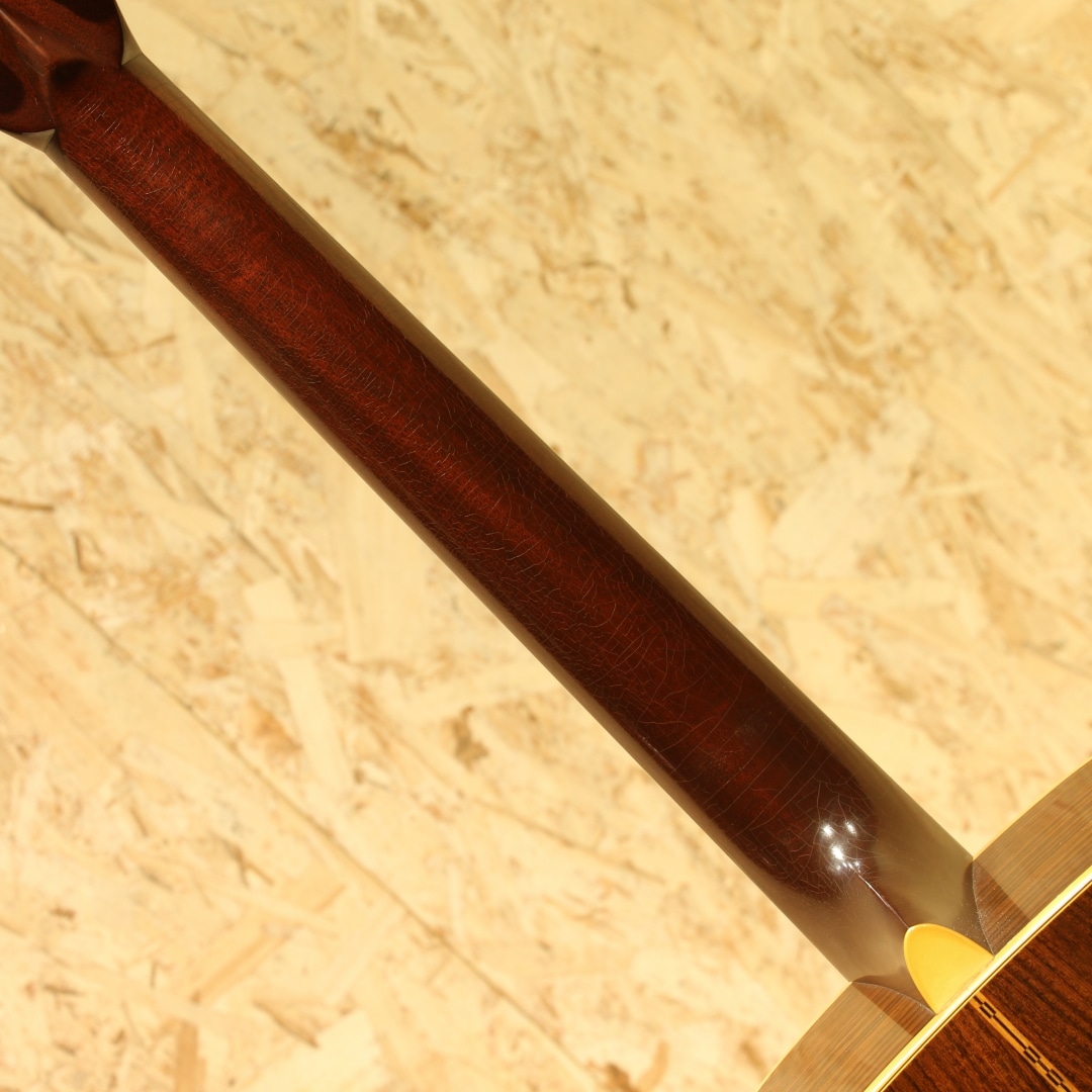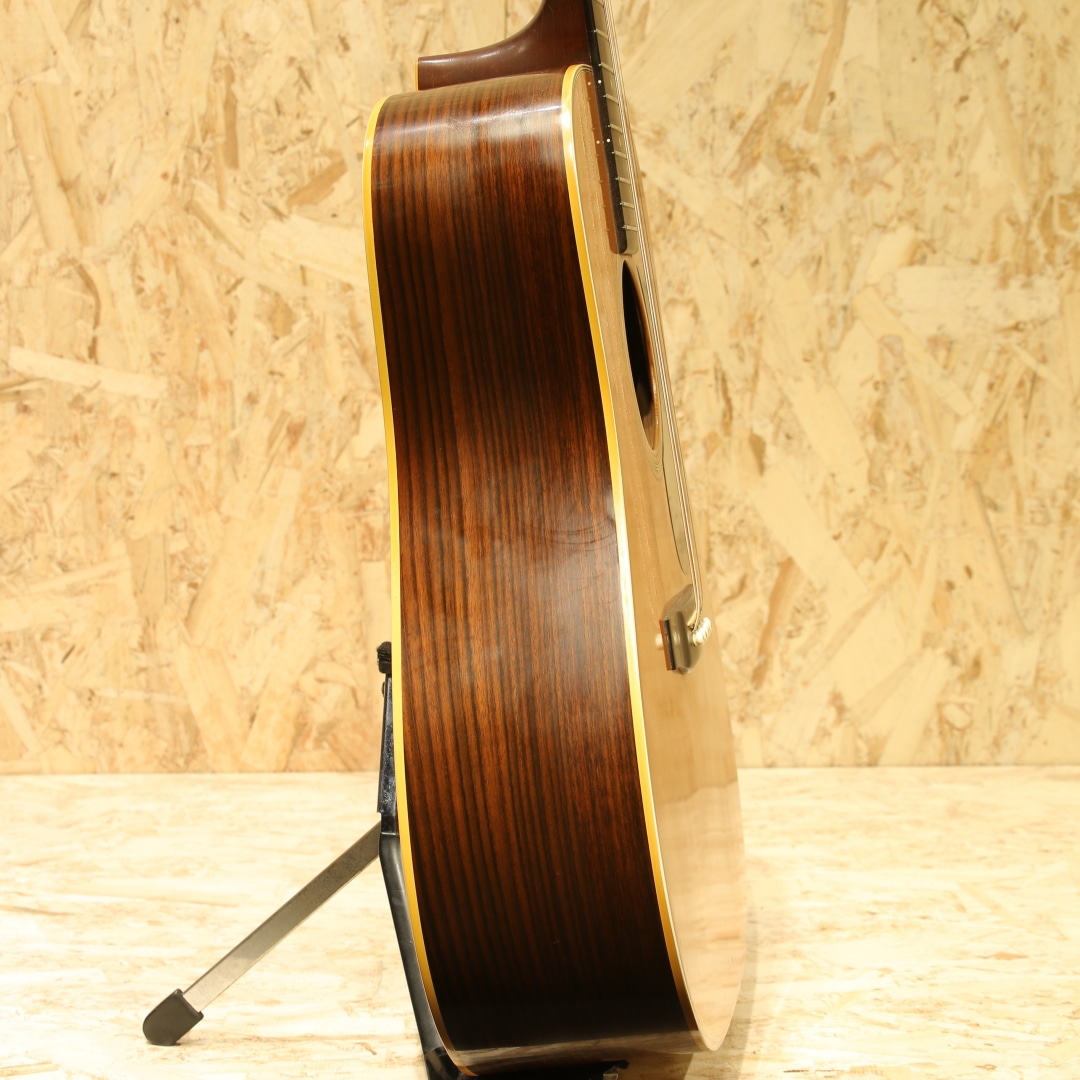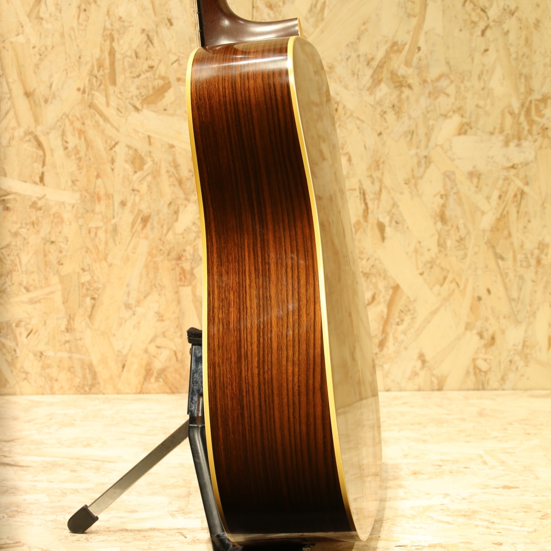 アコースティックギターのワールドスタンダード”D-28”。1960年代のアメリカフォークブームを受け70年代は生産数も多く、日本のフォークブーム時には憧れの的にもなりました。その呼び名に恥じない世界基準であり続けたモデルです。本器は70年代のテイストを色濃く残す1980年製の1本。スプルーストップ、ローズウッドサイドバック、マホガニーネック、スクエアロッド、エボニー指板&ブリッジ、オリジナルミカルタナット&サドル、パールドット指板インレイ、シャーラーロトマチックペグ、ノンスキャロップドXブレイシング。D-28は当時の流行りであったフォークソングに使用されることも多かった為、多くの音源でそのサウンドを聴くことが出来ます。その時期の音楽を聴いていた方はこのサウンドに覚えがある方も多いでしょう。スクエアロッド期特有の太さや甘さのあるサウンド。比重がありコシのある低音、やや甘く伸びやかな高音域。音色のバランスも良く、非常に扱いやすい出音です。ノンスキャロップドXブレイシングの為、強いピッキングにも耐えうる許容の広さや芯のあるサウンドを獲得しています。この太甘な音色や透明感のある煌びやかな音色はこの時期ならではの魅力。現代のネックと比べナット幅が狭い42.9mm仕様、程よく握りやすいネック、その性質上スタイルを問わずにオールマイティに使用できる1本です。ボディーのいくつかやピックガード付近のわずかな打痕、ボディー全体に風合い良く年代相応の焼けや細かいウェザーチェックが入っておりますが年代を考慮してもほとんど使用感はなく、オリジナルフィニッシュの素晴らしいコンディションをキープしています。パーツ類はすべてオリジナルをキープし、マーティンクラックも含めたボディー割れは一切ありません。ネックも美しいストレートをキープしており、弾きやすい状態にセットアップされたほぼパーフェクトなコンディションです。現行品とはまた違ったテイスト、当時のものでしか味わえないサウンド。当時は舶来品で手が届かなかった方も多かったはずです。是非この機会にお手元にいかがでしょうか。オリジナルのブラックハードケースが付属します。