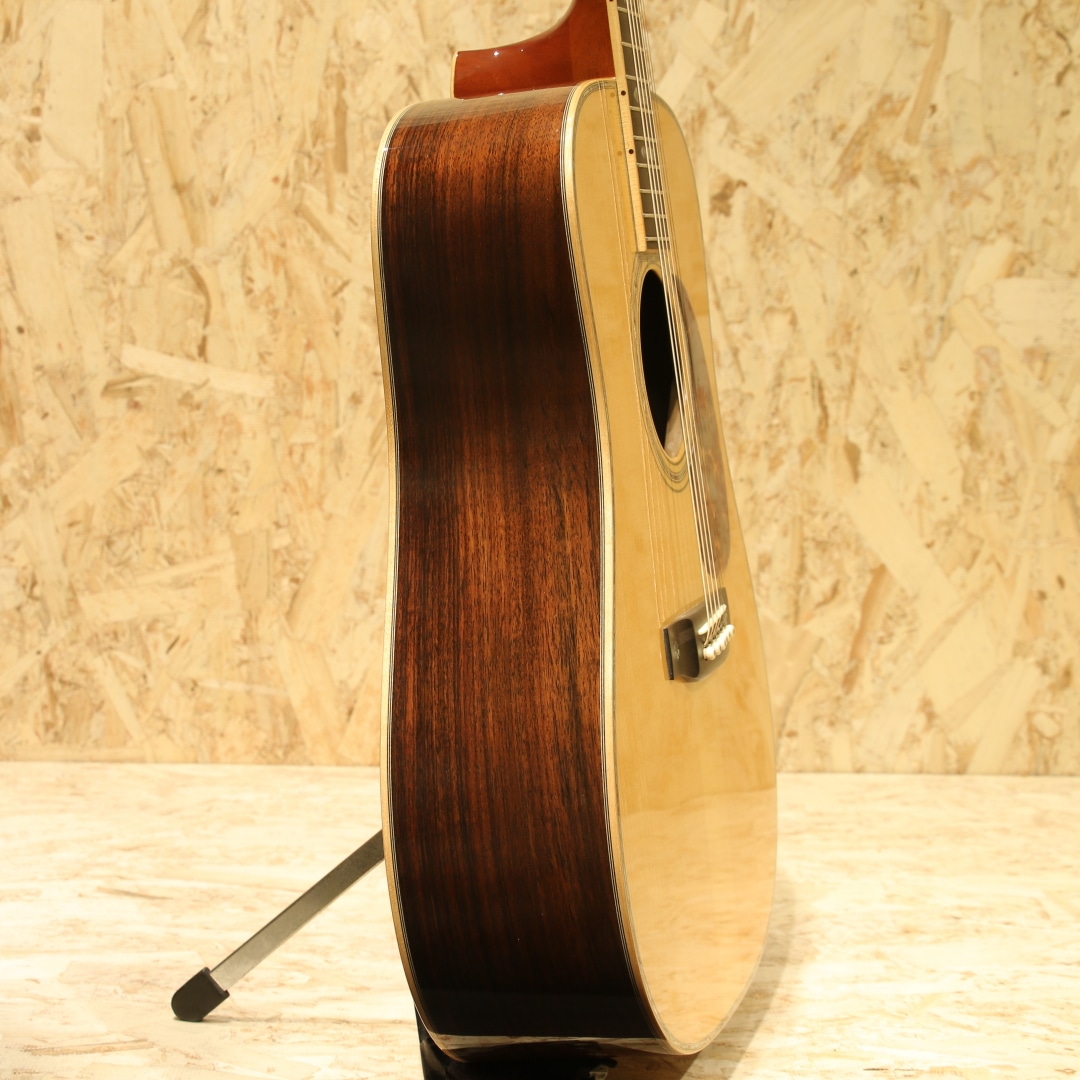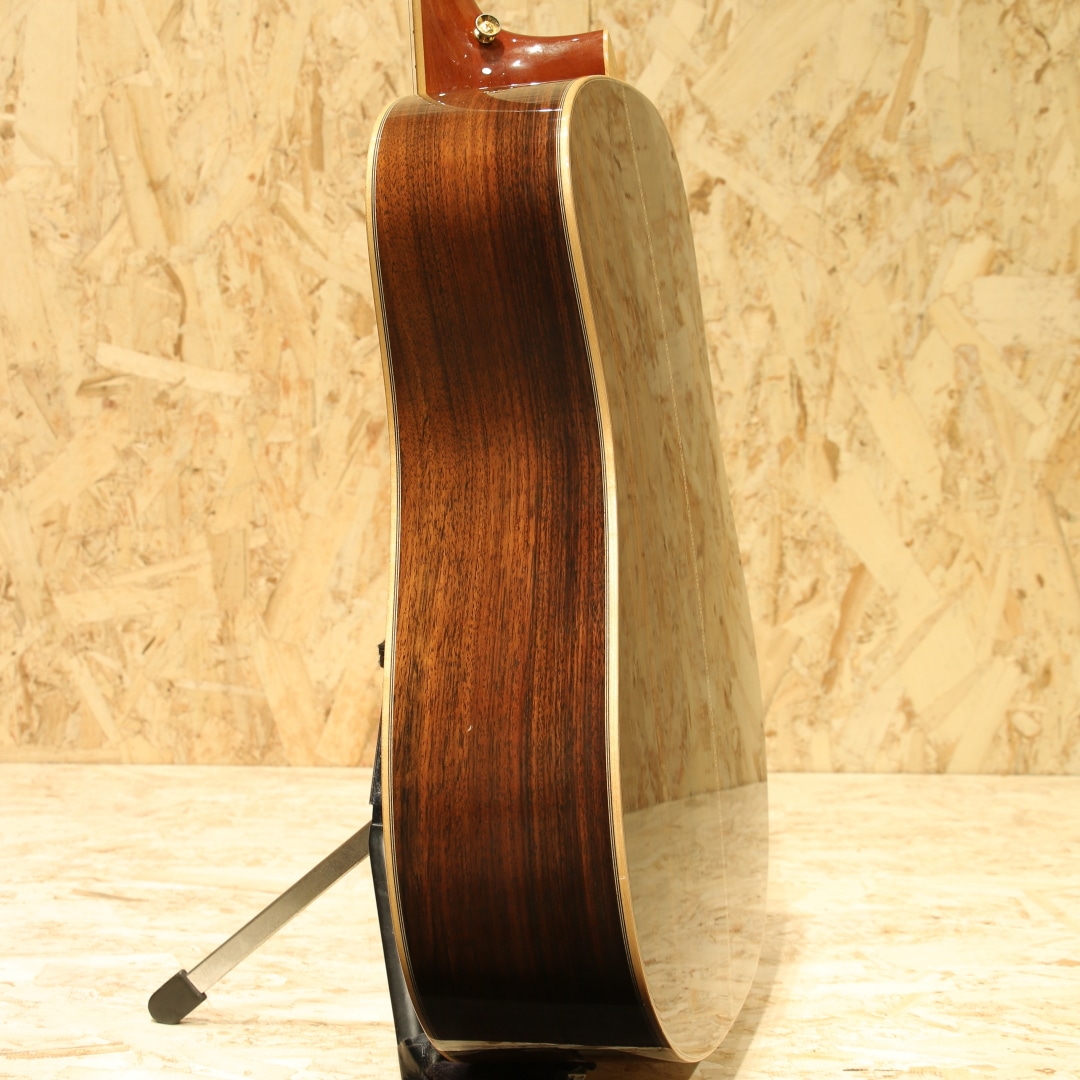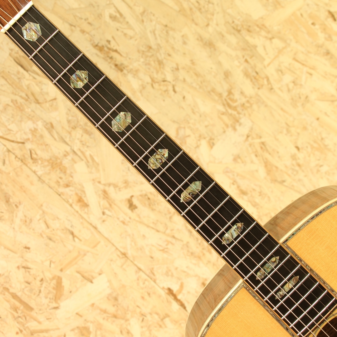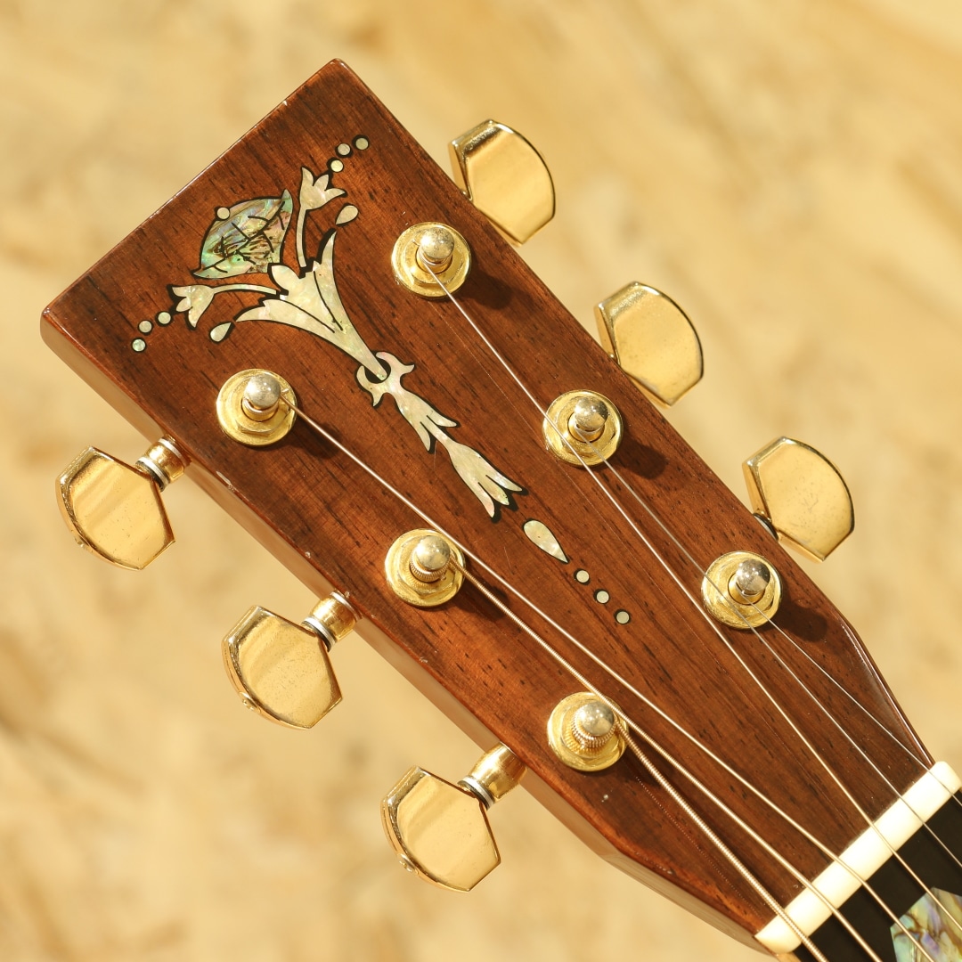 1962年より福岡久留米にてギター製造を行う老舗純国産ギターブランド、アストリアスギター。現在もベテランを中心とした約15名のスタッフで運営しています。本器は定番ドレッドボディの年間限定生産モデル"D.EMBLEM"、2002年製USED品。ジャーマンスプルーストップ、ローズウッドサイド&バック、マホガニーネック、エボニー指板&ブリッジ、ゴトー製ゴールドペグ、アバロントーチインレイ・ヘキサゴン指板インレイ、アバロンパーフリング&ロゼッタ、メイプルバインディング、トーティスピックガード、ノンスキャロップドXブレーシング、オールラッカー仕上げ、ネックヒールストラップピン搭載。指板からヘッド、ボディに至るまで貝細工を散りばめられたゴージャスなルックスは上位機種に劣らない華やかさを持ちます。アストリアスらしい繊細で華麗なトーン、Dサイズが持つ深みのある中低音の相性は良く、サウンドバランスに優れた本器。クリアで伸びやかな高音域はルックスに劣らない絢爛なサウンドを奏でます。弦の輪郭や解像度の高さから細やかなフレーズやニュアンスの表現にも優れています。力強いストロークにもしっかりと対応、明瞭な音像でぼやけることもなく安定したストロークサウンドを奏でます。サイドボトムの打痕や擦り傷など使用感は見られますが表面上のもので使用に影響はありません。ネックコンディションは良好、標準的なセッティングで演奏性も良好です。年間限られた数のみの生産の為、中古市場でも出回りの少ない機種。弊店としても久しぶりの中古品の入荷となります。お手持ちのギターのグレードアップをご検討中の方は是非お試しください。汎用ハードケースが付属します。
