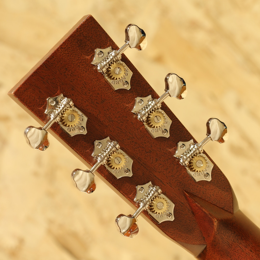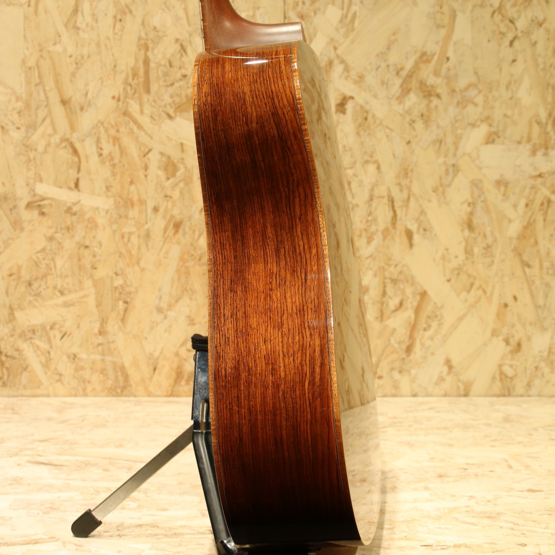 現マーチン工場の中でも、卓越した技術と豊富な経験から至極のギターを造り出す"Martin Custom Shop"。レギュラーラインとは全く異なった環境、工程にて製作。工場の一角に専用の区画があり、昔ながらの工法を継承しながらより精度の高い製作を行っています。ラインナップ上最高峰と言えるオーセンティックシリーズの製作をはじめ、高い完成度を誇るカスタムモデルを製造するトップクラスの部門です。本器は弊社スタッフが現地工場へ赴いた際に買い付けてきたカスタム品”CTM D-28 Italian Alpine Spruce Guatemalan Rosewood”。トップにはイタリアンアルパインスプルース、プレミアムグレードのグァテマランローズウッドサイド&バック、ジェニュインマホガニーネック、44.5mmナット幅、モディファイドローオーバルネックシェイプ、ハイパフォーマンスネックテーパー、ブラックエボニー指板&ブリッジ、ロングサドル、アバロンダイアモンドスクエア指板ポジション、フレイムコアバインディング、Style45アバロンロゼッタ、グローバーオープンバックバタービンノブペグ、ベッコウ柄ピックガード、オールドスタイルヘッドロゴ、2wayアジャスタブルロッド、アディロンダックスプルース材を使用したフォワードシフテッドスキャロップドXブレイシング。ディーラーのオーダーモデルでは無く、これまでギターを創ってきた職人たちが企画して創り上げたカスタム品。自分たちが企画しているだけに気合の入り様も異なり、遊び心も垣間見える伸び伸びとした作風も魅力の1本です。古き良きの象徴であるヘリンボーン、アバロンやコアバインディングのモダンさが融合したルックス。歴史の長いマーチン社と今を生きる職人達とが交わっているからこそ生まれたデザインとも言えるハイセンスな1本です。今やお馴染みとなったモディファイドローオーバルネックを採用し、ポジションを問わない演奏性を獲得。更に特筆すべき点はトップとバックのブレイシングにオーセンティックと同じスタイルのブレイシングを採用している点。サイドバックのグァテマランローズウッドも近年オーセンティックで使用されている材のため、D-28 Authentic 1937をベースとしたカスタムとも言えます。トップ材にはイタリアンアルパインスプルースを使用し、よりしなやかで繊細なトーンを。オーセンティック譲りの太いサウンド、そこに柔軟性を持たせた響きが合わさり、艶やか且つ説得力のある音色へと変化しています。ここまでくると得意や不得意を感じさせず、何を弾いても合わせてくれるような対応力を見せ、それをサポートするネック形状も相まり、あらゆるジャンルを弾きこなせそうな個体。一味も二味も違う至極の1本にふさわしいギターです。歴史上の黄金期を再現するオーセンティックとは異なったアプローチですが、その構造を活かしモダンに仕上げられたギター。近年Martinが目指している”古きを訪ねて新しきを知る”スタイルの極致とも言えるD28です。現行Martinの最高峰チームが作り上げる挑戦的な1本。是非お試し下さいませ。