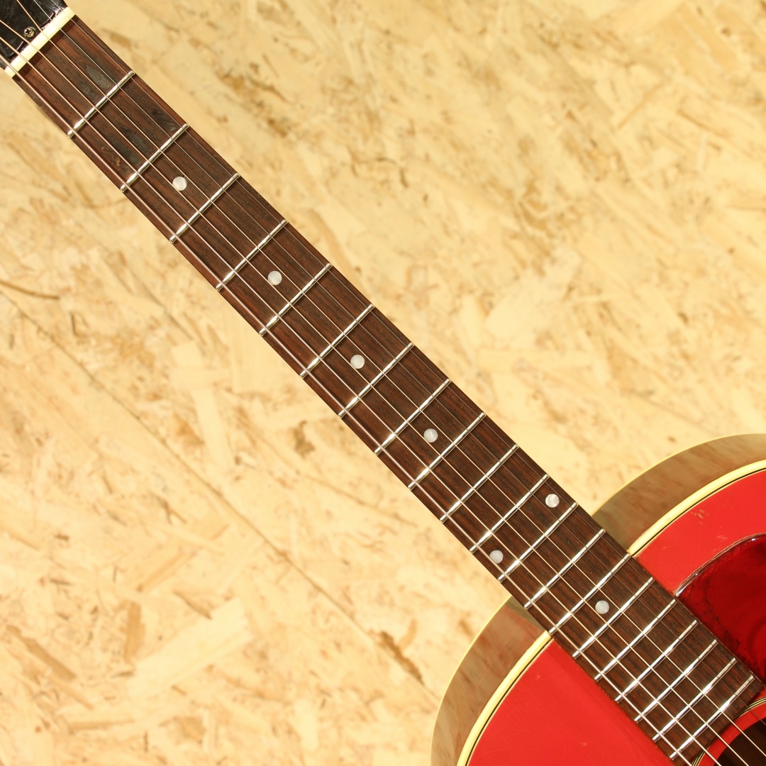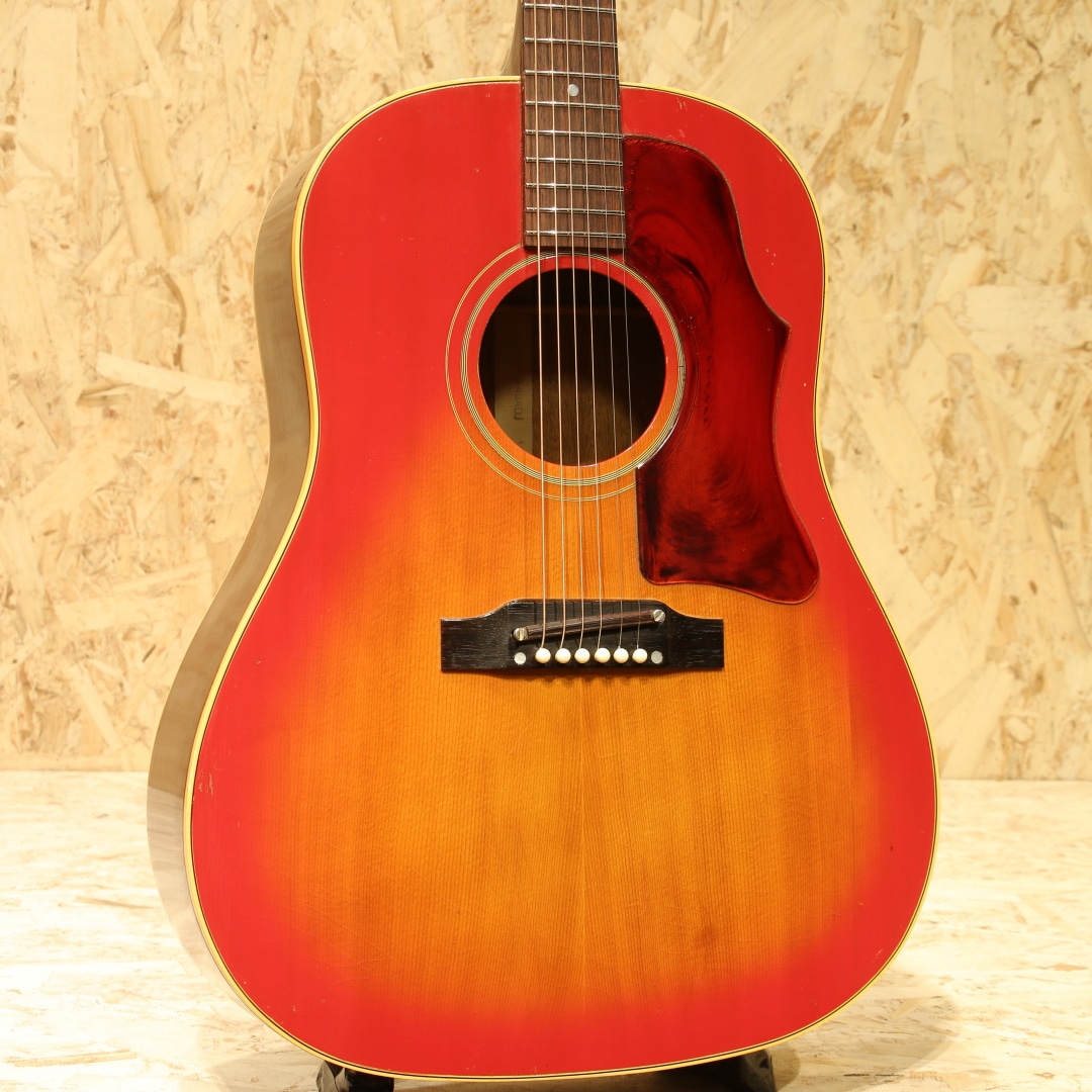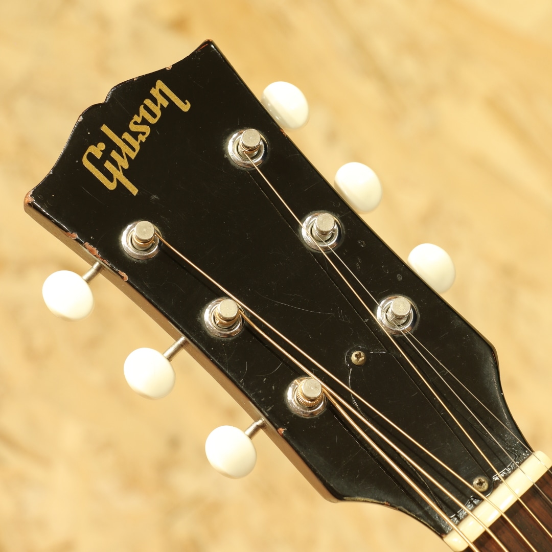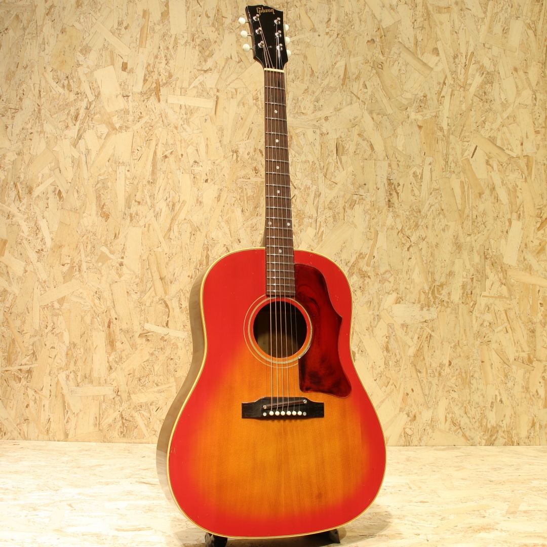 1942年にギブソンが発売を開始した機種J-45、通称ワーキング・ホース。説明不要のギブソンベストセラーモデルです。本器は1966年製の個体。スプルーストップ、マホガニーサイド&バック、マホガニーネック、ハカランダ指板&ブリッジ、指板ドットインレイ、オリジナルベッコウ柄セルラージピックガード、ダブルリングロゼッタ、ノンスキャロップド・エックスブレイシング、ナット幅約39.5ミリナローネック、14度ヘッド角。ネックヒール裏にはストラップピンが装着され、ペグはKlusonタイプ 3par Plate 1ラインのものへリプレイスされています。本器が製作された時期辺りからチェリーサンバーストの風合いが変化。淡いチェリーから赤みの強いチェリーサンバーストへ。60年代中期以降を象徴する厚手のラージガード、ウッドのADJサドルの特徴を持った1本。ナローネック期特有のやや緩くスピーディなタイム感、ウッドサドル特有とも言えるやや丸い甘いサウンド。ガシャッガランとした独特の響きが心地よいです。ブライトでありながら緩いサウンド、サスティンが短くパーカッシブなトーン。カッティング時にはコンプがかったサウンドで、サスティンが短いため手数の多いピッキングでかき鳴らすと特有のジャキジャキとしたサウンドを生み出してくれます。かと思えばフィンガーでは甘く素朴なサウンドを、歌に寄り添うかのような繊細をも持ち合わせています。弊店入荷時にトラスロッド折れの症状が見られた為、信頼できる国内製作家工房にて指板を剥がしトラスロッドの入れ替えを行っております。同時に凹んだ指板の修正、フレットの打ち換え、ナットの製作とネック裏にオーバーラッカーを施し今後もしっかりと弾き込めるようにプレイコンディションに整えられています。ボディバック面の1弦側センターとボトム側に8cmの木部クラック修正跡が見られますがしっかりと接着され使用上問題の無い状態となっています。それらを除くと経年故に細やかな当てキズやボディサイドに若干の塗装負けこそ見られるモノの良い状態をキープ。前述の修理の為トラスロッド残りも非常に多く、ネックもストレートな状態。手入れが入っている為にお買い得プライスですが、しっかりと使っていきたい方にはオススメしたい1本です。今後の使用にも息長く安心度が高いプレイヤーズコンディションの個体。 是非お早めに。