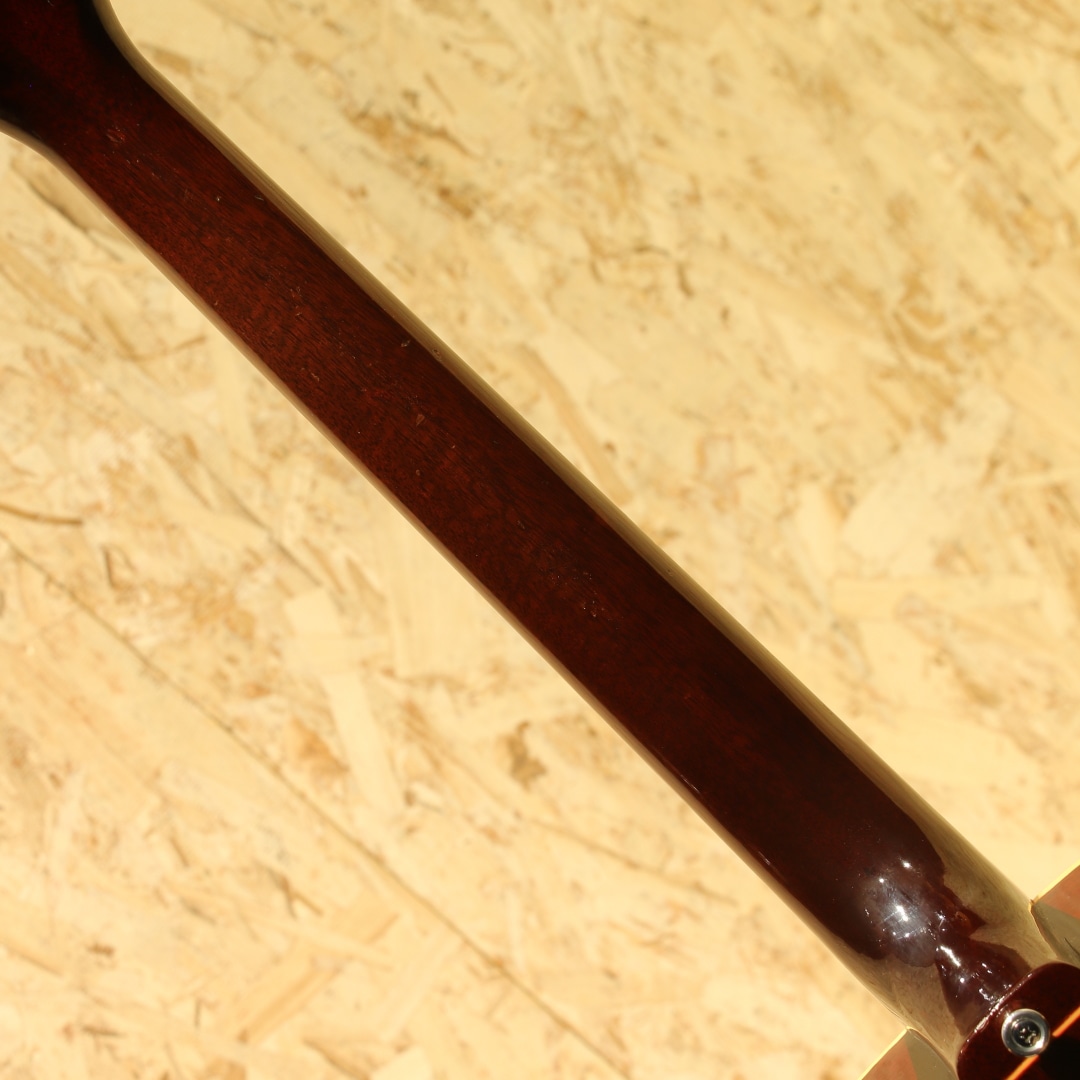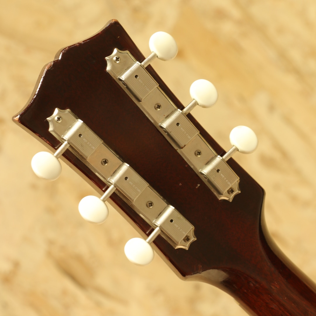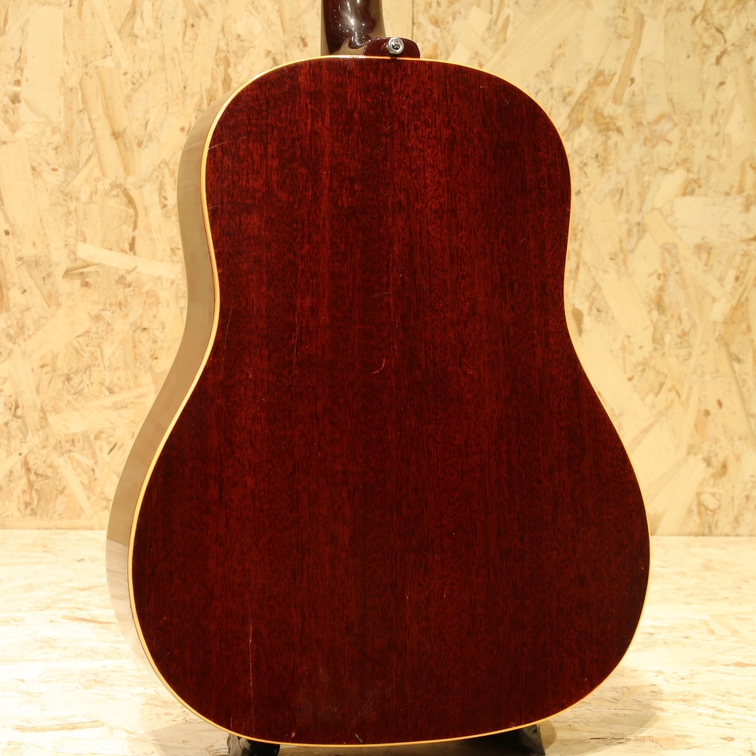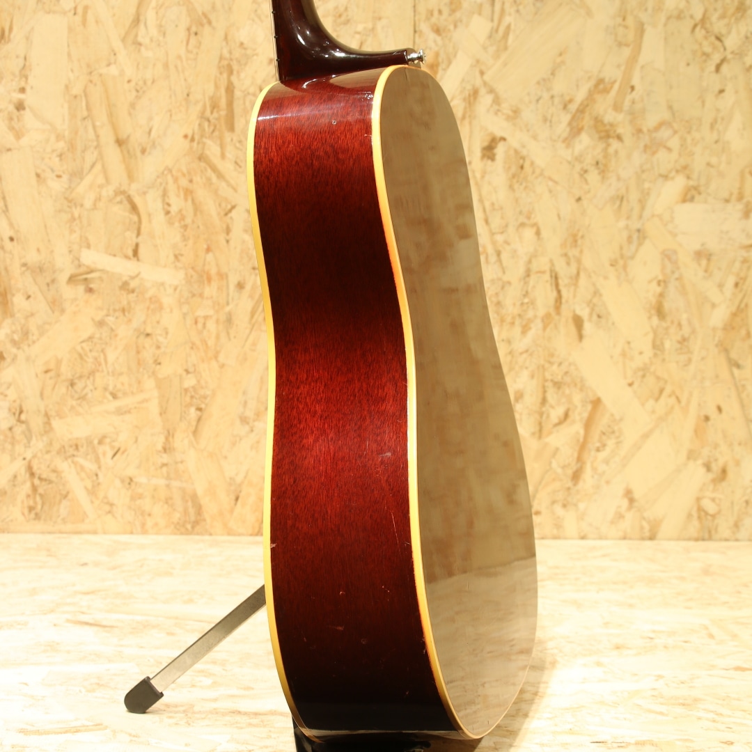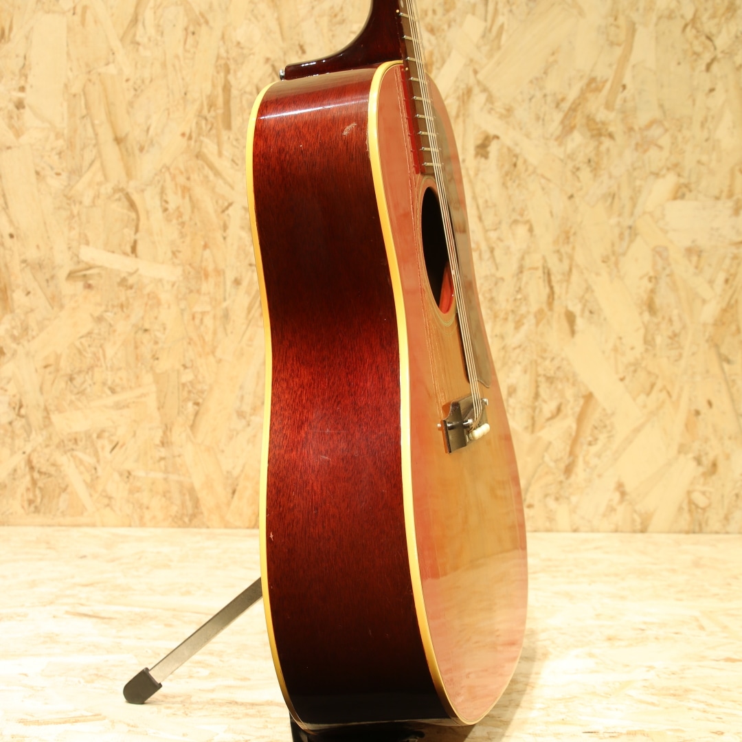 1942年にギブソンが発売を開始した機種J-45、通称ワーキング・ホース。説明不要のギブソンベストセラーモデルです。本器は1966年製の個体。スプルーストップ、マホガニーサイド&バック、マホガニーネック、ハカランダ指板&ブリッジ、指板ドットインレイ、オリジナルベッコウ柄セルラージピックガード、ダブルリングロゼッタ、ノンスキャロップド・エックスブレイシング、ナット幅約39.5ミリナローネック、14度ヘッド角。ネックヒール裏にはストラップピンが装着され、ペグはKlusonタイプ 3par Plate 1ラインのものへリプレイスされています。本器が製作された時期辺りからチェリーサンバーストの風合いが変化。淡いチェリーから赤みの強いチェリーサンバーストへ。60年代中期以降を象徴する厚手のラージガード、ウッドのADJサドルの特徴を持った1本。ナローネック期特有のやや緩くスピーディなタイム感、ウッドサドル特有とも言えるやや丸い甘いサウンド。ガシャッガランとした独特の響きが心地よいです。ブライトでありながら緩いサウンド、サスティンが短くパーカッシブなトーン。カッティング時にはコンプがかったサウンドで、サスティンが短いため手数の多いピッキングでかき鳴らすと特有のジャキジャキとしたサウンドを生み出してくれます。かと思えばフィンガーでは甘く素朴なサウンドを、歌に寄り添うかのような繊細をも持ち合わせています。弊店入荷時にトラスロッド折れの症状が見られた為、信頼できる国内製作家工房にて指板を剥がしトラスロッドの入れ替えを行っております。同時に凹んだ指板の修正、フレットの打ち換え、ナットの製作とネック裏にオーバーラッカーを施し今後もしっかりと弾き込めるようにプレイコンディションに整えられています。ボディバック面の1弦側センターとボトム側に8cmの木部クラック修正跡が見られますがしっかりと接着され使用上問題の無い状態となっています。それらを除くと経年故に細やかな当てキズやボディサイドに若干の塗装負けこそ見られるモノの良い状態をキープ。前述の修理の為トラスロッド残りも非常に多く、ネックもストレートな状態。手入れが入っている為にお買い得プライスですが、しっかりと使っていきたい方にはオススメしたい1本です。今後の使用にも息長く安心度が高いプレイヤーズコンディションの個体。 是非お早めに。