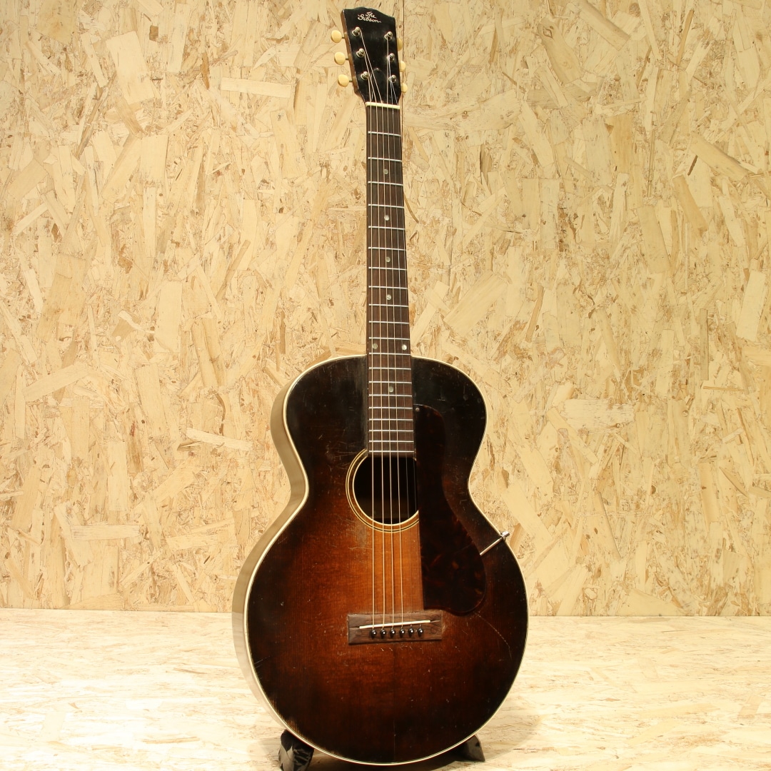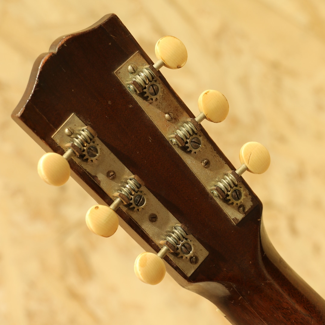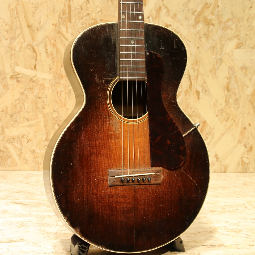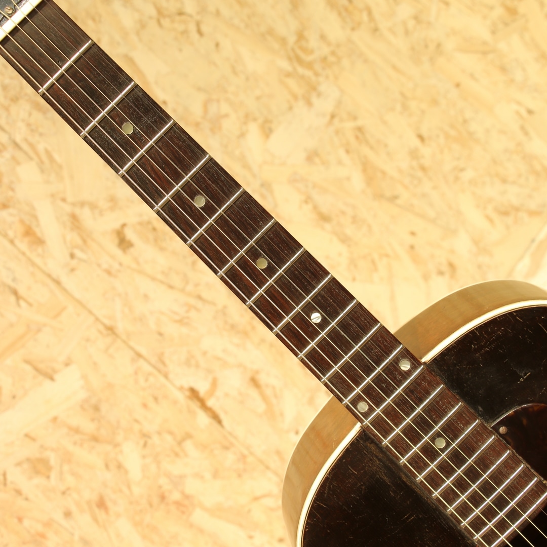 アーチトップモデルとして製造されていたL-1が1926年より元祖ギブソンフラットトップモデルとして登場し1937年に製造を終了、ロバート・ジョンソンが愛用していた事で世界的にもあまりにも有名なブルーズマンの憧れの的がこのオリジナル期のL-1。1926年初期はラウンドバック仕様も存在し、間も無くフラットバックのマホガニーサイドバックに変更。褐色のスプルーストップ、マホガニーサイド&バック、マホガニーネック、エボニー指板は20Fのものにリプレイス、リプレイスブリッジ、3プライロゼッタ、3連オープンペグ、THE GIBSONヘッドロゴ、 ラダーとXのハイブリッド仕様とも言えるAブレイシング、オリジナルアンバーフィニッシュ。バインディング無しの指板、12フレットジョイント仕様。Aブレイシング期独特のサウンドでとても軽やかに音が飛び出します。ミドルハイが優れたサウンドでブルースサウンドの礎を築いたモデルの代表格と言われる所以を肌で感じる事ができます。サウンドはやはりプル気味に弾くブルースならではの奏法に最適で成る可くして成った名器と実感できます。指板が交換されており、通常は19F仕様ですが20F仕様に。ブリッジは独自のレクタングル型のブリッジに交換、一度ネジ止めされたあとがあり、両サイドにネジ穴の埋めた加工跡があります。指板幅とのバランス調整のため、ブリッジピンホールが一度穴埋めされており、やや感覚を狭く開け直し。現在の指板幅に合わせた調整が施されプレイアビリティーは高くなっています。100年近い月日を背負った名器です、表面的な削れやキズなどしっかりと愛用されてきた様子はありますが、奇跡のノンクラック品。過去に行われた数々の手入れはこのギターが気に入って大事に使われてきた証拠で背負ってきたおよそ100年の歴史の新しい一ページを刻む一人になれる事は喜ばしい事でしょう。この年代の個体は市場でも中々お目にかかれません。ぜひご検討ください。汎用ハードケース付属。