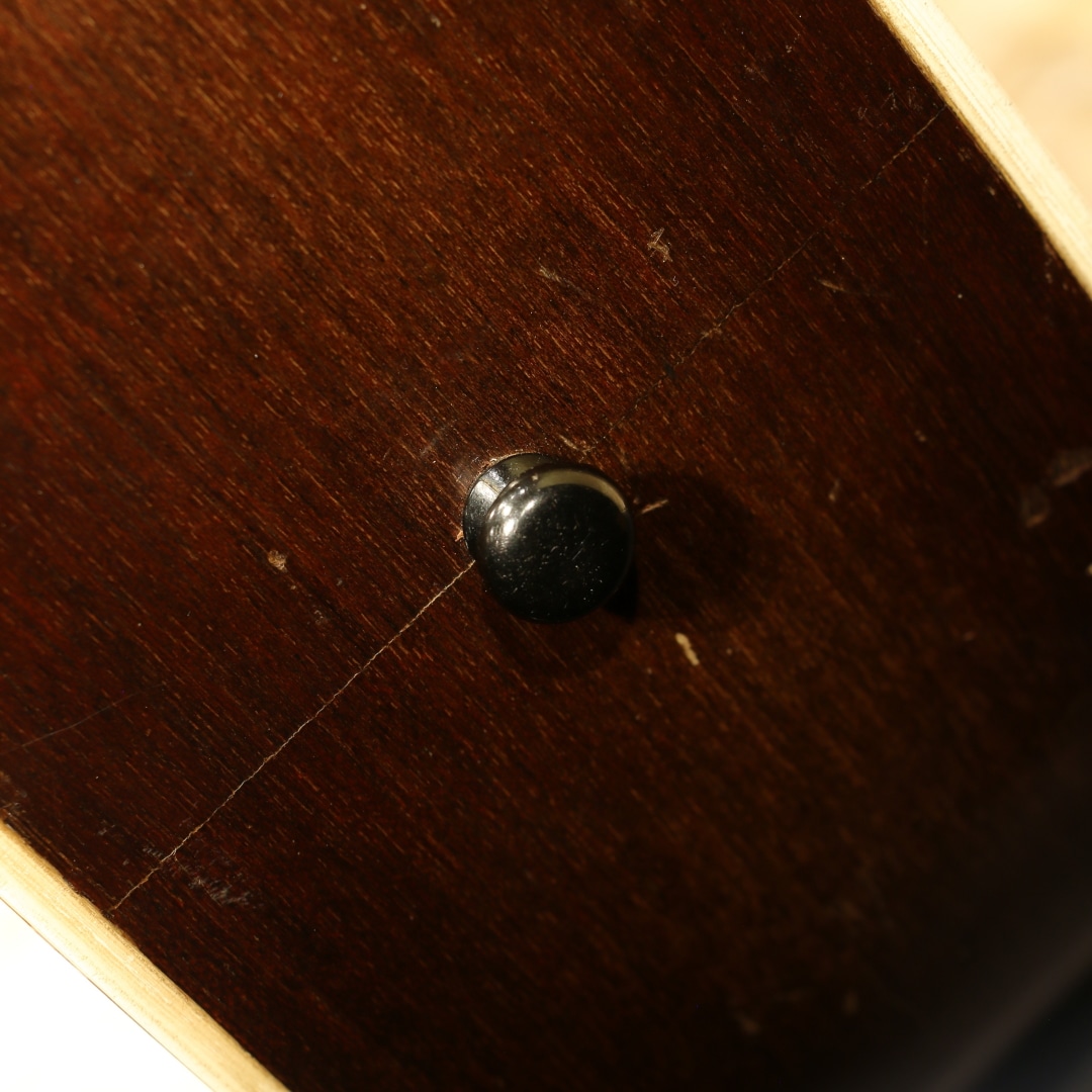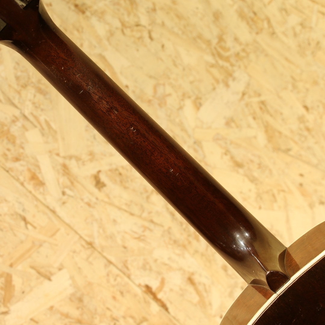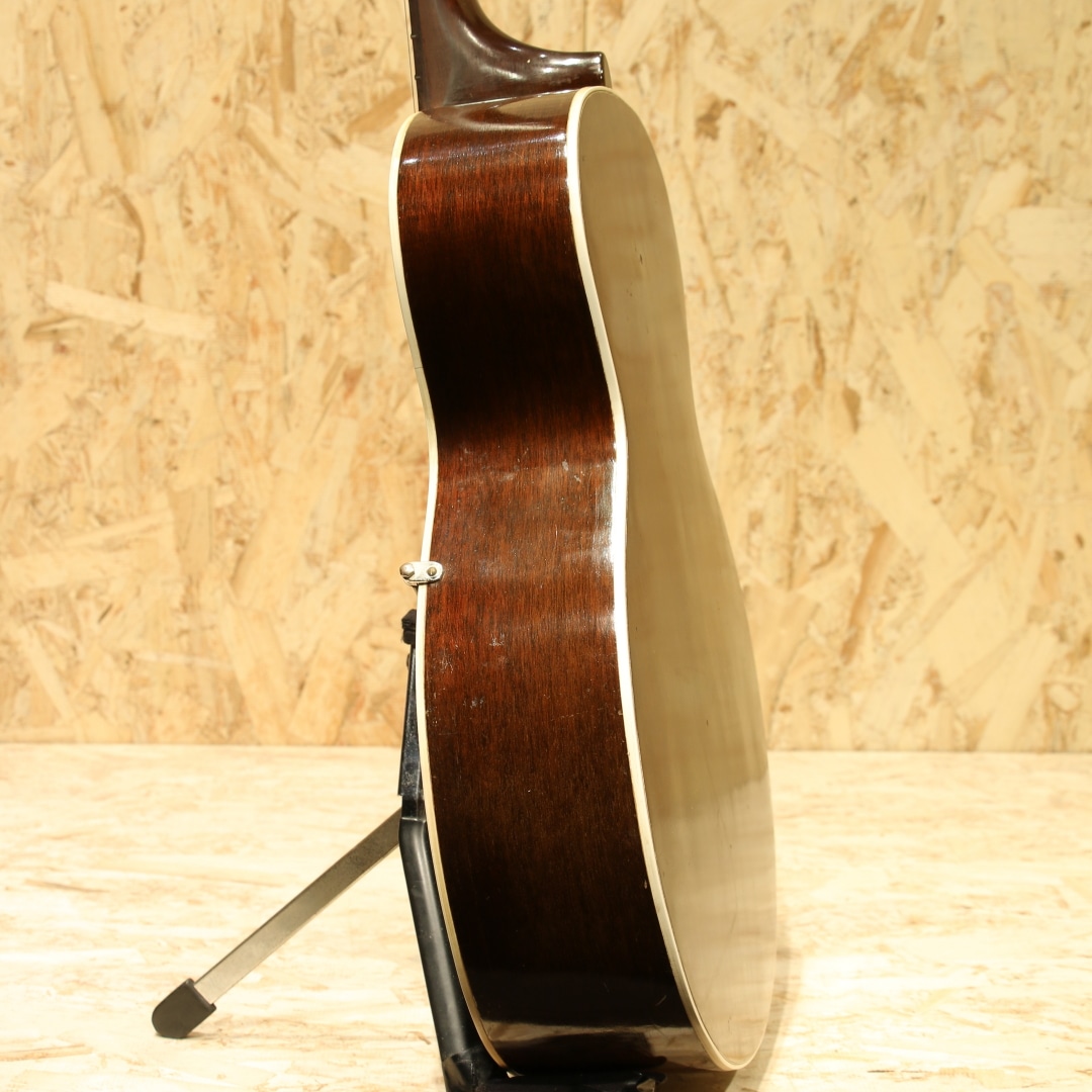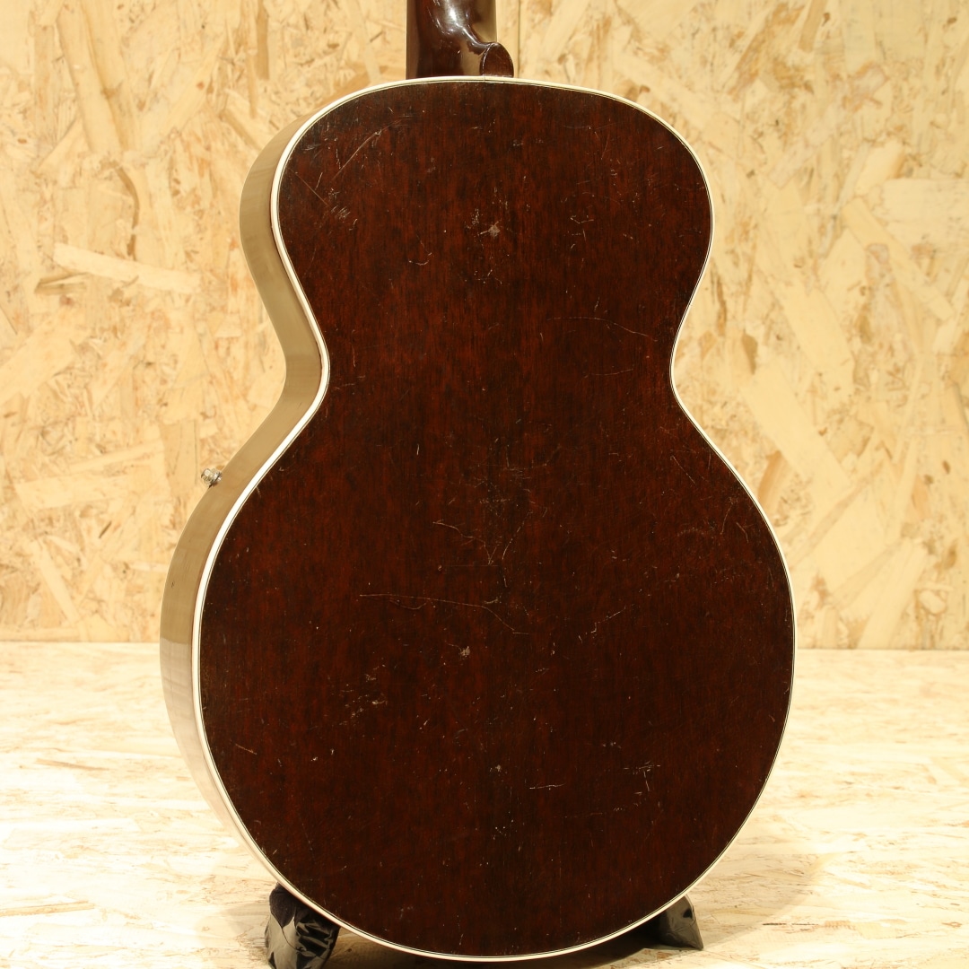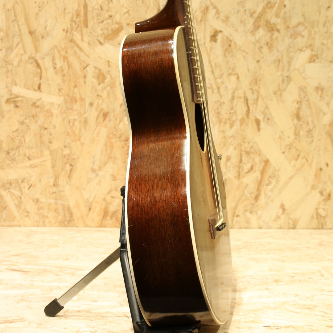 アーチトップモデルとして製造されていたL-1が1926年より元祖ギブソンフラットトップモデルとして登場し1937年に製造を終了、ロバート・ジョンソンが愛用していた事で世界的にもあまりにも有名なブルーズマンの憧れの的がこのオリジナル期のL-1。1926年初期はラウンドバック仕様も存在し、間も無くフラットバックのマホガニーサイドバックに変更。褐色のスプルーストップ、マホガニーサイド&バック、マホガニーネック、エボニー指板は20Fのものにリプレイス、リプレイスブリッジ、3プライロゼッタ、3連オープンペグ、THE GIBSONヘッドロゴ、 ラダーとXのハイブリッド仕様とも言えるAブレイシング、オリジナルアンバーフィニッシュ。バインディング無しの指板、12フレットジョイント仕様。Aブレイシング期独特のサウンドでとても軽やかに音が飛び出します。ミドルハイが優れたサウンドでブルースサウンドの礎を築いたモデルの代表格と言われる所以を肌で感じる事ができます。サウンドはやはりプル気味に弾くブルースならではの奏法に最適で成る可くして成った名器と実感できます。指板が交換されており、通常は19F仕様ですが20F仕様に。ブリッジは独自のレクタングル型のブリッジに交換、一度ネジ止めされたあとがあり、両サイドにネジ穴の埋めた加工跡があります。指板幅とのバランス調整のため、ブリッジピンホールが一度穴埋めされており、やや感覚を狭く開け直し。現在の指板幅に合わせた調整が施されプレイアビリティーは高くなっています。100年近い月日を背負った名器です、表面的な削れやキズなどしっかりと愛用されてきた様子はありますが、奇跡のノンクラック品。過去に行われた数々の手入れはこのギターが気に入って大事に使われてきた証拠で背負ってきたおよそ100年の歴史の新しい一ページを刻む一人になれる事は喜ばしい事でしょう。この年代の個体は市場でも中々お目にかかれません。ぜひご検討ください。汎用ハードケース付属。