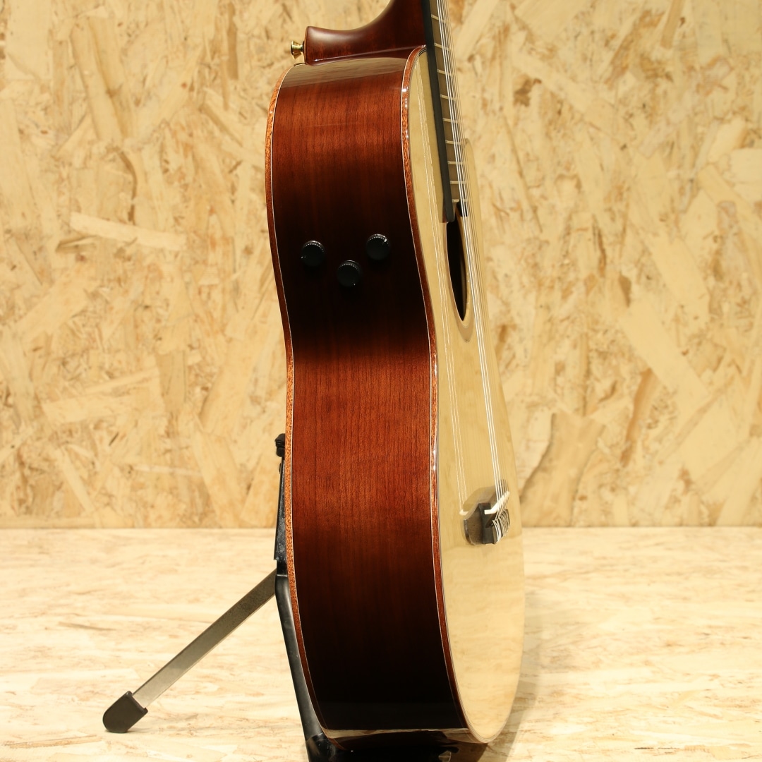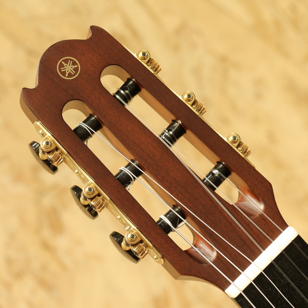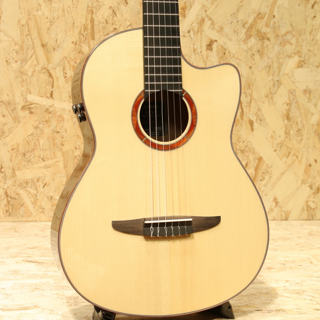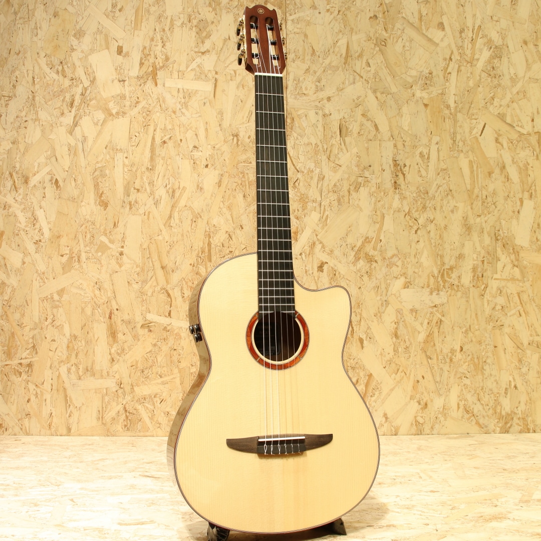 定評のあるヤマハ人気のエレガットNXシリーズ。伝統的なクラシックスタイルを踏襲したNCXと薄胴エレガットのNTXの2モデルをラインナップしています。本器はNCXの国産モデル、専用ピックアップを搭載した”NCX5”。2024年製USED品です。ヨーロピアンスプルーストップ、ウォルナットサイド&バック、マホガニーネック、エボニー指板、エボニー&ウォルナットブリッジ。ナット幅52mm、12フレットジョイント、3Wayの専用ピックアップAtmosfeelを搭載。伝統的なクラシックギターのスタイルを踏襲し、生のナイロン弦モデルの感覚に近いままラインに繋げることが出来るNCXシリーズ。全単板で本格的な仕様、指板エッジ部には面取り処理を施し握り込みやすいグリップ感を与えられて製作が行われています。工場出荷時の弦高設定も低めで演奏性に気を配られた設計。内部構造には最新の音響特性解析シミュレーション技術を活かし試作と改良を重ねたブレイシングを採用。NCXはクラシックギター製作で培った経験や知識を活かして設計、以前のモデルより本体の耐久性を損なうことなく生鳴りを向上しています。ピックアップにはナイロン弦用にチューニングされた最新の「Atmosfeel」を搭載しています。アンダーサドル&コンタクトピエゾピックアップ、マイクの3Wayピックアップで自然なナイロン弦サウンドをラインアウトでき、手元で簡単に操作が可能でサウンドメイクも自由自在です。ボディ表面にクロスで拭いたような極々薄い擦りキズ程で非常に使用感の少ない状態を保たれた極上USED品。ネック周りの演奏性も新品に近い状態をキープ。これから活躍が見込めそうなエレガットです。クラシック音楽だけではなく、ジャズやポピュラーミュージック等幅広いスタイル・シチュエーションで活躍の期待できるモデル。是非一度お試しください。