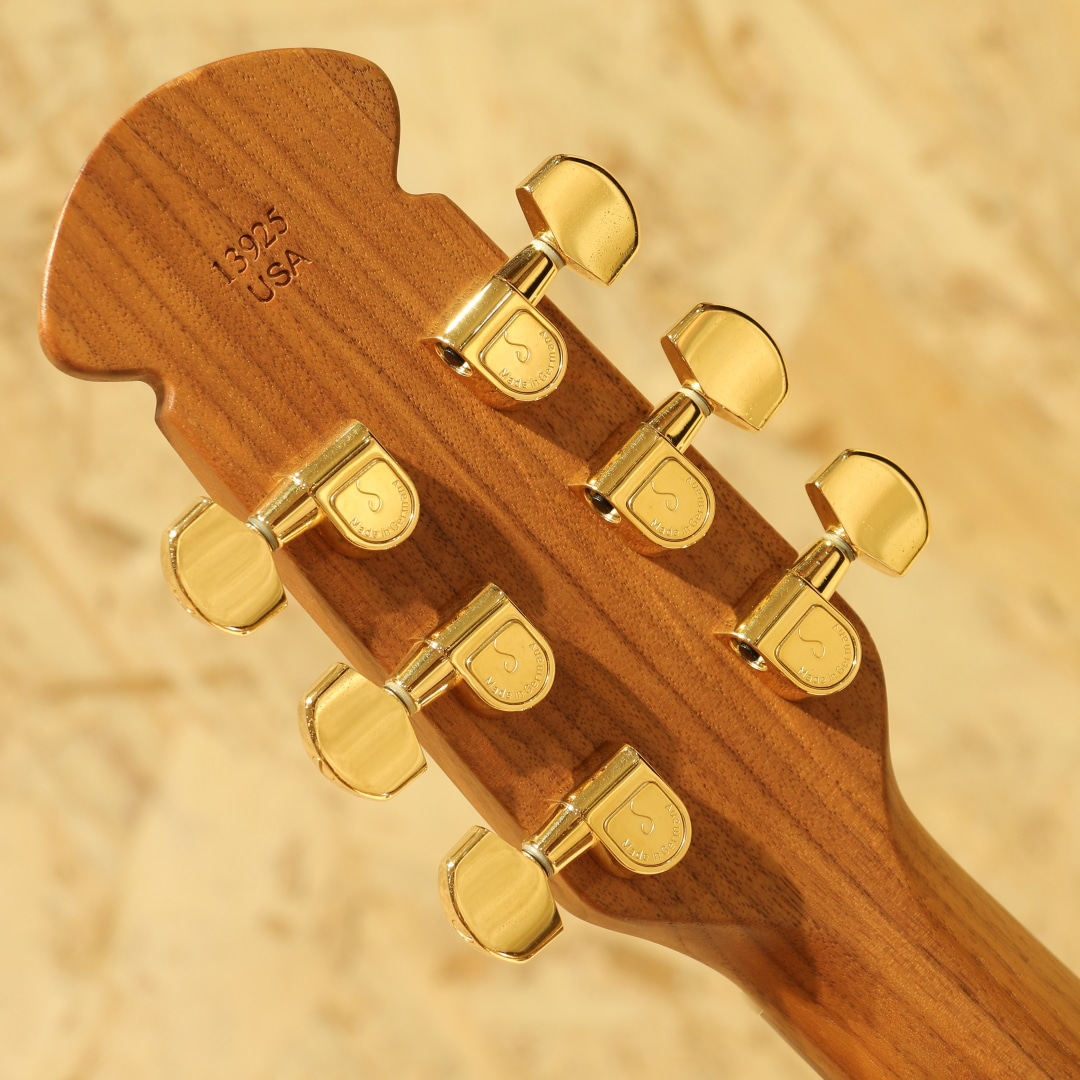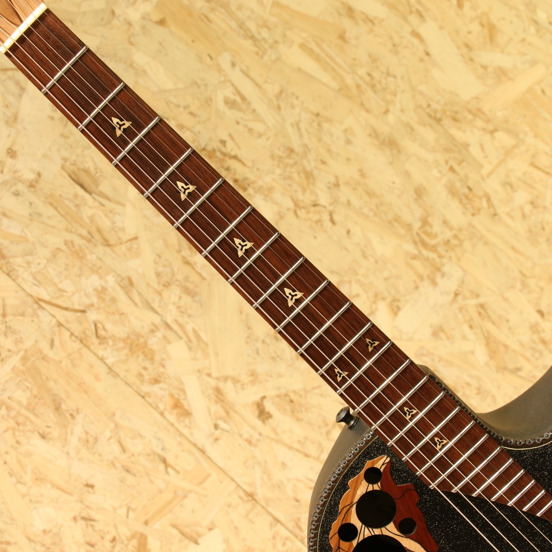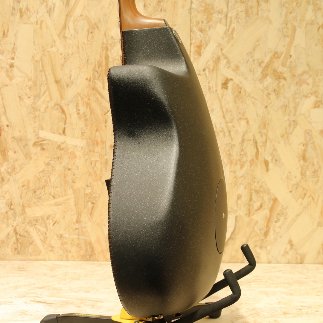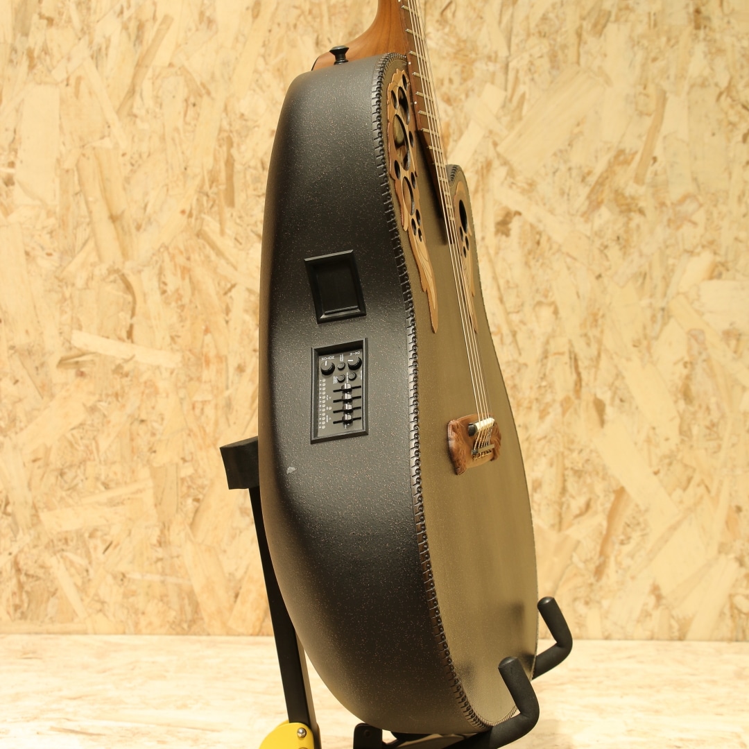 オべーション創始者チャーリー・カマンの生音へのさらなる探究心から1976年に誕生したアダマス。1976-77年にプロトタイプを多く生産し、1978年頃から今も残るスタイルのモデルを製造してきました。本器はシングルカッタウェイ、ブラックカラーの"1587-5"、1998年製USED品。ウッドトップの約3分の1の薄さでも十分な強度を得られるアダマス独自のカーボングラファイトトップ、リラコード樹脂ディープボウル、ウォルナットネック、ウォルナット指板&ブリッジ、オリジナルシャーラーペグ、オリジナルウッド指板インレイ、マルチプルエポーレットサウンドホール、オリジナルファンブレイシング。搭載のOPTIMAプリアンプは4BAND EQ、ノッチフィルター、チューナーを搭載、当時は最新鋭のプリアンプとして話題を呼びました。アダマスでしか得られない深みのある独特な響きとレスポンスに優れたエッジの効いたトーン。タイトながらふくよかなで歯切れの良いサウンド。ディープボディの恩恵もあり、立体感のある音色はしっぽり爪弾くバラードなどでも上手にマッチします。オプティマプリアンプによく見られるチューナーの不具合はありますが、他機能は問題なくお使いいただけます。ボリューム/4イコライザー/ノッチフィルターを直感的な操作でサウンドメイクのできる多機能ながら扱いやすいプリアンプです。輪郭のはっきりとしたパワーのあるラインサウンドは、バンド編成でも埋もれずにアコギサウンドをしっかりと出力します。ネック裏に見られる擦り傷、コントロールパネル付近にやや深めの打痕がありますが、内部までは達しておらずお使いに支障はありません。ネックコンディションも大変良好、オベーションらしい弾きやすい弦高でプレイコンディションも良好です。世代を超えて根強い人気のアダマス、この唯一無二なルックスとサウンドを是非お手元でご堪能ください。オリジナルハードケースが付属します。