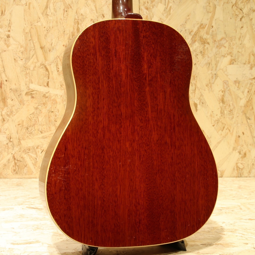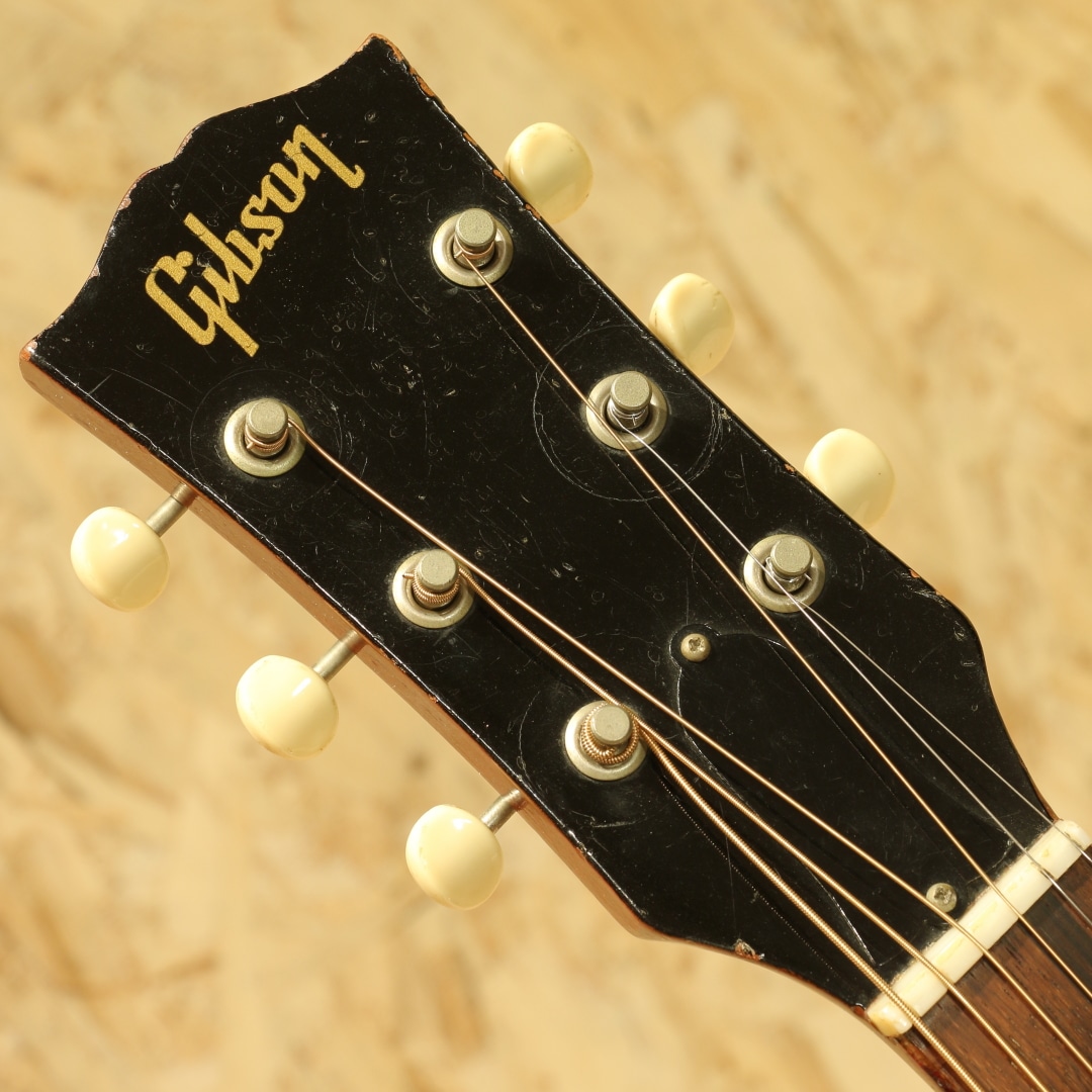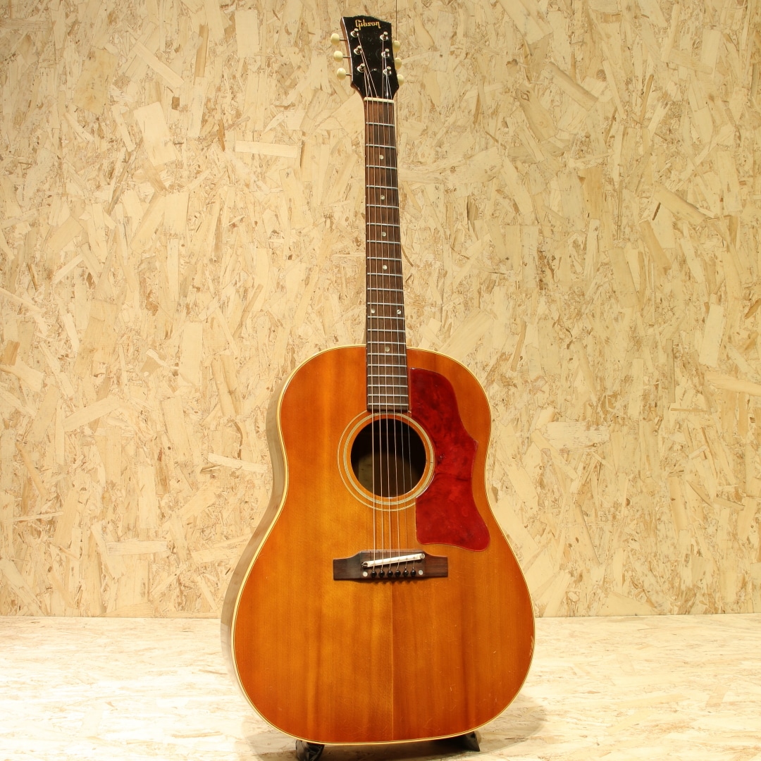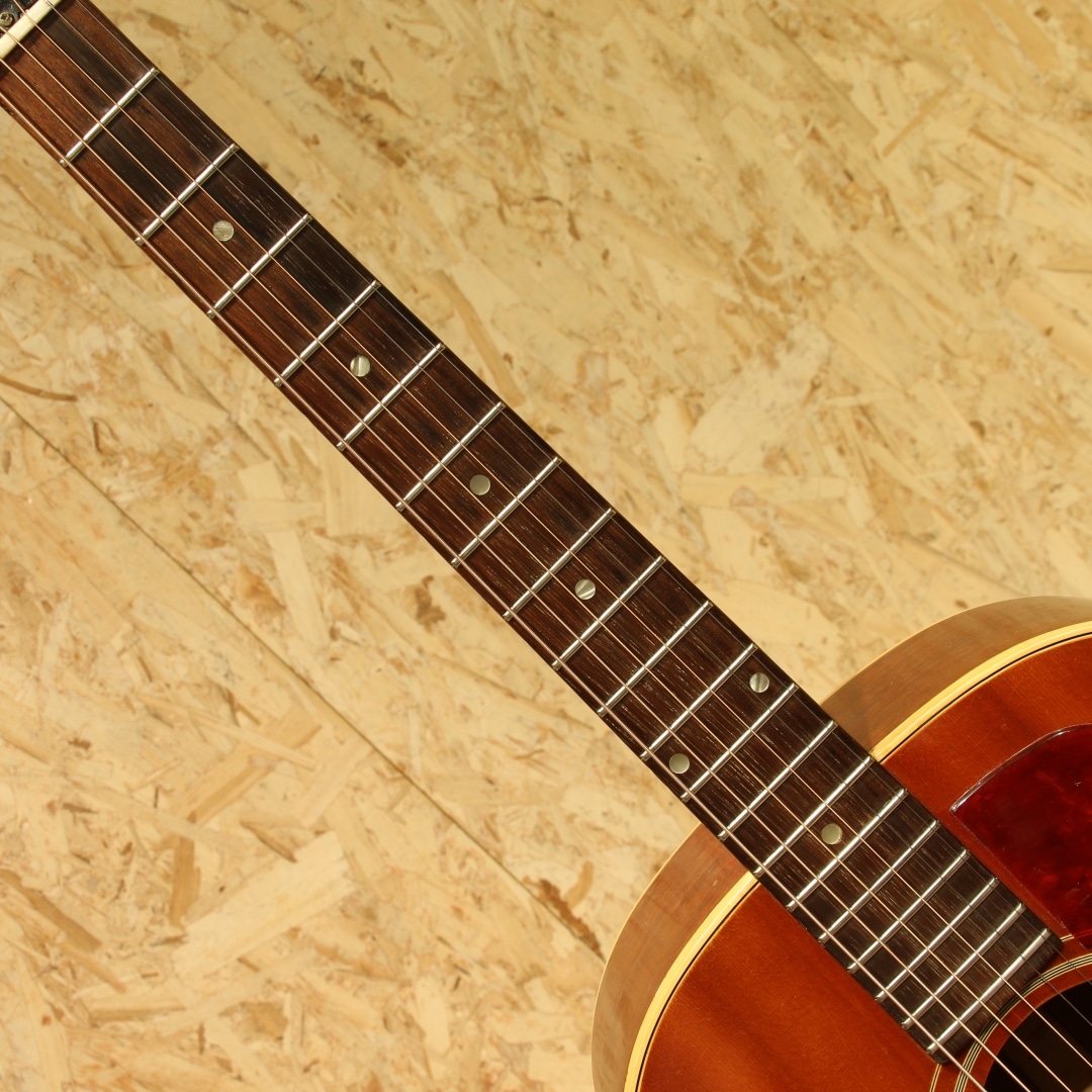 フラットトップにおけるもうひとつの永遠の憧れ、ワーキングホースGibson"J-45"。ギブソンを代表するラウンドショルダーボディのジャンボモデル。1942年に登場した"J-45"、その後数年で幾つかのマイナーチェンジを迎えます。本器は1964年製。ダークチェリーから淡い色味のチェリーサンバーストへ変わったタイミングです。スプルーストップ、マホガニーサイド&バック、マホガニーネック、ハカランダ指板&ブリッジ、セラミックADJサドル、オリジナル3連クルーソン1Lineペグ、厚手のオリジナルセルロイドラージピックガード、ダブルリングロゼッタ、ノンスキャロップド・Xブレイシング。明るい赤みのチェリーサンバースト。赤色が抜けたような淡いノスタルジックなカラーリングはこの時期特有です。もう数年後になるとよりビビッドな赤に変化します。本器はややフェイドした色合い。チェリーサンバーストと言えばこのカラーを思い浮かべるという方もおられるでしょう。ネックグリップは62-63年に比べやや肉付きも増え、手に馴染むようなフィット感へ。直後の65年途中からはナローネックへと仕様変更が入る為、このカラーのレギュラーグリップは意外と探すのも一苦労です。やや太さの増した骨太なサウンド、そしてADJ仕様によるサクサクとした軽快さとエア感。鋭角な響き、歯切れの良さ、所謂パーカッシブなトーンはこの時代ならでは。直後のナローネック期に比べてよりレンジ感が広く、オープンな響きを持つ点が非常に魅力的です。一度ストロークで振りぬけば金属的なトーンで鳴り響き、周りに余韻が響き渡ります。カッティングや手数の多いピッキングでその魅力を存分に体感できるでしょう。ピックガードがややズレて装着されているものの、オリジナルのピックガードをキープ。ブリッジ上面は削られてはいるモノのオリジナルをキープ、ADJサドル上下の幅を持たされた状態です。その他にも塗装面、ナット、セラミックサドル、ペグ、エンドピン、とオリジナルの状態をキープ。1弦側サイドに若干の塗装負け、細やかな当てキズや擦りキズこそ見られるモノの木部割れも見られずで非常に状態の良い1本。演奏性の面も整えられ、ネックはストレートな状態、ロッド残りも充分とこれからも使っていけるFine Vintage。儚さを感じるペール風味なカラー。やや焼けた色合いからは貫禄さえ感じさせます。状態の良い60年代前半、ダークチェリーではないチェリーサンバーストをお探しだった方は是非お早めに。