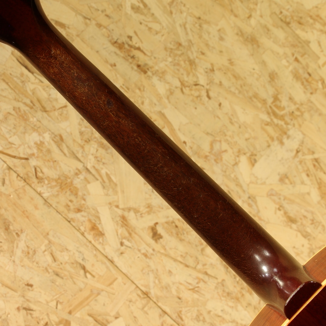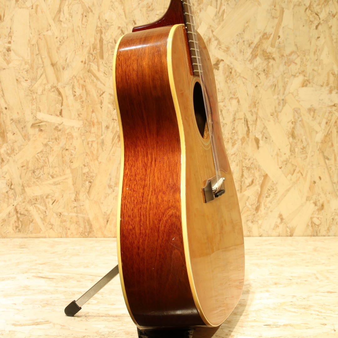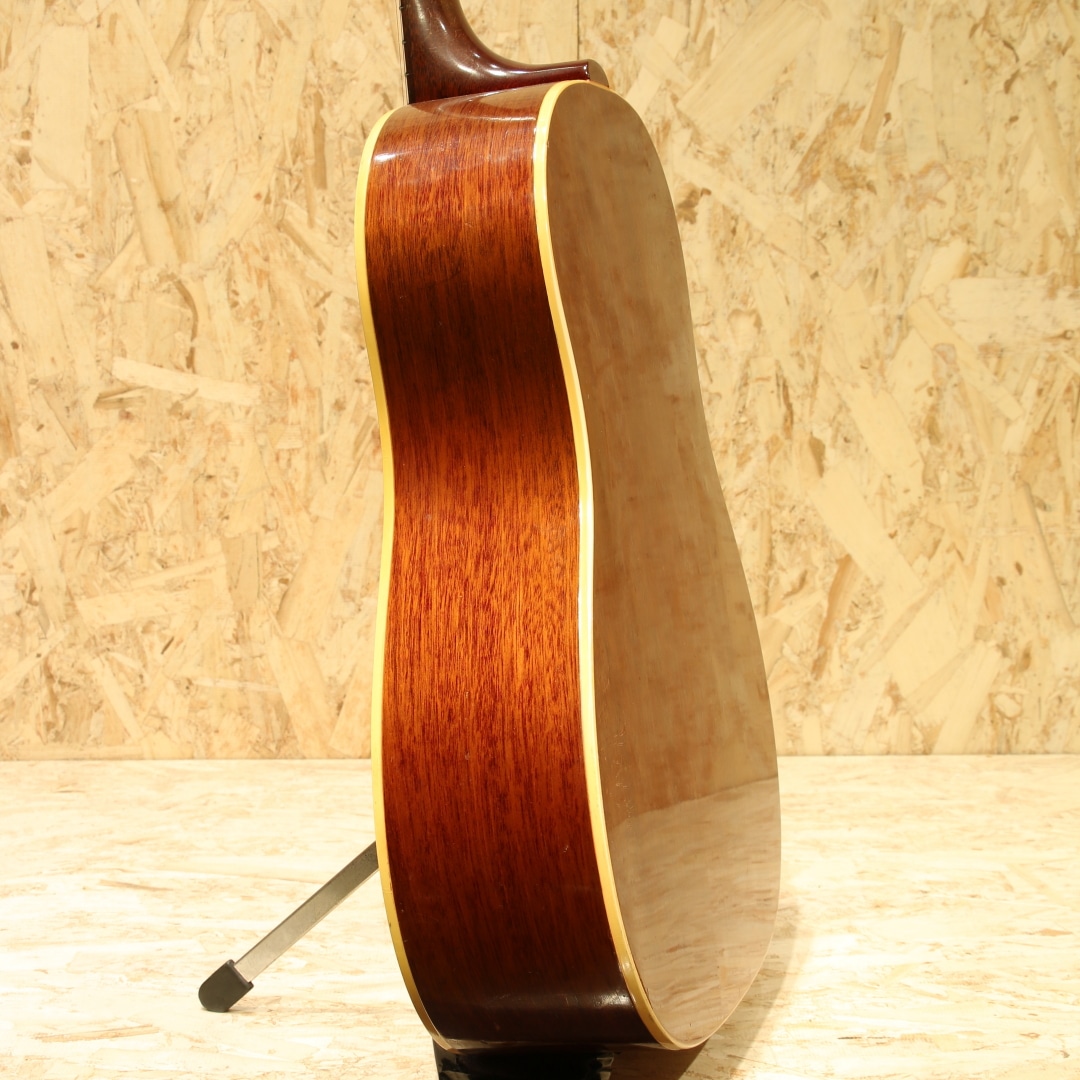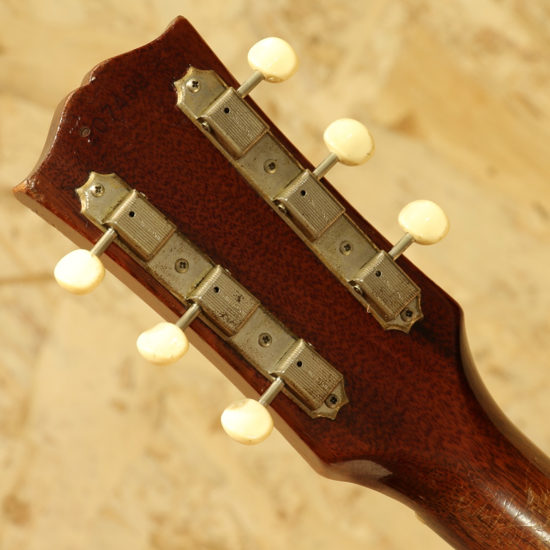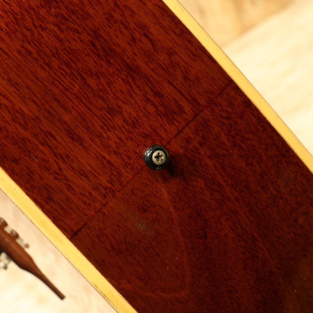フラットトップにおけるもうひとつの永遠の憧れ、ワーキングホースGibson"J-45"。ギブソンを代表するラウンドショルダーボディのジャンボモデル。1942年に登場した"J-45"、その後数年で幾つかのマイナーチェンジを迎えます。本器は1964年製。ダークチェリーから淡い色味のチェリーサンバーストへ変わったタイミングです。スプルーストップ、マホガニーサイド&バック、マホガニーネック、ハカランダ指板&ブリッジ、セラミックADJサドル、オリジナル3連クルーソン1Lineペグ、厚手のオリジナルセルロイドラージピックガード、ダブルリングロゼッタ、ノンスキャロップド・Xブレイシング。明るい赤みのチェリーサンバースト。赤色が抜けたような淡いノスタルジックなカラーリングはこの時期特有です。もう数年後になるとよりビビッドな赤に変化します。本器はややフェイドした色合い。チェリーサンバーストと言えばこのカラーを思い浮かべるという方もおられるでしょう。ネックグリップは62-63年に比べやや肉付きも増え、手に馴染むようなフィット感へ。直後の65年途中からはナローネックへと仕様変更が入る為、このカラーのレギュラーグリップは意外と探すのも一苦労です。やや太さの増した骨太なサウンド、そしてADJ仕様によるサクサクとした軽快さとエア感。鋭角な響き、歯切れの良さ、所謂パーカッシブなトーンはこの時代ならでは。直後のナローネック期に比べてよりレンジ感が広く、オープンな響きを持つ点が非常に魅力的です。一度ストロークで振りぬけば金属的なトーンで鳴り響き、周りに余韻が響き渡ります。カッティングや手数の多いピッキングでその魅力を存分に体感できるでしょう。ピックガードがややズレて装着されているものの、オリジナルのピックガードをキープ。ブリッジ上面は削られてはいるモノのオリジナルをキープ、ADJサドル上下の幅を持たされた状態です。その他にも塗装面、ナット、セラミックサドル、ペグ、エンドピン、とオリジナルの状態をキープ。1弦側サイドに若干の塗装負け、細やかな当てキズや擦りキズこそ見られるモノの木部割れも見られずで非常に状態の良い1本。演奏性の面も整えられ、ネックはストレートな状態、ロッド残りも充分とこれからも使っていけるFine Vintage。儚さを感じるペール風味なカラー。やや焼けた色合いからは貫禄さえ感じさせます。状態の良い60年代前半、ダークチェリーではないチェリーサンバーストをお探しだった方は是非お早めに。