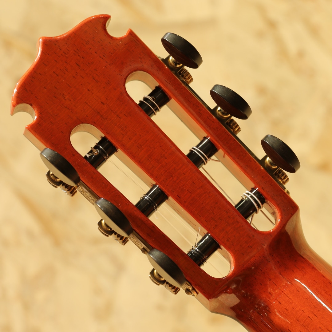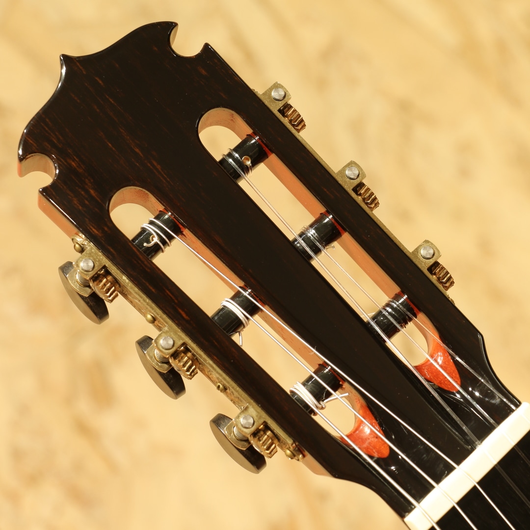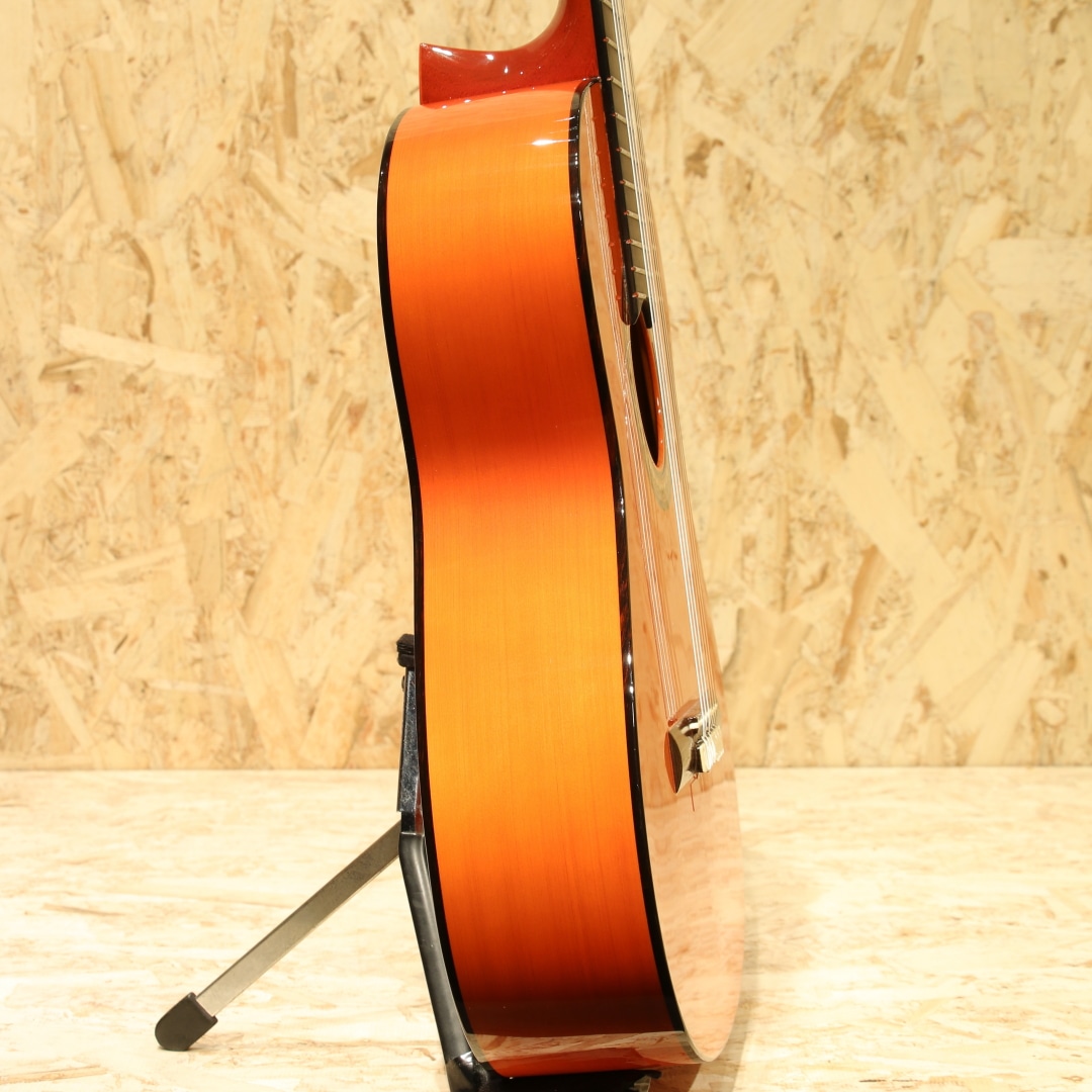 今もっとも脂の乗った製作家のひとりともいえる"Stephan Marchione(スティーブン・マルキオーネ)"。数々の有名ビルダーを輩出したPensa Suhr在籍後1993年に独立し、2001年からはテキサス州ヒューストンへ自身の工房を開いています。アーチトップをはじめ、ソリッド、クラシック、バイオリンまで、弦楽器のその大半を製作でき、そのすべての分野で喝采を博しています。イタリア人家庭で育った彼にとってヨーロッパはルーツの一つ、フラメンコスタイルは氏の得意とする楽器の一つに挙がります。本器はシープレスを使用した所謂白モデル、情熱的なカラーに身を包んだUSED品。2016年製の作品です。スプルーストップ、シープレスサイド&バック、スパニッシュシダーネック、エボニー指板、CSA RWブリッジ、ウッドモザイクロゼッタ、ローズウッドバインディング。ヴァイオリン製作家やエレキギター製作家へ師事した後も独自に研究と学びを重ねるマルキオーネ。エステソやコンデ、ロドリゲスといった世界的に評価の高い楽器を研究。コンデの演奏性の高さや音色と人間工学、ロドリゲスの職人技や力強い響きと美しさを参考にしています。これらは世界的に評価されている為多くのミュージシャンが慣れており、直感的に理解できる寸法を採用して歴史的なモデルに基づいたデザインを採用。スペイン式の製法、ニカワによる接着、接着前の最終仕上げは手で削るなど伝統的な製法を踏襲し、先人の創り上げてきたスタイルへのリスペクトを持って製作が行われています。氏の創る鉄弦にも見られるクリスタルな澄み切った響き。透明感とキレのあるトーン、音が暴れすぎることのないバランス感のある音色。音の立ち上がりも早く、音の密度の高さや輪郭の出方など、非常に高い精度で製作が行われているが故のロスの無い出音。自然な減衰が心地よい作品です。ブリッジ周りに細やかなウェザーチェック、ボディサイド6弦側ボトム箇所に極々僅かな当てキズこそ見られるモノの、非常に使用感の少ない状態です。ネック周りの精度も恐ろしく高く作られている為、演奏しやすいテンション感、良好なコンディションの1本。氏のルーツに近いスタイルのフラメンコギター。情熱的なカラーの映える作品です。是非ご体感下さいませ。