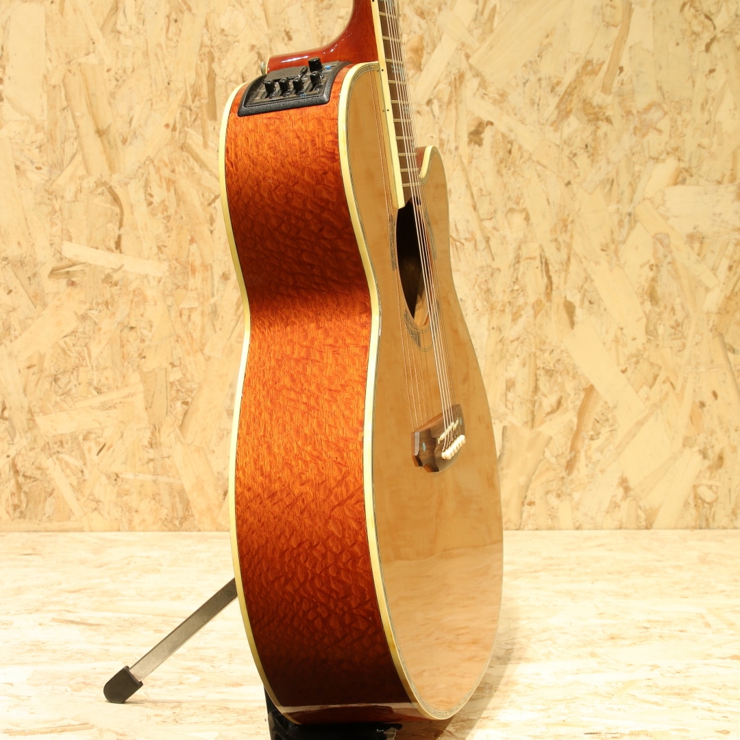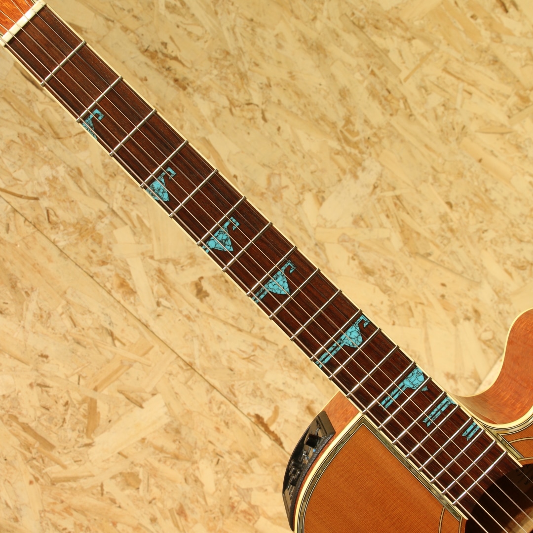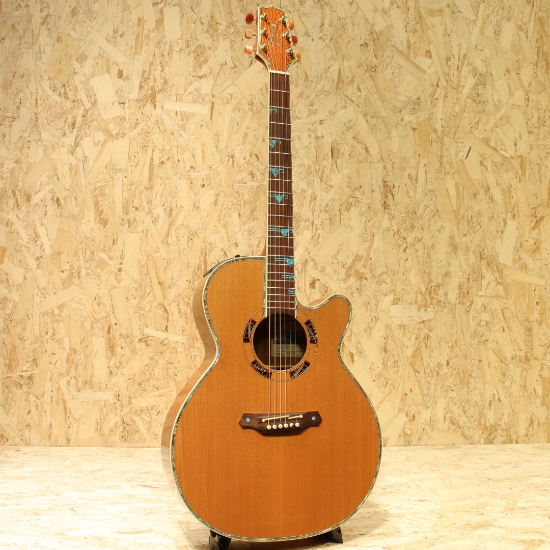 岐阜県中津川市にて製造する国内屈指のワールドワイドなエレアコメーカー"タカミネ"。アメリカや日本をはじめとする世界各国の著名ミュージシャンが愛用する純国産のブランドです。本器は2023年の限定モデルの基にもされた初代サンタフェ”ESF-93”。1994年製USED品です。シダートップ、シルキーオークサイド&バック、マホガニーネック、エボニー指板&ブリッジ、ゴトー製ゴールドペグ、NPTプリアンプ搭載。エレアコの代名詞ともされる国産タカミネ。元々は生アコースティック楽器の製造から始まっており、時代の流れがエレクトリックを求めるようになると開発に着手。その過程で生まれたパラスティックピックアップは当時としては非常に画期的なシステムでした。1979年には海外でエレアコ第一弾モデルが発売開始され、有名ギタリストがこぞって使用したことからタカミネの名が世界に広まりました。本モデルは2023年の限定モデルも記憶に新しいサンタフェシリーズの元祖。ネイティブアメリカンのデザインをフィーチャーしたルックスが特徴的なモデルです。ターコイズを使用した装飾が一際個性を感じさせます。当時ロゼッタに扇形のモノを仕込むことが従来のサークルカッターでは難しく、高精度の加工が可能なNCルーターを世界に先駆けて導入したことで後のギターデザインへの大きな影響を与えたモデルです。ジャンボボディ故にふくよかな響きを持ち、空気感を感じさせるトーン。タカミネらしいソリッドさも持ち合わせたサウンド。芯が強くハッキリとした音色はTHE タカミネサウンドです。現在のタカミネにも通じる部分こそ感じますが、やや甘くハイファイ過ぎない、こなれた音色は現行機種にない魅力でしょう。プリアンプにはタカミネオリジナルのNPTプリアンプを搭載。通称青プリまたは緑プリとも呼ばれるこのシステム、EQのつまみ自体に緑色のLEDが内蔵されておりその特徴的な見た目から愛称の付いたプリアンプです。この色は後期型となり、前期型では赤色、こちらは非常に人気の高いプリアンプとなります。操作は非常にシンプル、Vol,bass,Treble,Frequency&Vol,LED Switch。音色調整のEQと装飾のLEDをON/OFFする機能が搭載されています。タカミネらしいトレブリーで切れ味の鋭い音作りから太く重い重厚な響きまでサウンドメイクが可能。シンプルながら必要十分、現代においても通用するプリアンプシステムです。以前のオーナーによってボディトリム、ヘッドトリムにアバロンの装飾が追加されておりこれまた華やかな装飾に仕上がっている個体。丁寧に作業がされていることから腕の良いところで装飾が施されていることが窺えます。ボディトップ面下部やボディバック面とヘッド先端箇所の僅かな当てキズ、ボディ全体に表面的な擦りキズが多々見られますが30年近くの年月が経ったことを考えるとキレイな状態をキープされている個体。フレット残りは少ないことから大事に使い込まれていたことが窺え、現状ネックの状態は良好、演奏性に問題はございません。非常に人気の高い初代サンタフェ。当時300本限定で製作が行われたと言われる希少なモデルです。ステージで使うエレアコとして、ライン撮りで録音するエレアコとして、もちろん生音での演奏にも。現代とは異なった響き、トーンを持つタカミネ。お探しだった方は是非お早めに。