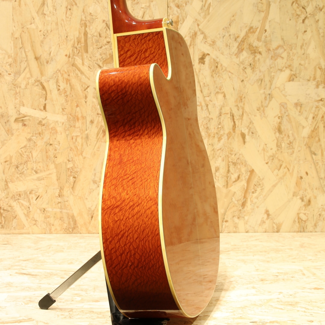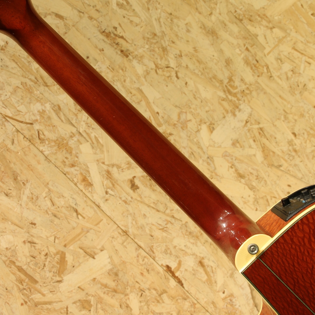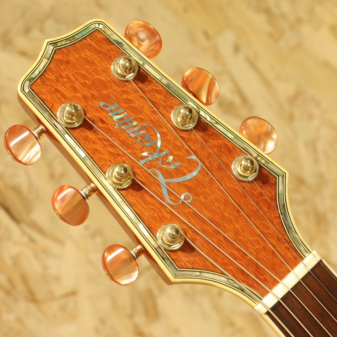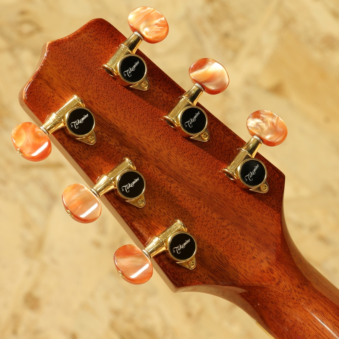 岐阜県中津川市にて製造する国内屈指のワールドワイドなエレアコメーカー"タカミネ"。アメリカや日本をはじめとする世界各国の著名ミュージシャンが愛用する純国産のブランドです。本器は2023年の限定モデルの基にもされた初代サンタフェ”ESF-93”。1994年製USED品です。シダートップ、シルキーオークサイド&バック、マホガニーネック、エボニー指板&ブリッジ、ゴトー製ゴールドペグ、NPTプリアンプ搭載。エレアコの代名詞ともされる国産タカミネ。元々は生アコースティック楽器の製造から始まっており、時代の流れがエレクトリックを求めるようになると開発に着手。その過程で生まれたパラスティックピックアップは当時としては非常に画期的なシステムでした。1979年には海外でエレアコ第一弾モデルが発売開始され、有名ギタリストがこぞって使用したことからタカミネの名が世界に広まりました。本モデルは2023年の限定モデルも記憶に新しいサンタフェシリーズの元祖。ネイティブアメリカンのデザインをフィーチャーしたルックスが特徴的なモデルです。ターコイズを使用した装飾が一際個性を感じさせます。当時ロゼッタに扇形のモノを仕込むことが従来のサークルカッターでは難しく、高精度の加工が可能なNCルーターを世界に先駆けて導入したことで後のギターデザインへの大きな影響を与えたモデルです。ジャンボボディ故にふくよかな響きを持ち、空気感を感じさせるトーン。タカミネらしいソリッドさも持ち合わせたサウンド。芯が強くハッキリとした音色はTHE タカミネサウンドです。現在のタカミネにも通じる部分こそ感じますが、やや甘くハイファイ過ぎない、こなれた音色は現行機種にない魅力でしょう。プリアンプにはタカミネオリジナルのNPTプリアンプを搭載。通称青プリまたは緑プリとも呼ばれるこのシステム、EQのつまみ自体に緑色のLEDが内蔵されておりその特徴的な見た目から愛称の付いたプリアンプです。この色は後期型となり、前期型では赤色、こちらは非常に人気の高いプリアンプとなります。操作は非常にシンプル、Vol,bass,Treble,Frequency&Vol,LED Switch。音色調整のEQと装飾のLEDをON/OFFする機能が搭載されています。タカミネらしいトレブリーで切れ味の鋭い音作りから太く重い重厚な響きまでサウンドメイクが可能。シンプルながら必要十分、現代においても通用するプリアンプシステムです。以前のオーナーによってボディトリム、ヘッドトリムにアバロンの装飾が追加されておりこれまた華やかな装飾に仕上がっている個体。丁寧に作業がされていることから腕の良いところで装飾が施されていることが窺えます。ボディトップ面下部やボディバック面とヘッド先端箇所の僅かな当てキズ、ボディ全体に表面的な擦りキズが多々見られますが30年近くの年月が経ったことを考えるとキレイな状態をキープされている個体。フレット残りは少ないことから大事に使い込まれていたことが窺え、現状ネックの状態は良好、演奏性に問題はございません。非常に人気の高い初代サンタフェ。当時300本限定で製作が行われたと言われる希少なモデルです。ステージで使うエレアコとして、ライン撮りで録音するエレアコとして、もちろん生音での演奏にも。現代とは異なった響き、トーンを持つタカミネ。お探しだった方は是非お早めに。